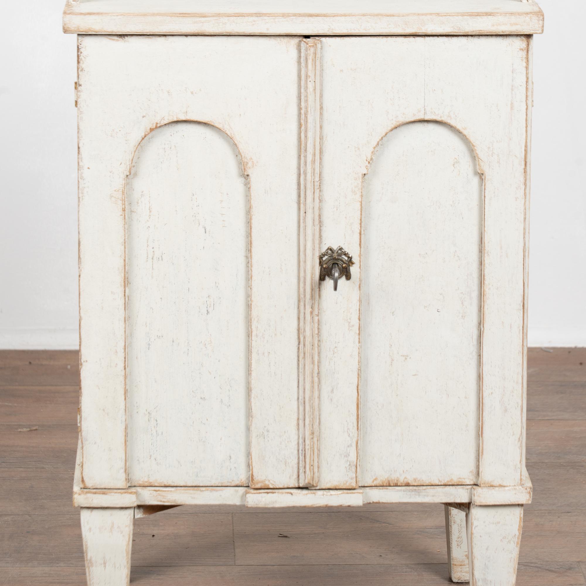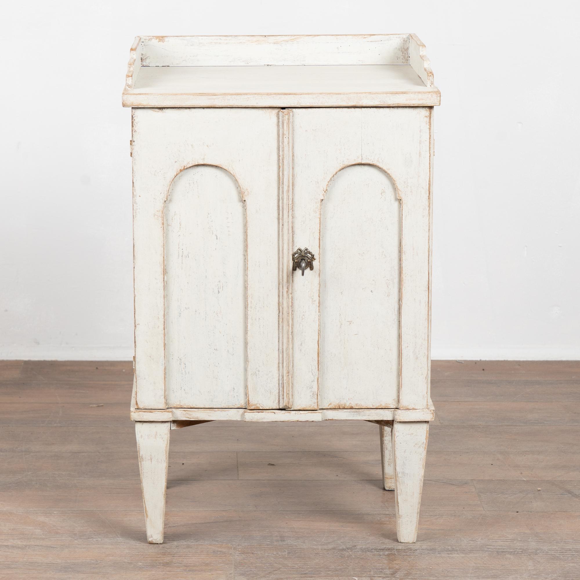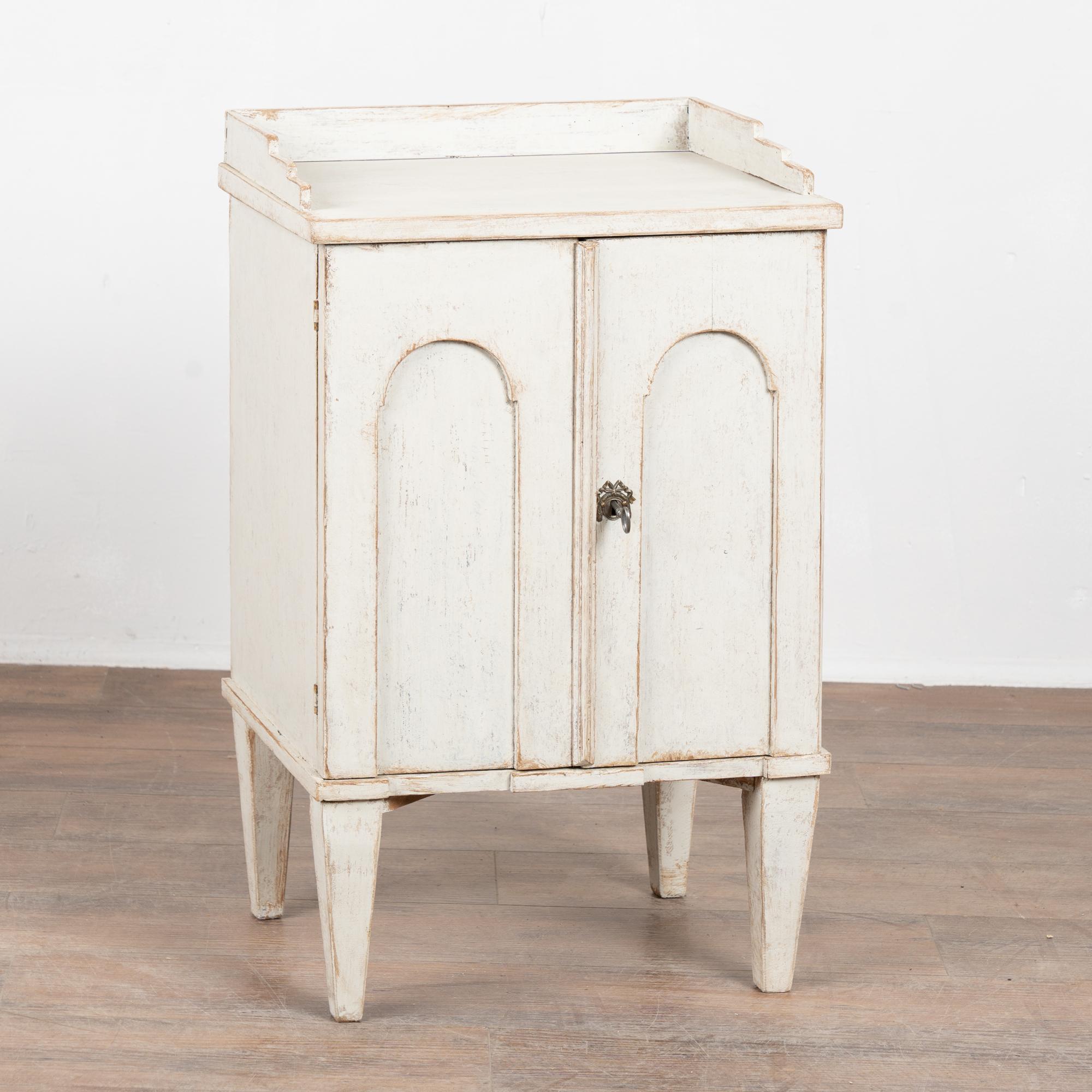 19th-century Swedish pine nightstand with a newer professionally applied antique white painted finish, lightly distressed to complement the age and character of the piece. The cabinet interior contains one shelf and a lower divided drawer, offering practical storage. Simple arched panel doors and understated trim along the sides and back contribute to its simple country profile.