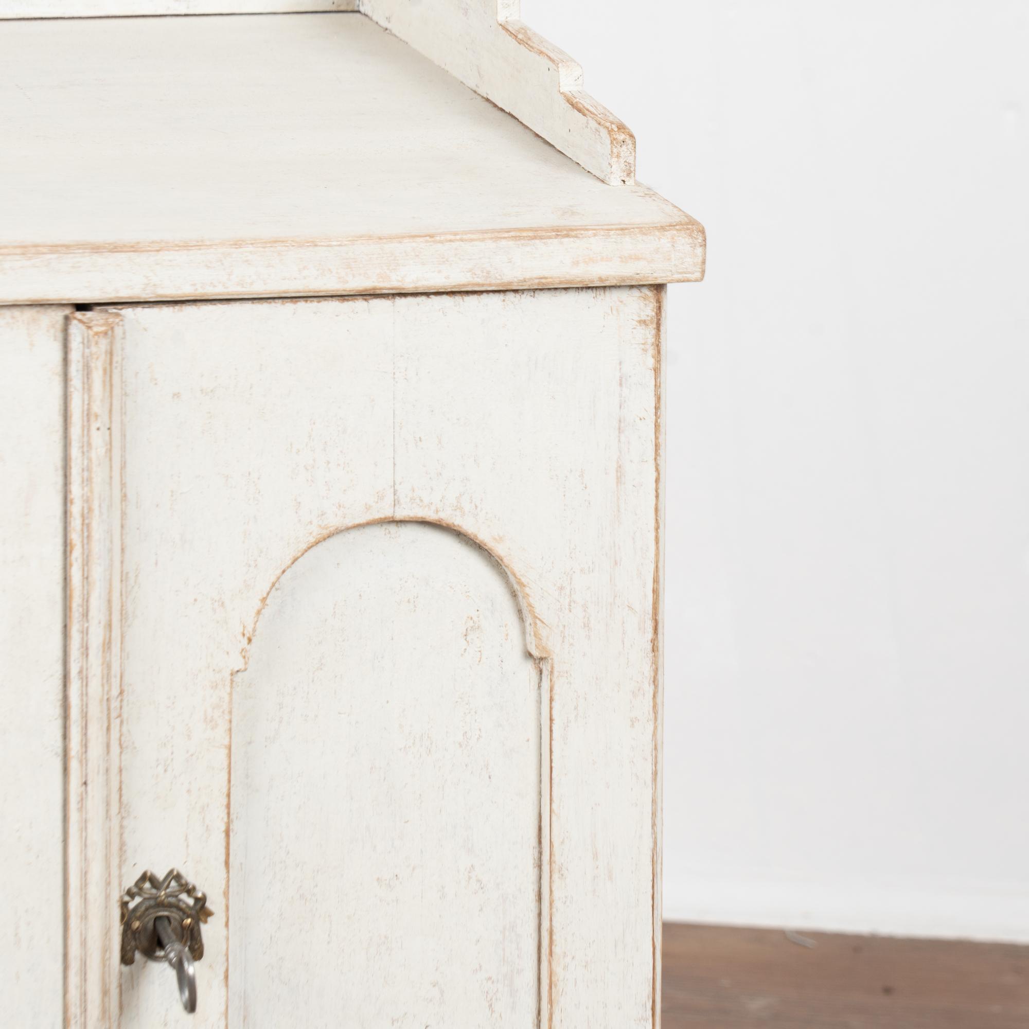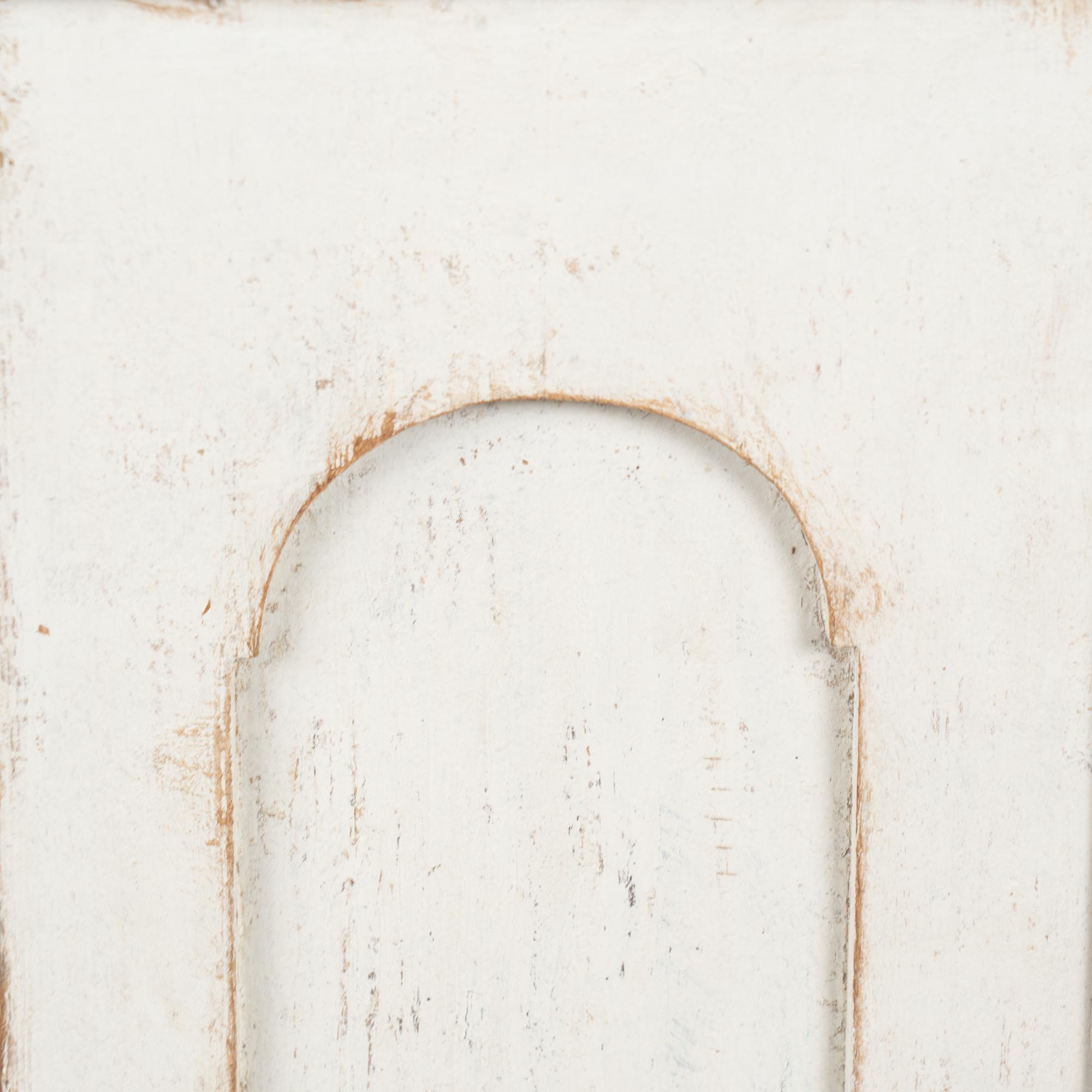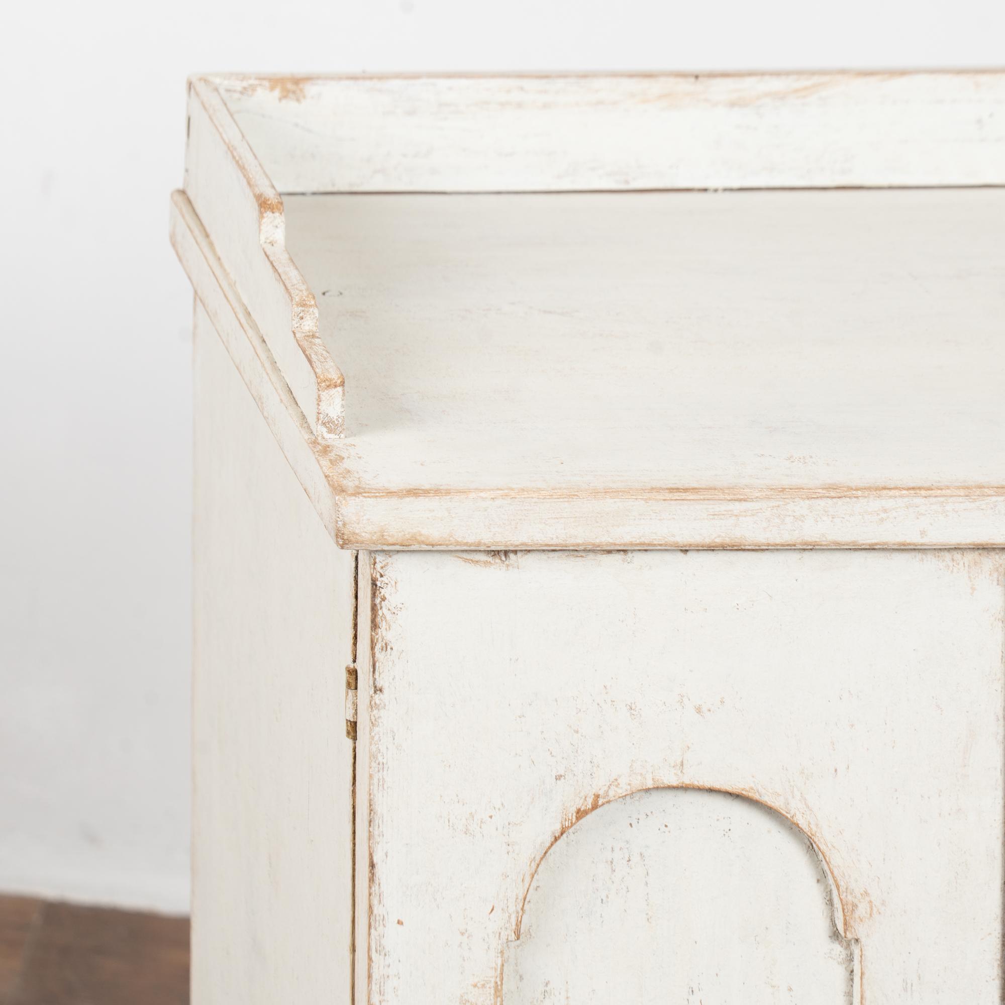 19th-century Swedish pine nightstand with a newer professionally applied antique white painted finish, lightly distressed to complement the age and character of the piece. The cabinet interior contains one shelf and a lower divided drawer, offering practical storage. Simple arched panel doors and understated trim along the sides and back contribute to its simple country profile.