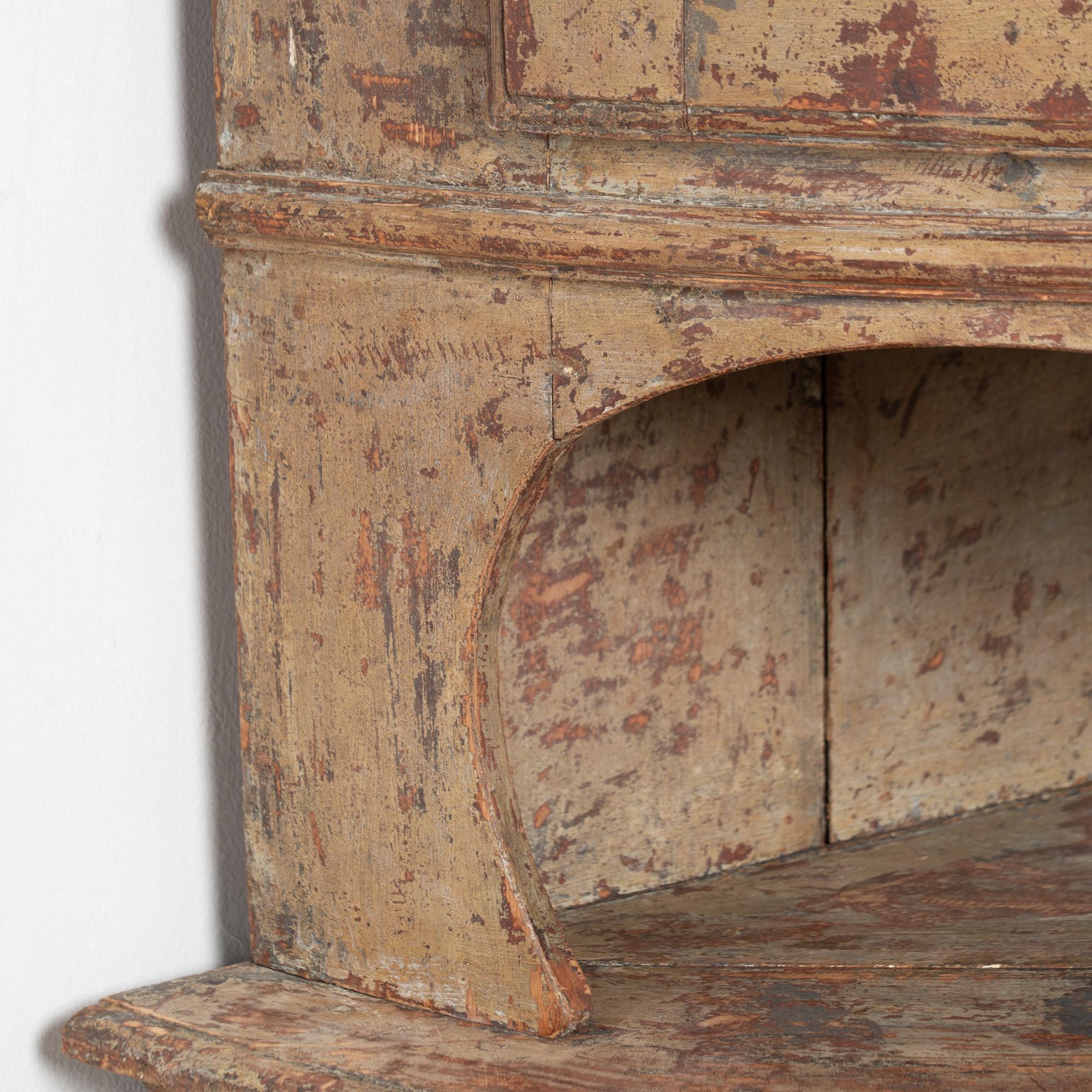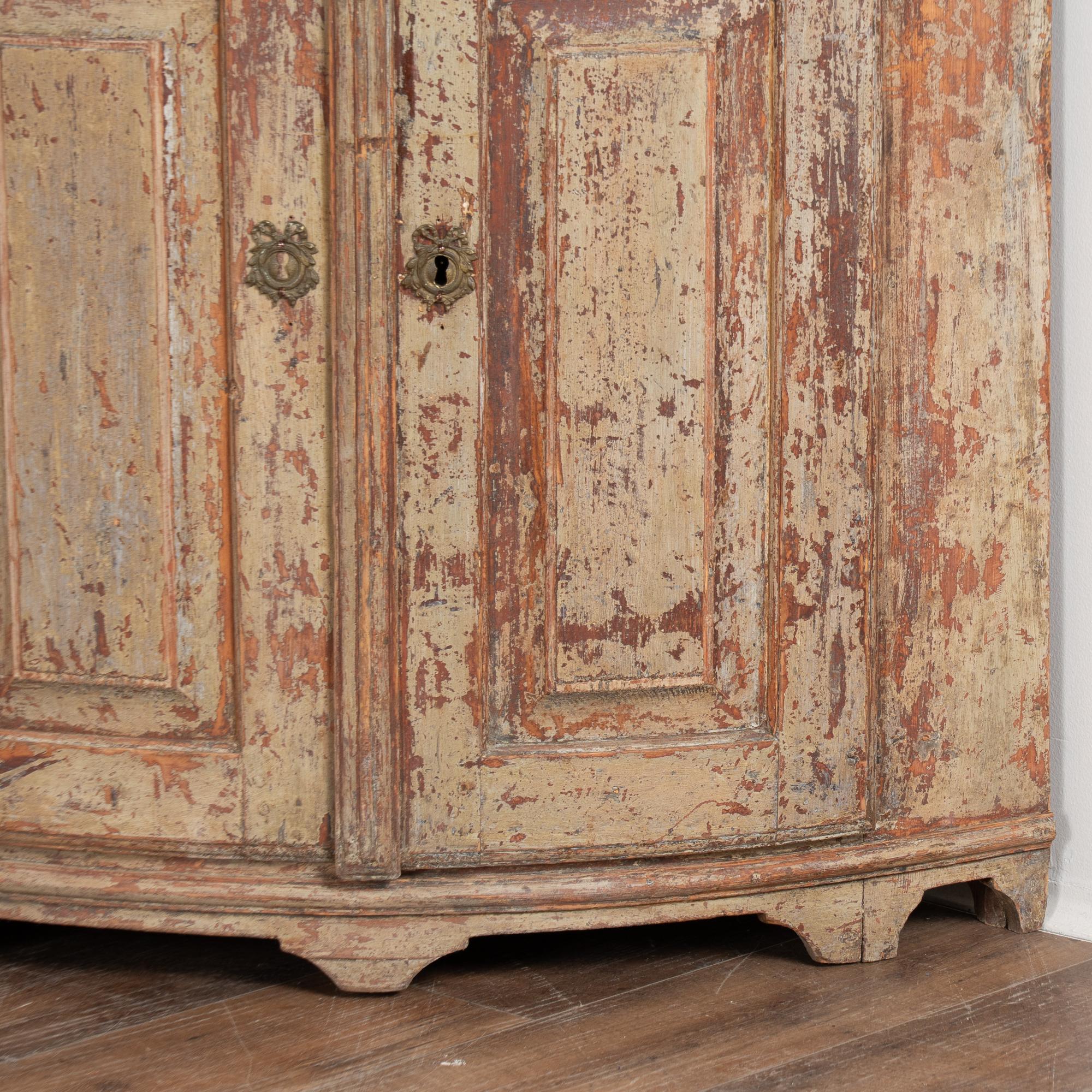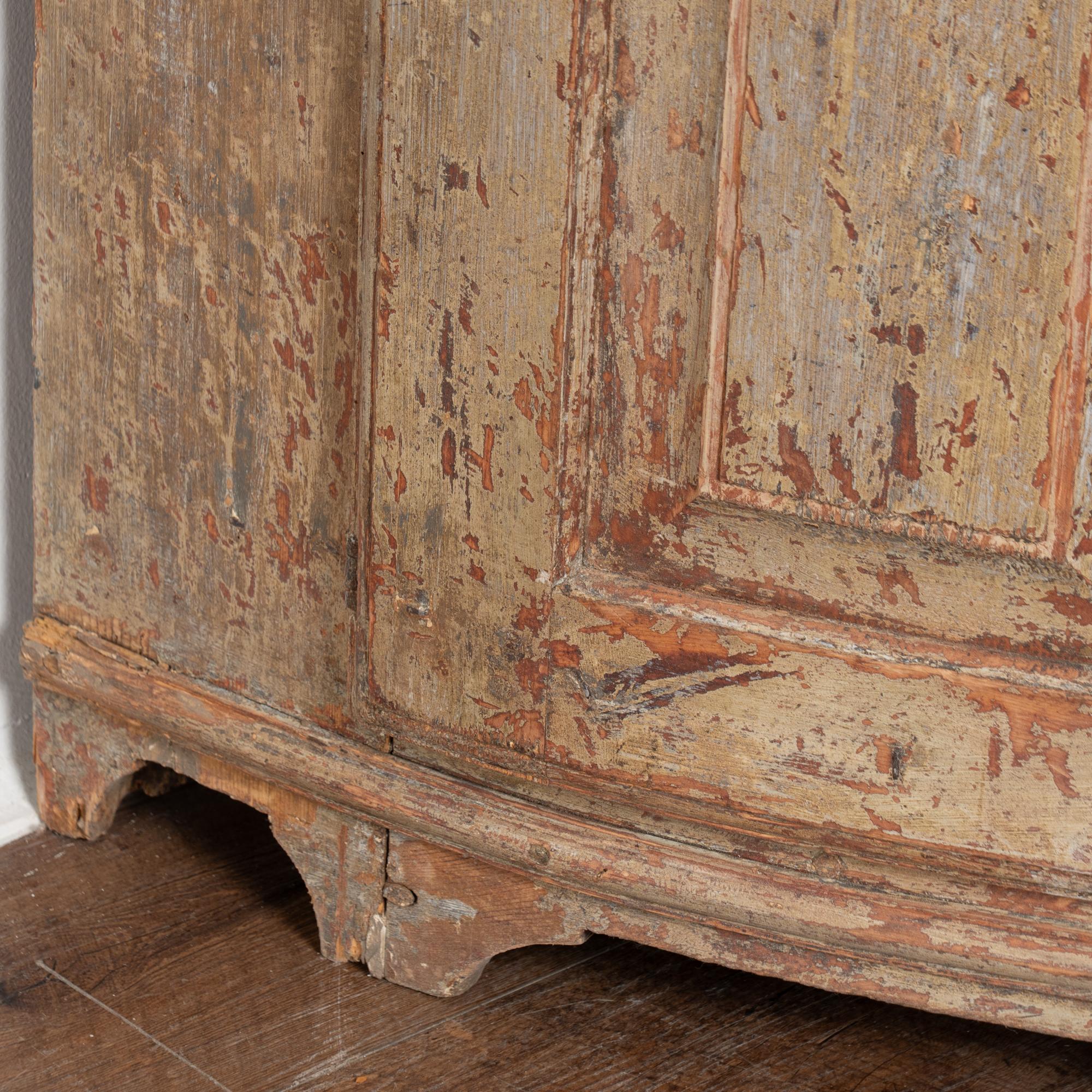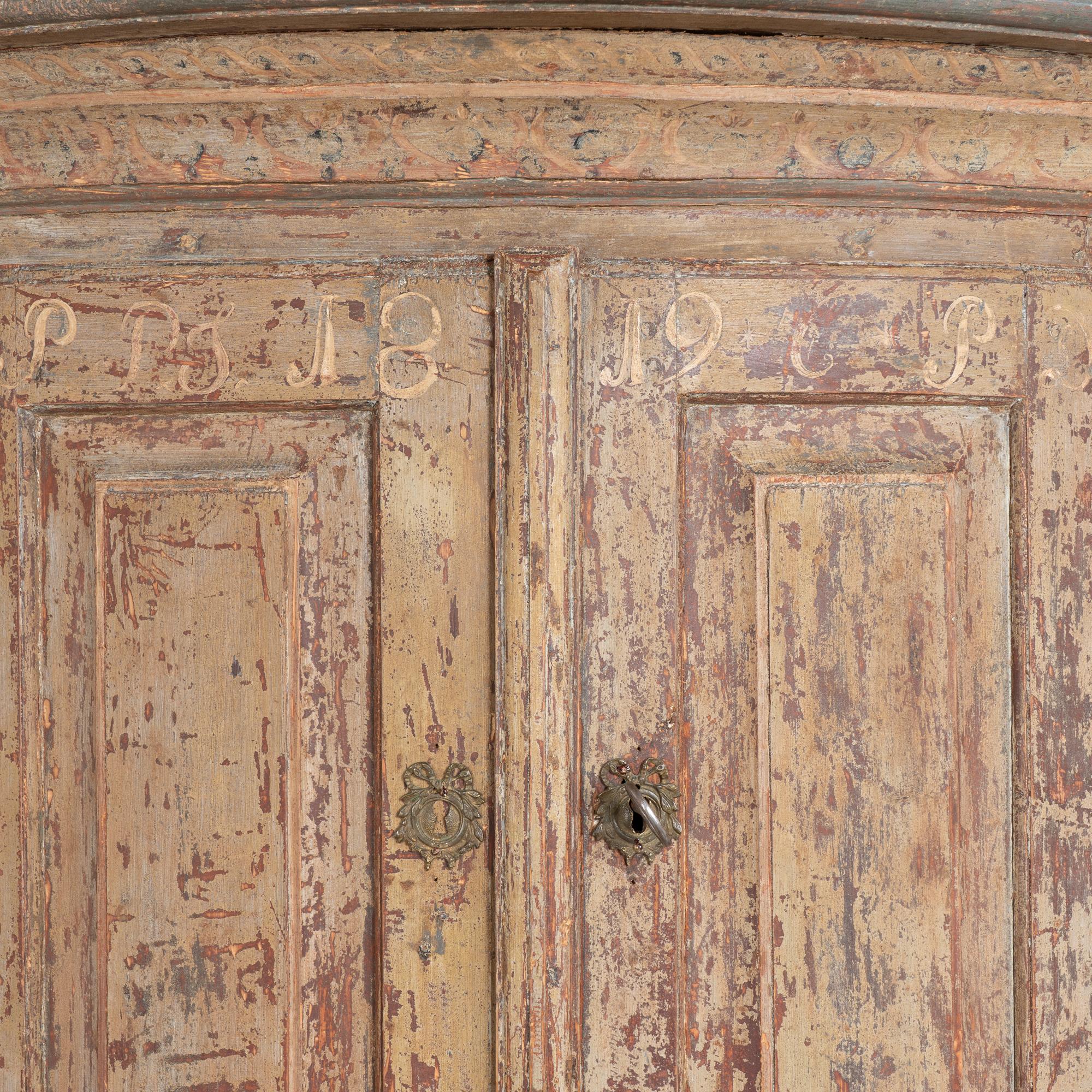 Age-related cracks and wood separation are visible throughout the interior, including the central open storage shelf. Possible old repairs at the feet. Close-up photos reveal remnants of decorative painted detail along the crown. A monogram and date reading “1819” remain visible above the upper doors, suggesting the cabinet may have been commissioned as a wedding or dowry present.