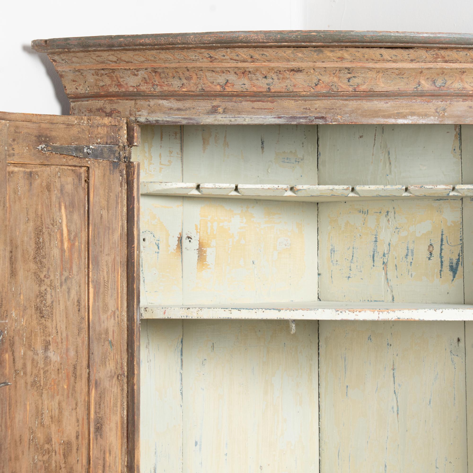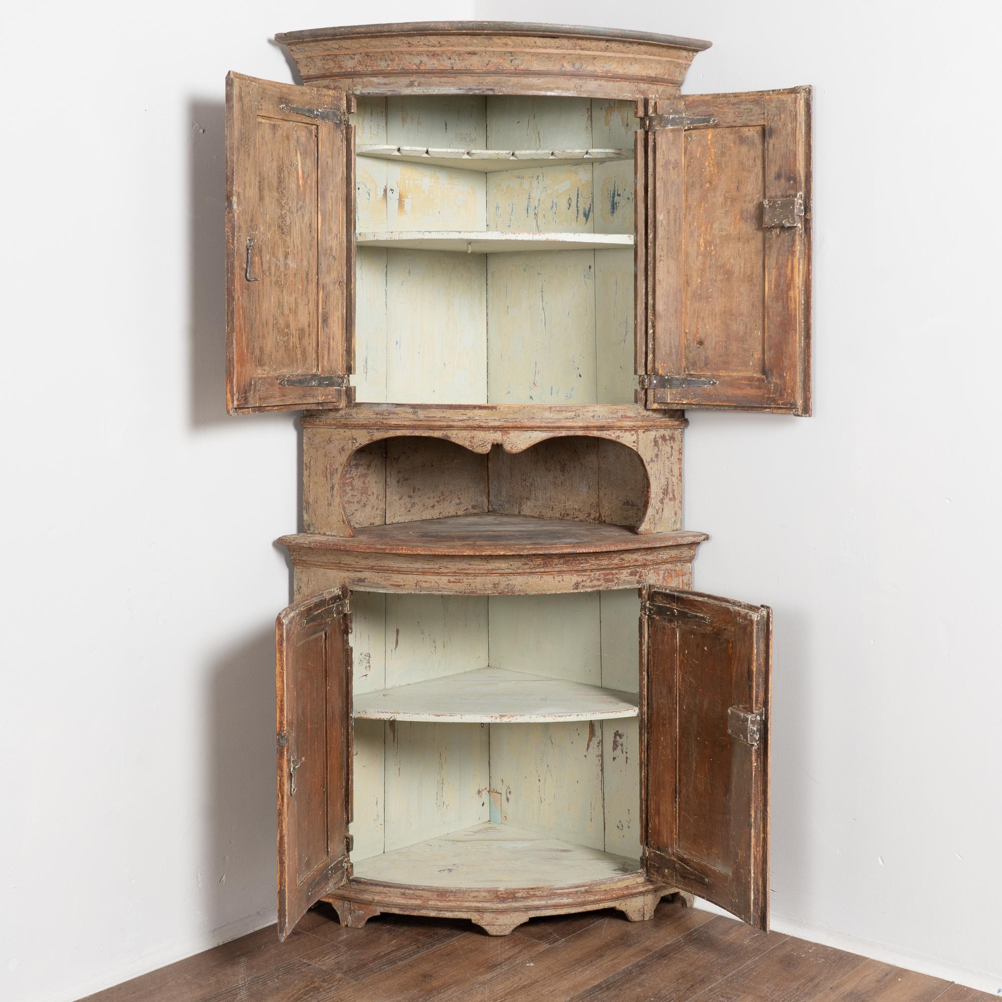 19th-century Swedish pine corner cabinet with curved bowfront form, built in 2 sections for easier transportation and installation. The cabinet retains an original brownish taupe painted finish with slight green undertones that has been scraped and distressed, revealing natural pine beneath. The interior is painted a contrasting antique white with blue undertones.