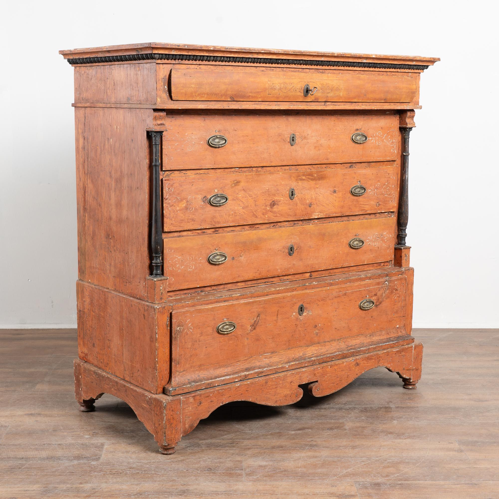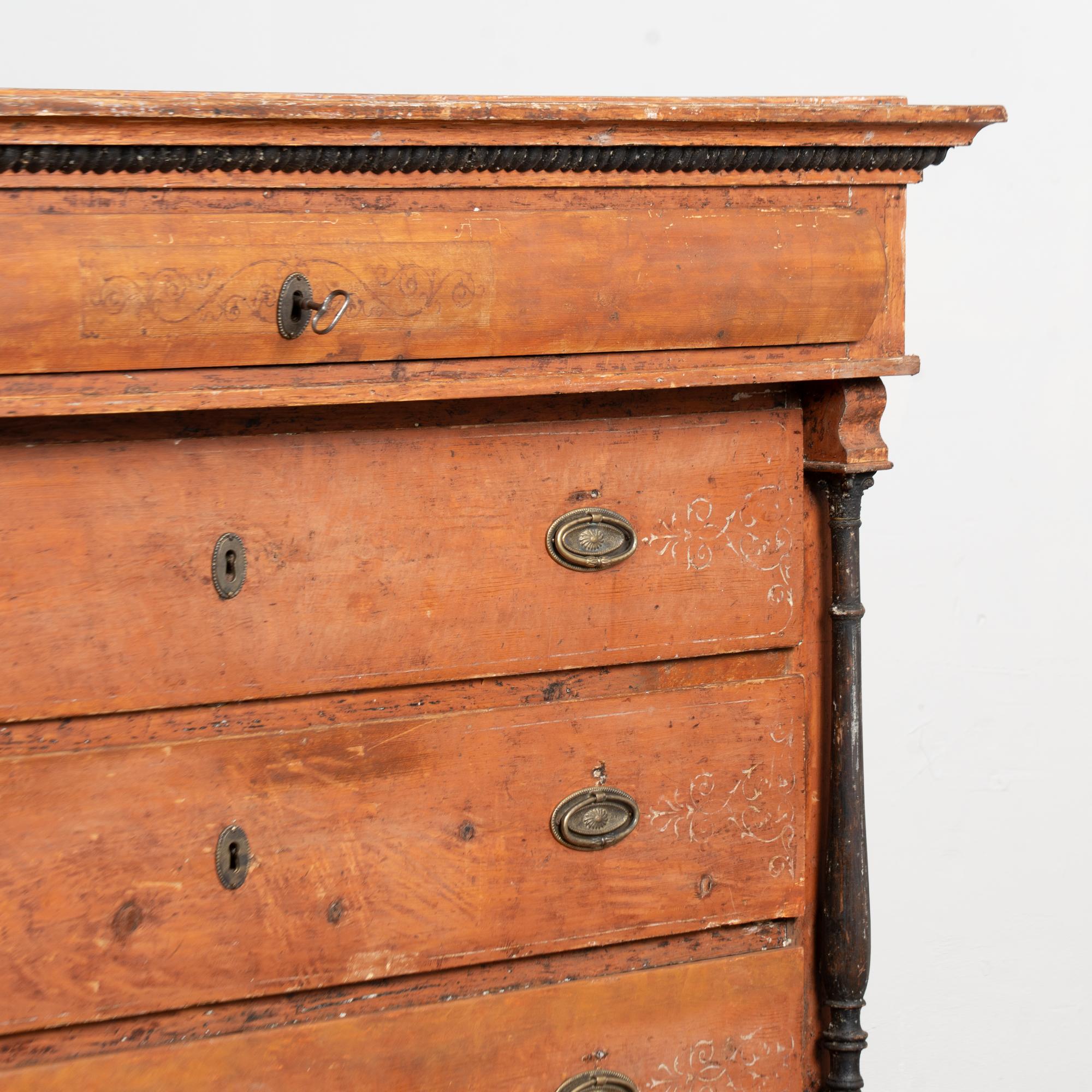 Early 19th-century Danish pine chest of five drawers retaining its original brick red painted finish. The chest is constructed in two sections and features turned black painted columns, a scalloped skirt, and black beaded detailing along the crown, all characteristic of country Biedermeier design. While Biedermeier furniture is often associated with glossy yellow and black finishes, this pine example reflects a rural interpretation of the style.