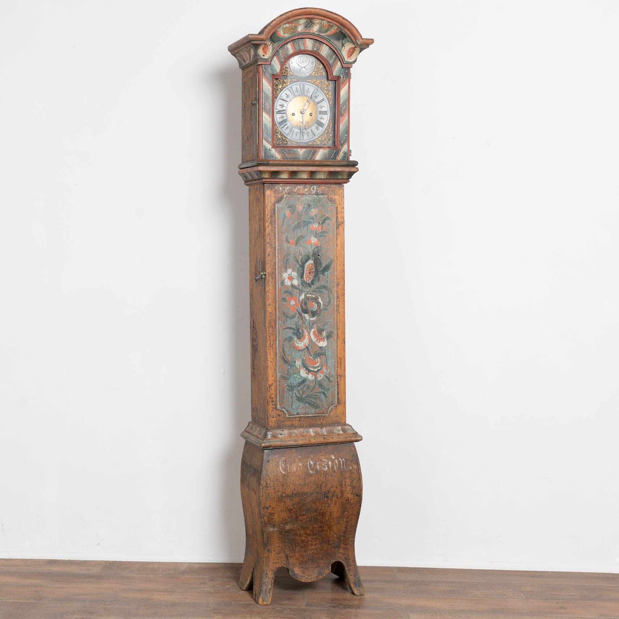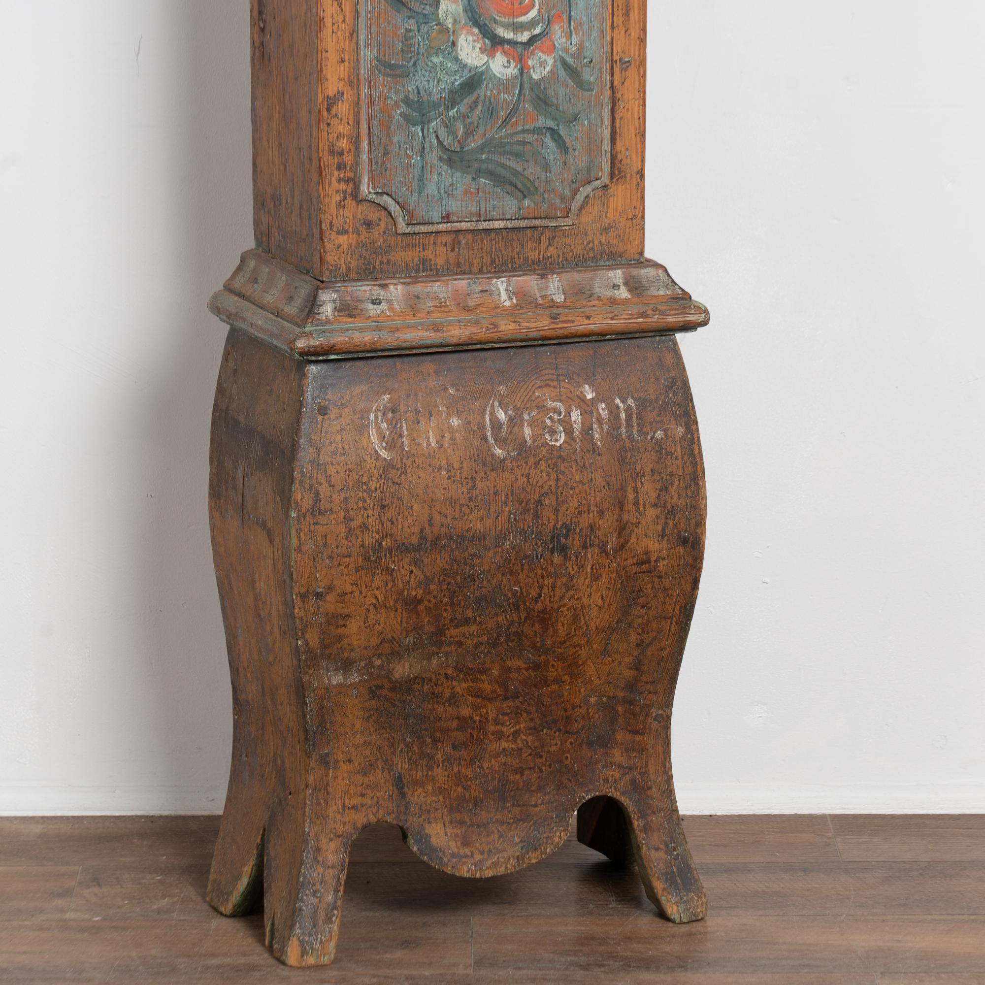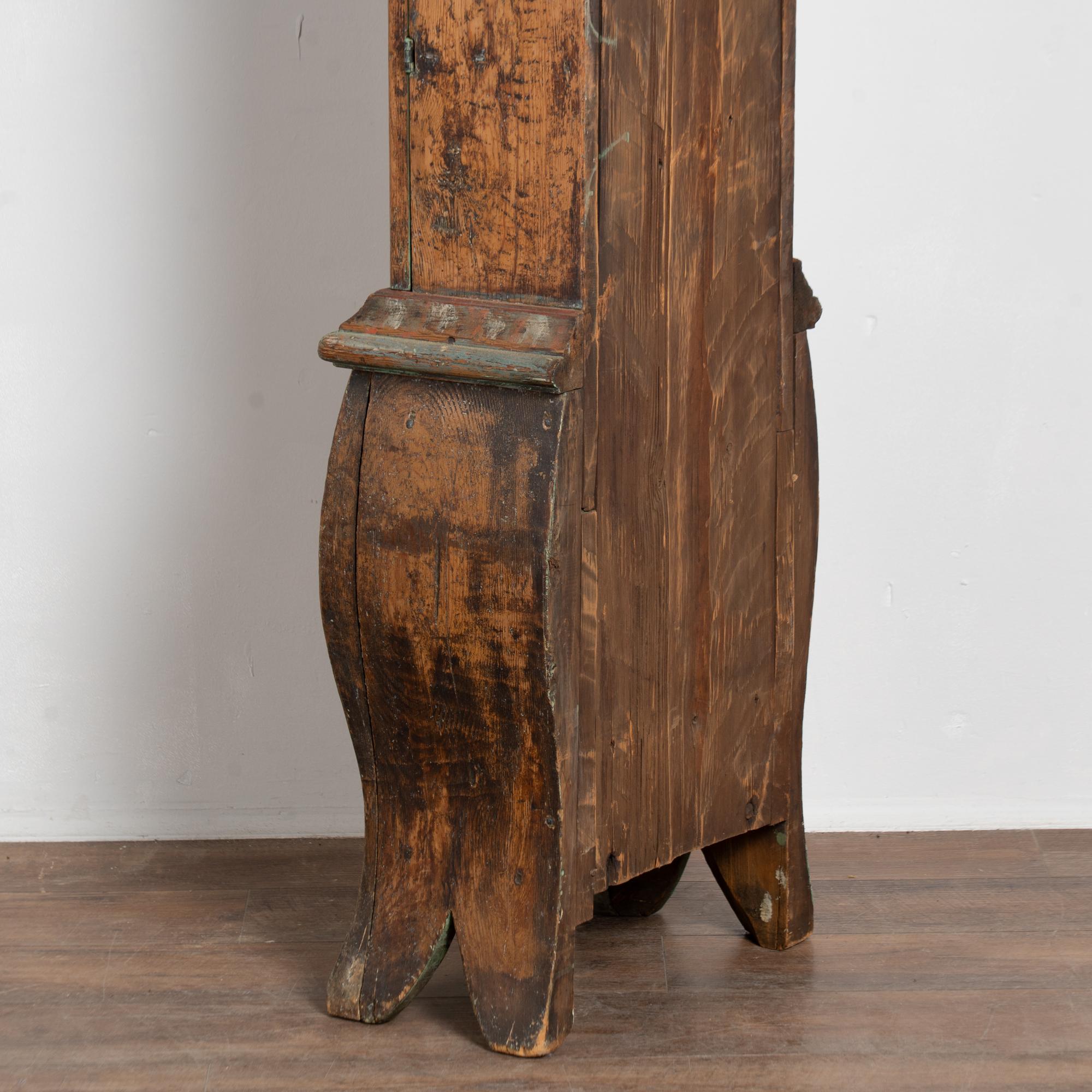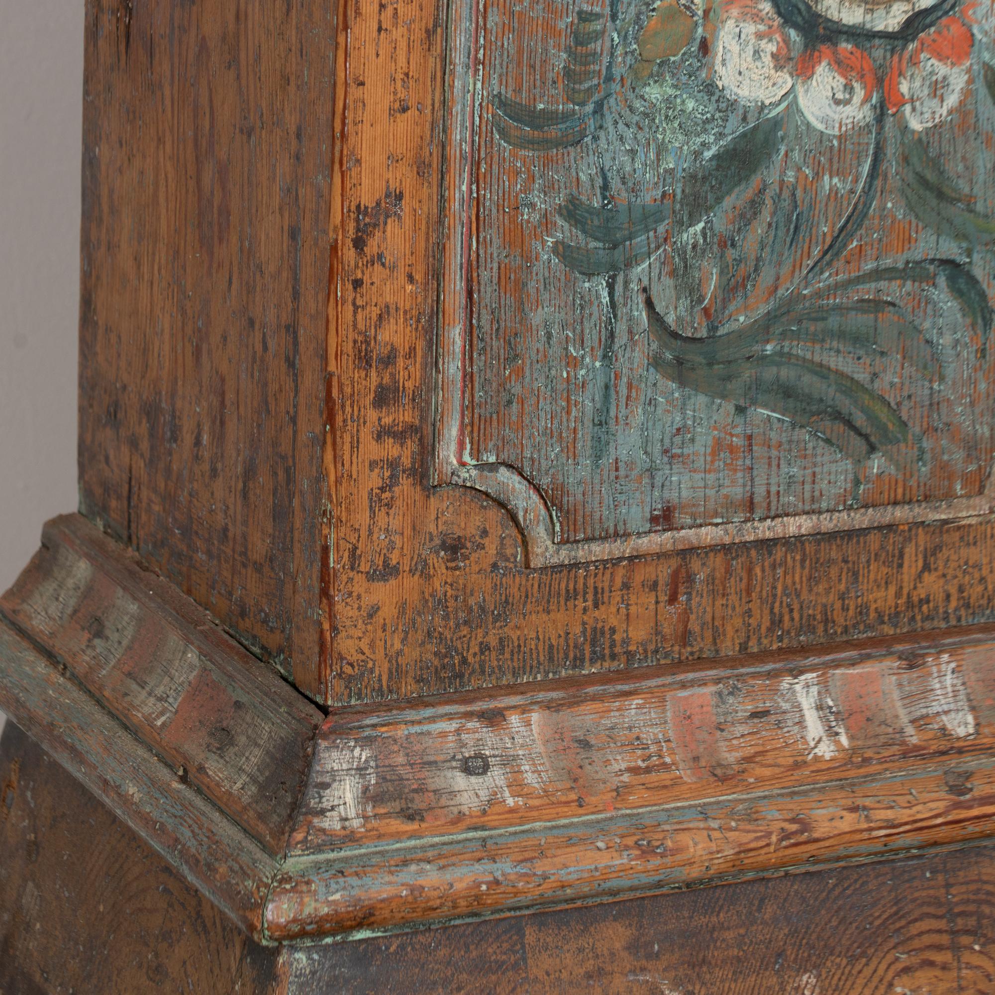 The wood long case has been restored and remains strong and stable. The original clockworks no longer function. Many buyers choose to install a battery-operated mechanism for ease of use; this is left to the buyer’s discretion.