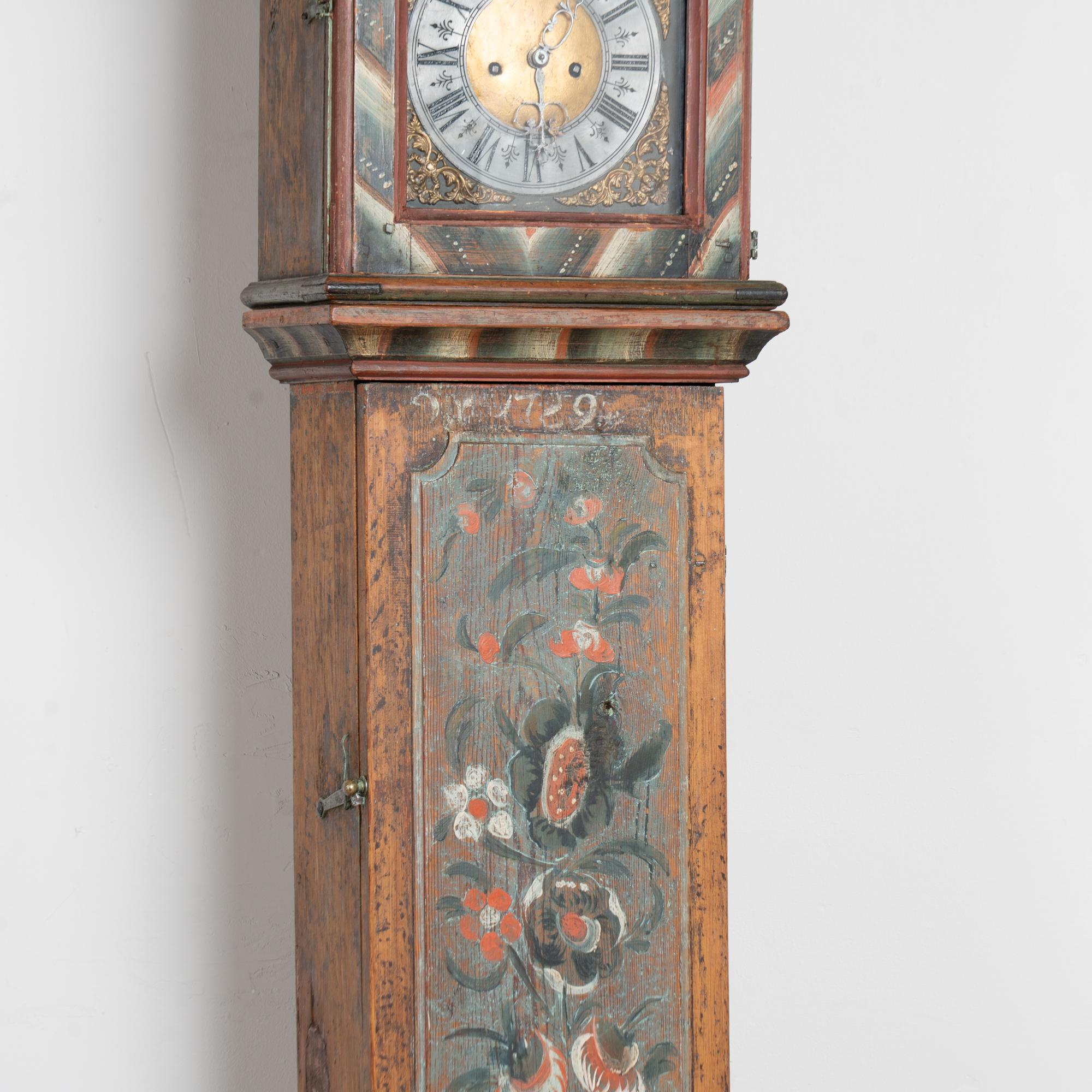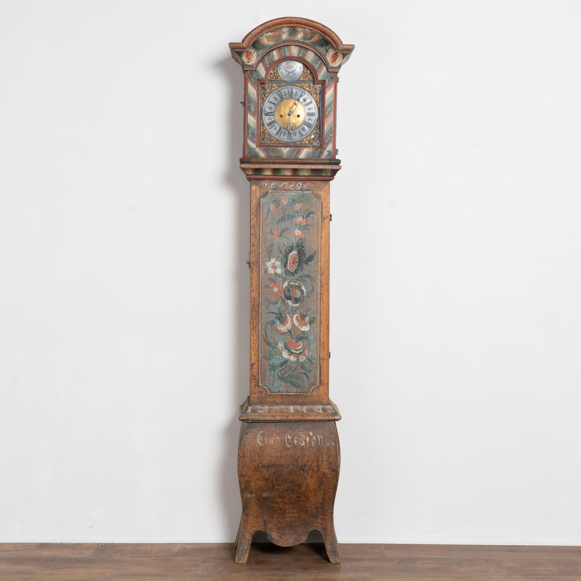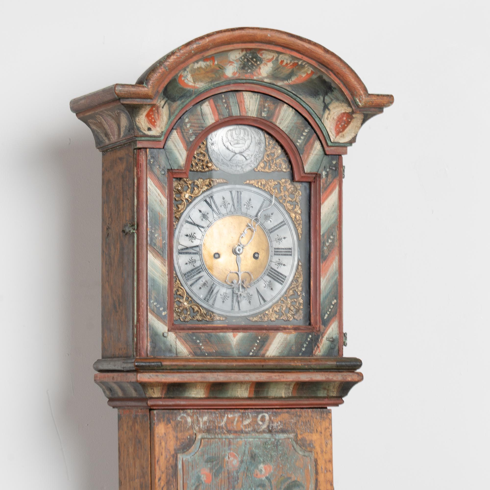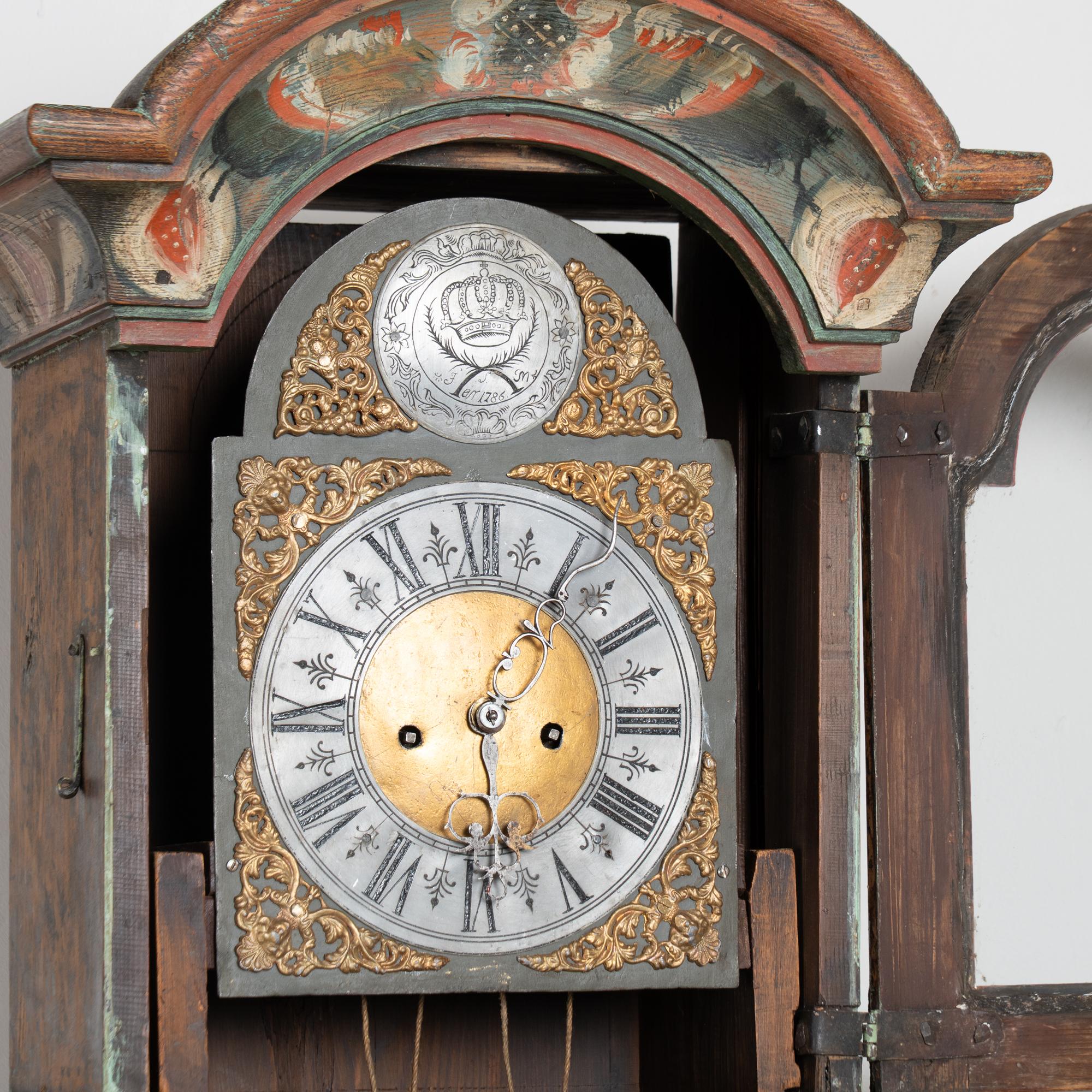 Late 18th-century Swedish grandfather clock crafted in pine with original painted finish in blue, teal, red, and white. The clock features a curved bonnet that frames a dramatic clock face, with decorative filagree detailing and original styling visible in the face and hands. Above the face is a circular tin disc marked ISM dated 1786, decorated with a royal crown and vine motif. The central door bears the text Erich Ersson and the date 1789 on the lower cabinet section.