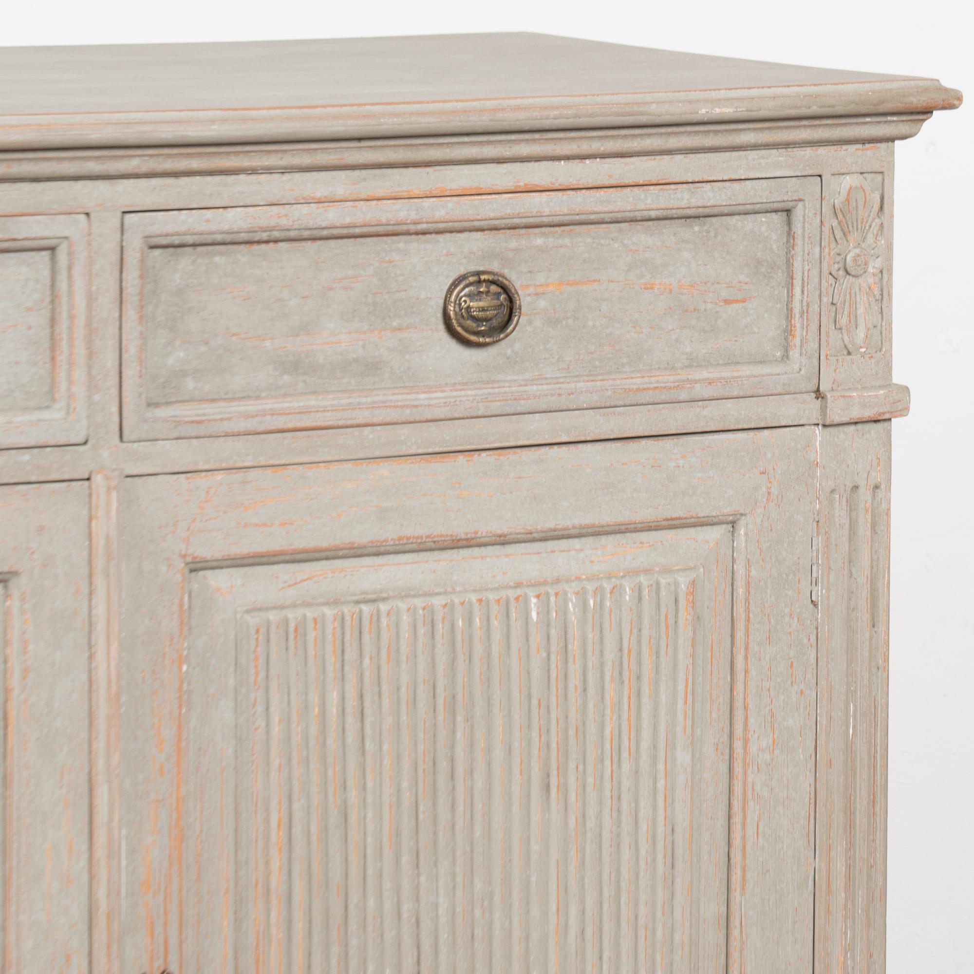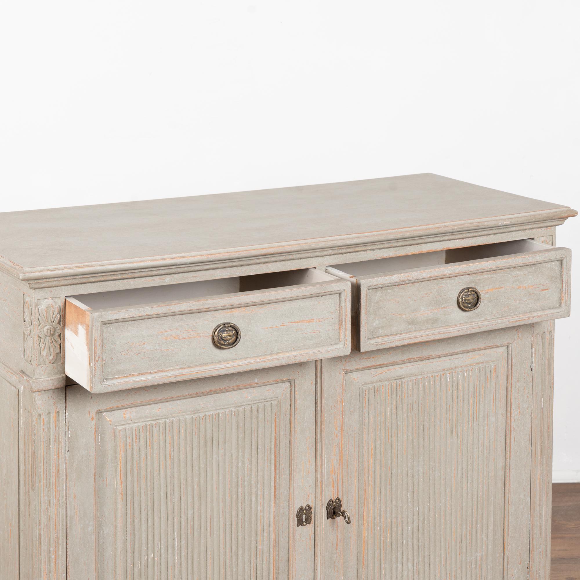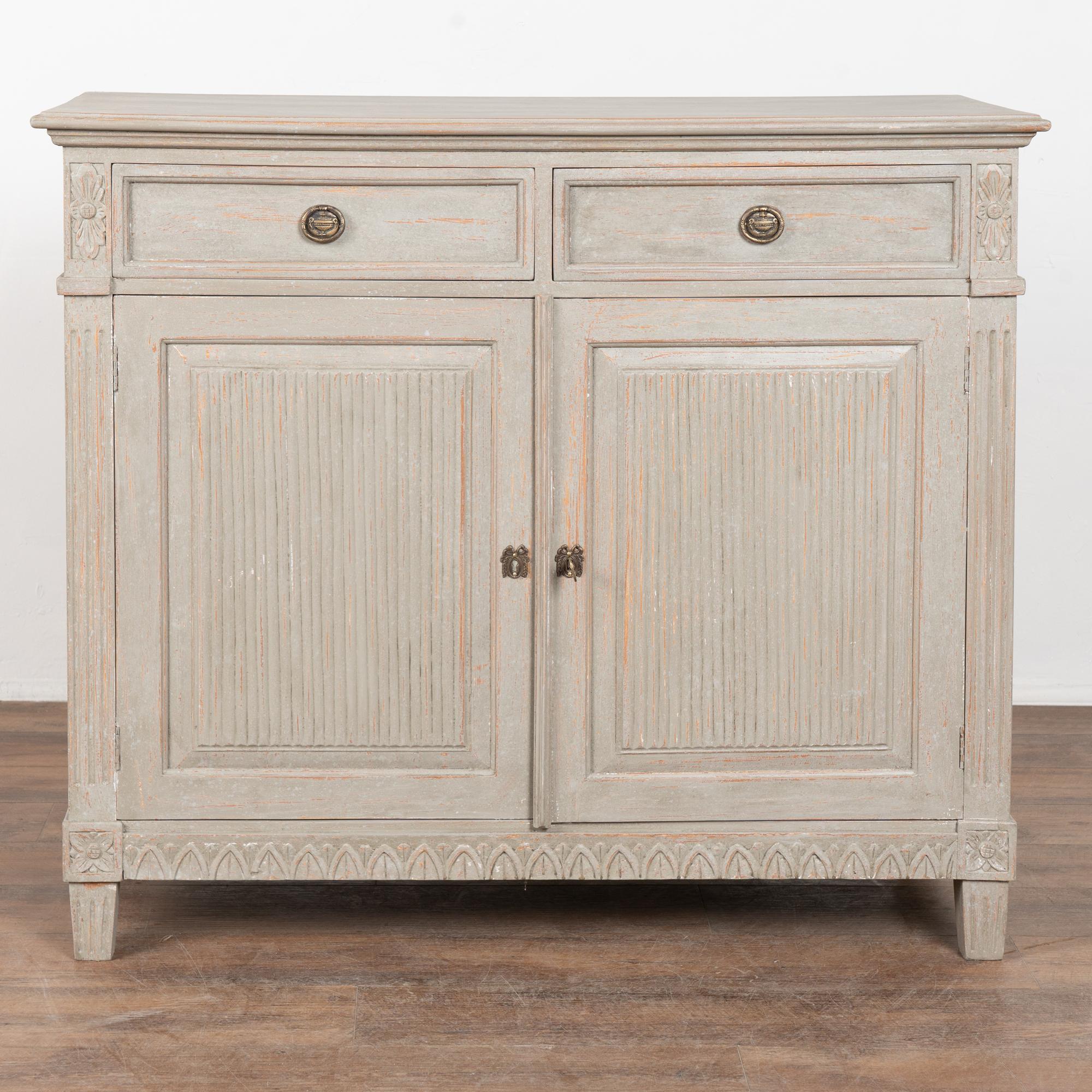 Late 19th century Swedish Gustavian style sideboard or buffet crafted in pine with two drawers over fluted cabinet doors. The case features fluted side columns topped with carved floral medallions and a decorative skirt detailed with an egg-and-dart pattern, all resting on fluted tapered feet. The sideboard presents well from the sides, with additional carved detail visible in profile.