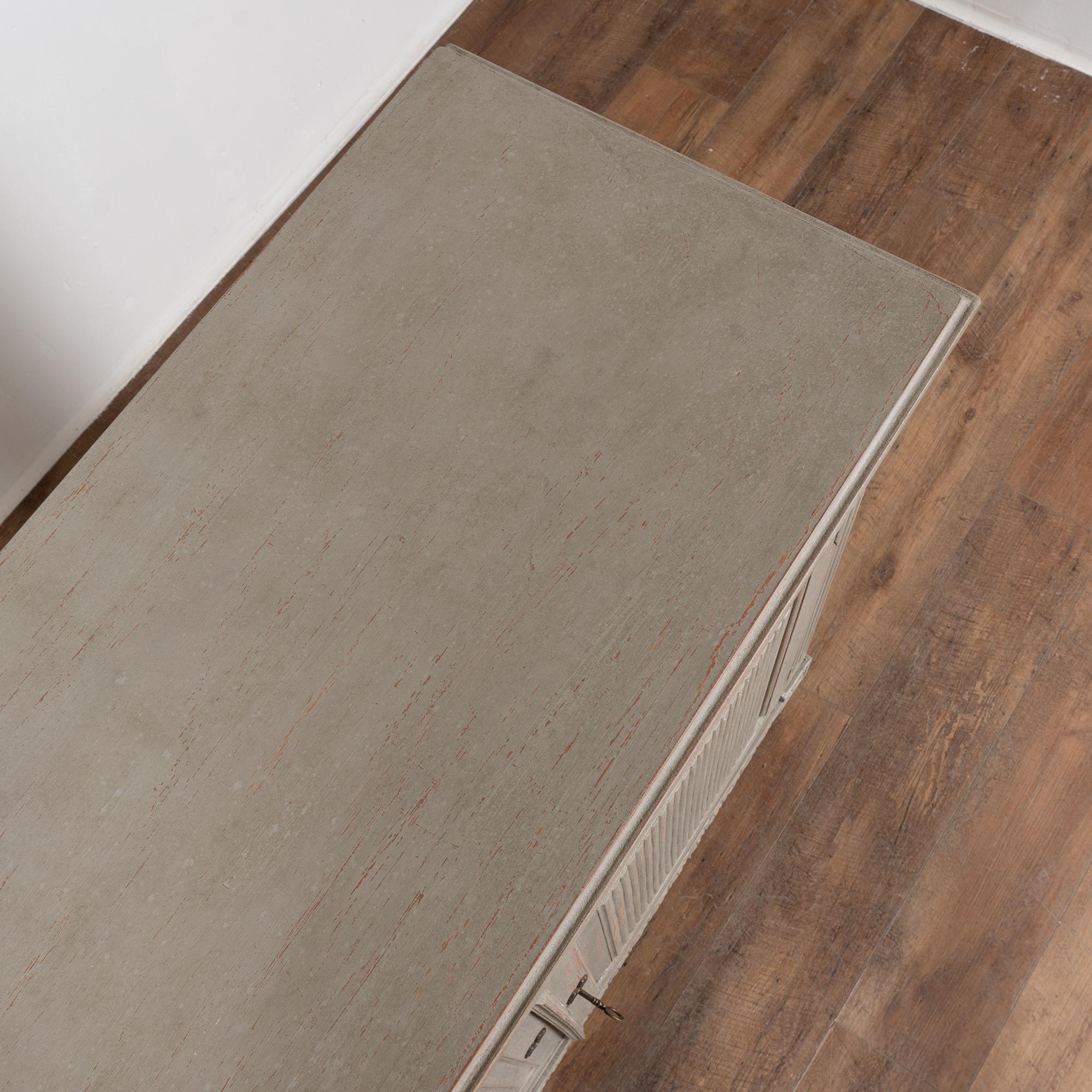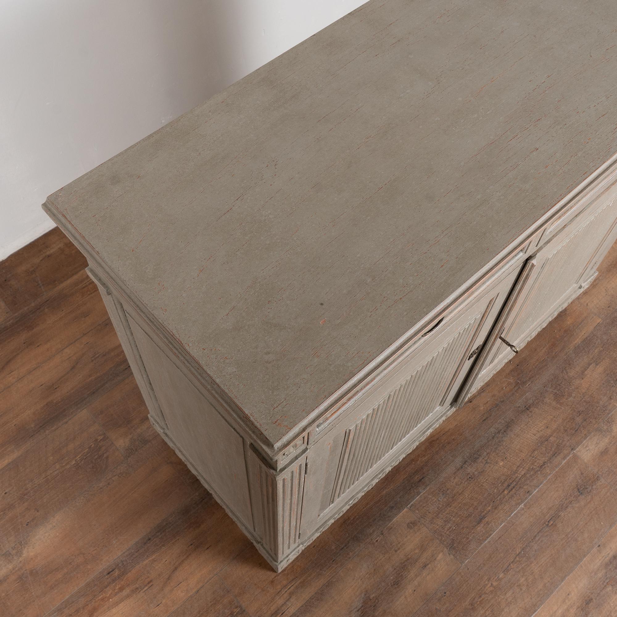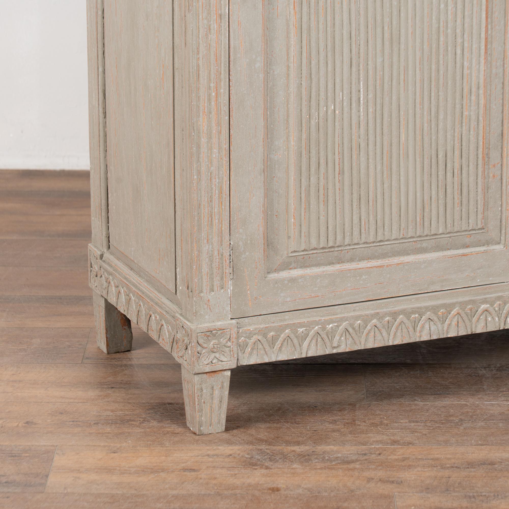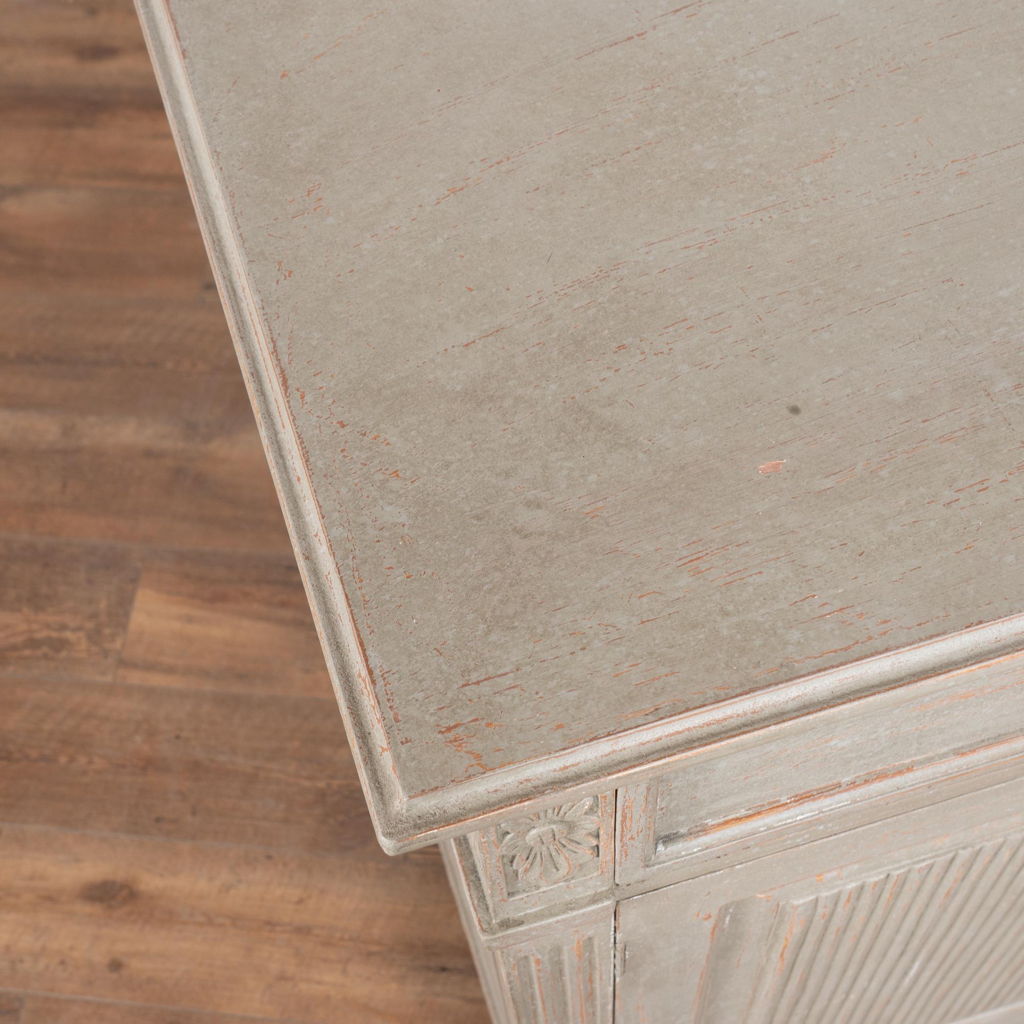 Late 19th century Swedish Gustavian style sideboard or buffet crafted in pine with two drawers over fluted cabinet doors. The case features fluted side columns topped with carved floral medallions and a decorative skirt detailed with an egg-and-dart pattern, all resting on fluted tapered feet. The sideboard presents well from the sides, with additional carved detail visible in profile.