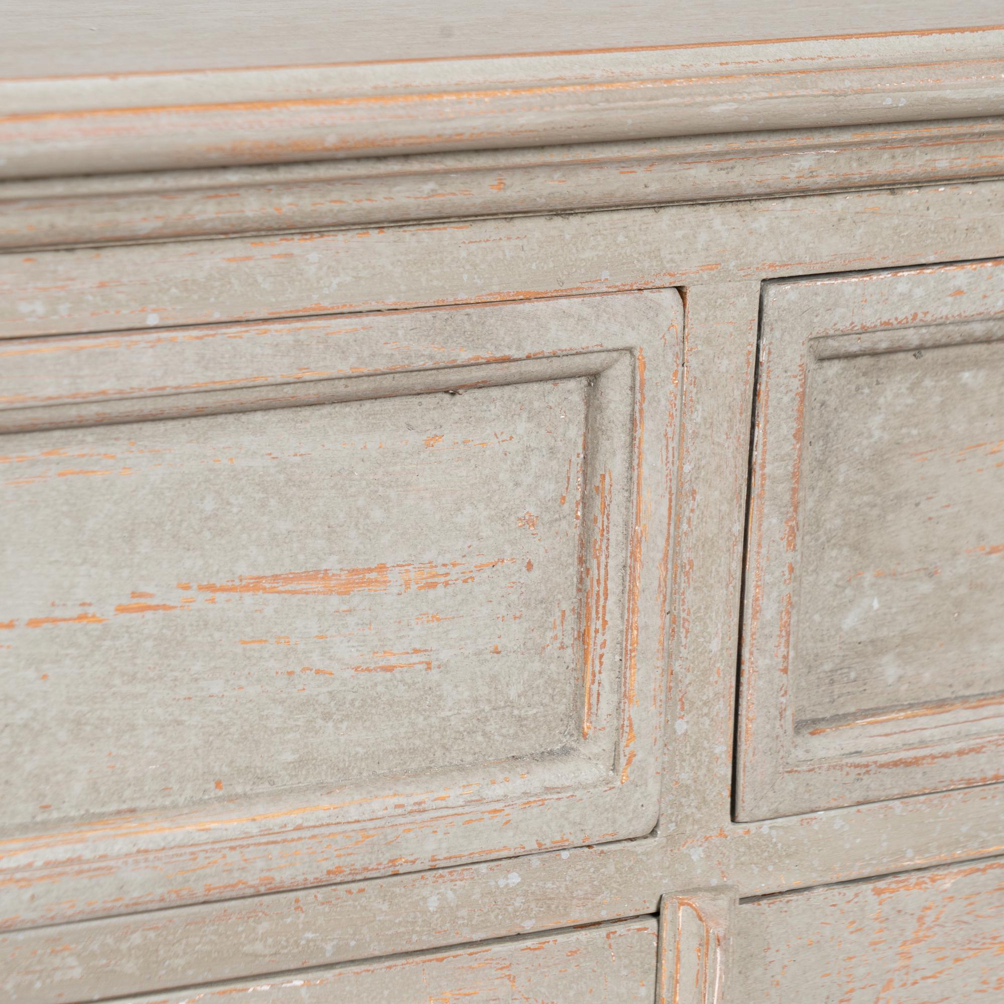 The exterior has a newer professionally applied layered gray painted finish with subtle white undertones, lightly distressed to reveal natural wood beneath and suit the character of the piece. The interior is painted a contrasting white, and the back is finished in a newer distressed white as well.