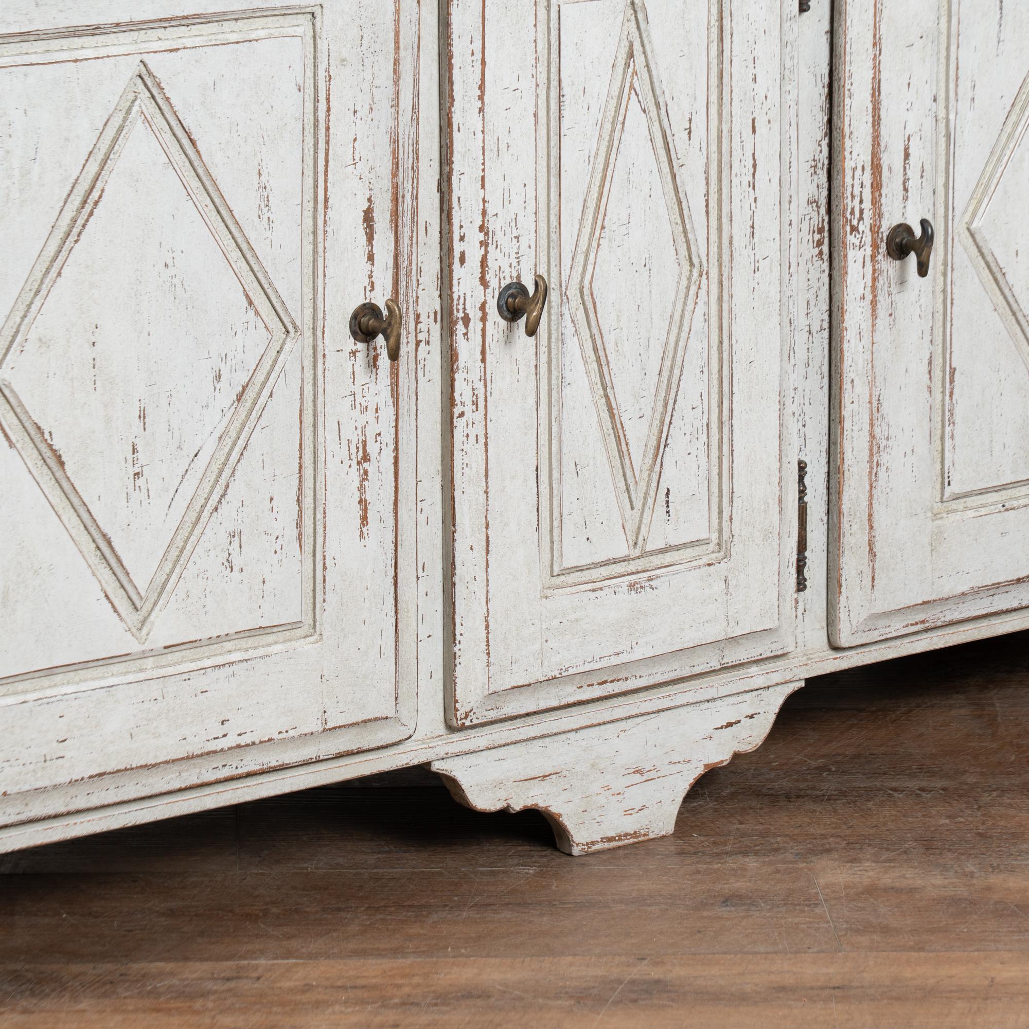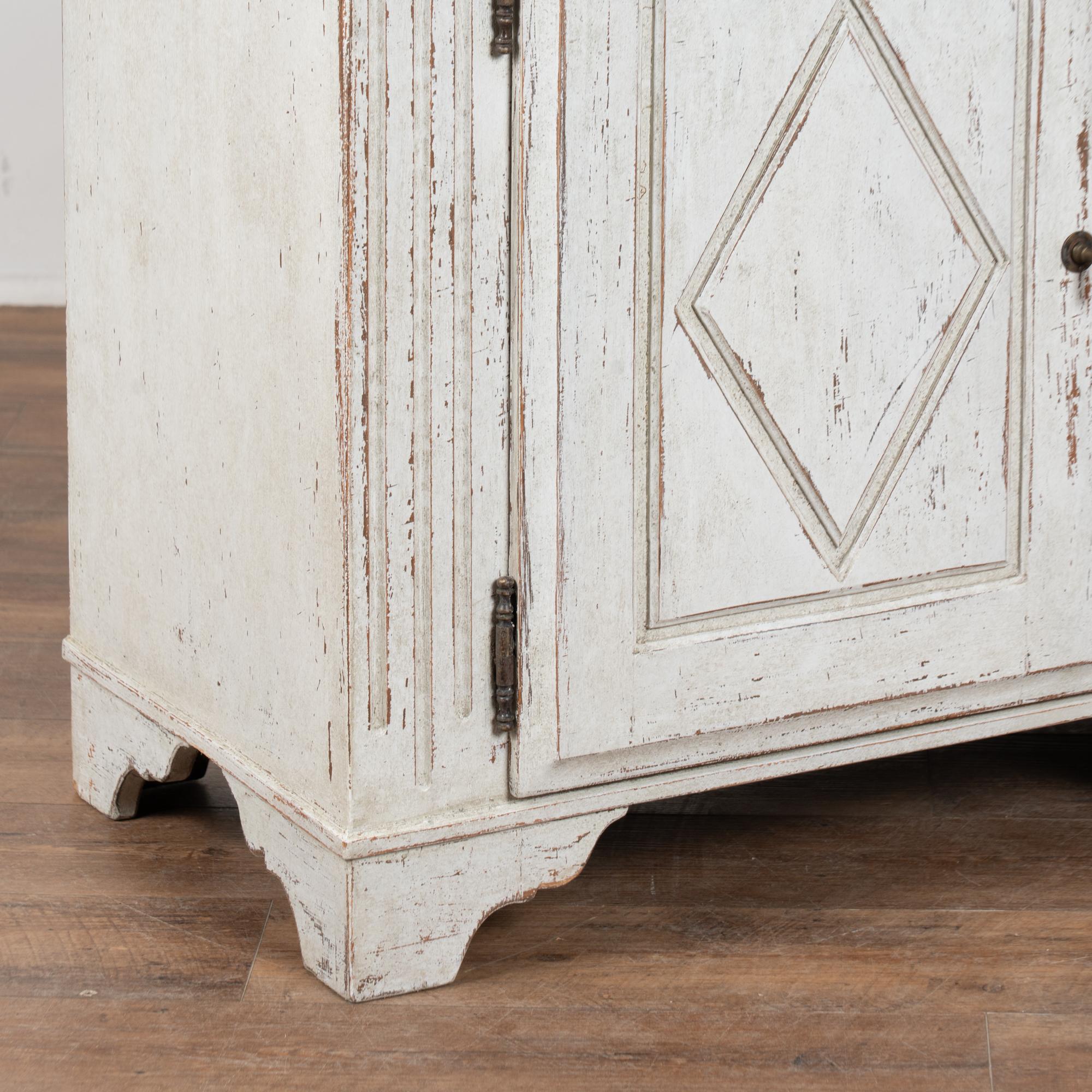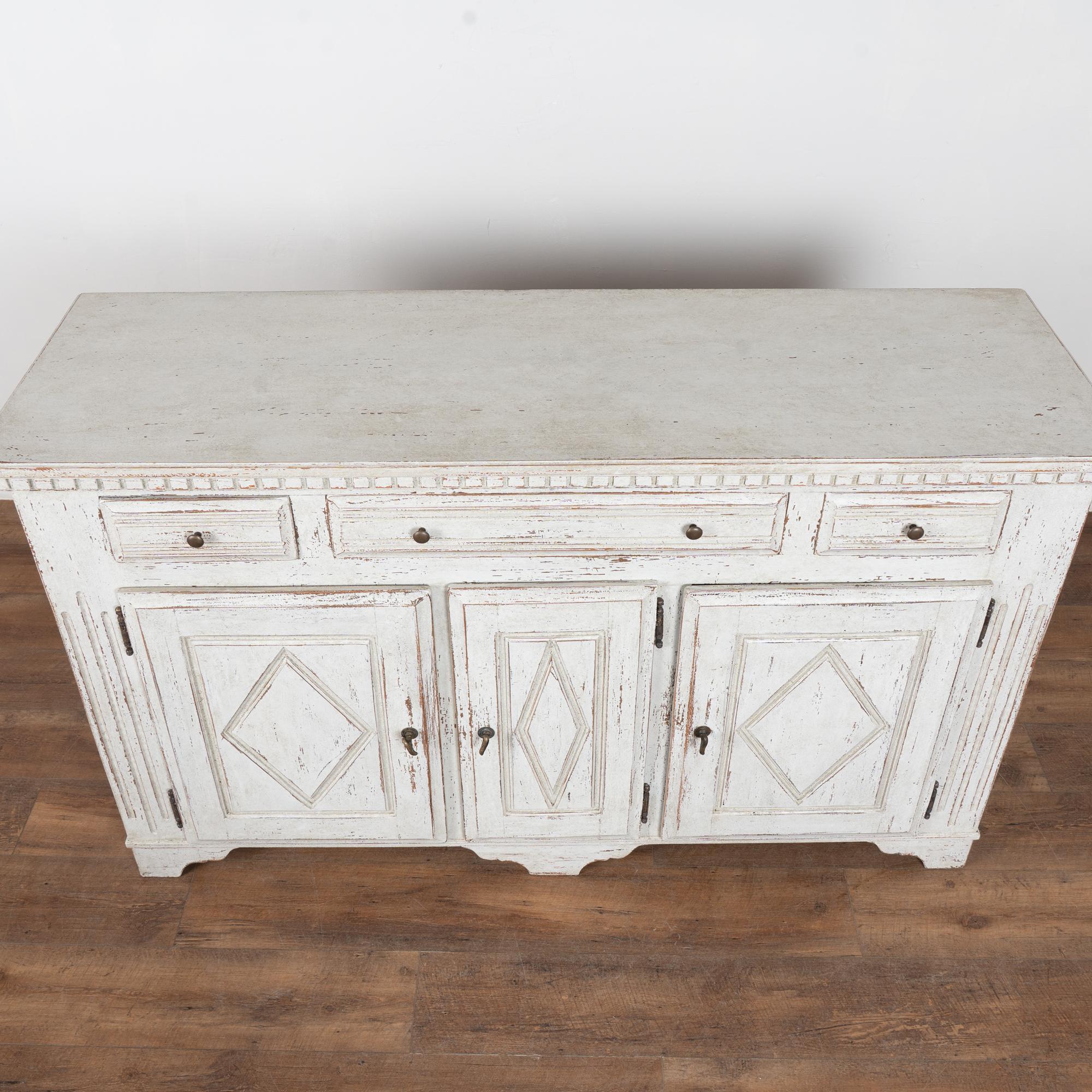 The exterior has a newer professionally applied antique white painted finish with light gray undertones, gently distressed throughout to reveal natural wood beneath and suit the character and age of the piece. The three cabinet doors open and secure with turning brass latches. All drawers open easily.
