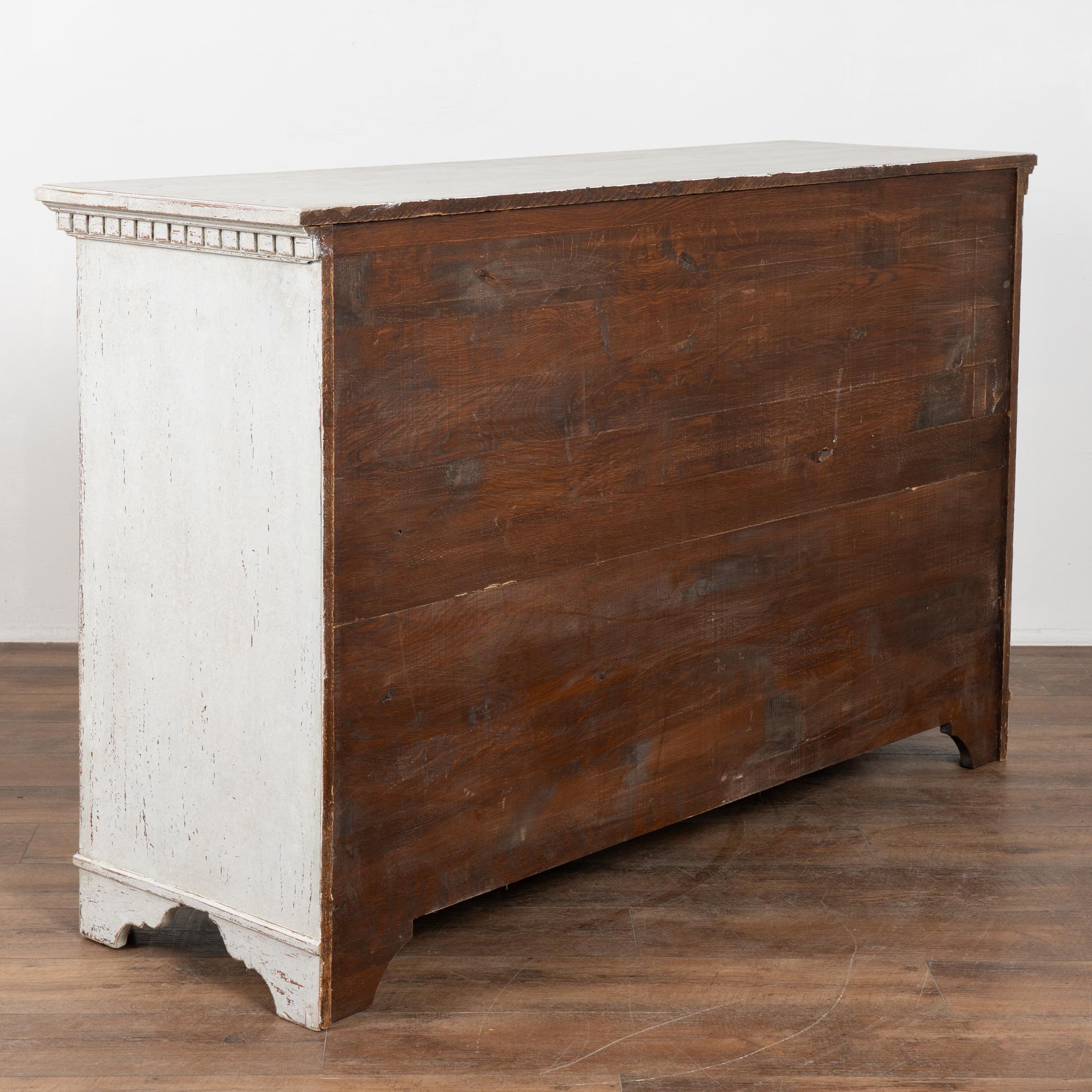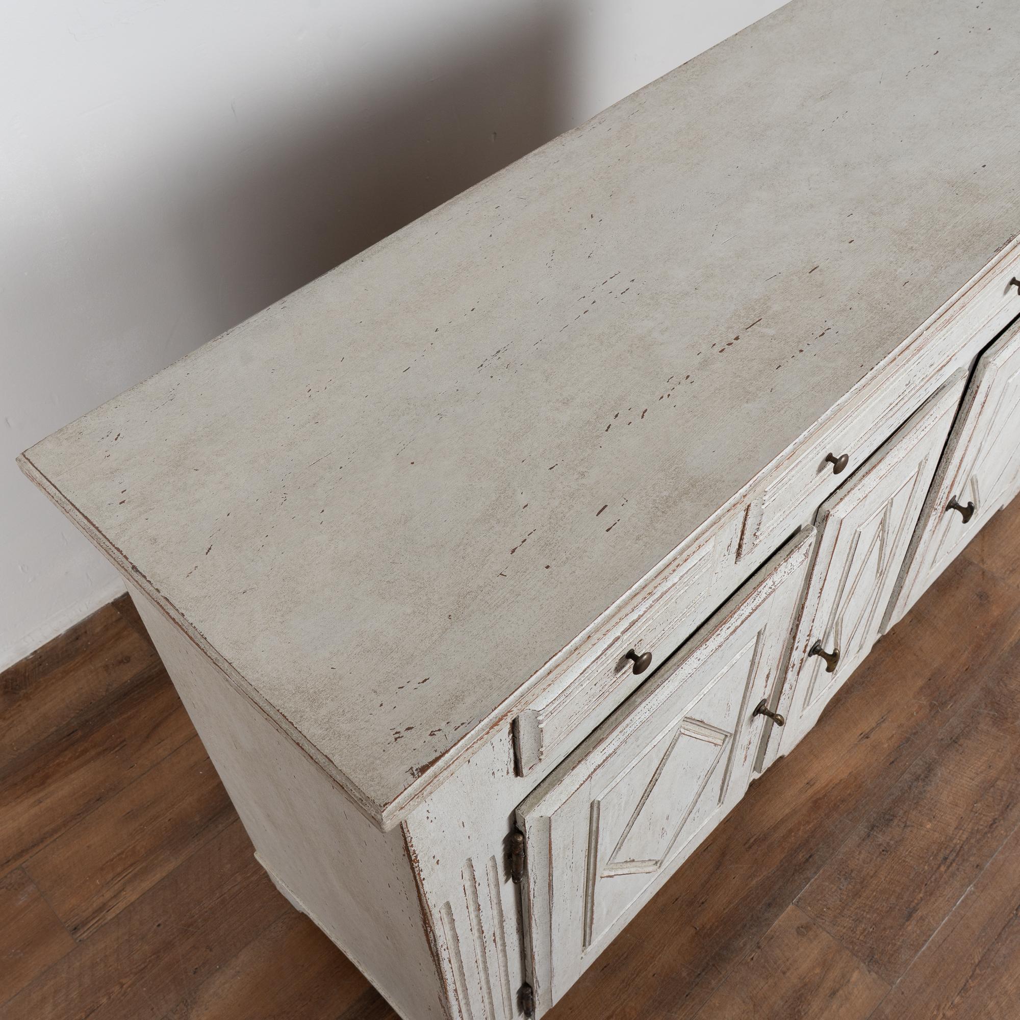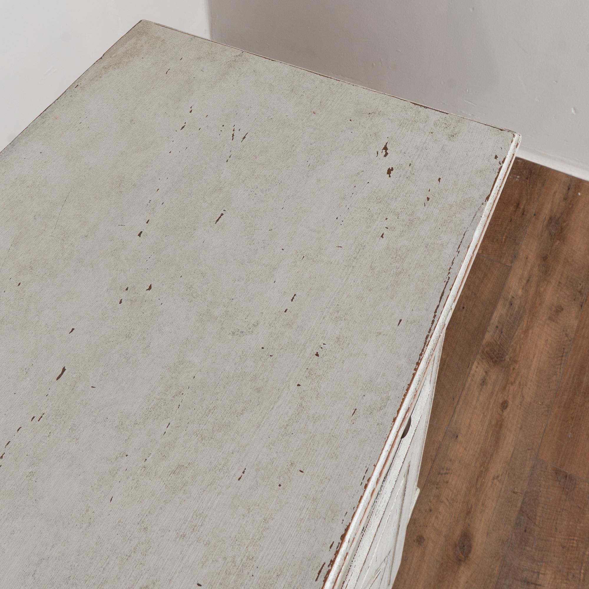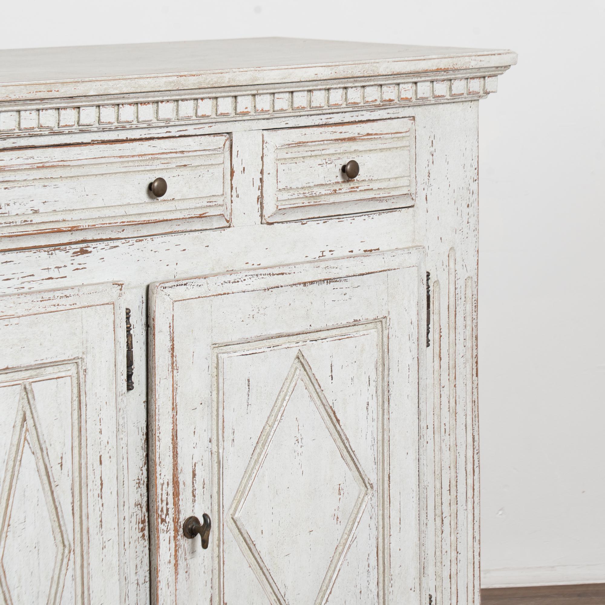 The exterior has a newer professionally applied antique white painted finish with light gray undertones, gently distressed throughout to reveal natural wood beneath and suit the character and age of the piece. The three cabinet doors open and secure with turning brass latches. All drawers open easily.