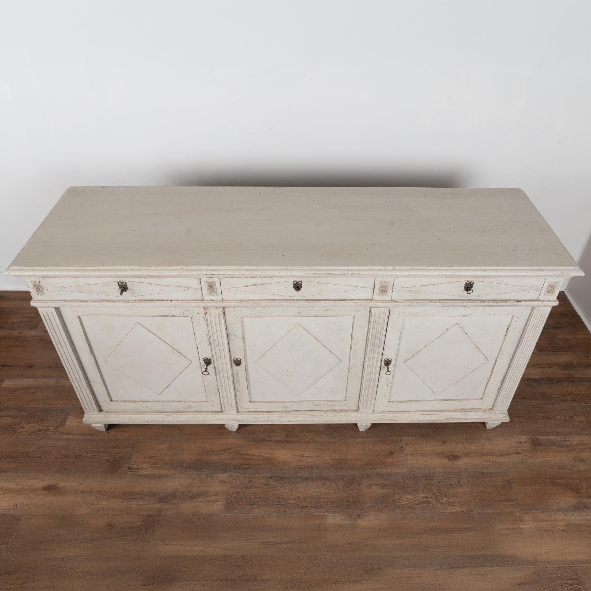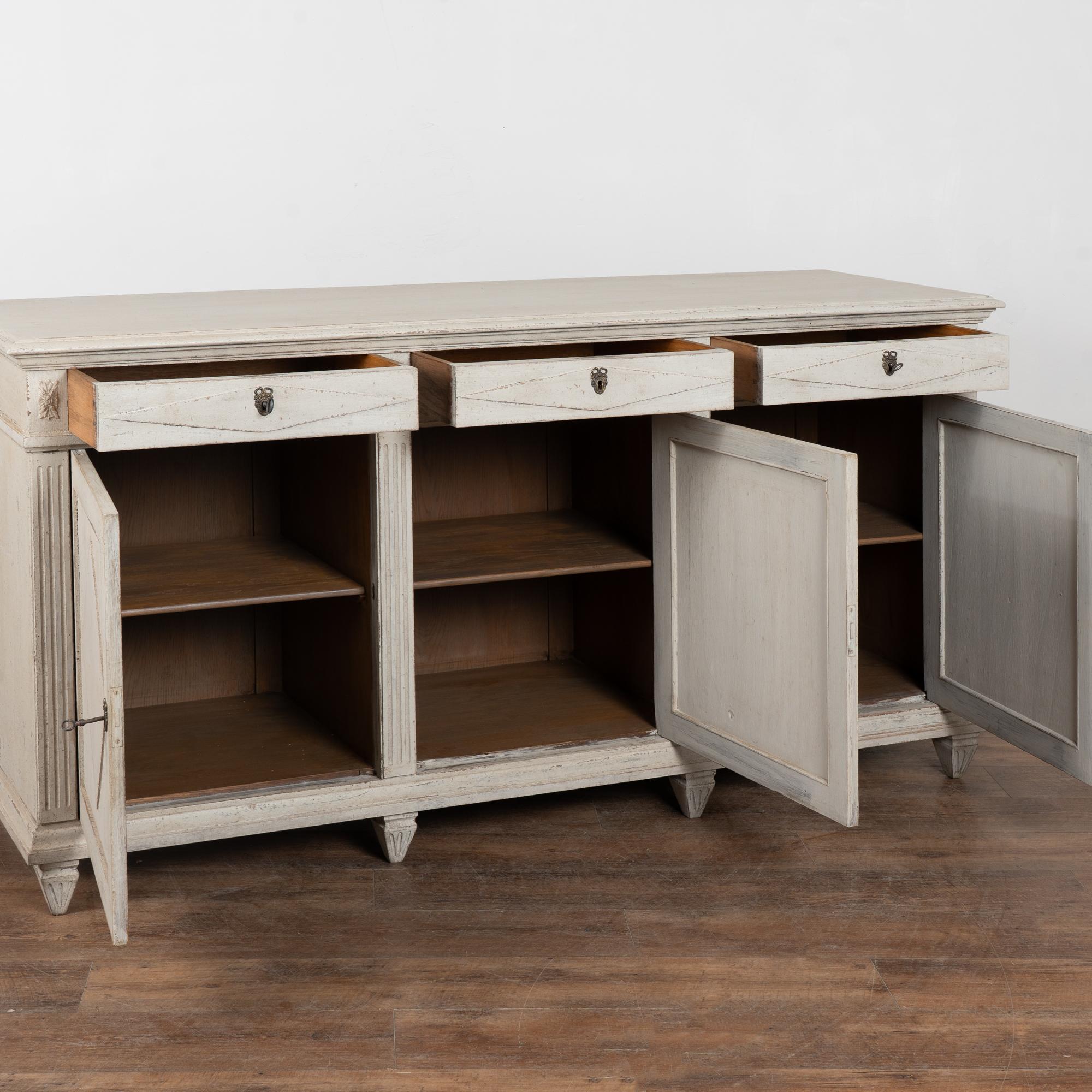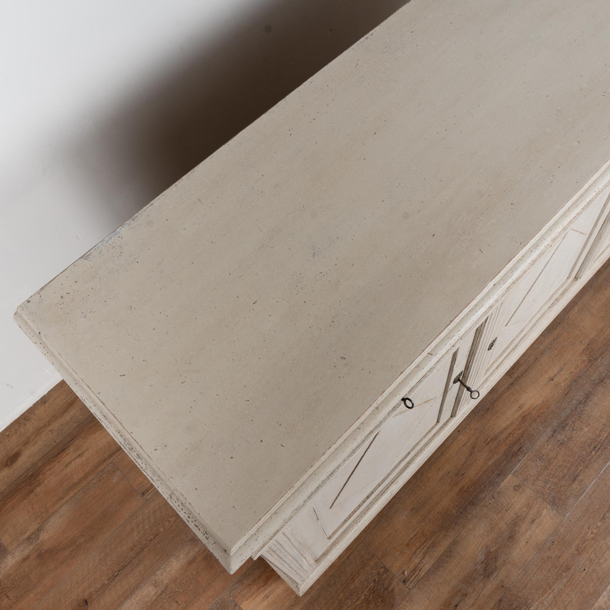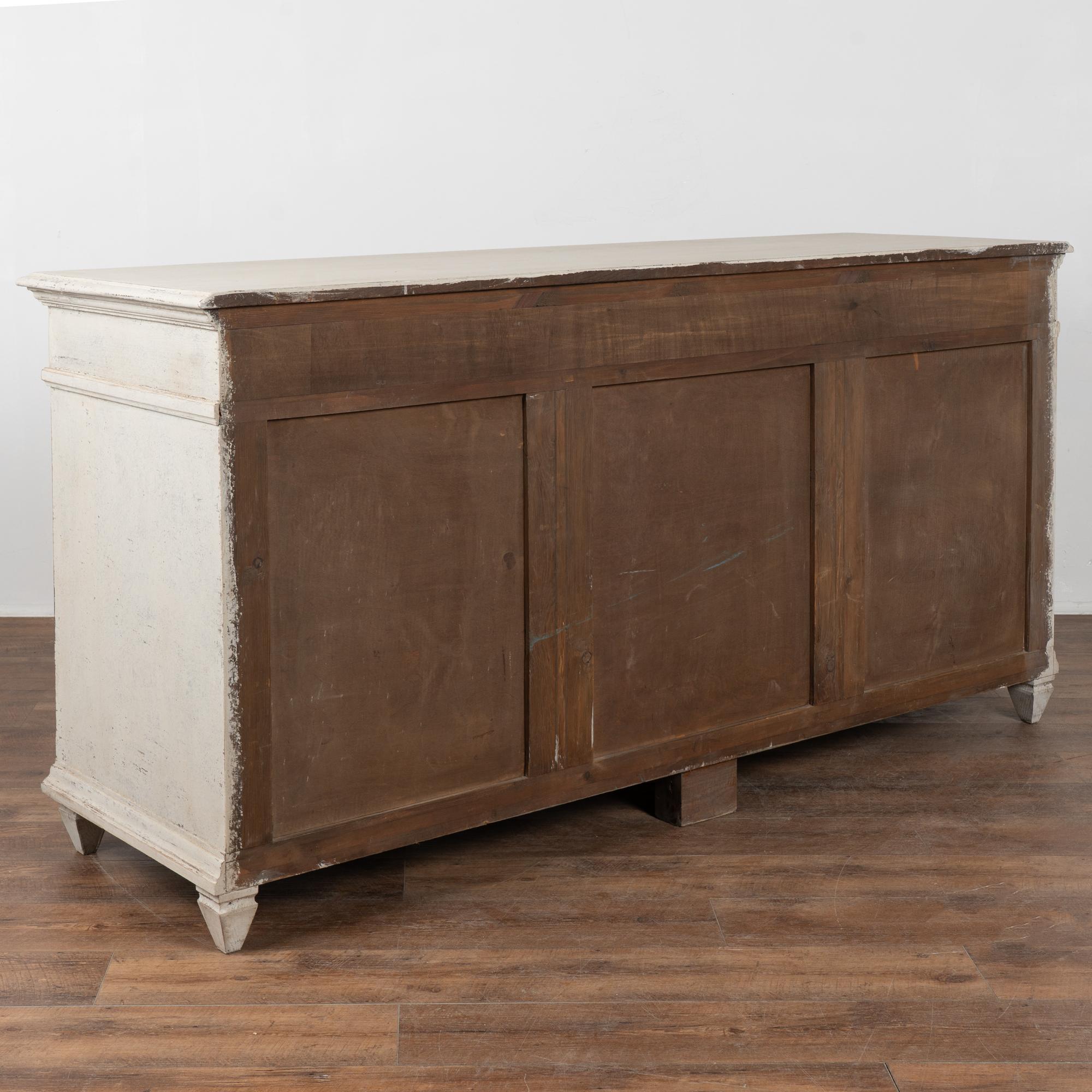 A newer professionally applied antique white painted finish with soft gray undertones has been lightly distressed throughout to suit the age and graceful character of the buffet. Age-related cracks are visible along the top, with additional minor cracking on the sides. Minor scratches and surface wear reflect years of use.