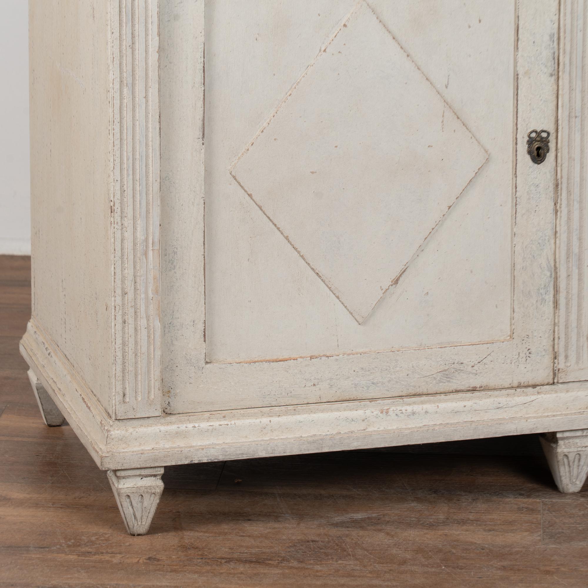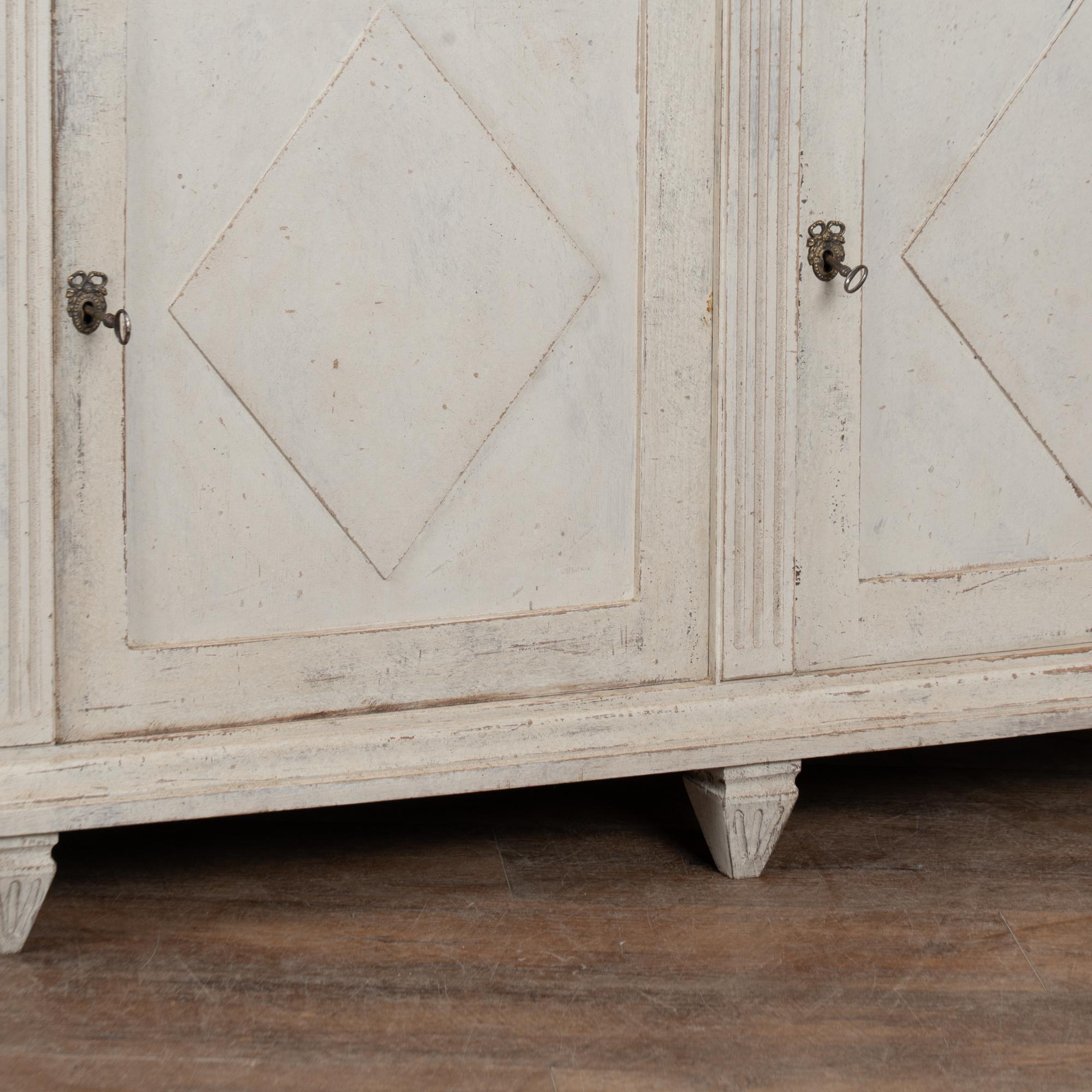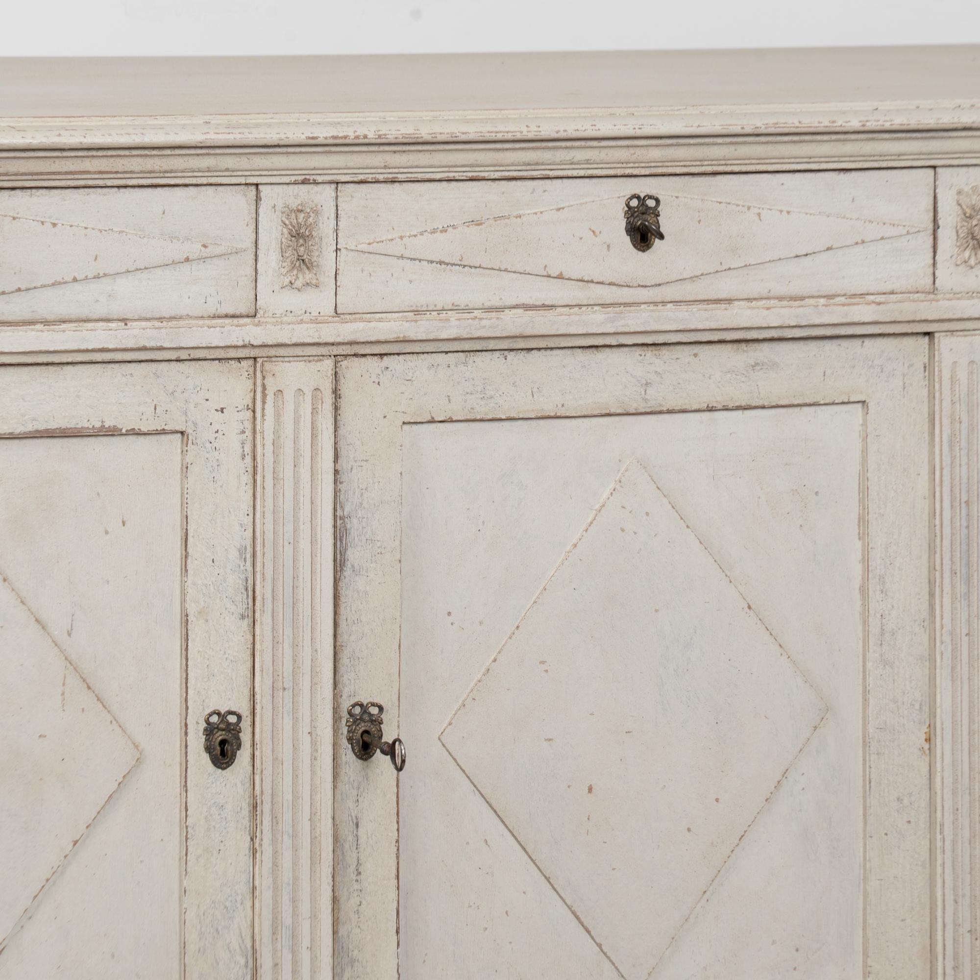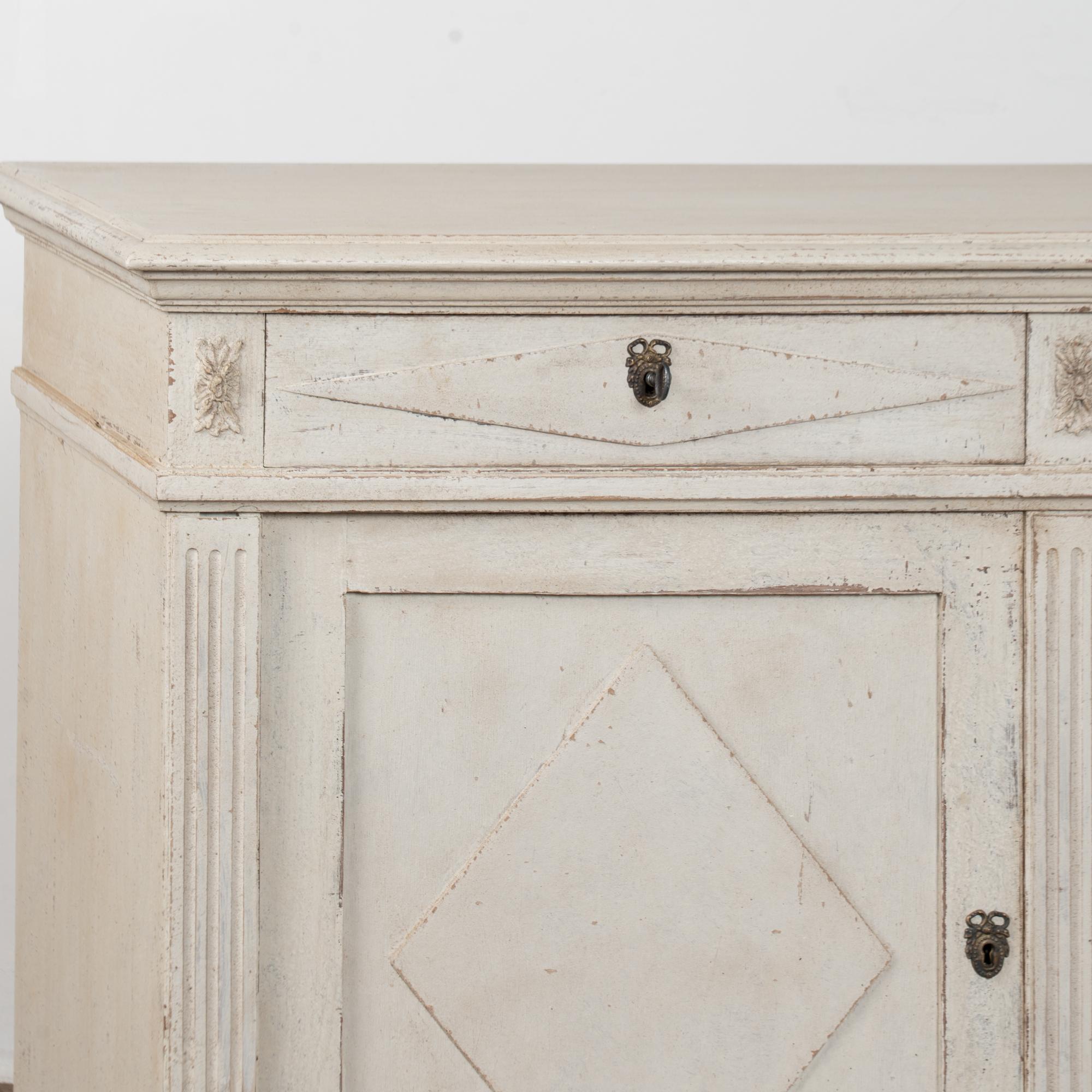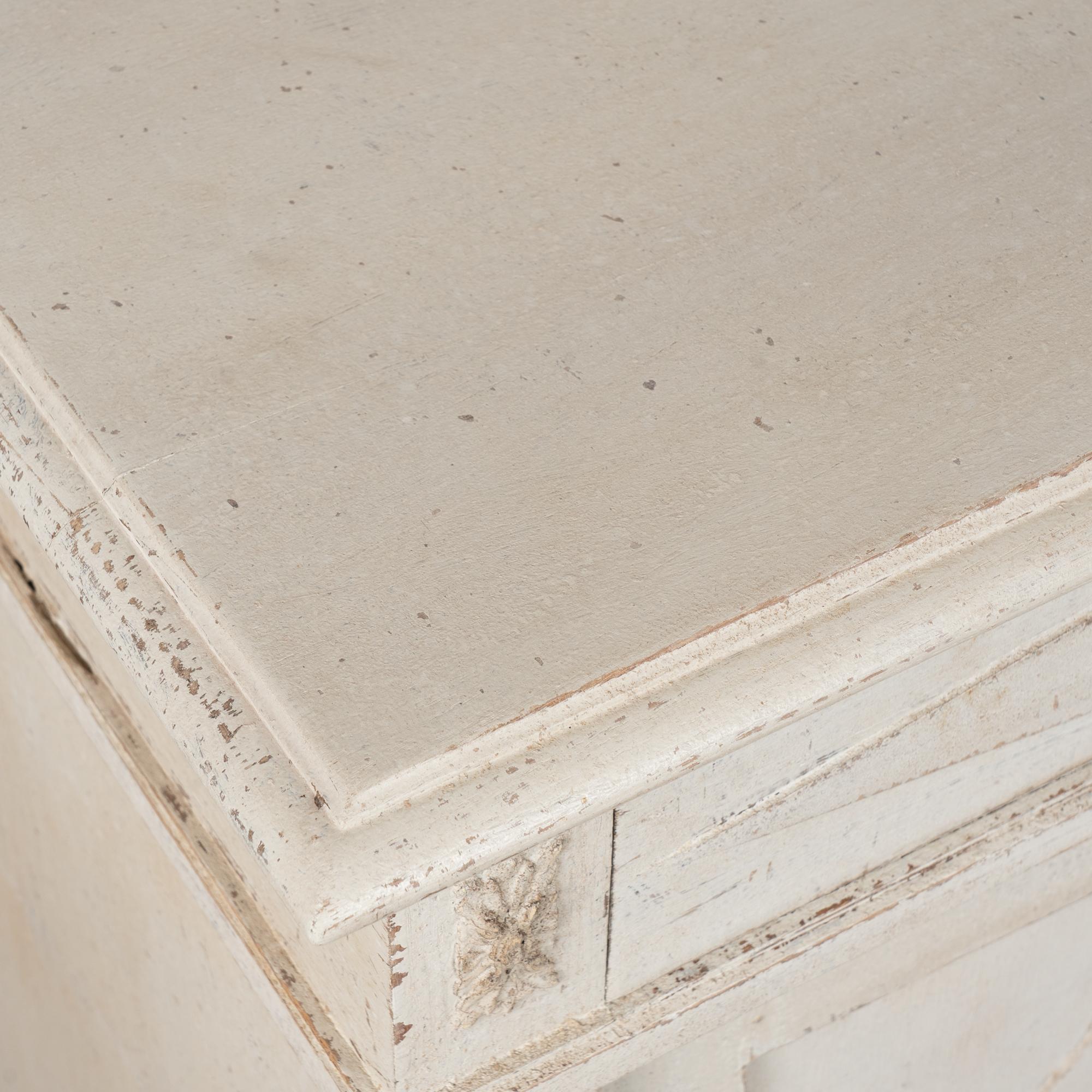 A newer professionally applied antique white painted finish with soft gray undertones has been lightly distressed throughout to suit the age and graceful character of the buffet. Age-related cracks are visible along the top, with additional minor cracking on the sides. Minor scratches and surface wear reflect years of use.