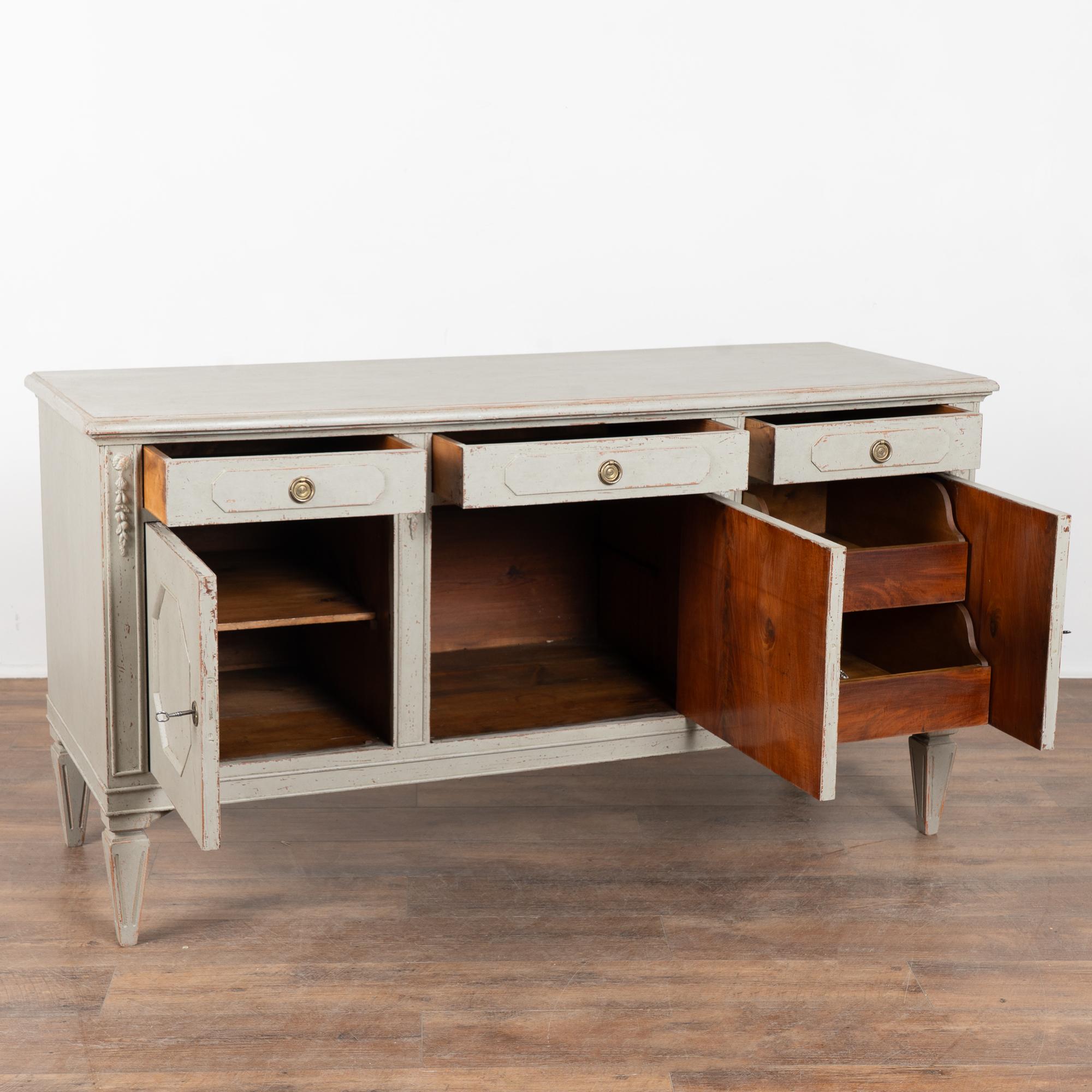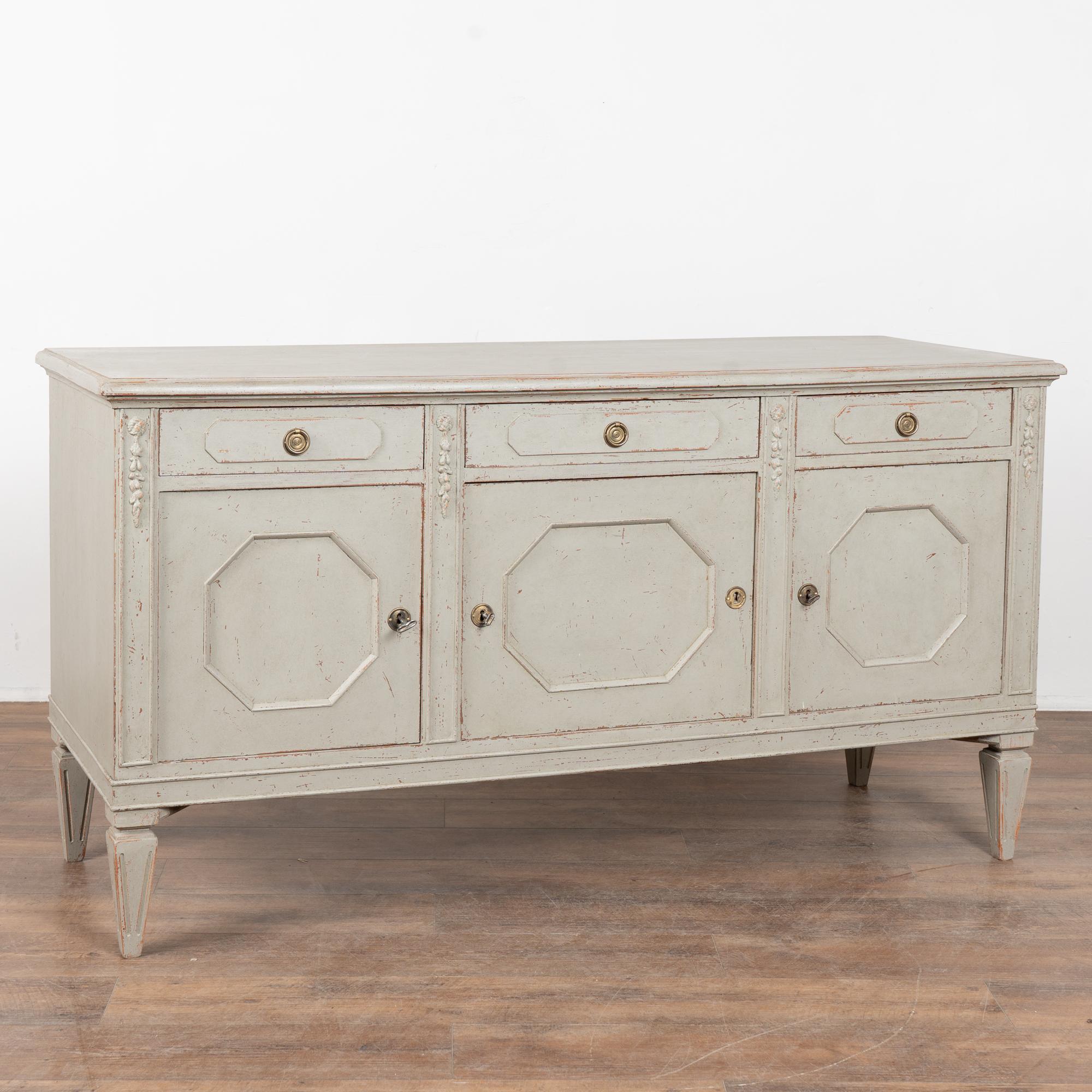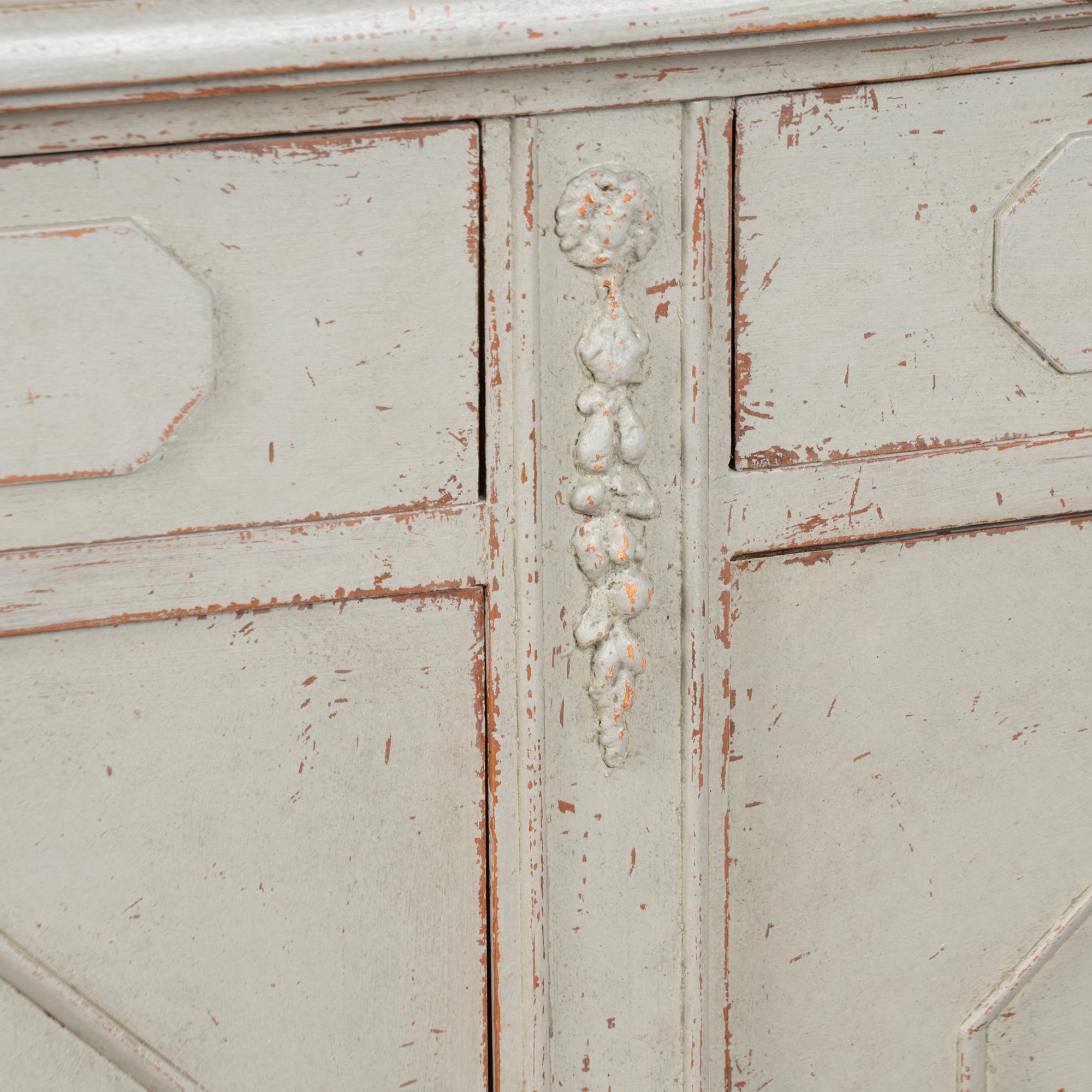Early 20th-century Swedish Gustavian style sideboard buffet crafted in pine with a three-drawer over three-door configuration. The upper drawers are fitted with brass ring pulls, and the cabinet doors feature octagon-shaped panels. The case is raised on fluted tapered feet, with applied carved swag accents decorating the front posts/columns.
