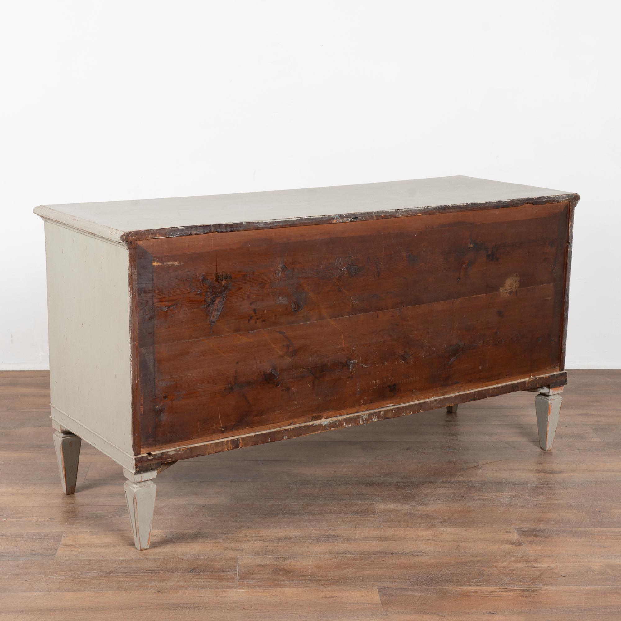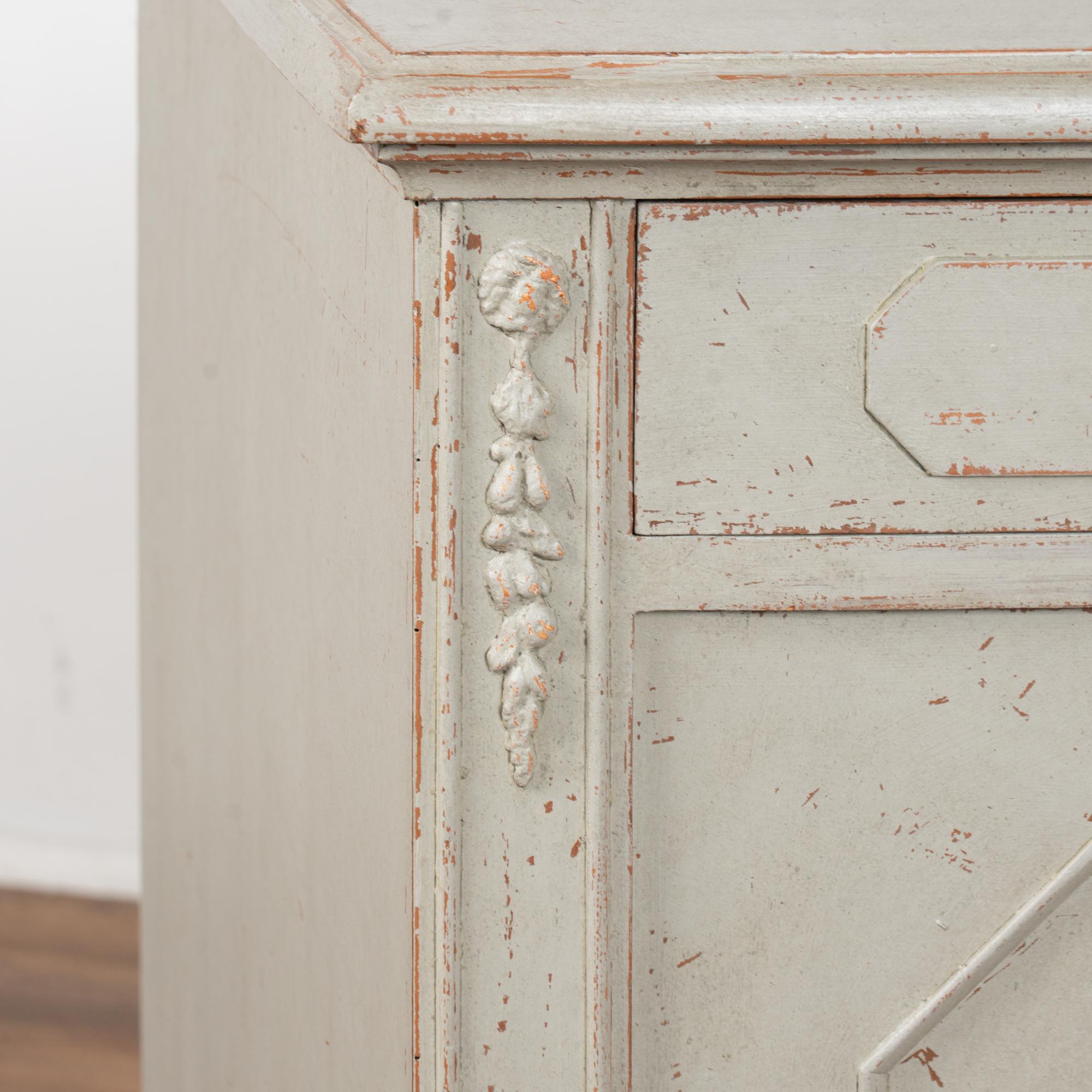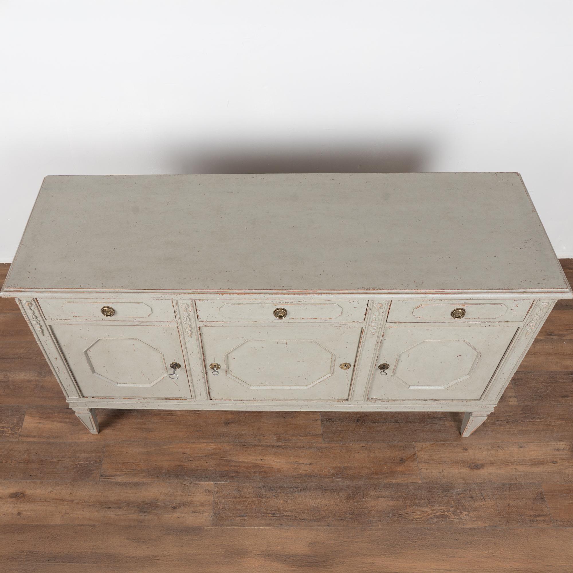 Early 20th-century Swedish Gustavian style sideboard buffet crafted in pine with a three-drawer over three-door configuration. The upper drawers are fitted with brass ring pulls, and the cabinet doors feature octagon-shaped panels. The case is raised on fluted tapered feet, with applied carved swag accents decorating the front posts/columns.