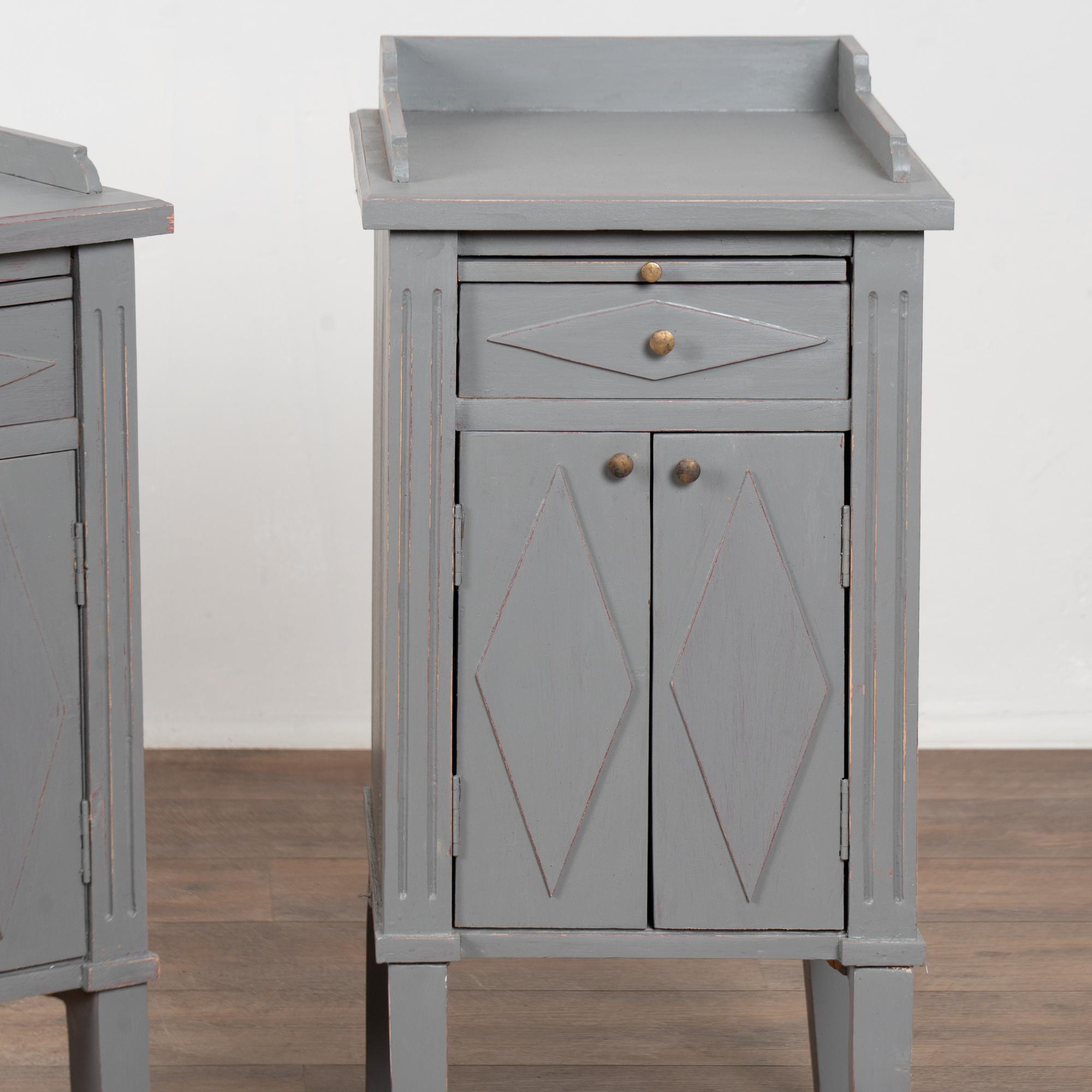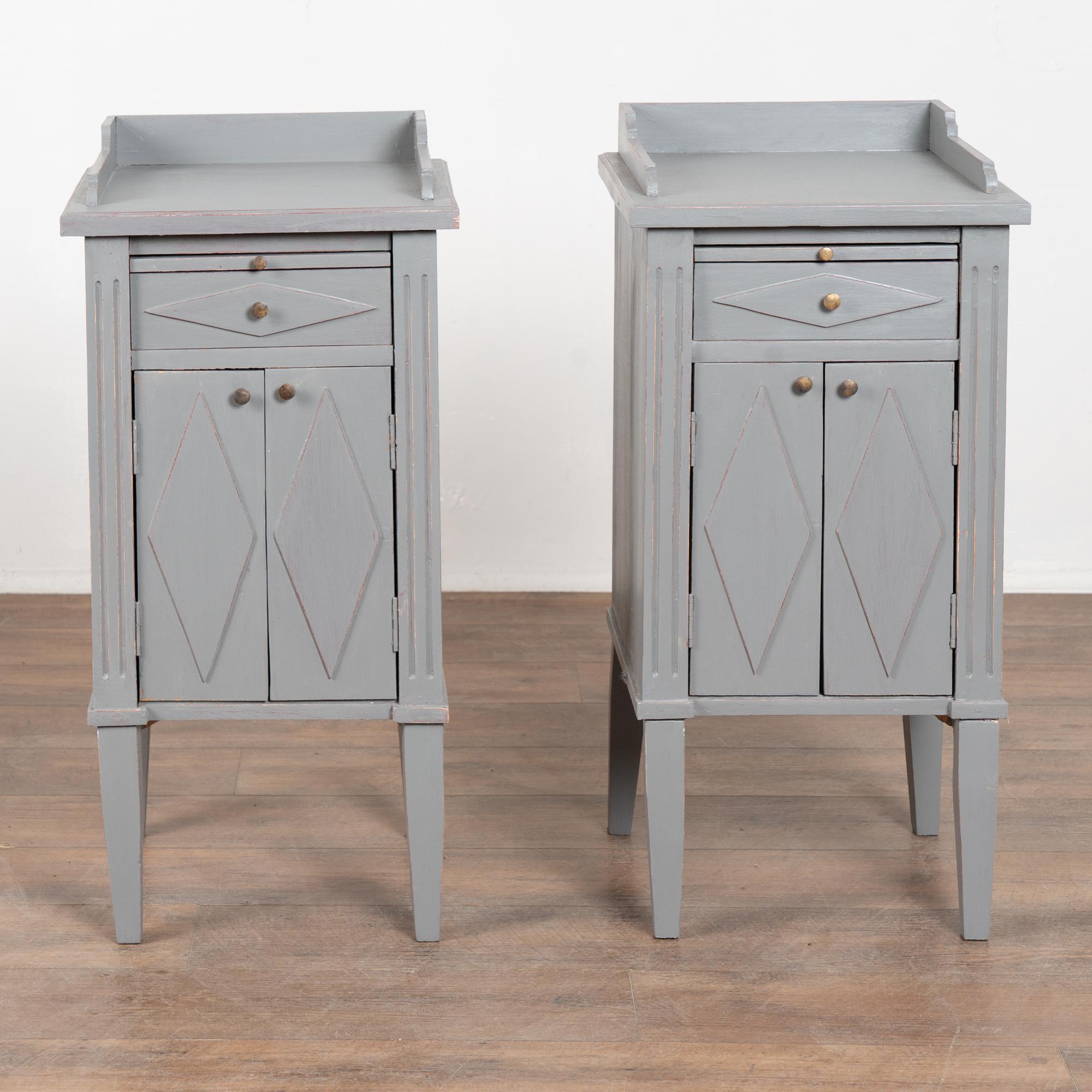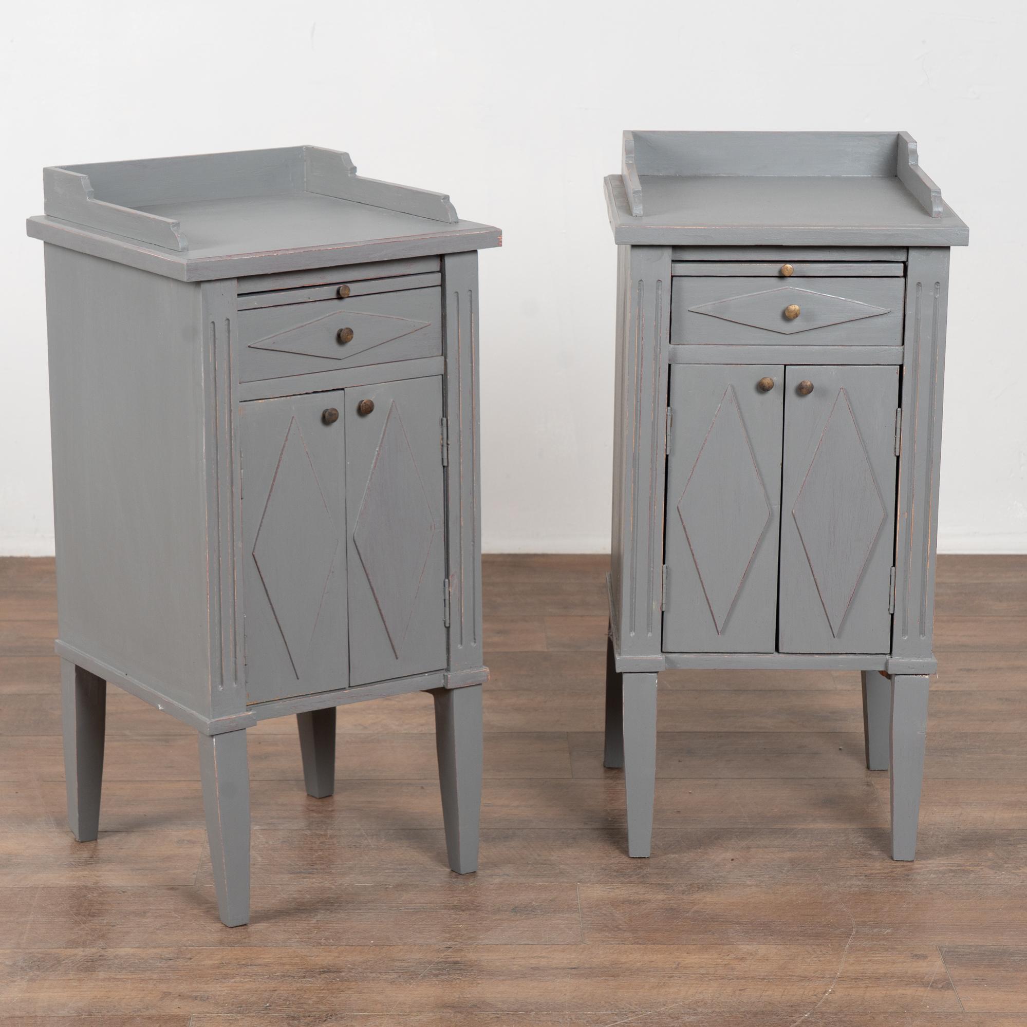 Pair of 20th-century Swedish pine nightstands in a narrow, space-saving form. Each features a newer matte gray painted finish with very light distressing along the edges. The case is fitted with one petite drawer over narrow cabinet doors, each decorated with a traditional Swedish diamond motif.