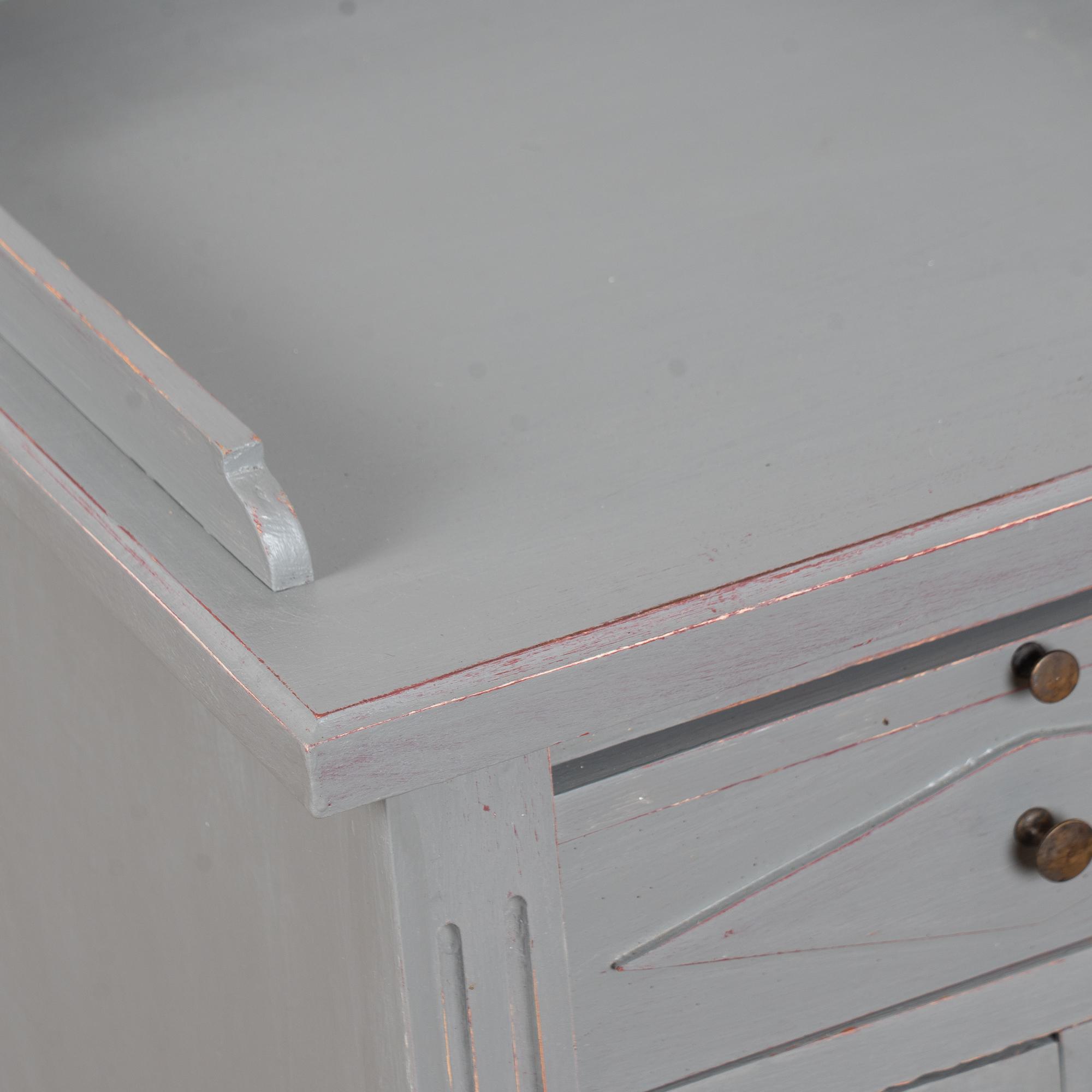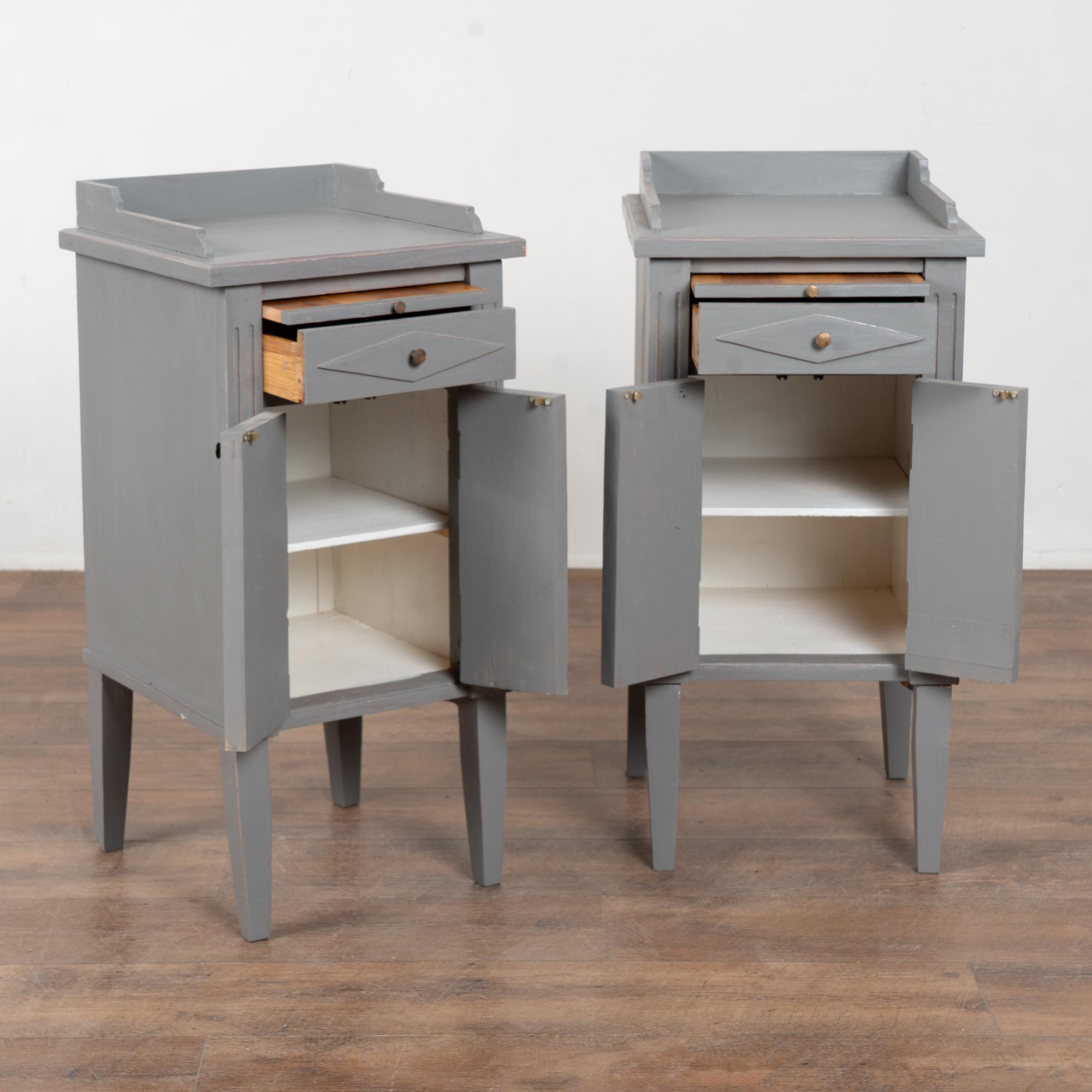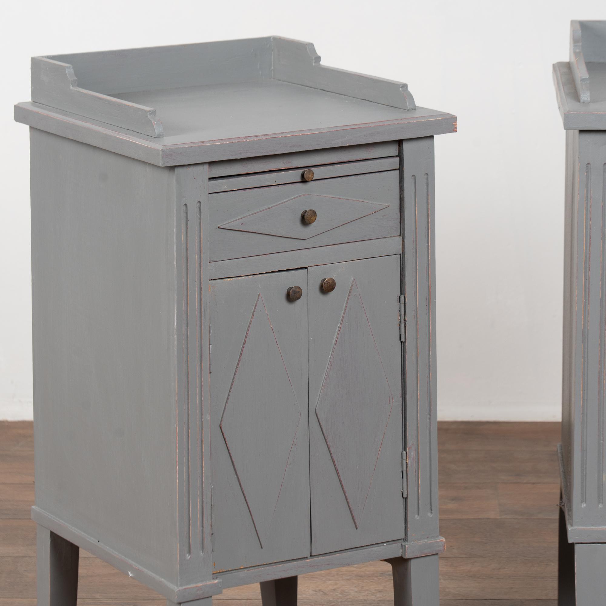 Pair of 20th-century Swedish pine nightstands in a narrow, space-saving form. Each features a newer matte gray painted finish with very light distressing along the edges. The case is fitted with one petite drawer over narrow cabinet doors, each decorated with a traditional Swedish diamond motif.