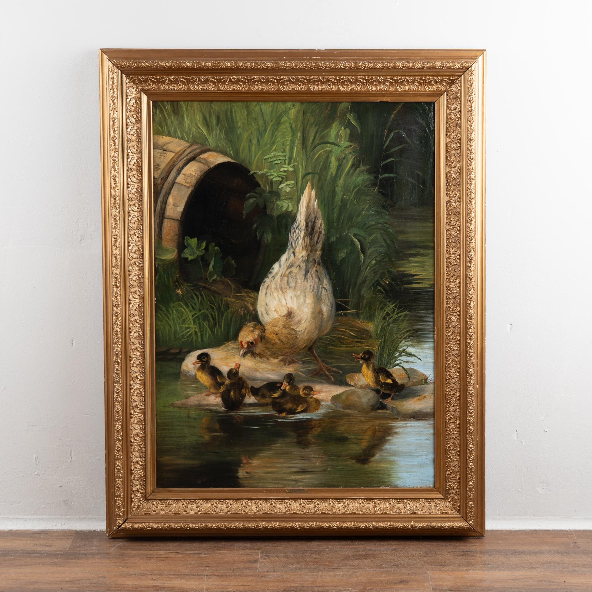 Original oil on canvas painting of a hen and five ducklings at a pond by Danish artist Adolf Mackeprang (b. Langesø near Odense 1833, d. Frederiksberg 1911).