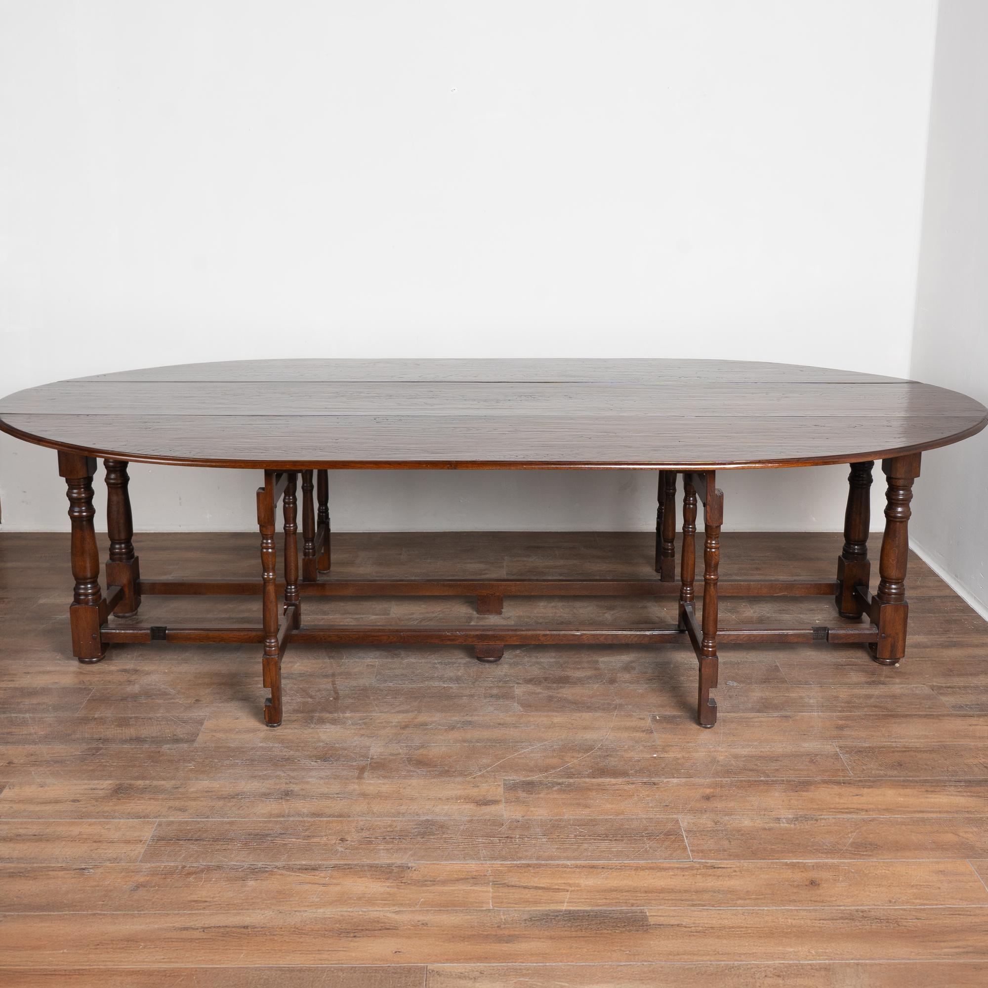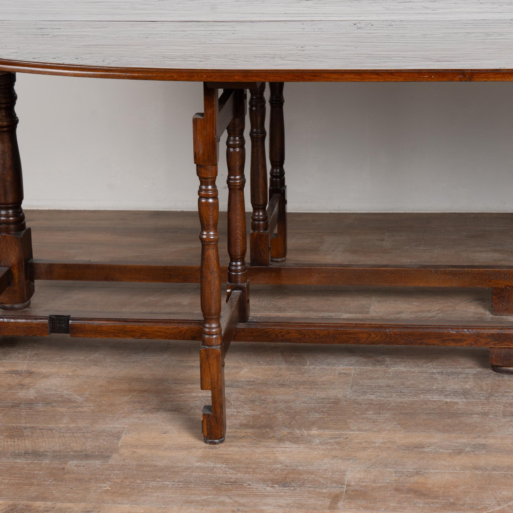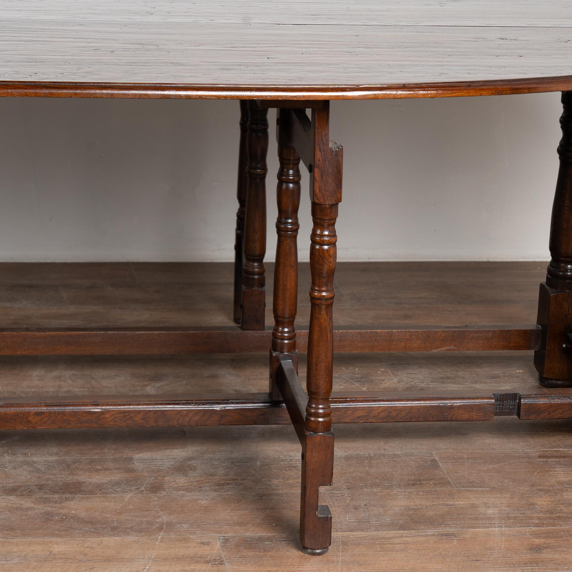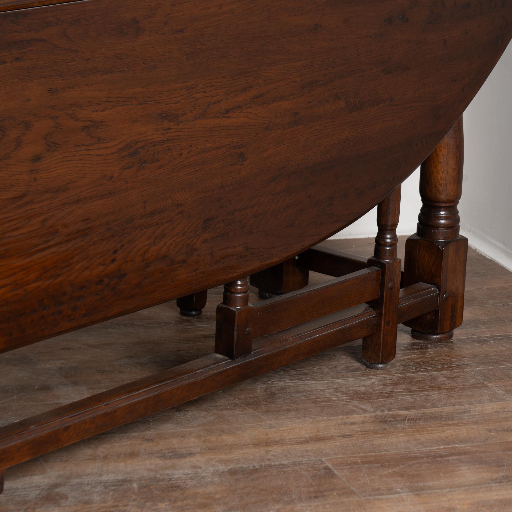 Early 20th century English wake gateleg dining table crafted from dark English oak. This impressive oval table features two adjustable gate legs on each side, allowing flexible chair placement and multiple configurations. When both leaves are down, the table converts into a narrow console measuring approximately 21 inches deep, making it highly versatile for everyday use. Fully extended, the table measures just under 10 feet long and comfortably accommodates a large number of dinner guests. The oak displays a rich, dark patina developed over time, with old nicks, gouges, and surface scratches visible across the top that reflect years of use while remaining smooth and pleasing to the touch. Handsome in scale and proportion, this table has been restored and is strong, stable, and ready for use.