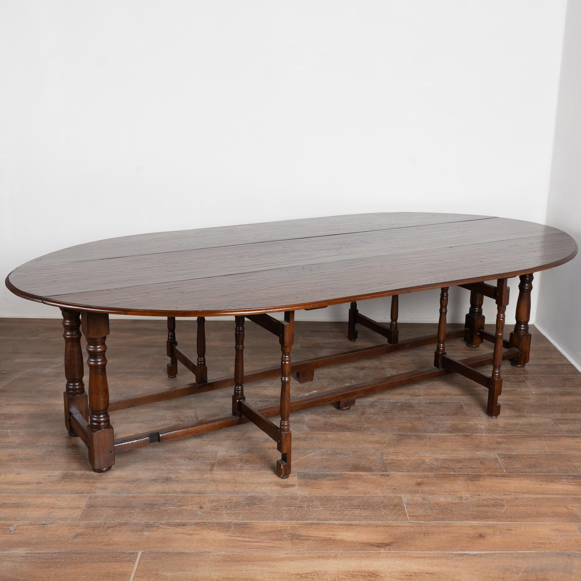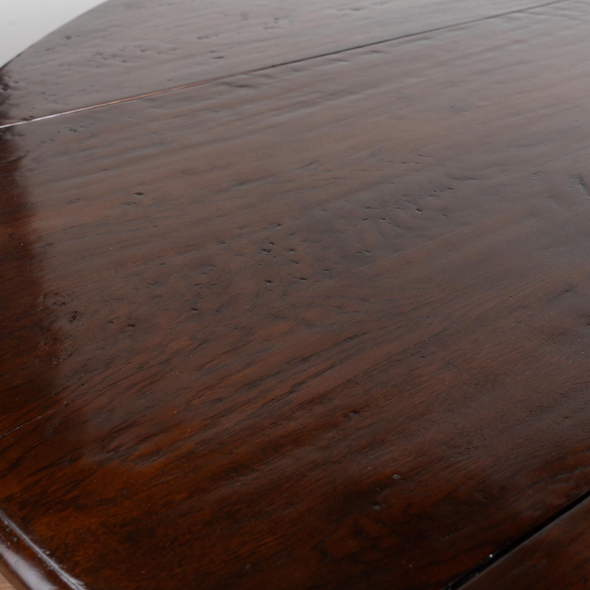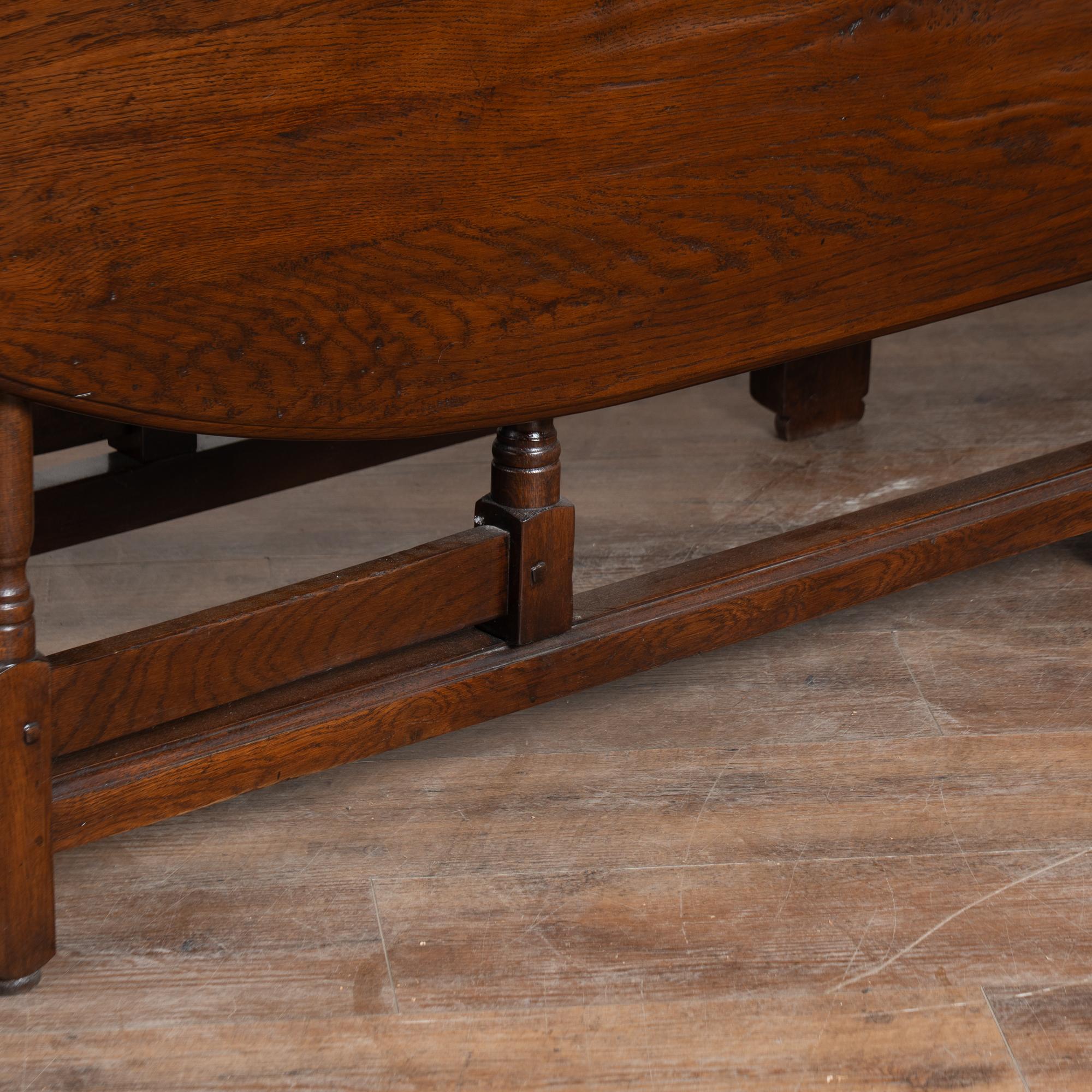 Early 20th century English wake gateleg dining table crafted from dark English oak. This impressive oval table features two adjustable gate legs on each side, allowing flexible chair placement and multiple configurations. When both leaves are down, the table converts into a narrow console measuring approximately 21 inches deep, making it highly versatile for everyday use. Fully extended, the table measures just under 10 feet long and comfortably accommodates a large number of dinner guests. The oak displays a rich, dark patina developed over time, with old nicks, gouges, and surface scratches visible across the top that reflect years of use while remaining smooth and pleasing to the touch. Handsome in scale and proportion, this table has been restored and is strong, stable, and ready for use.