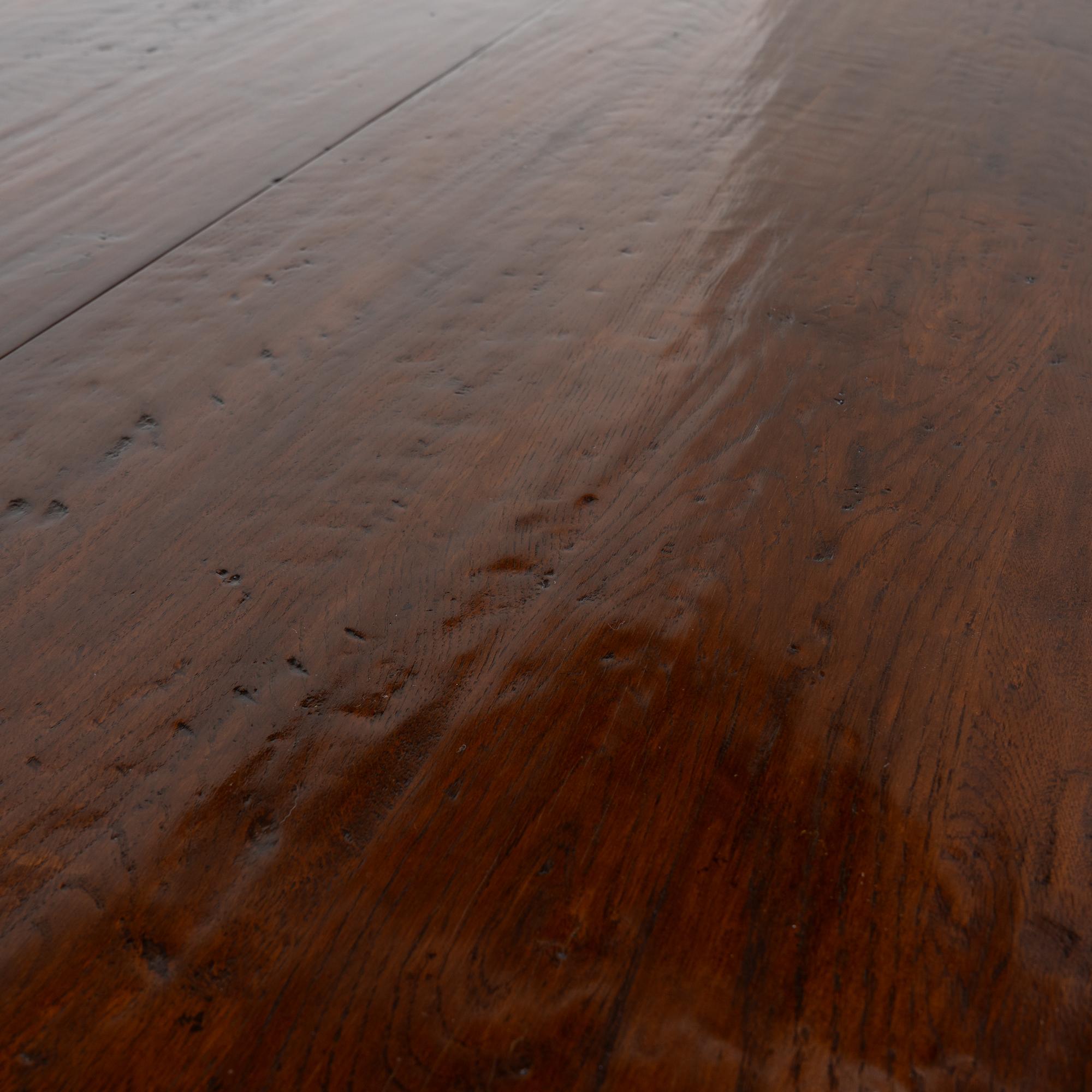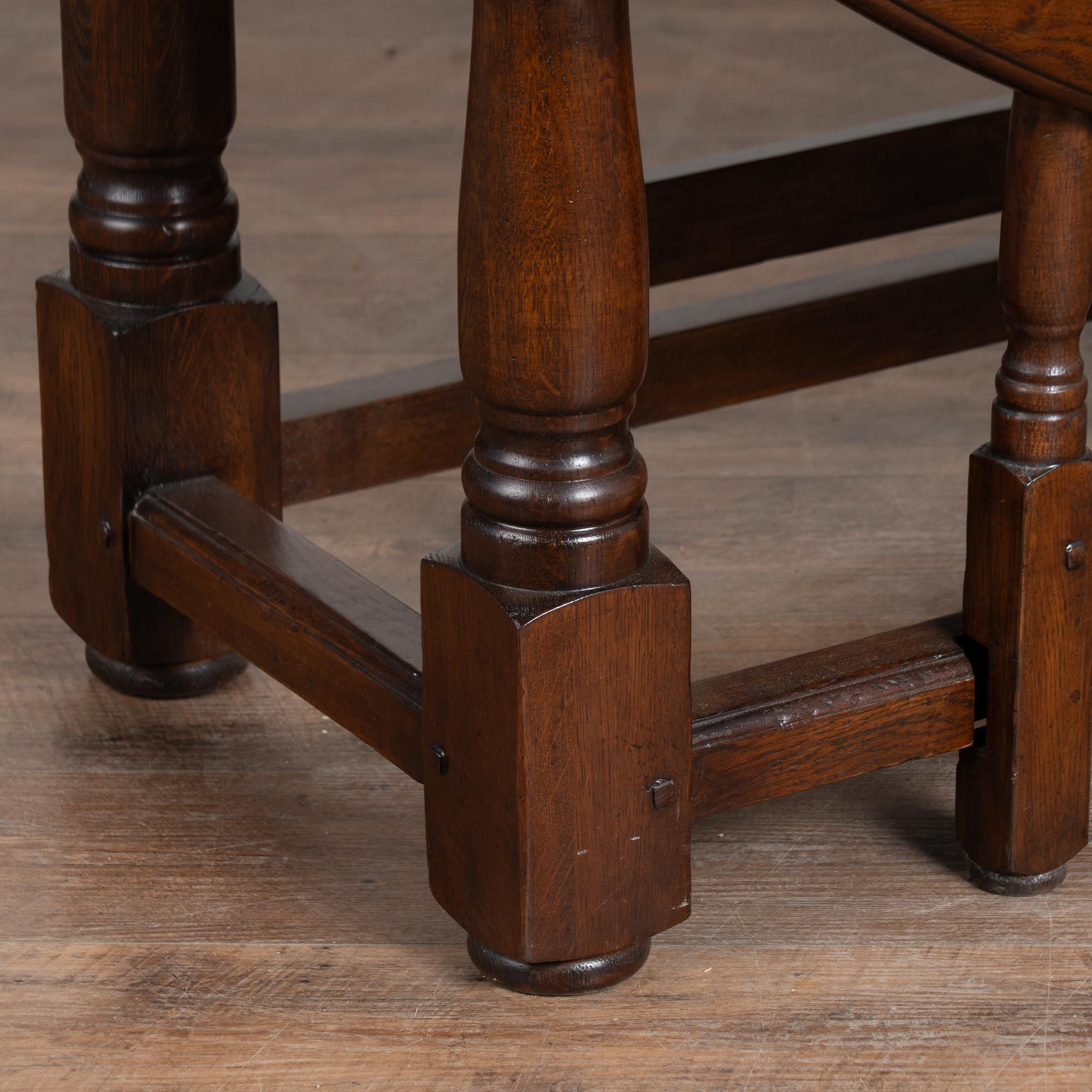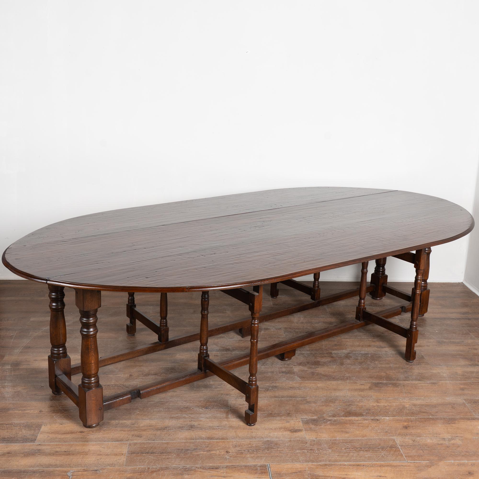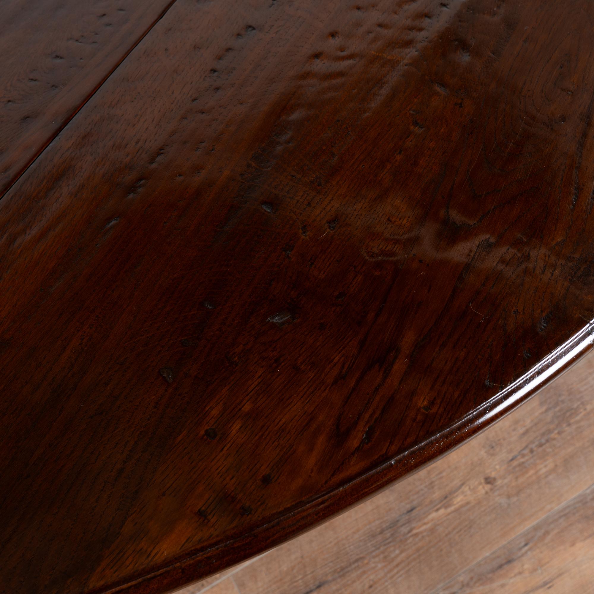 Early 20th century English wake gateleg dining table crafted from dark English oak. This impressive oval table features two adjustable gate legs on each side, allowing flexible chair placement and multiple configurations. When both leaves are down, the table converts into a narrow console measuring approximately 21 inches deep, making it highly versatile for everyday use. Fully extended, the table measures just under 10 feet long and comfortably accommodates a large number of dinner guests. The oak displays a rich, dark patina developed over time, with old nicks, gouges, and surface scratches visible across the top that reflect years of use while remaining smooth and pleasing to the touch. Handsome in scale and proportion, this table has been restored and is strong, stable, and ready for use.