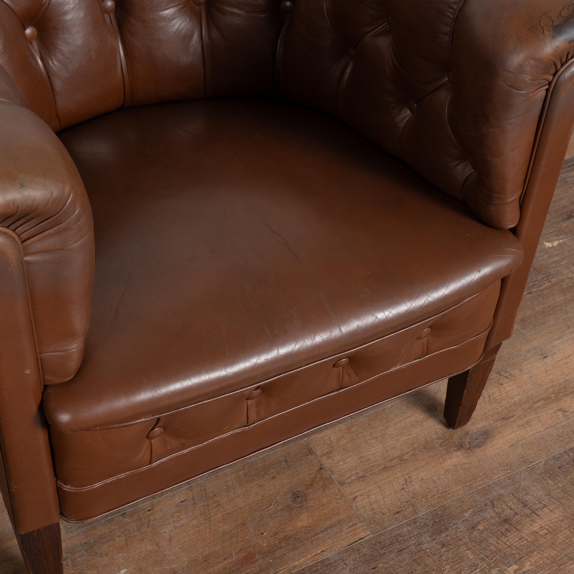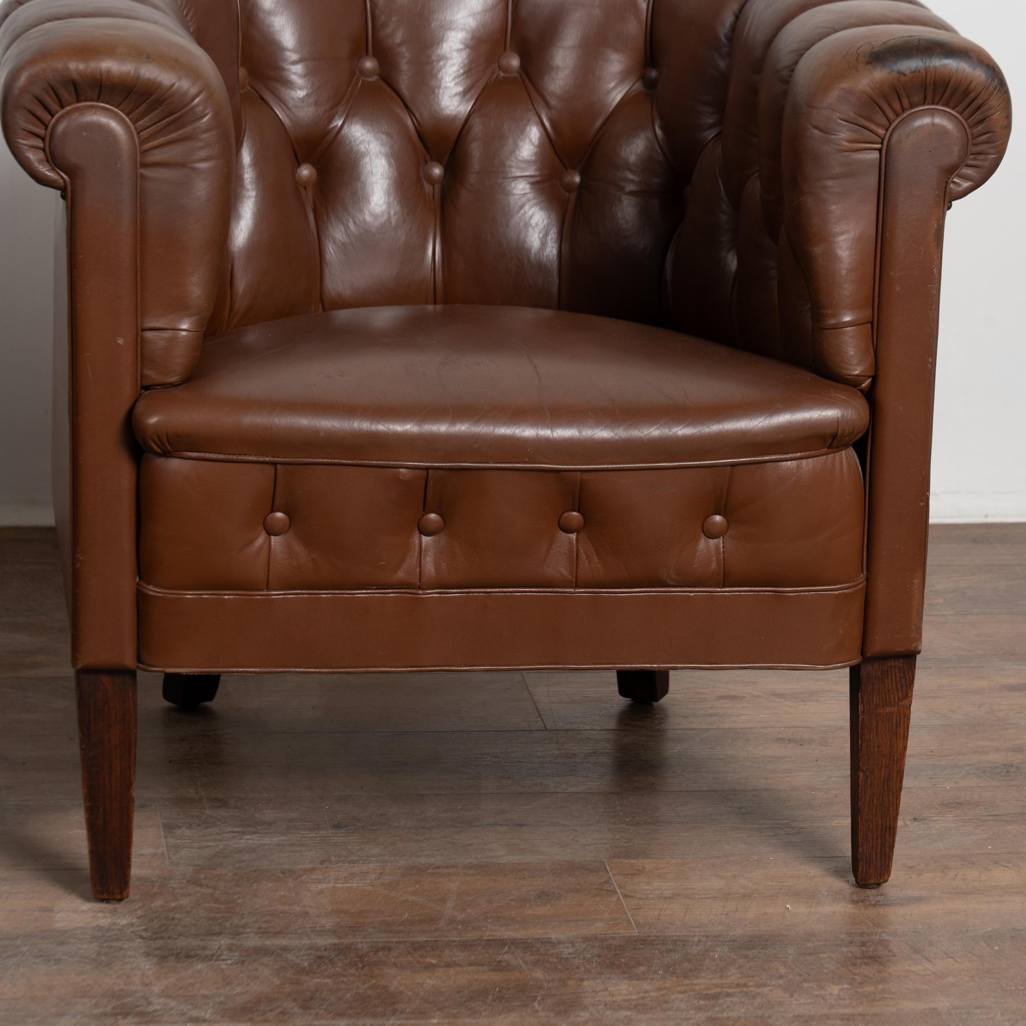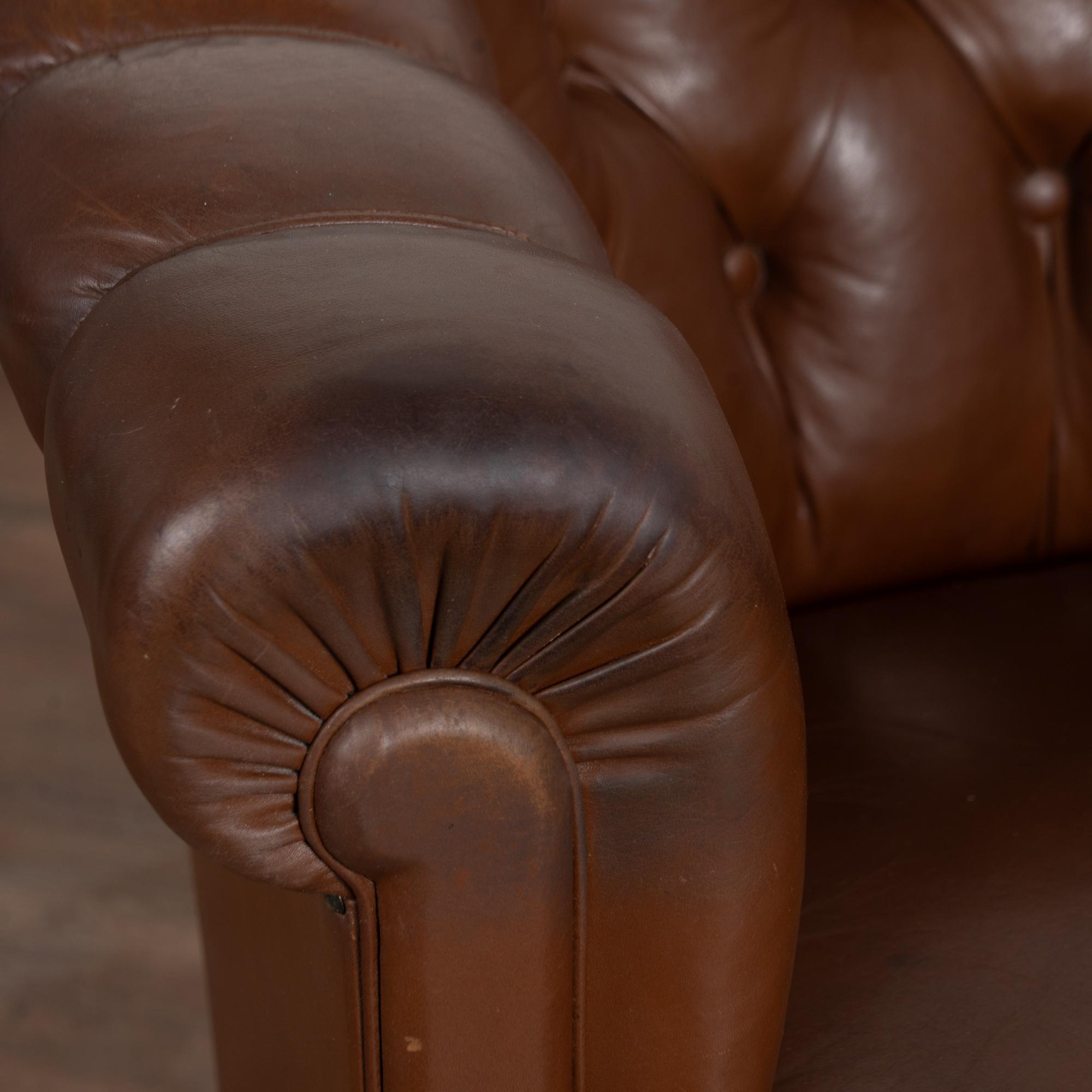The vintage brown leather shows age-appropriate crackling and surface scratches, with darker stains visible on the front arms from years of use. Buttons remain tight and intact. Seat cushions are fixed and not removable. Some fabric sagging underneath.