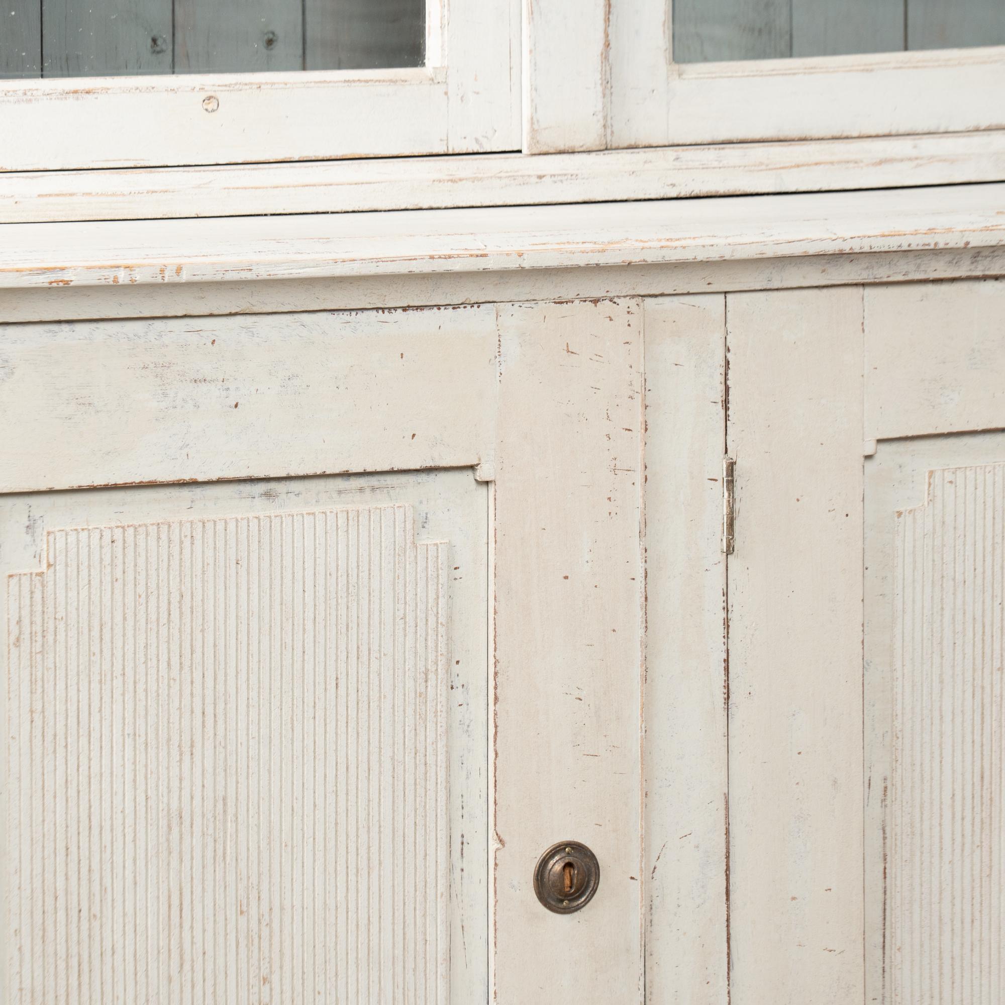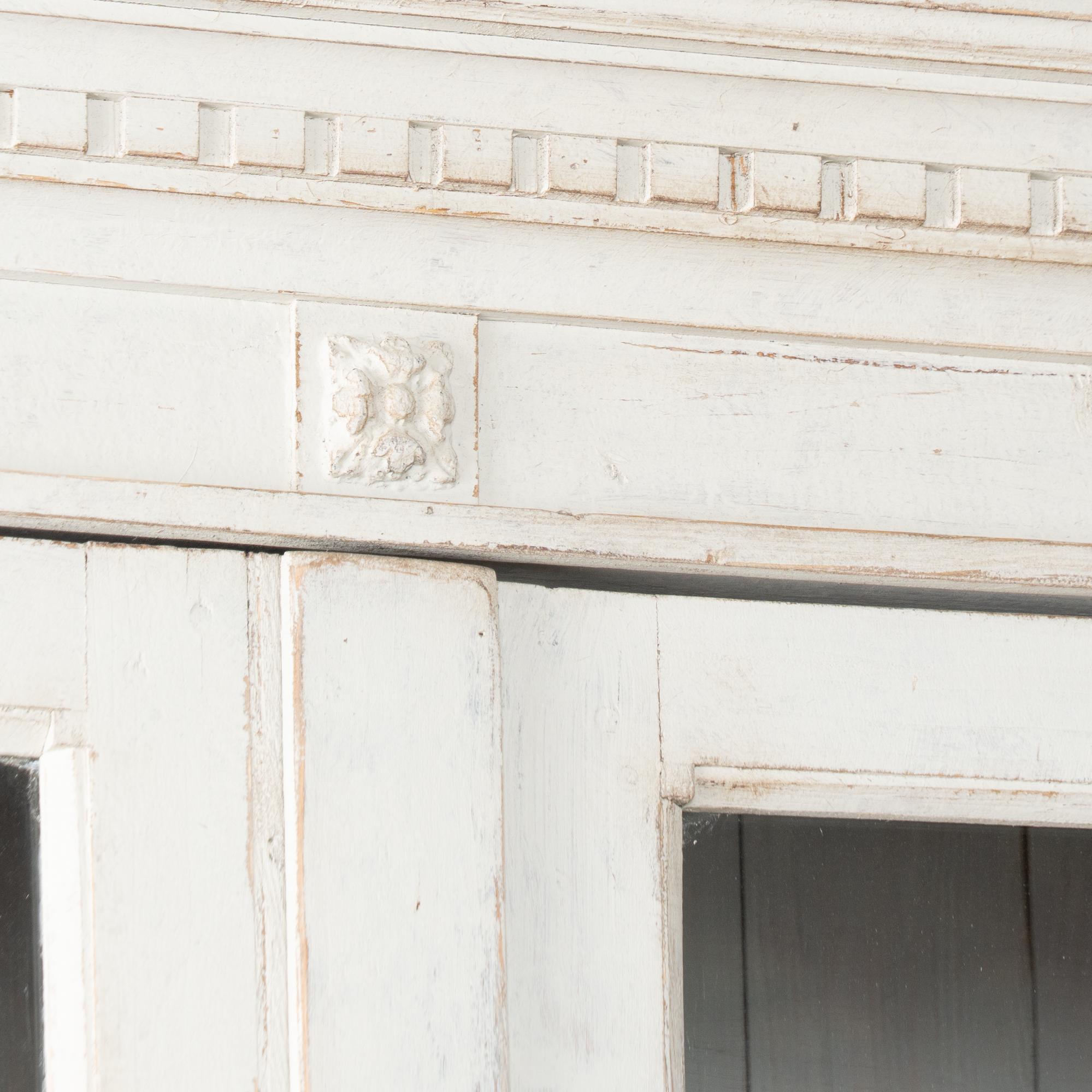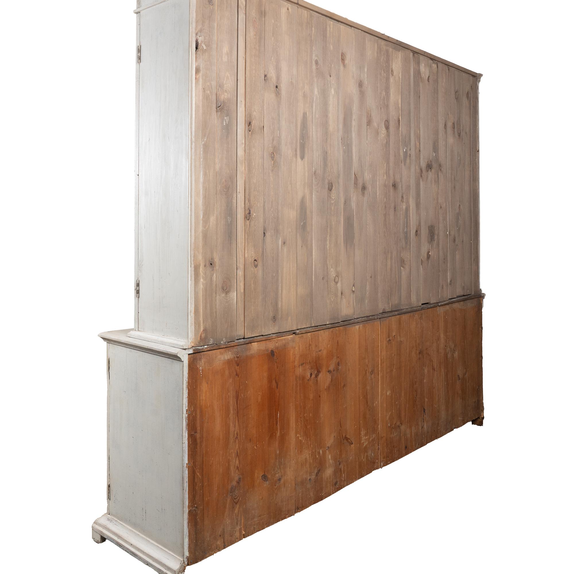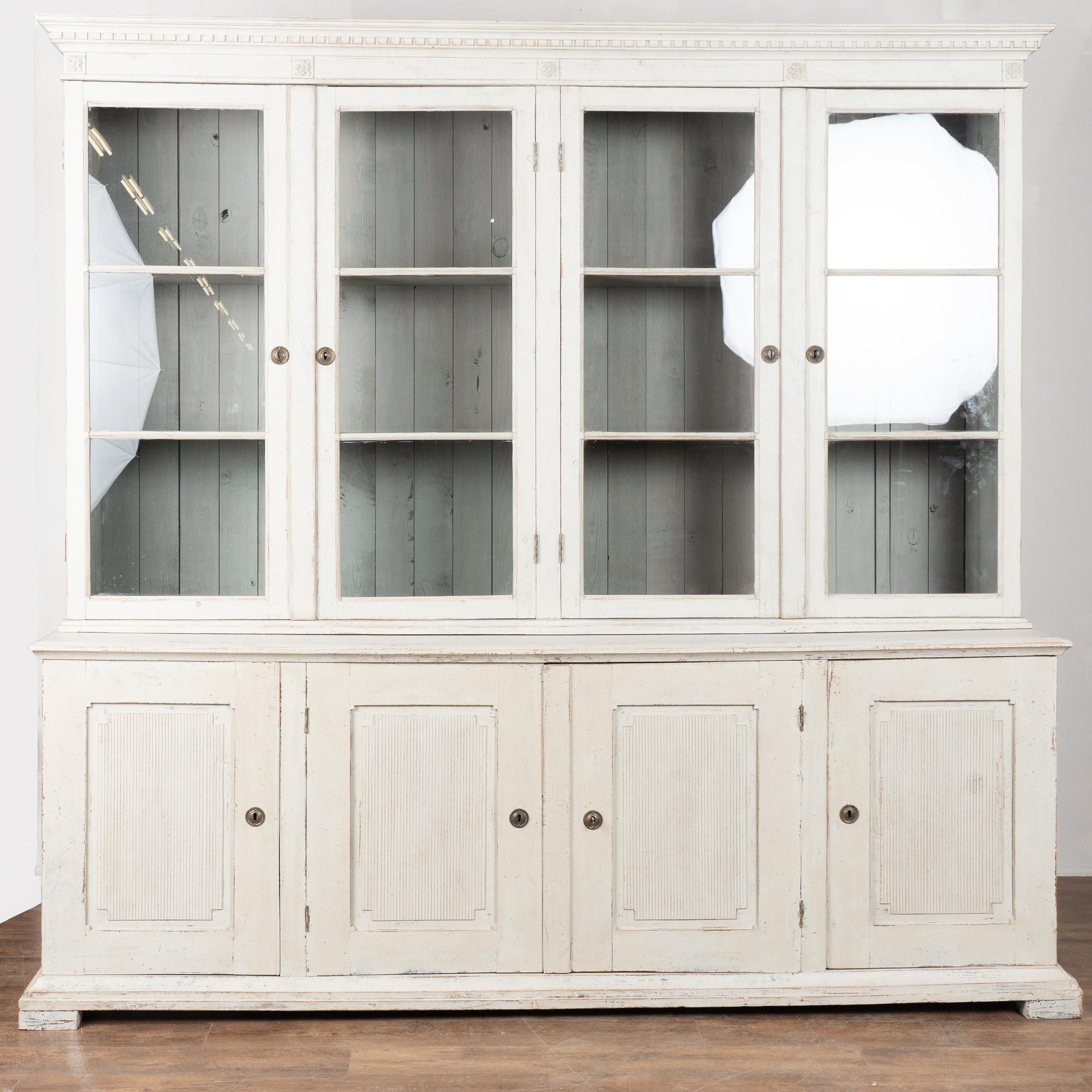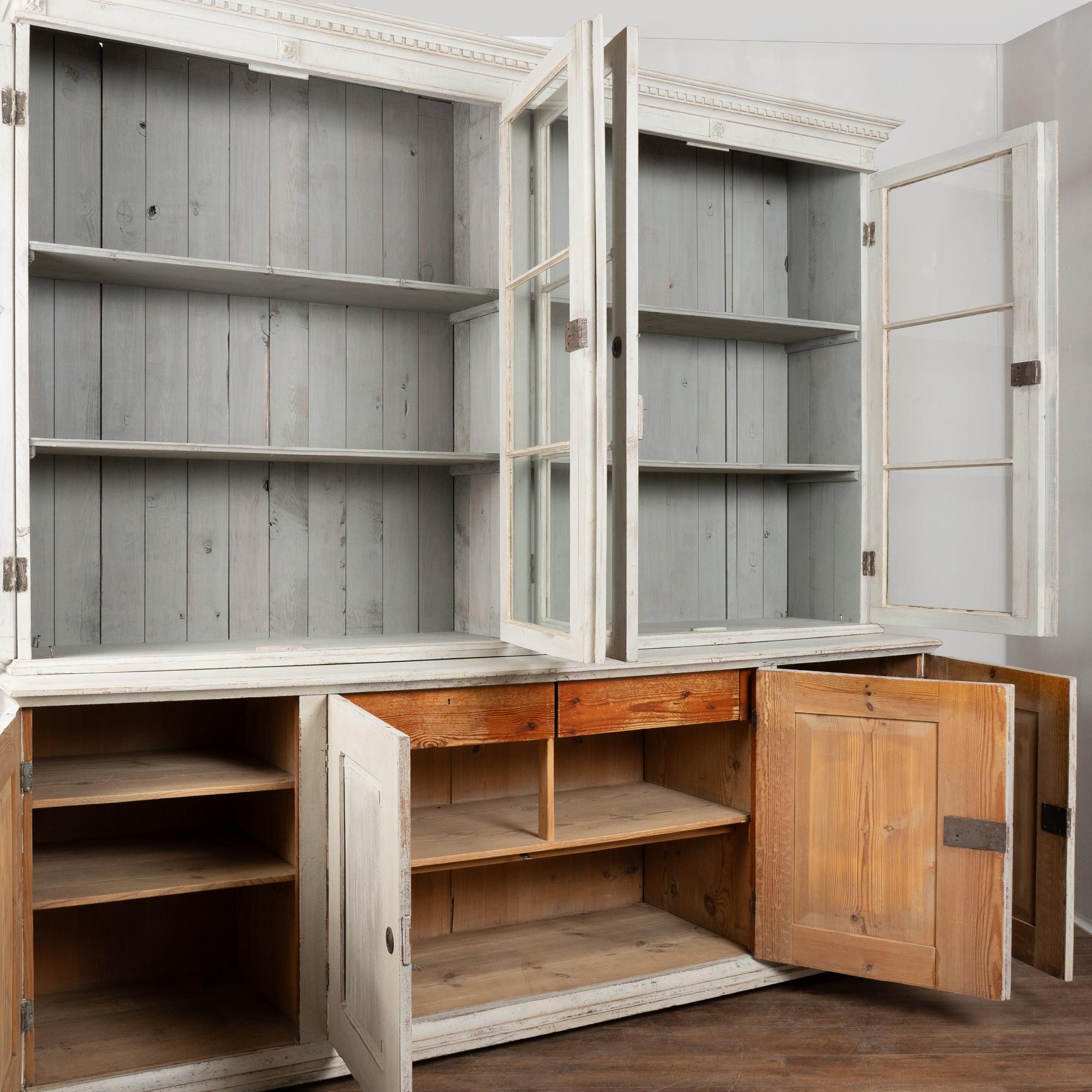 19th-century large Swedish pine bookcase cabinet featuring classic architectural detailing. The crown is finished with carved dentil molding and applied decorative medallions. The upper section has four glass-pane doors, ideal for display, while the lower section features four paneled cabinet doors with traditional Swedish fluted detailing.