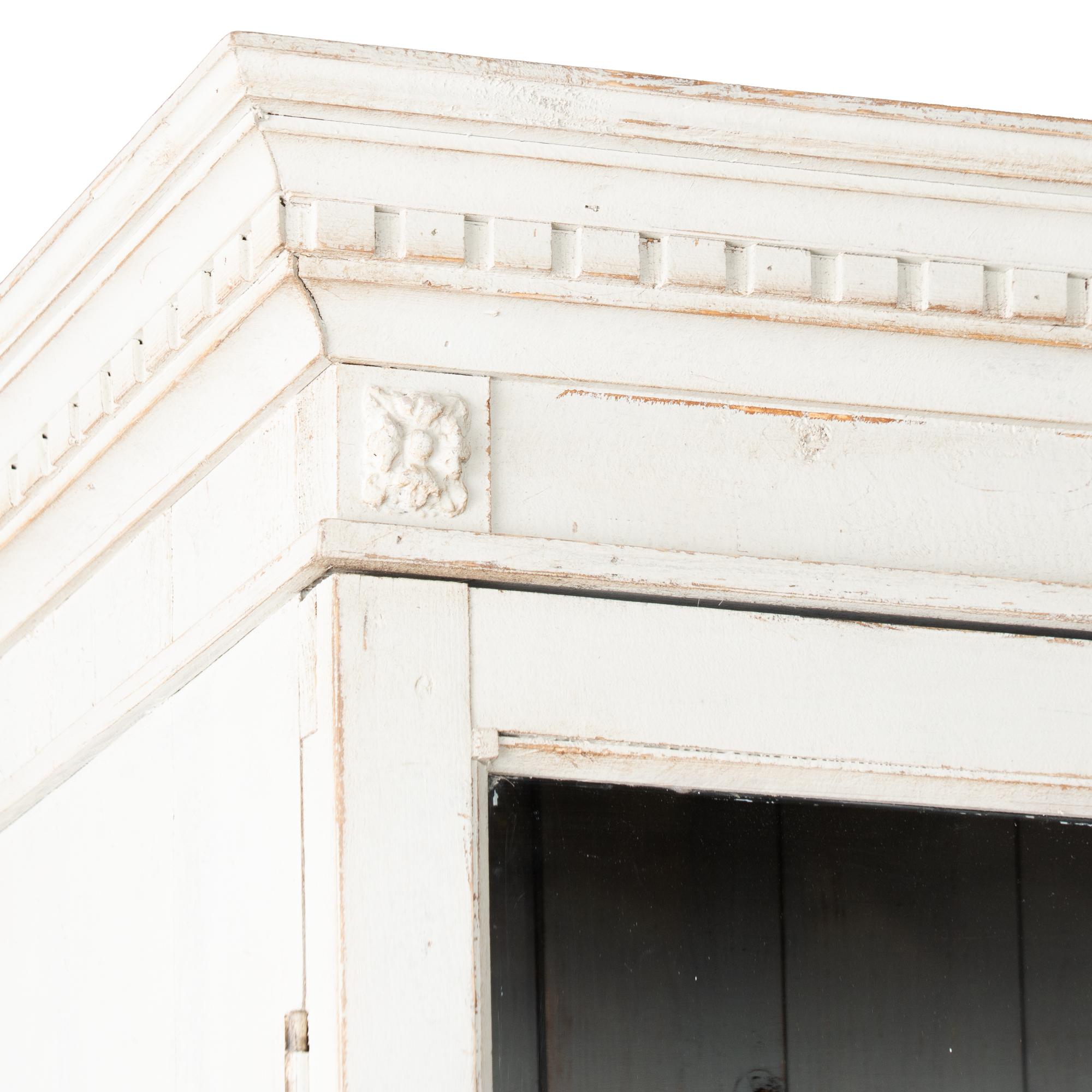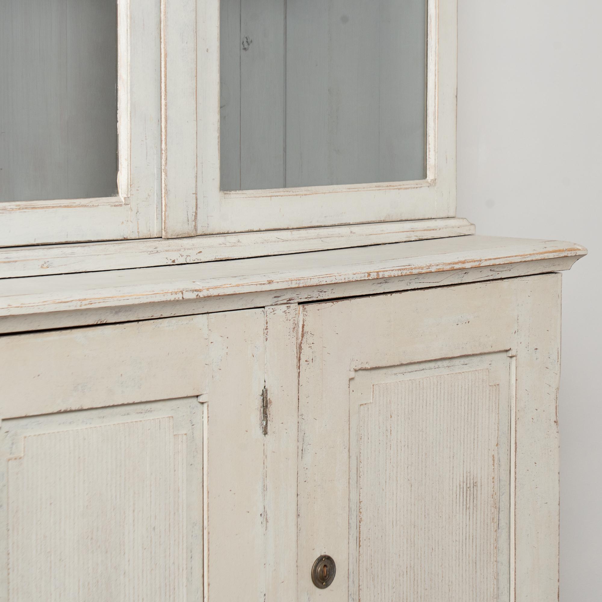 The cabinet has a newer, professionally applied light gray painted finish with white undertones; depending on lighting, it may read as white with gray undertones. The interior is painted a contrasting blue-gray tone. Upper cabinet doors retain old locks and function with a skeleton key, though they operate stiffly. Lower cabinet doors function best using the key as a pull only (One key for upper, one key for lower cabinets included). The center lower cabinet includes interior drawers in addition to a central shelf.