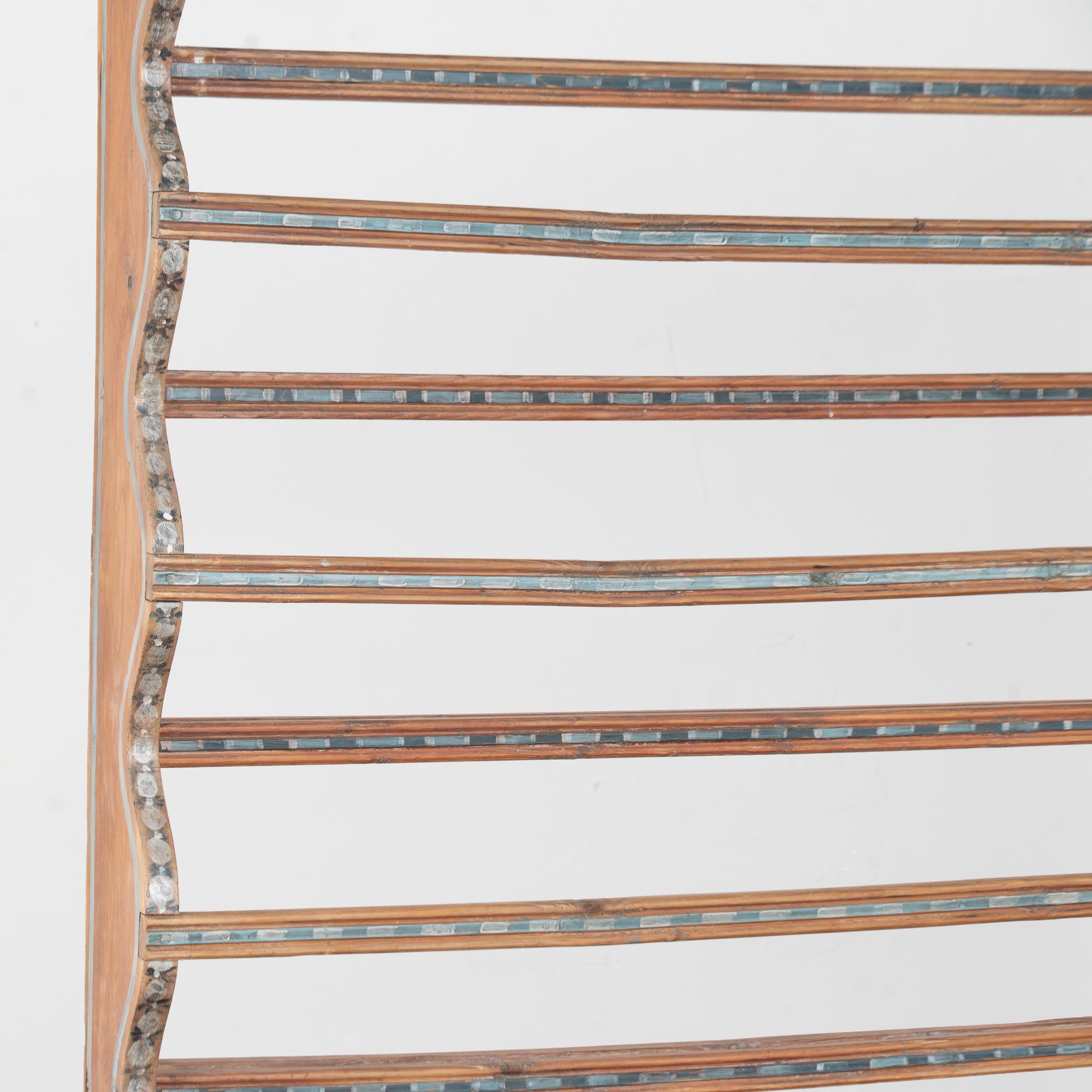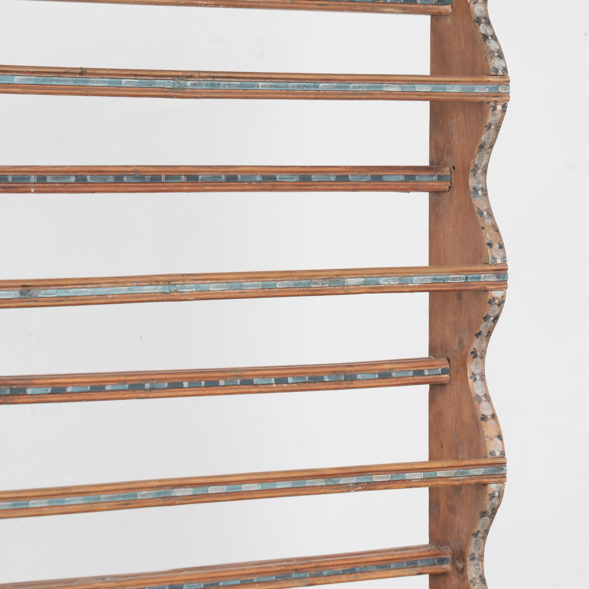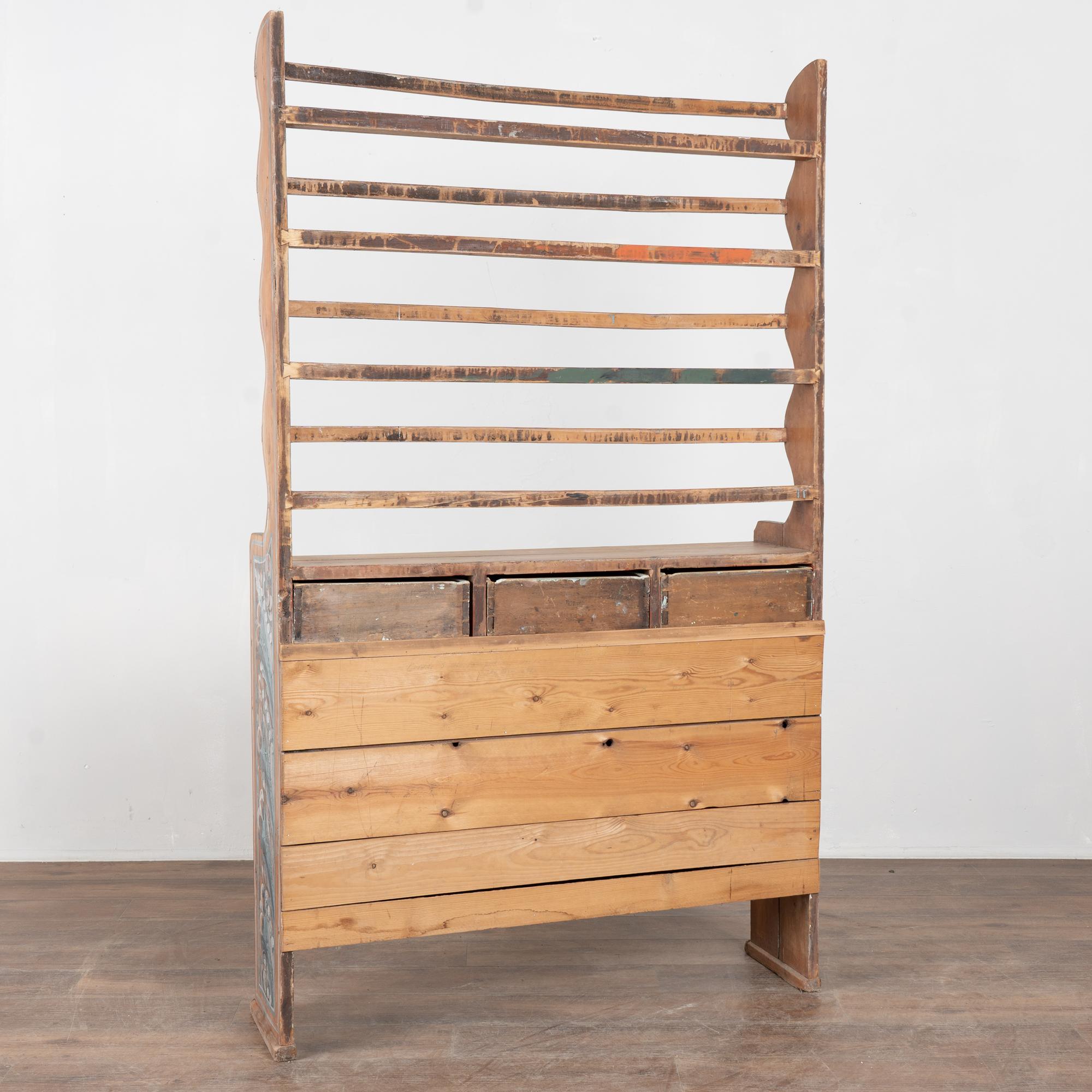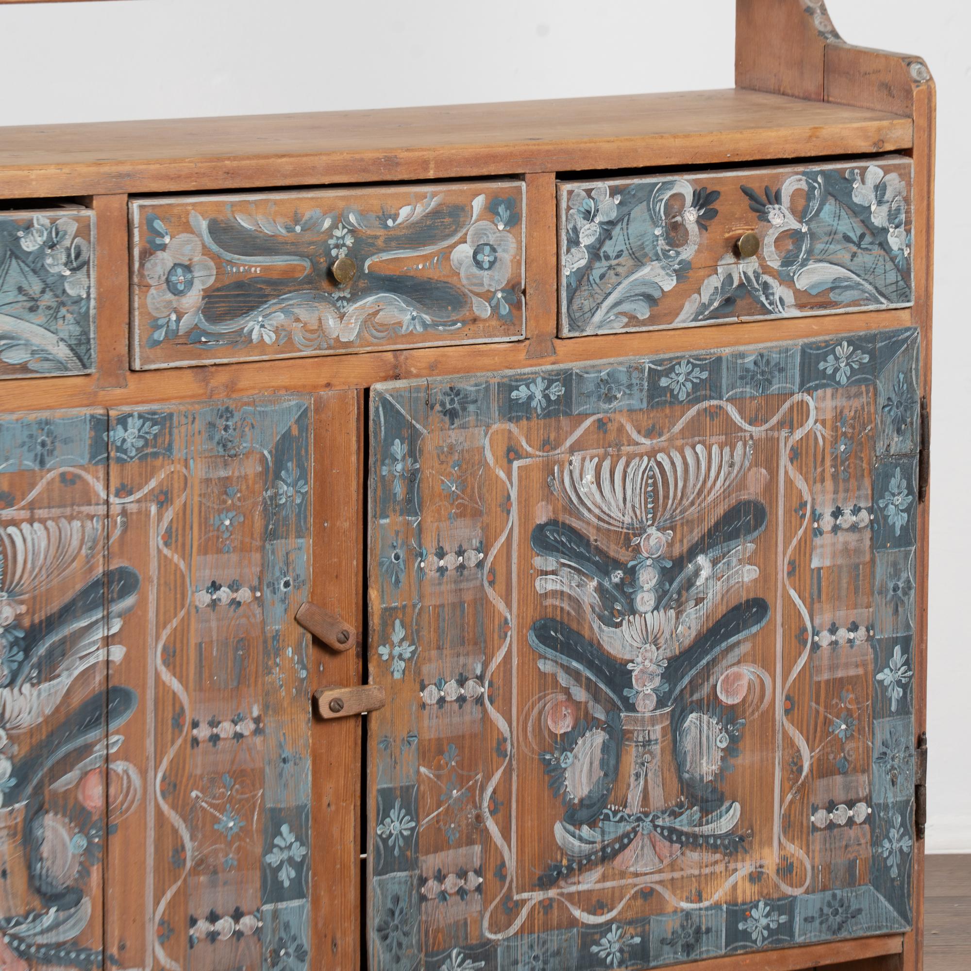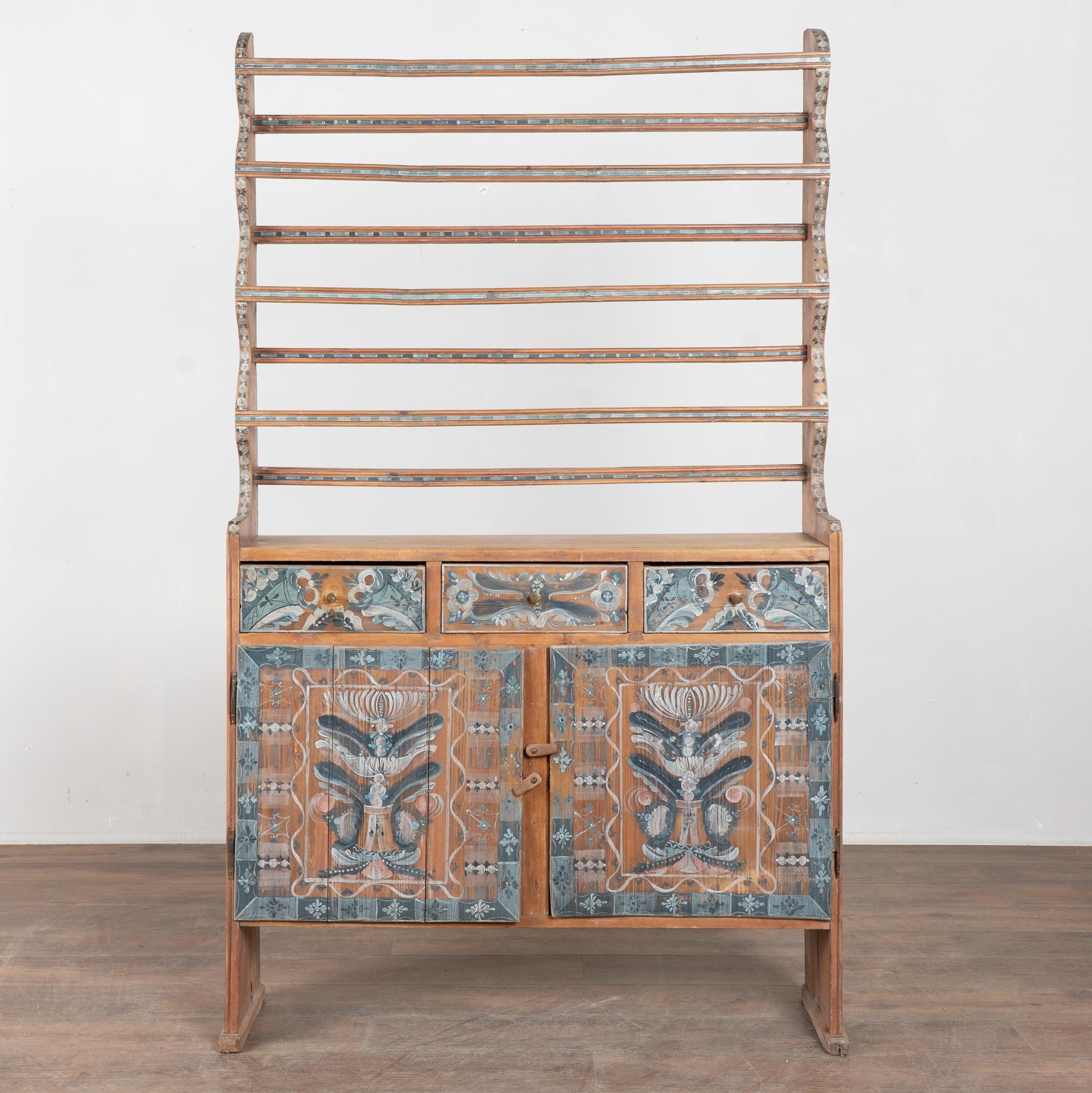 Early 19th-century Swedish narrow cupboard crafted in pine, featuring an upper plate rack, three small drawers, and lower cabinet doors. The piece retains its original hand-painted finish in soft blues and grays, distinctive of northern Sweden and likely associated with the Dalarna region. The interior is painted brick red, creating a strong visual contrast.