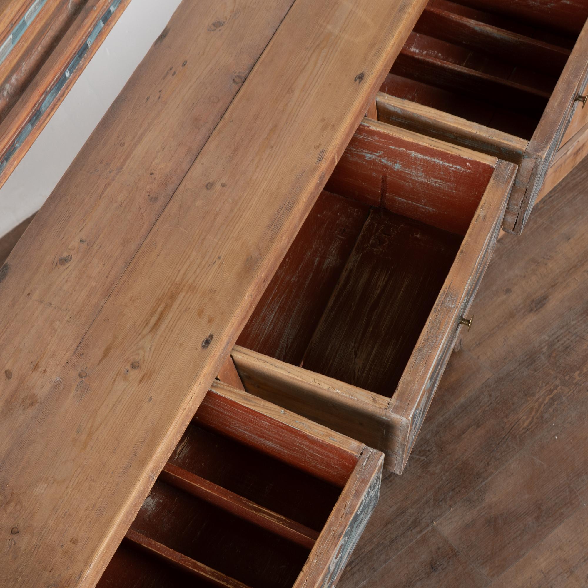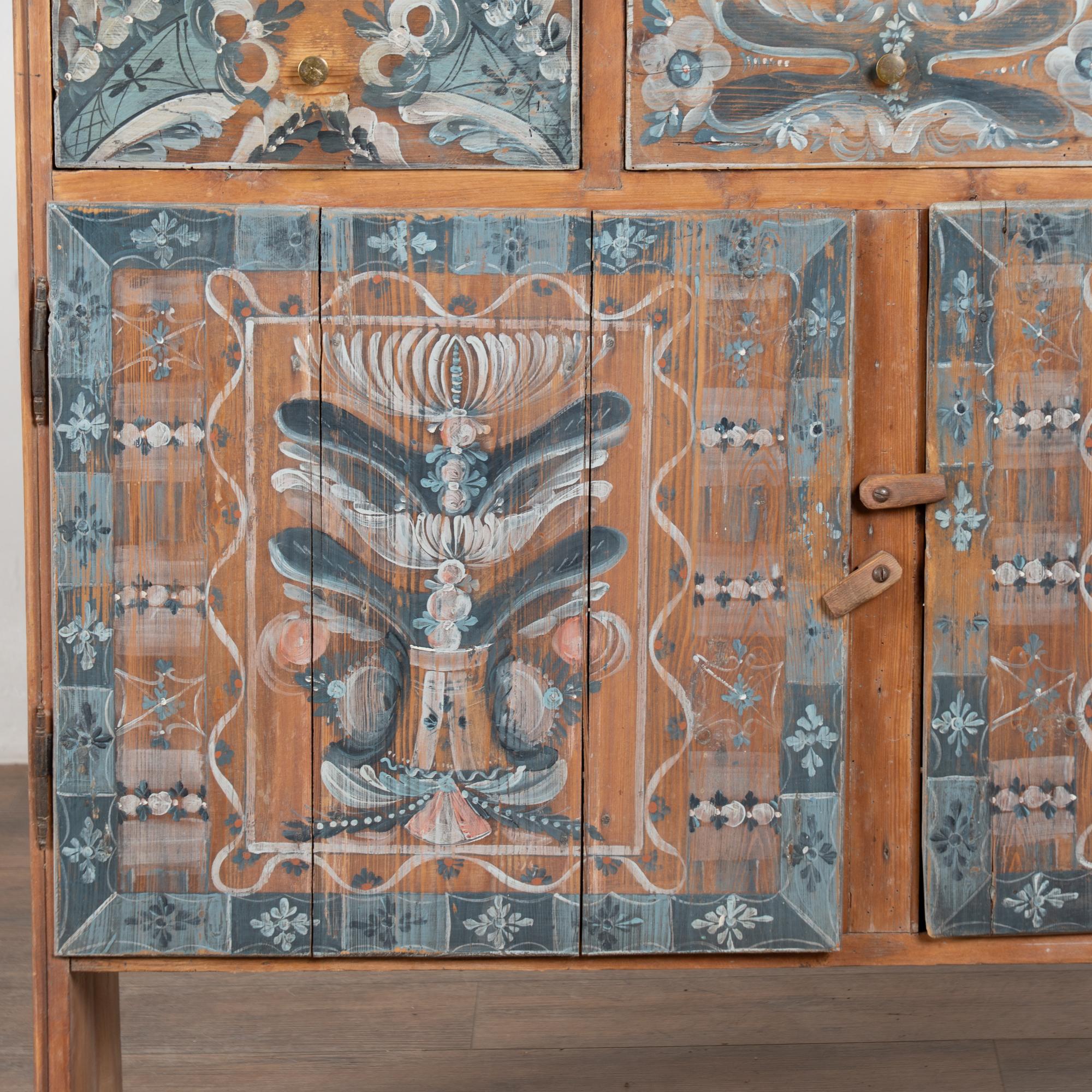 The pine shows age-related cracks, scratches, and separation along the sides, with an earlier repair visible along the back. Two wooden latches secure the cabinet doors; the left door shows age-related separation, and both doors display minor cracking consistent with age. It is the original painted surface that defines this cupboard’s character and appeal. Restored strong, stable, and ready for use. Back restored at earlier point in time (wood appears newer).