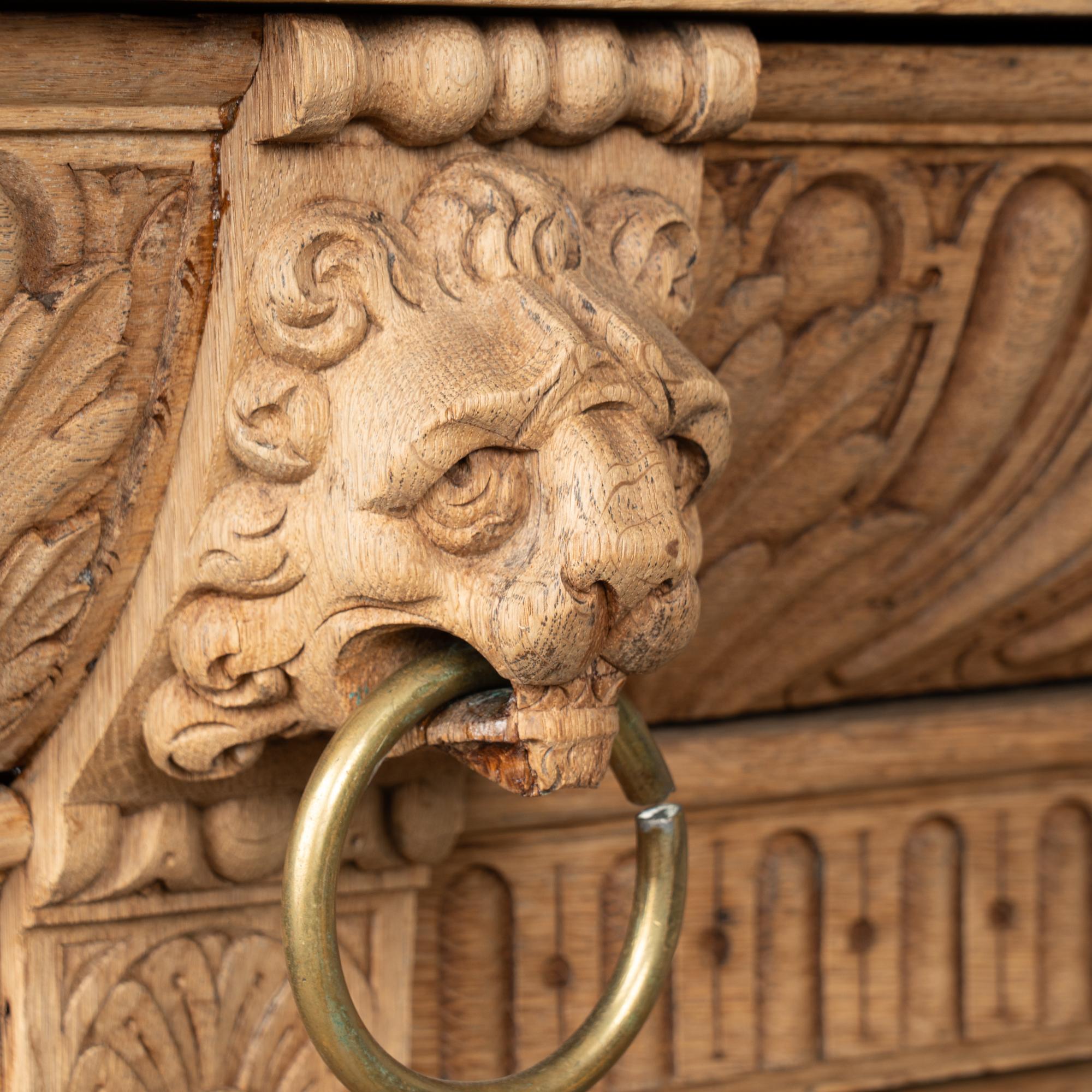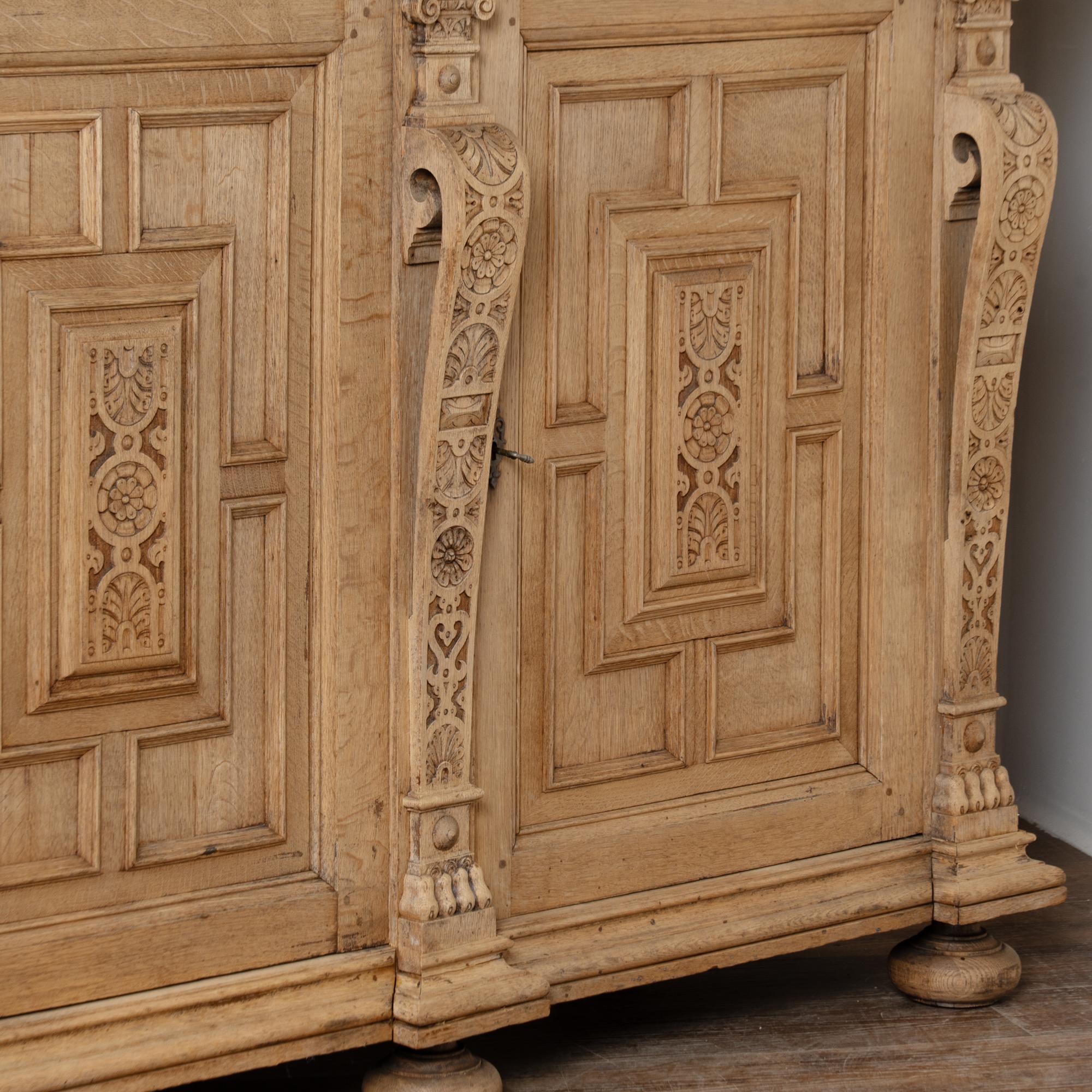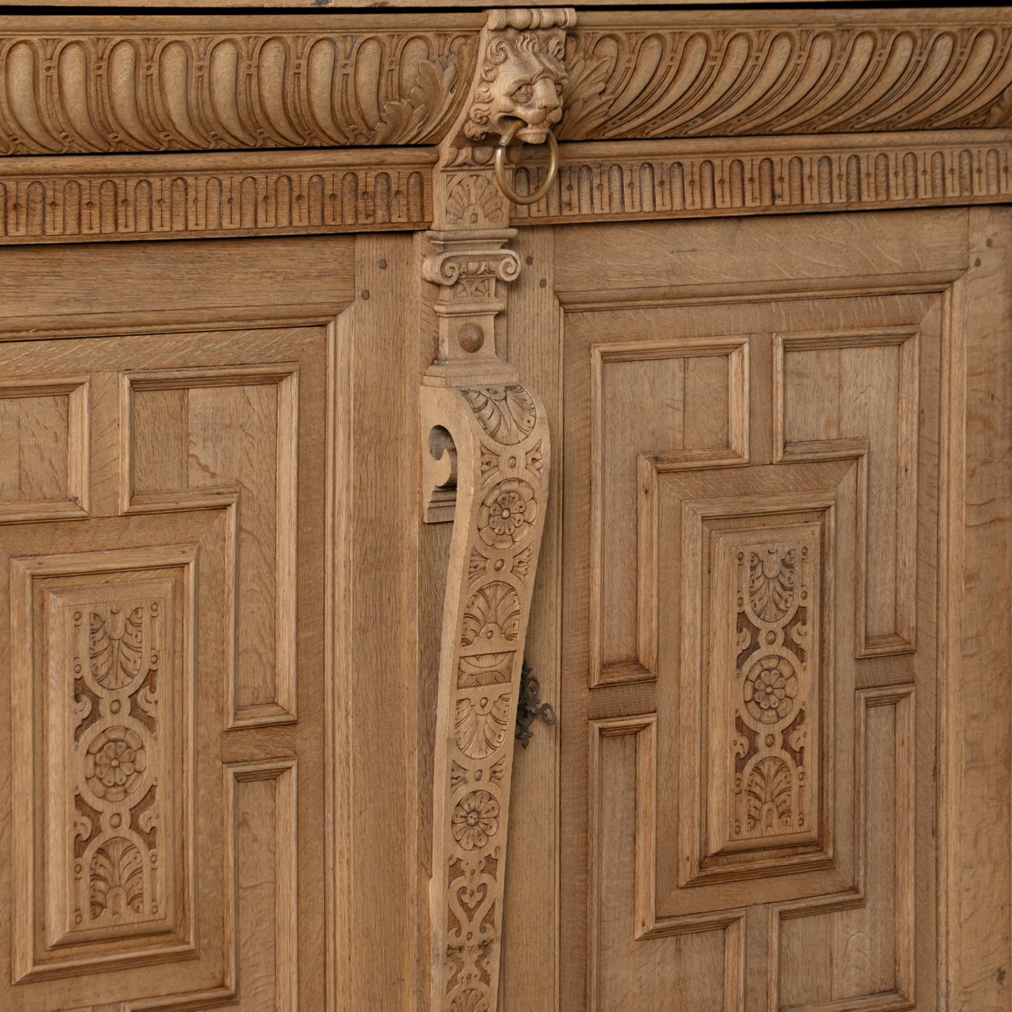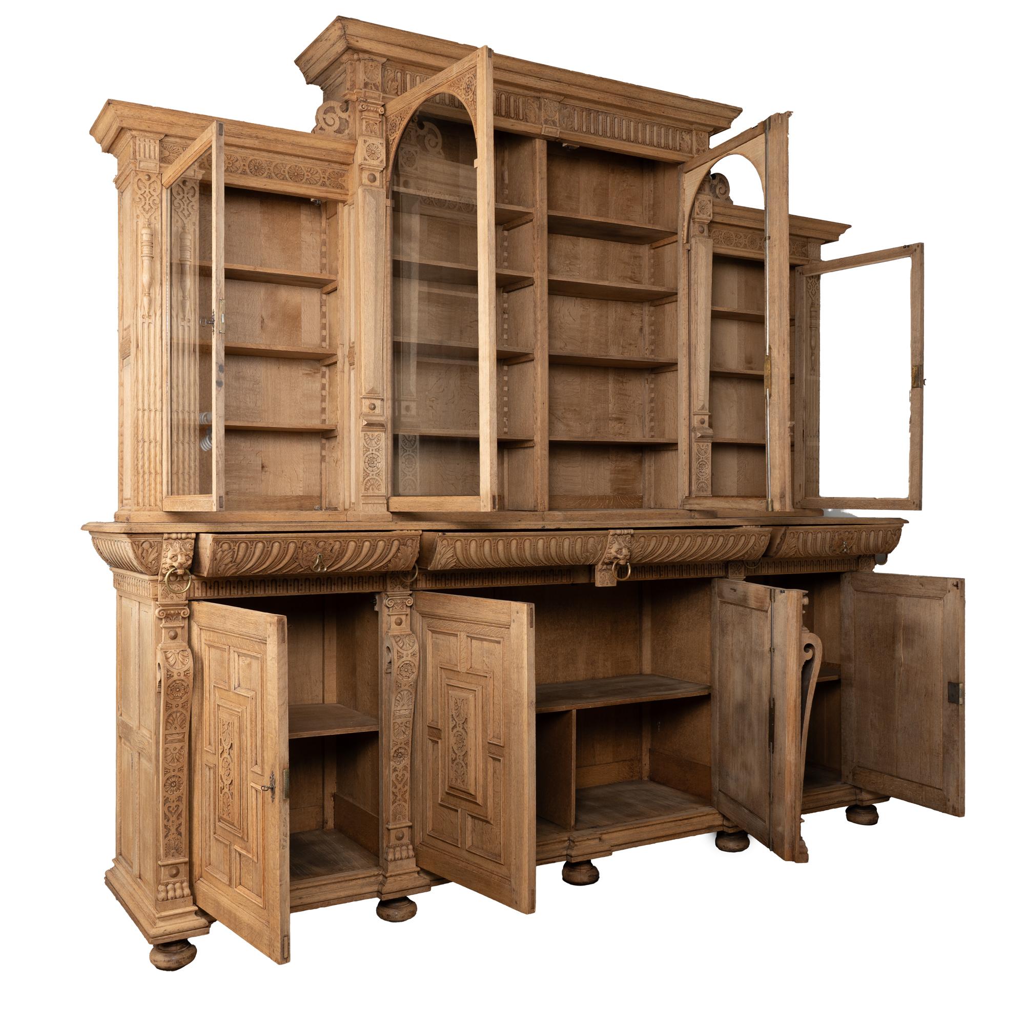 Late 19th-century French large bleached oak display cabinet featuring extensive carved decoration throughout, including floral medallions, lion heads, claw motifs, and additional ornamental detailing. The cabinet is built in two sections for easier transportation and installation. The upper section has four glass-pane doors with adjustable shelving for display. Below are four curved drawers, followed by a lower section with large, heavily paneled cabinet doors. The cabinet rests on five bun feet in front and four block feet in back, giving it a strong architectural presence. Locks and keys no longer function; keys are included and used as pulls only. Typical scratches, nicks, separations reflect generations of use and do not detract from the timeless appeal of this grand display cabinet.