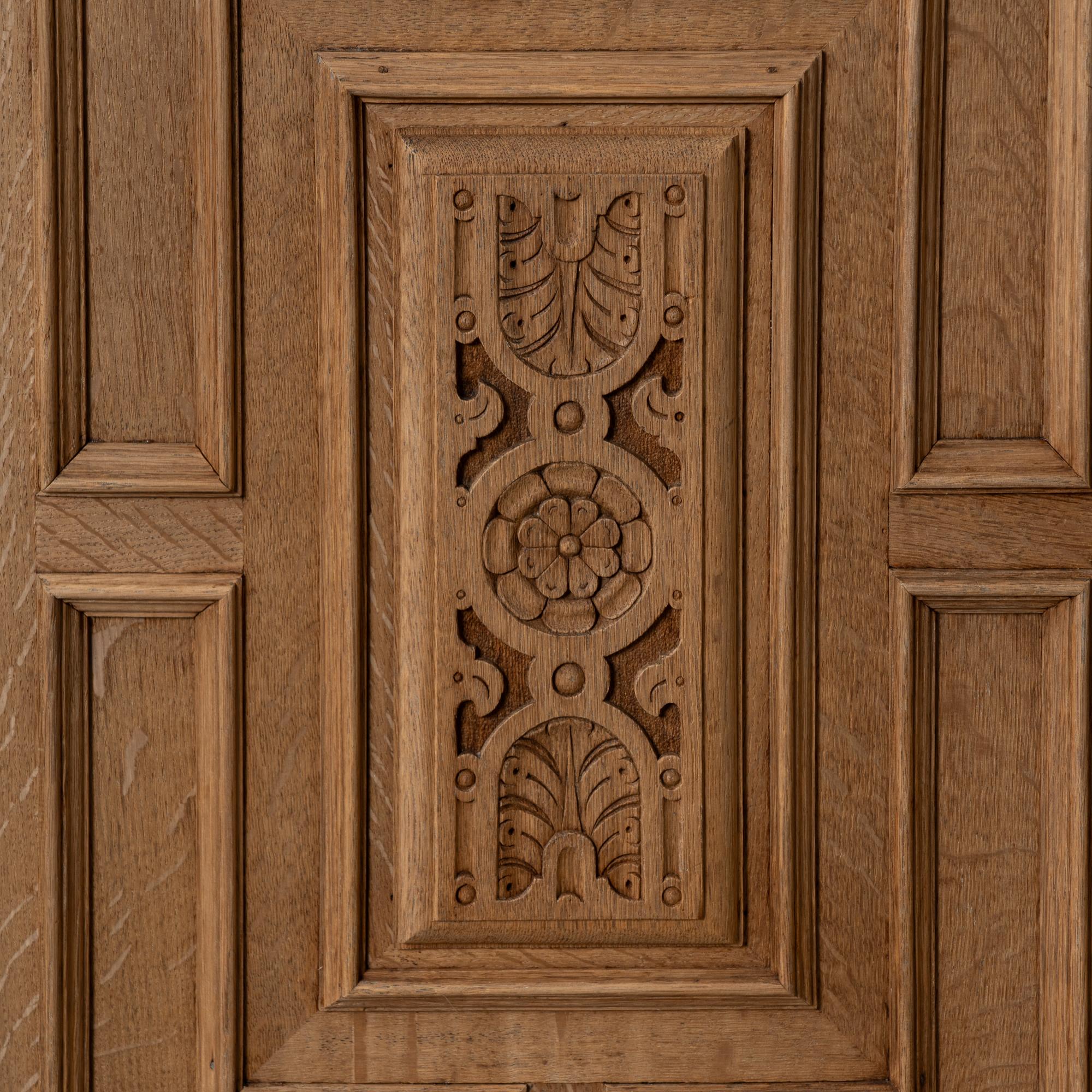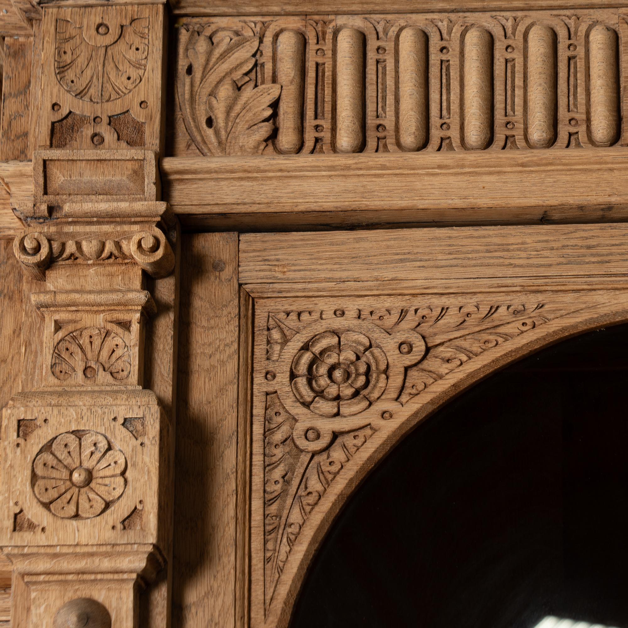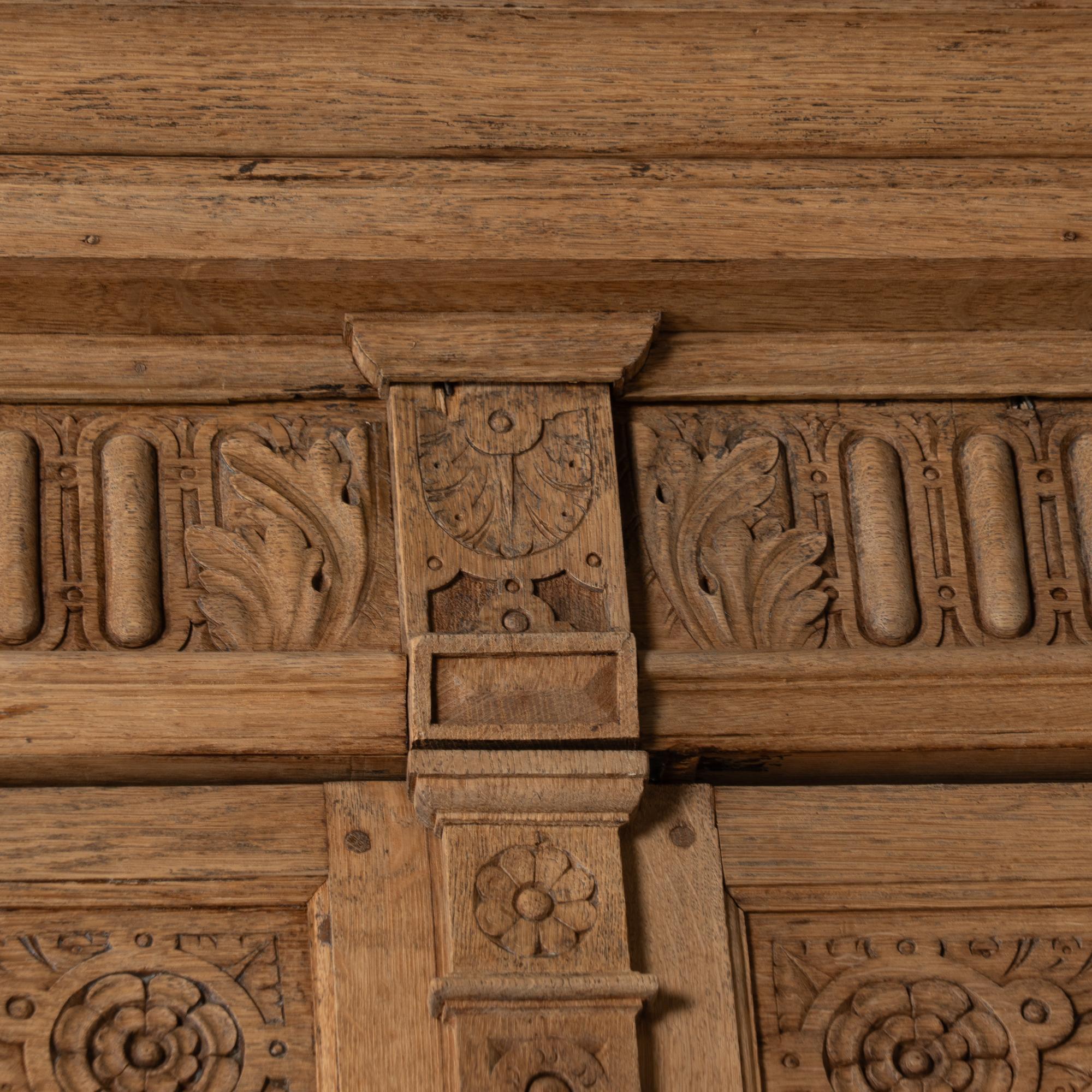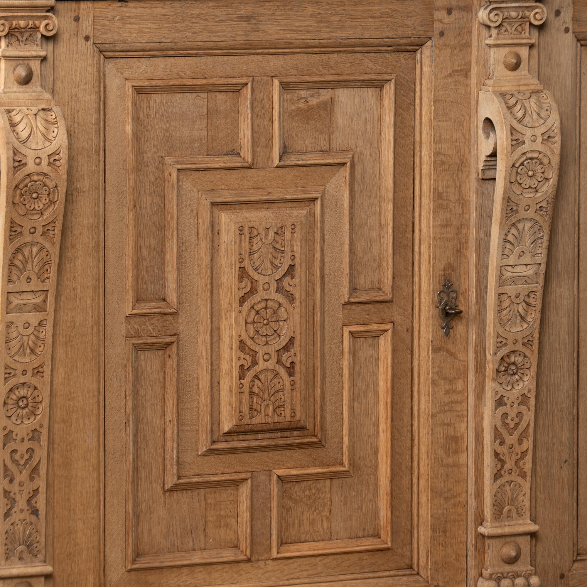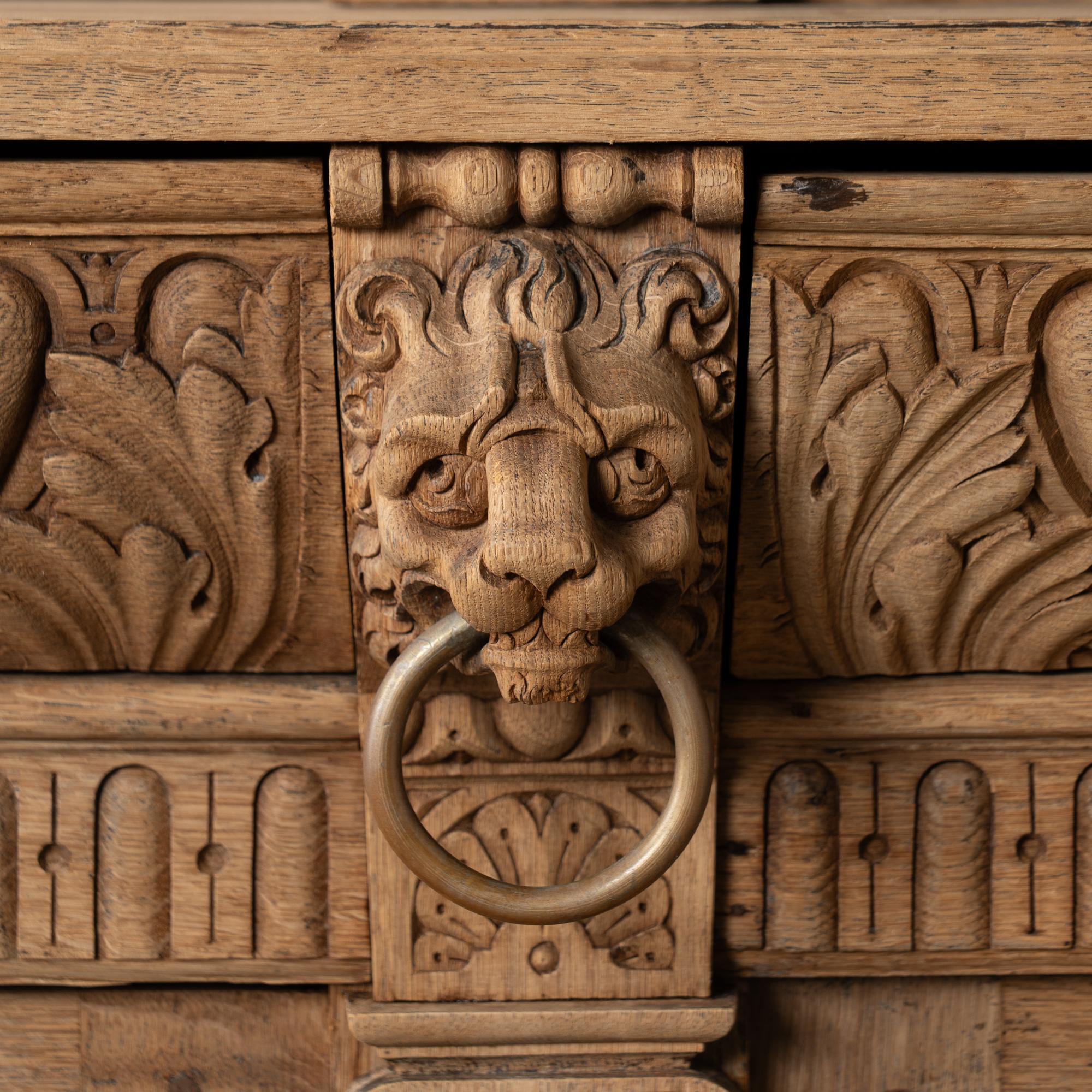 Late 19th-century French large bleached oak display cabinet featuring extensive carved decoration throughout, including floral medallions, lion heads, claw motifs, and additional ornamental detailing. The cabinet is built in two sections for easier transportation and installation. The upper section has four glass-pane doors with adjustable shelving for display. Below are four curved drawers, followed by a lower section with large, heavily paneled cabinet doors. The cabinet rests on five bun feet in front and four block feet in back, giving it a strong architectural presence. Locks and keys no longer function; keys are included and used as pulls only. Typical scratches, nicks, separations reflect generations of use and do not detract from the timeless appeal of this grand display cabinet.