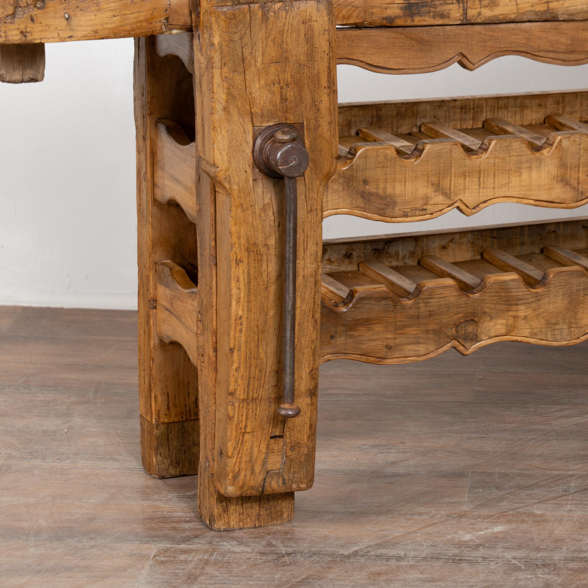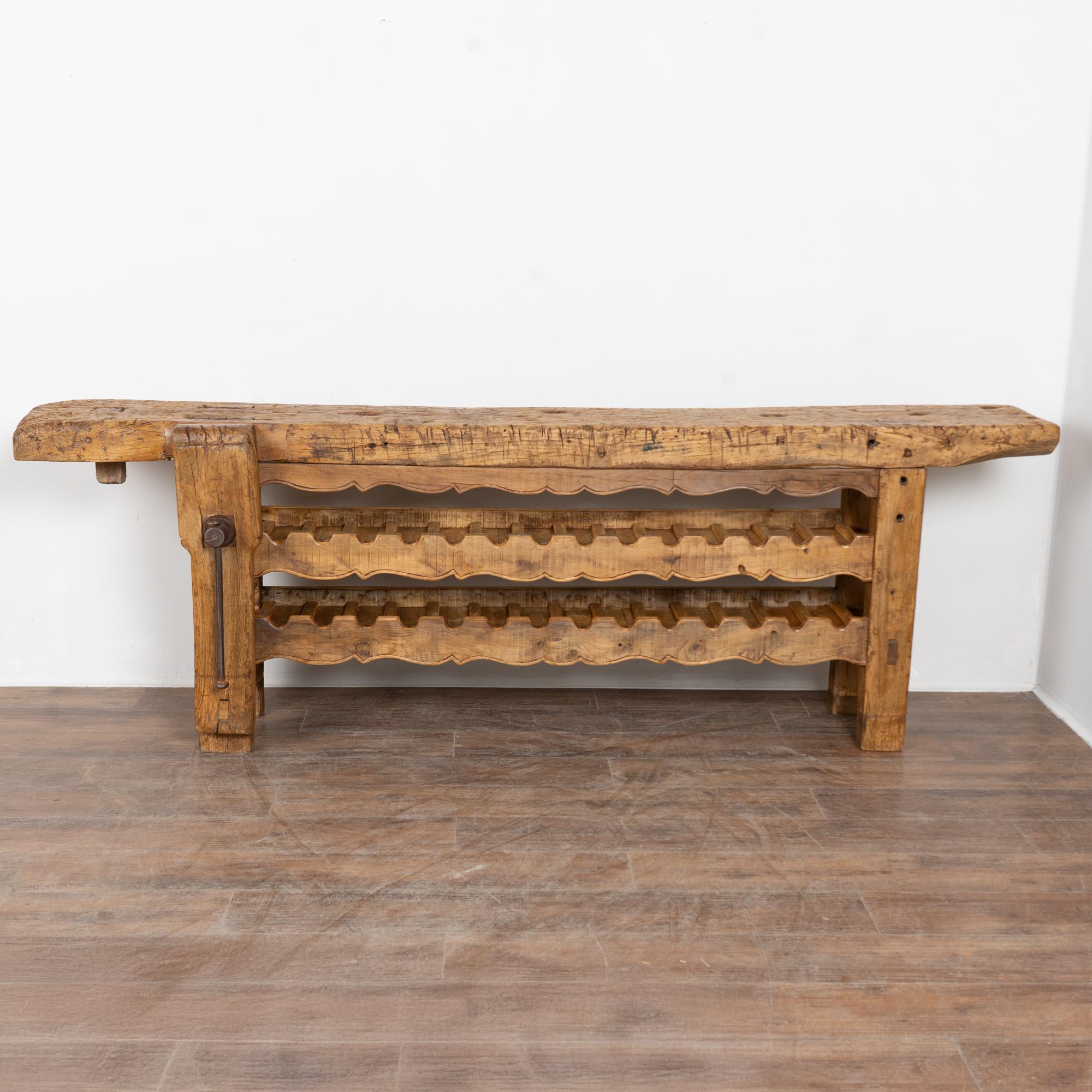 It is the years of constant use revealed in every ding, gouge, gnarl, deep crack, and scratch that enrich the character of this impressive carpenters' workbench from France. Unique to this console is the (newer) two shelves serving as a wine rack; decorative scalloped carving along the front.