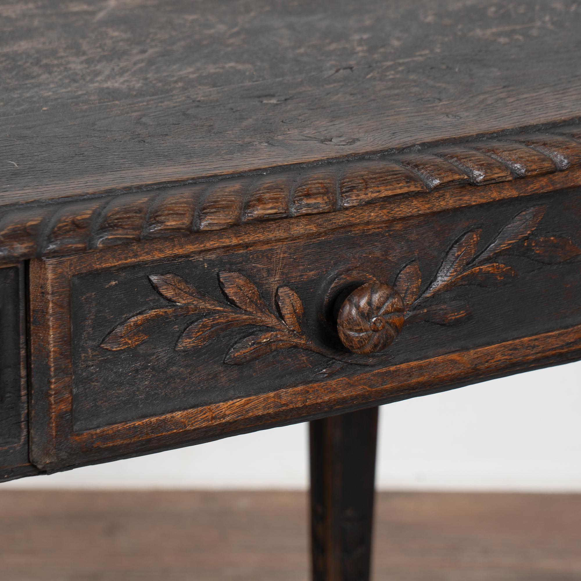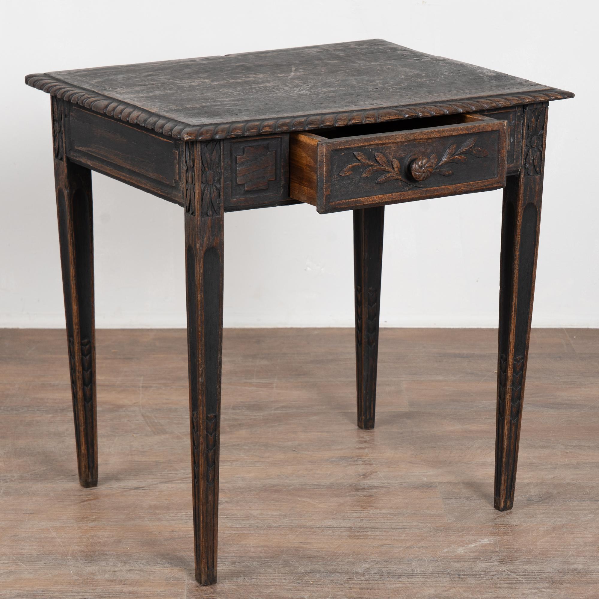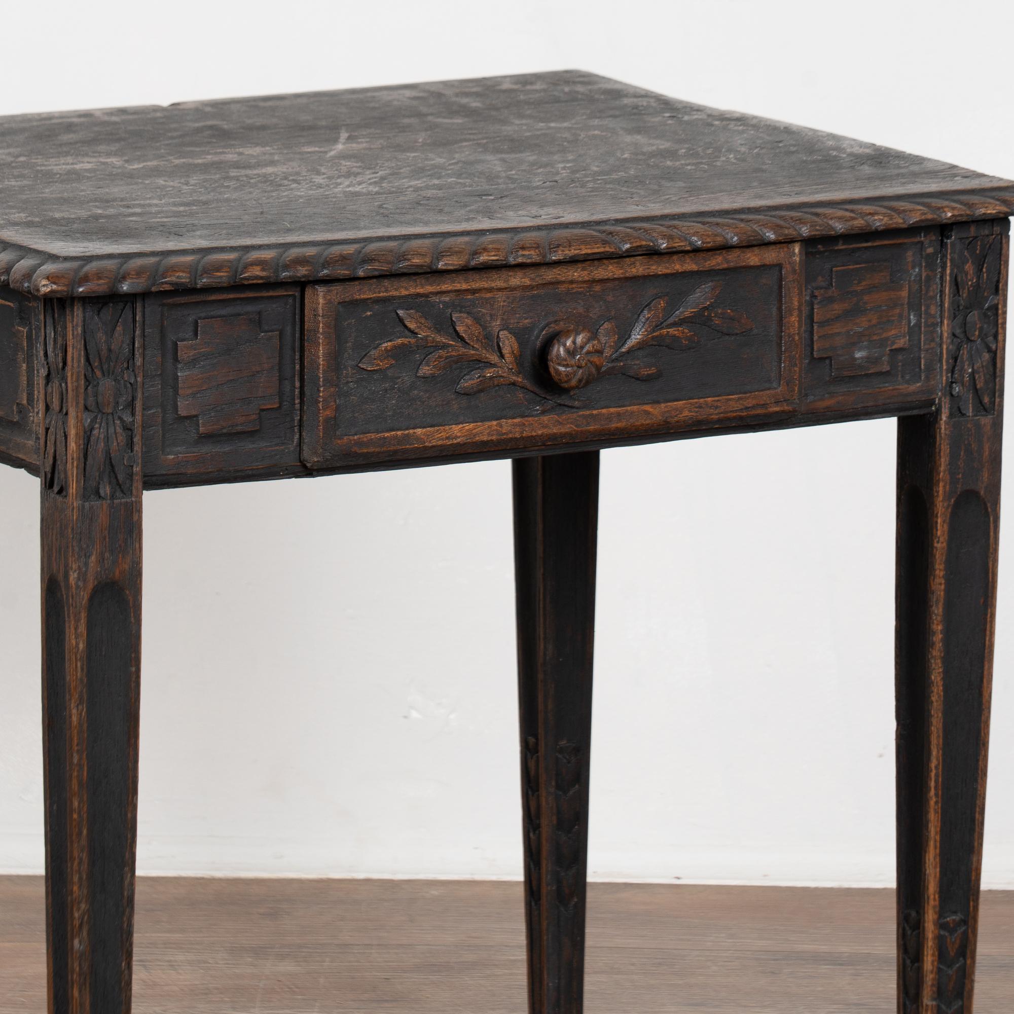 Early 19th-century Swedish oak side table featuring carved tapered legs and a single drawer with carved leaf motif. The tabletop is framed with simple carved detailing, enhancing the refined yet understated design. The original black painted finish is heavily distressed from years of use, revealing the natural oak beneath. The top shows multiple cracks, with age-related scratches, dings, and wear visible throughout, all consistent with a table of this age. Restored, strong, stable, and ready for use, this delightful small table offers excellent versatility as an accent or side table.