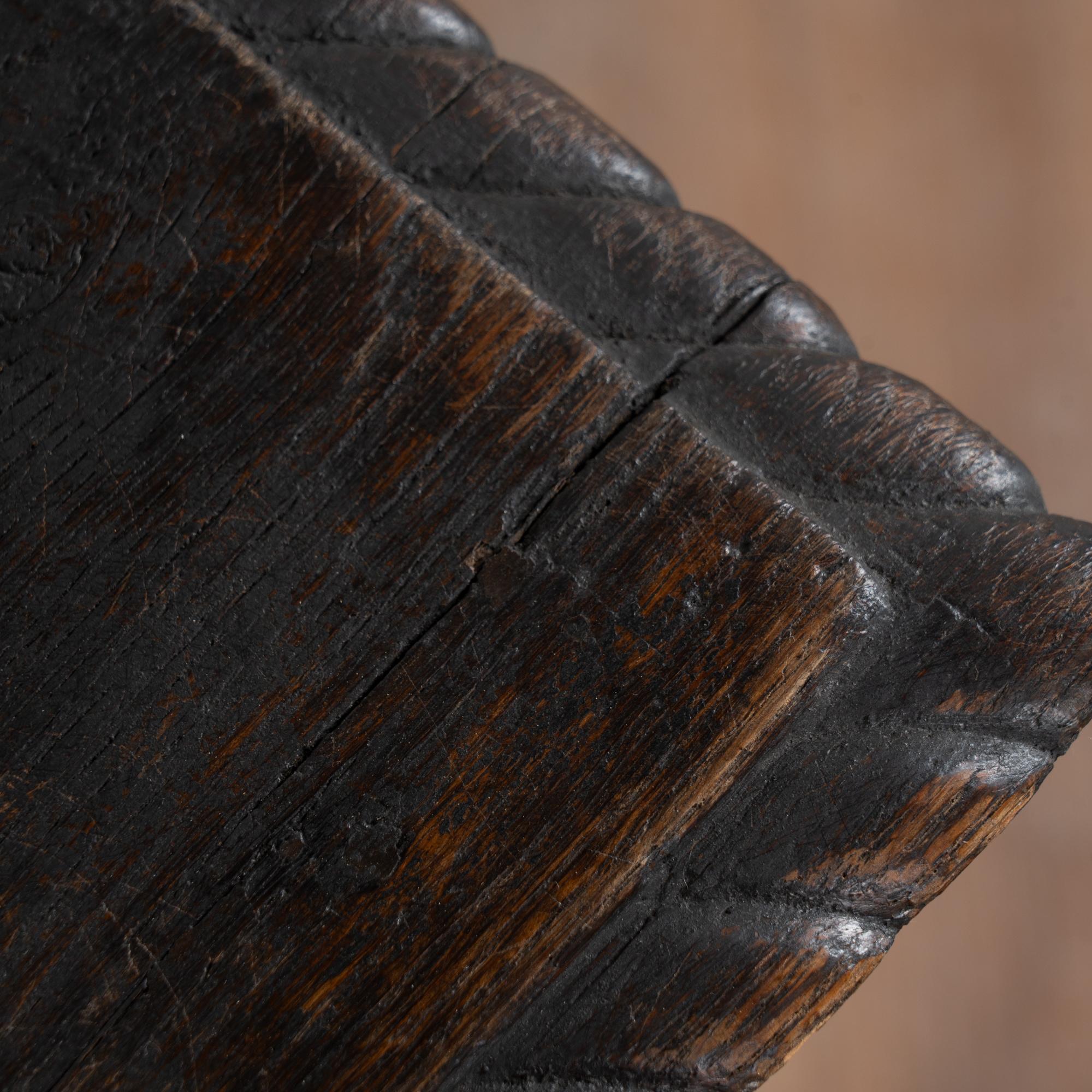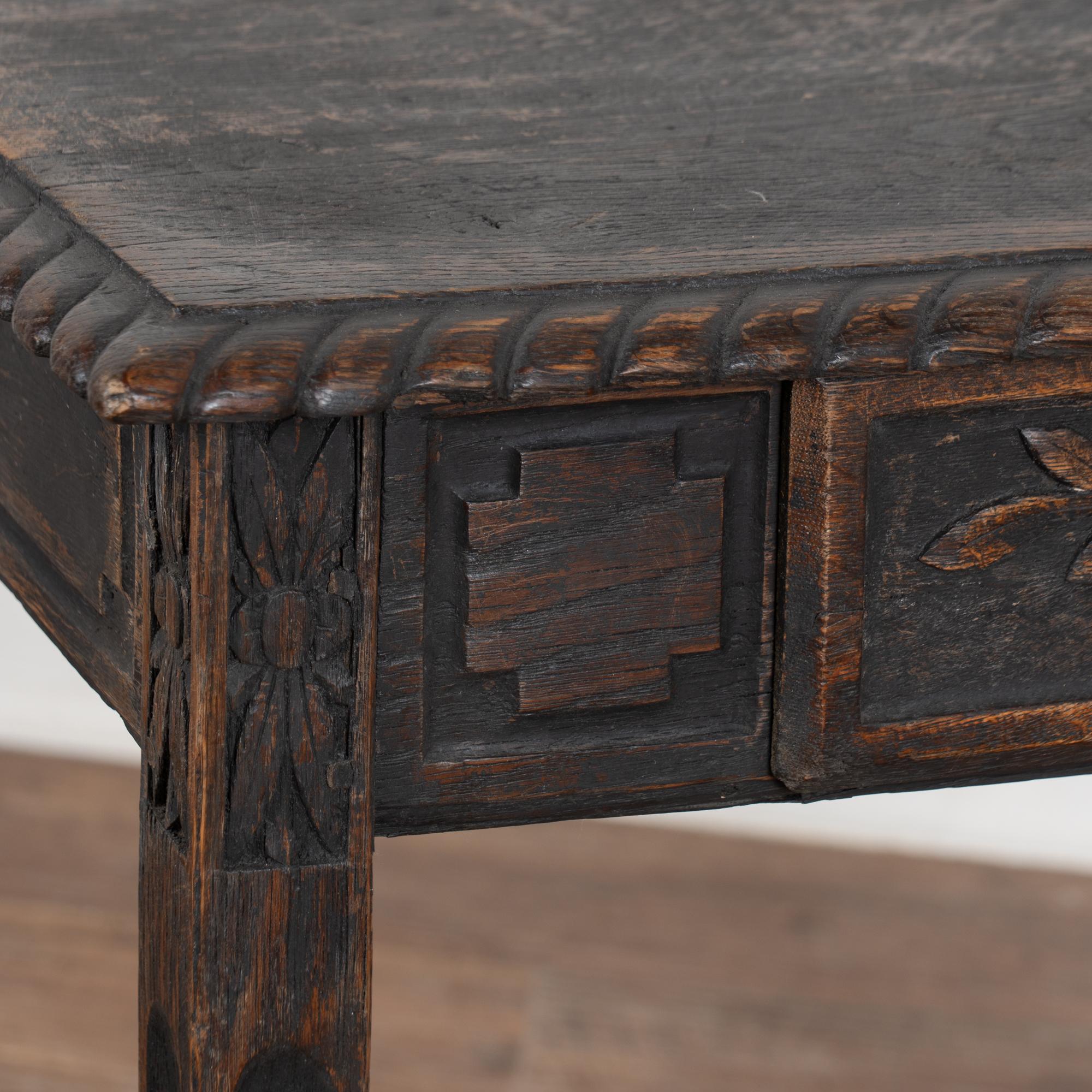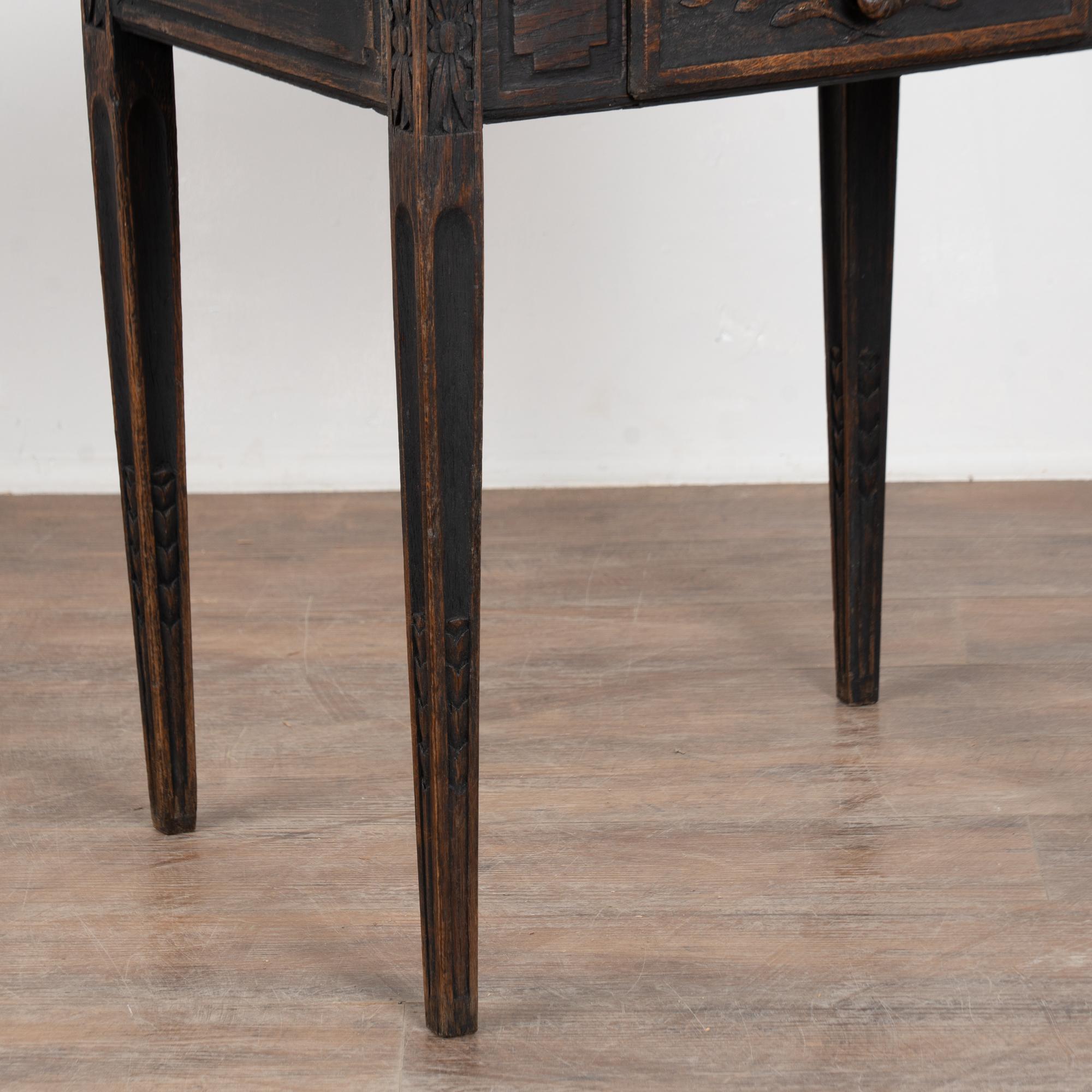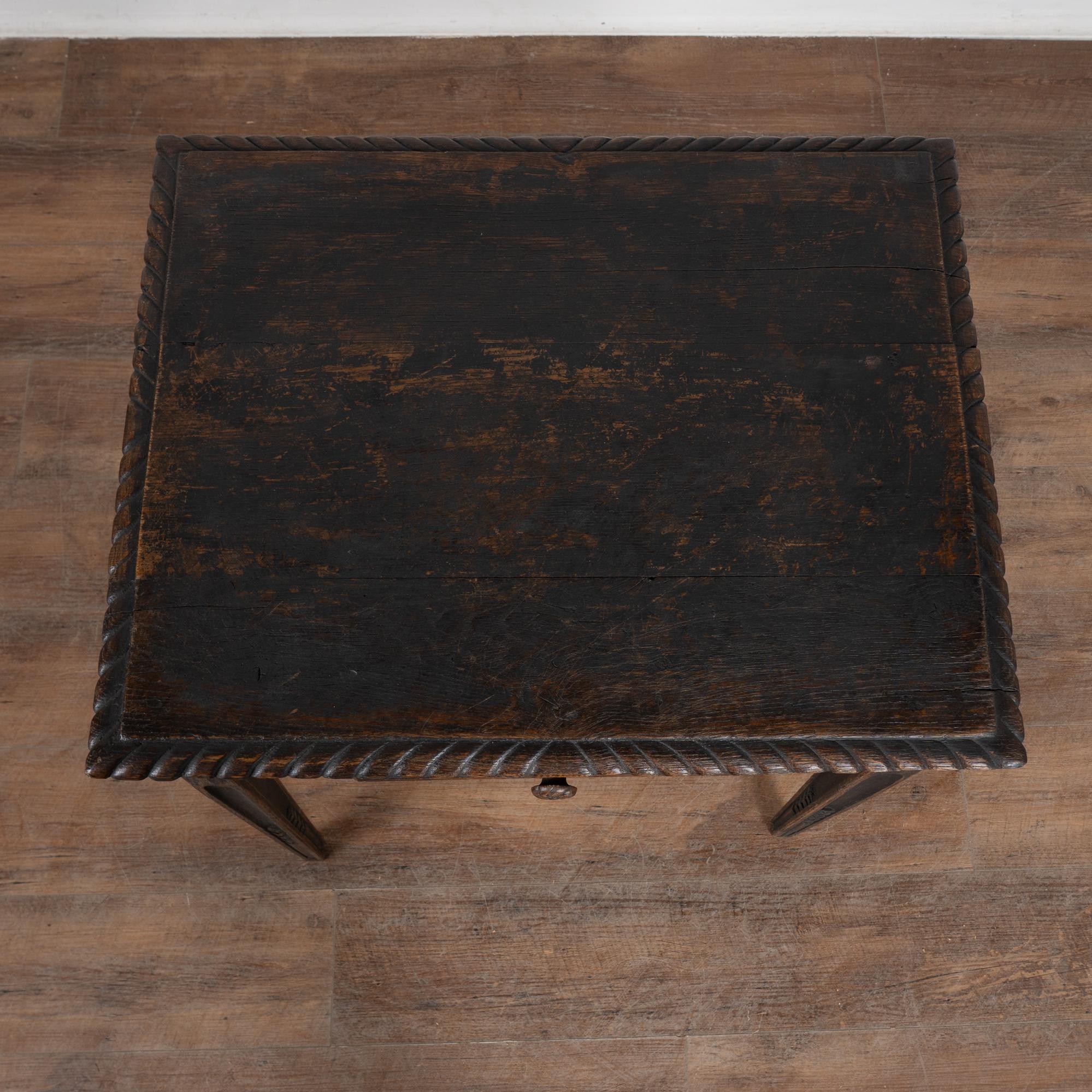 Early 19th-century Swedish oak side table featuring carved tapered legs and a single drawer with carved leaf motif. The tabletop is framed with simple carved detailing, enhancing the refined yet understated design. The original black painted finish is heavily distressed from years of use, revealing the natural oak beneath. The top shows multiple cracks, with age-related scratches, dings, and wear visible throughout, all consistent with a table of this age. Restored, strong, stable, and ready for use, this delightful small table offers excellent versatility as an accent or side table.