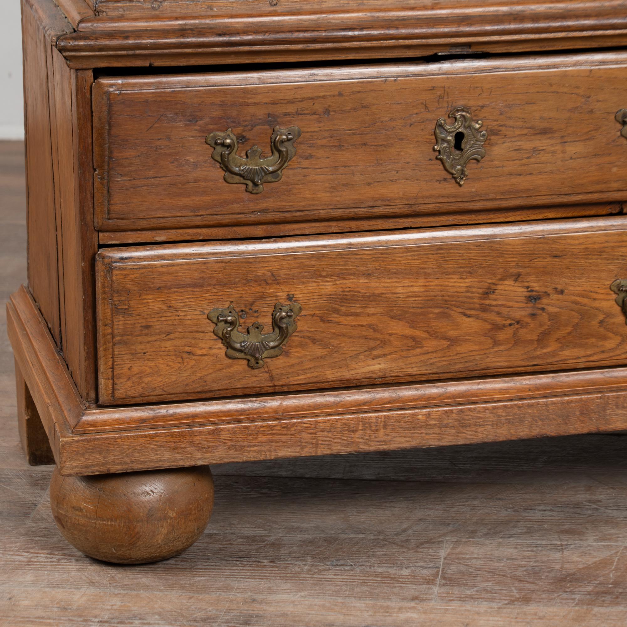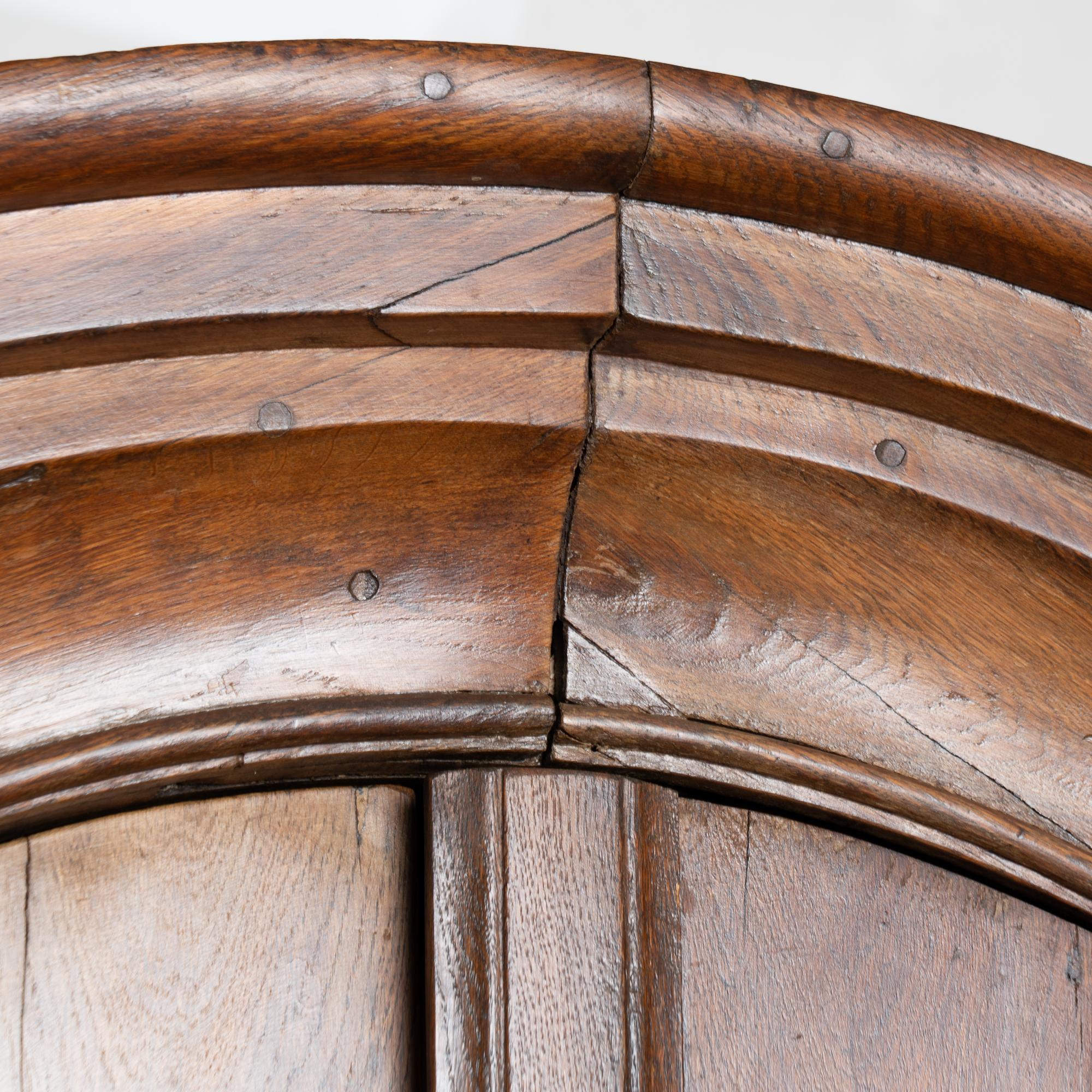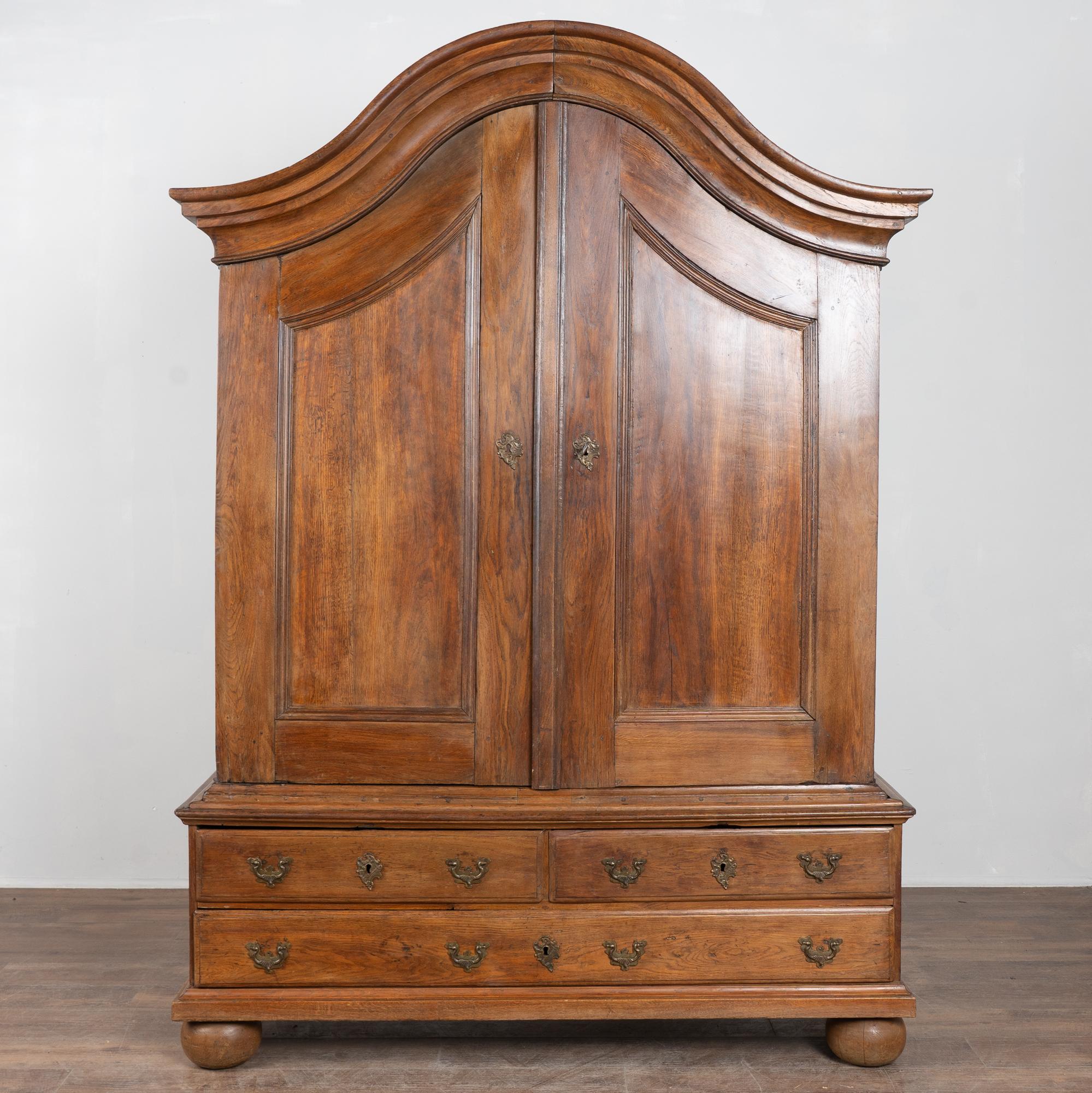 Late 18th-century Swedish oak tall Rococo cabinet with deep aged patina and a dramatic curved bonnet crown. The lower section features two drawers over one long drawer, each opening with brass pulls. Drawer bottoms show extensive age-related separation typical of oak furniture from this period. The upper cabinet doors still lock with the original key and open to reveal three interior drawers. This stately cabinet has stunning patina and grand presence.