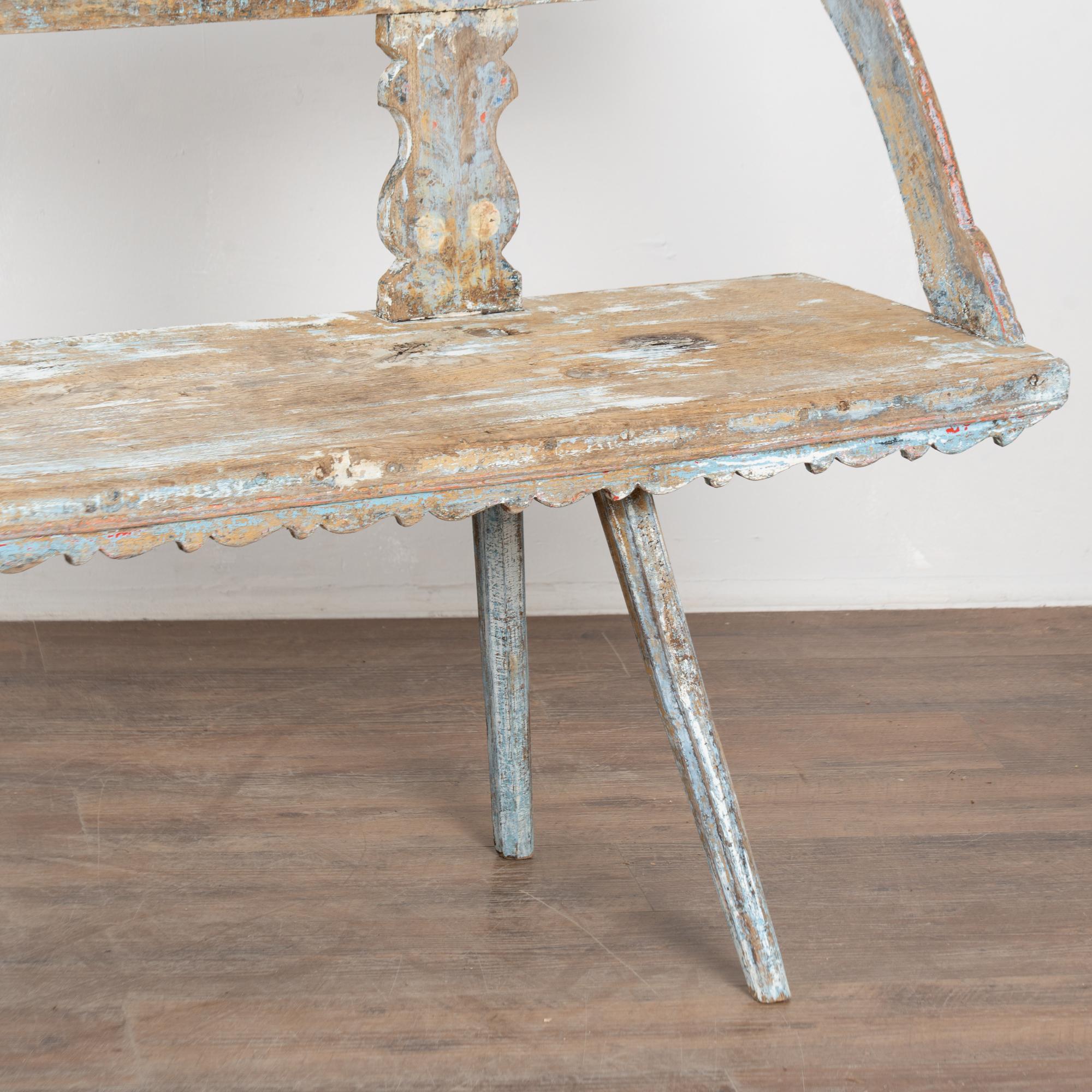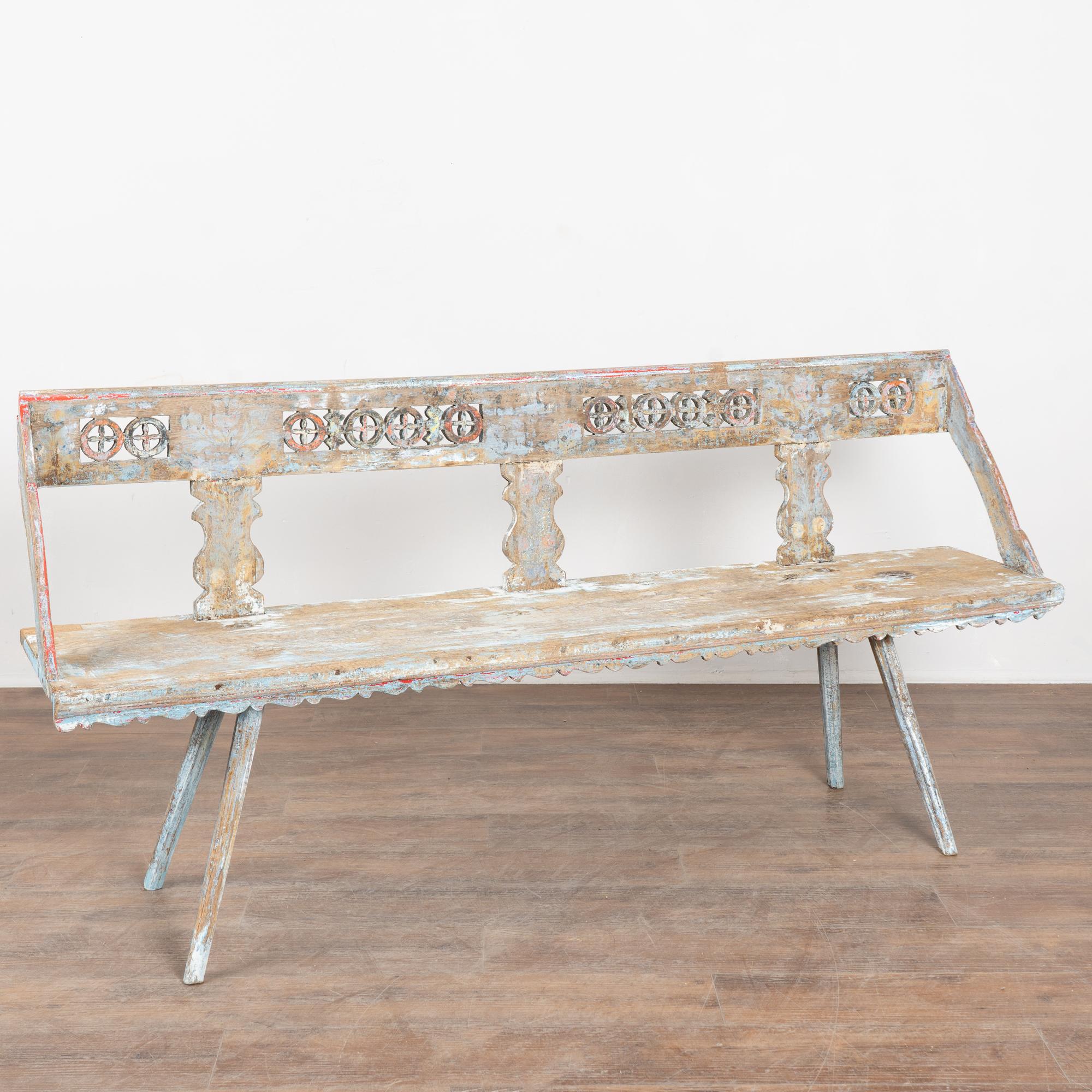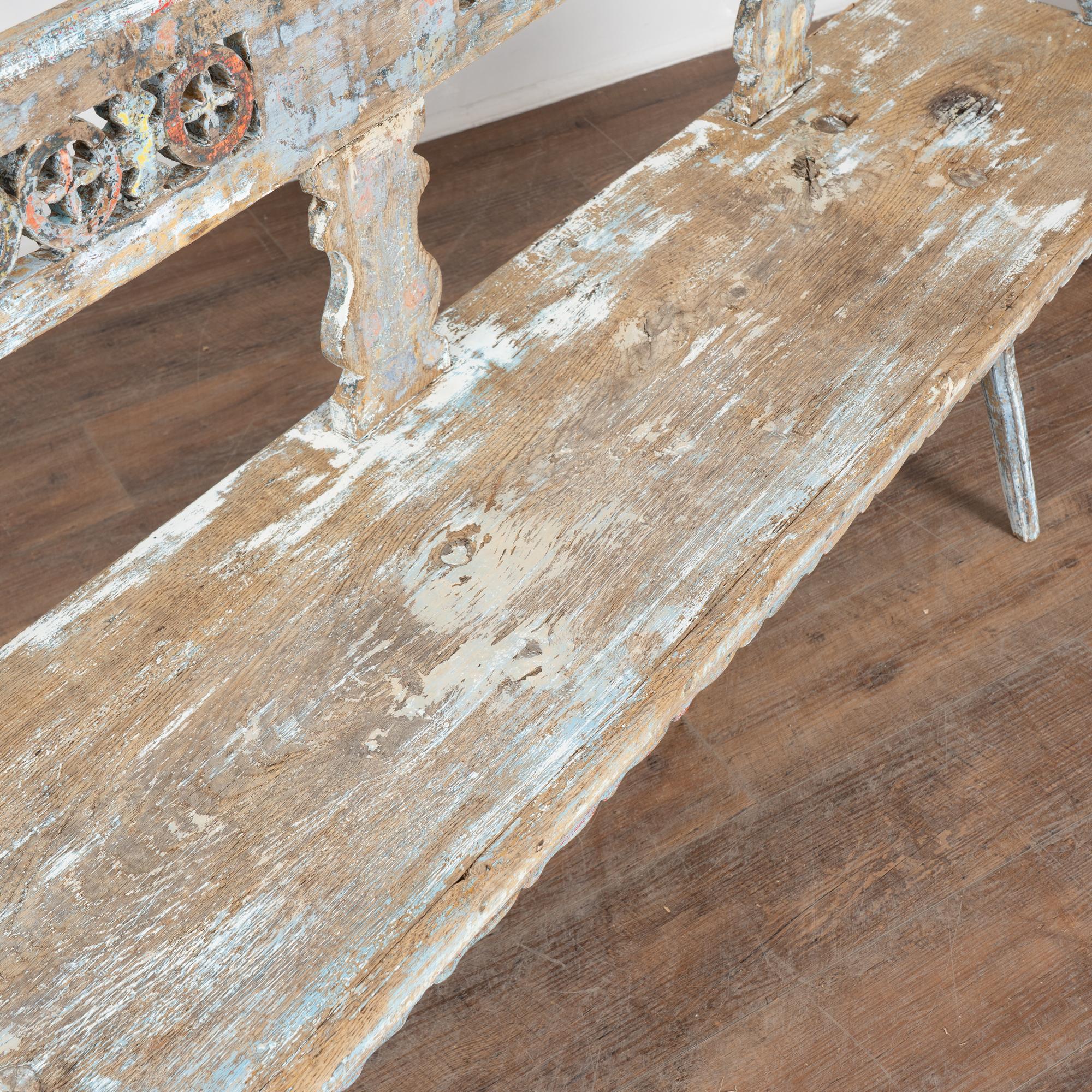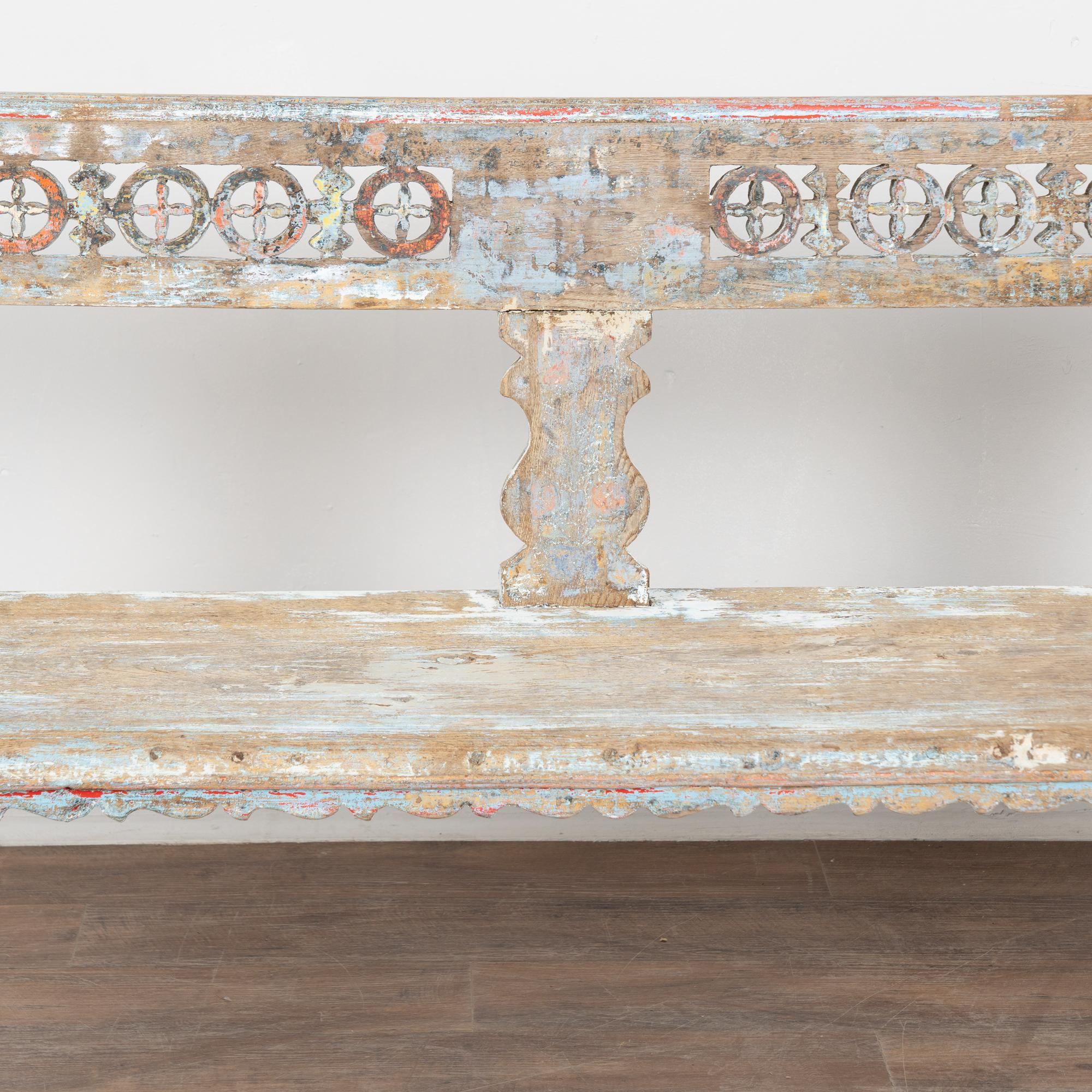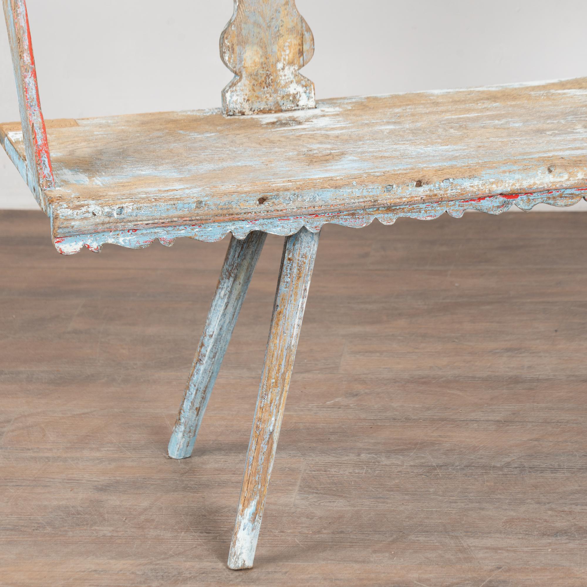 19th-century Hungarian oak peg-leg bench featuring carved arms and back support, with splayed peg legs typical of European country furniture. The original painted finish is highly distressed, presenting a soft blue overall tone with accents of red, yellow, and white that enhance its folk character. Most of the painted finish has been worn off through generations of use, resulting in much of the old wood patina exposed. A gently scalloped front edge adds a decorative touch. This bench reflects years of use while retaining strong presence and charm. Restored strong, stable, and ready for use, it is a beautiful example of European countryside craftsmanship.