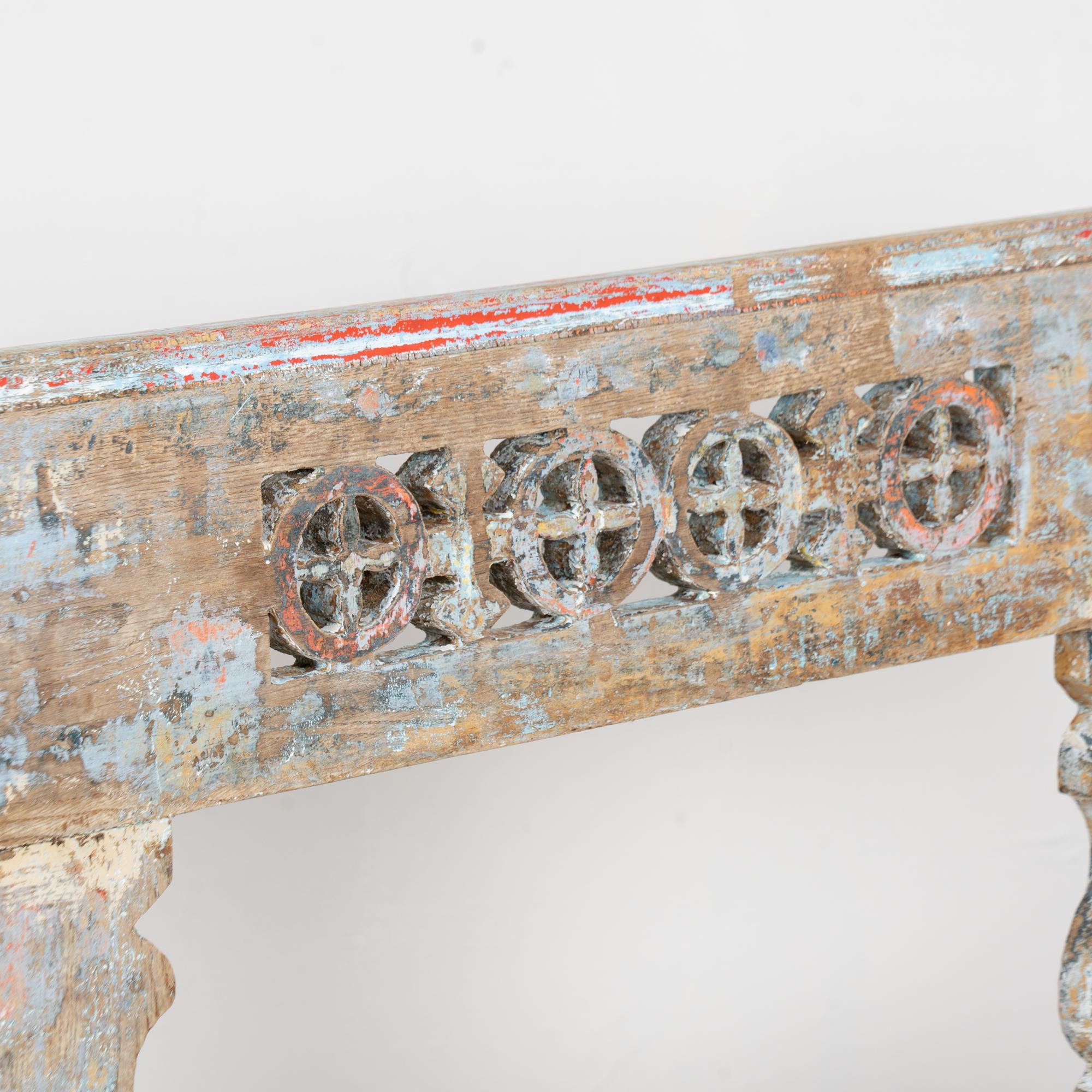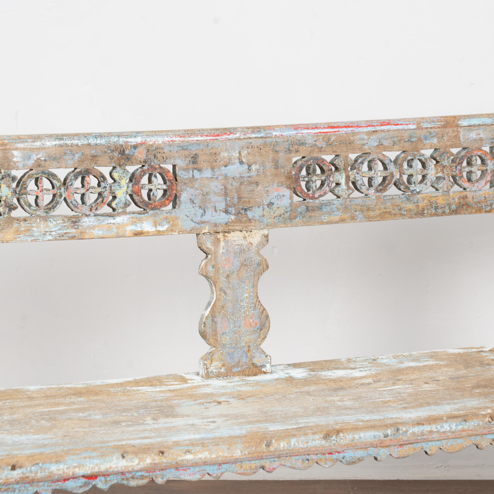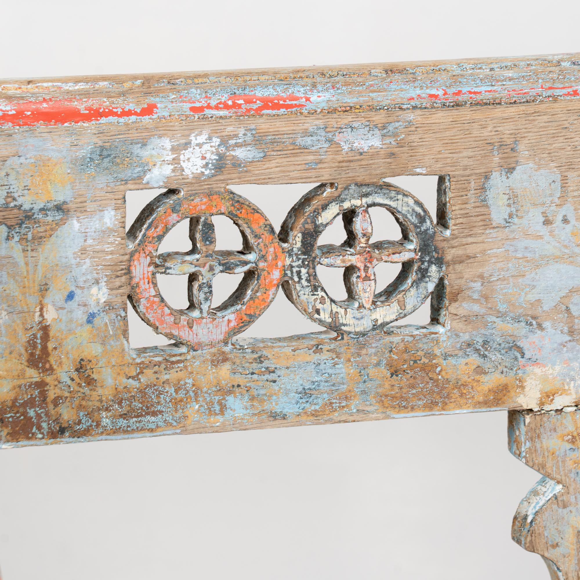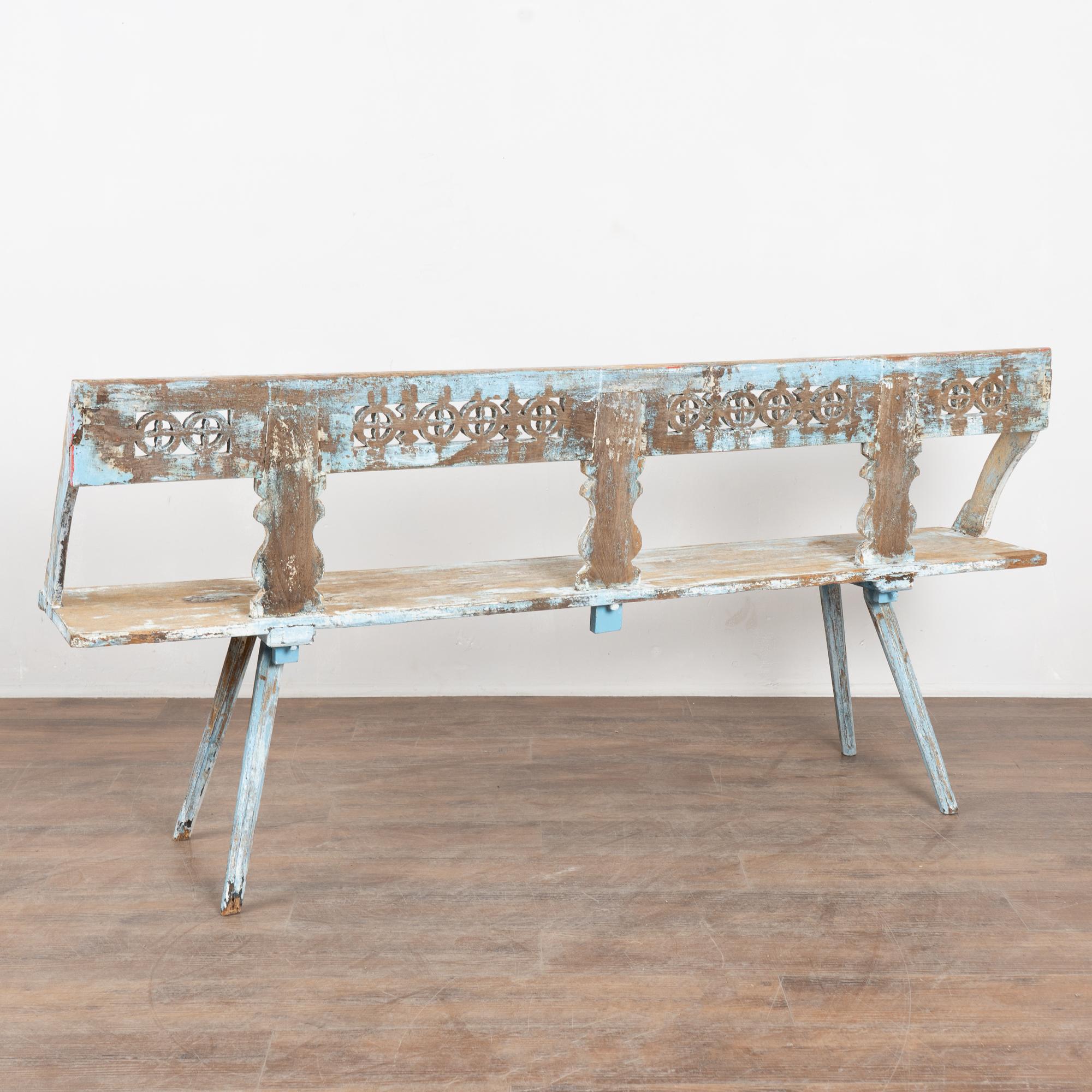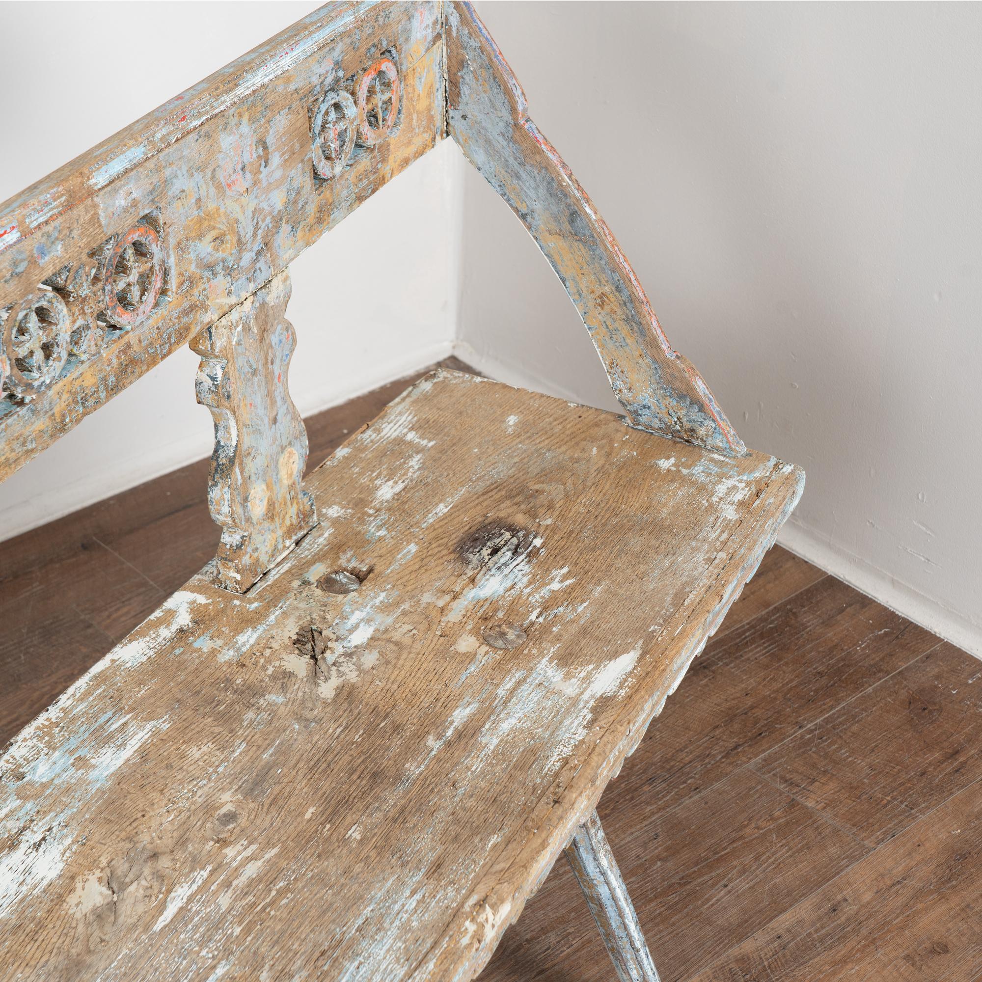 19th-century Hungarian oak peg-leg bench featuring carved arms and back support, with splayed peg legs typical of European country furniture. The original painted finish is highly distressed, presenting a soft blue overall tone with accents of red, yellow, and white that enhance its folk character. Most of the painted finish has been worn off through generations of use, resulting in much of the old wood patina exposed. A gently scalloped front edge adds a decorative touch. This bench reflects years of use while retaining strong presence and charm. Restored strong, stable, and ready for use, it is a beautiful example of European countryside craftsmanship.