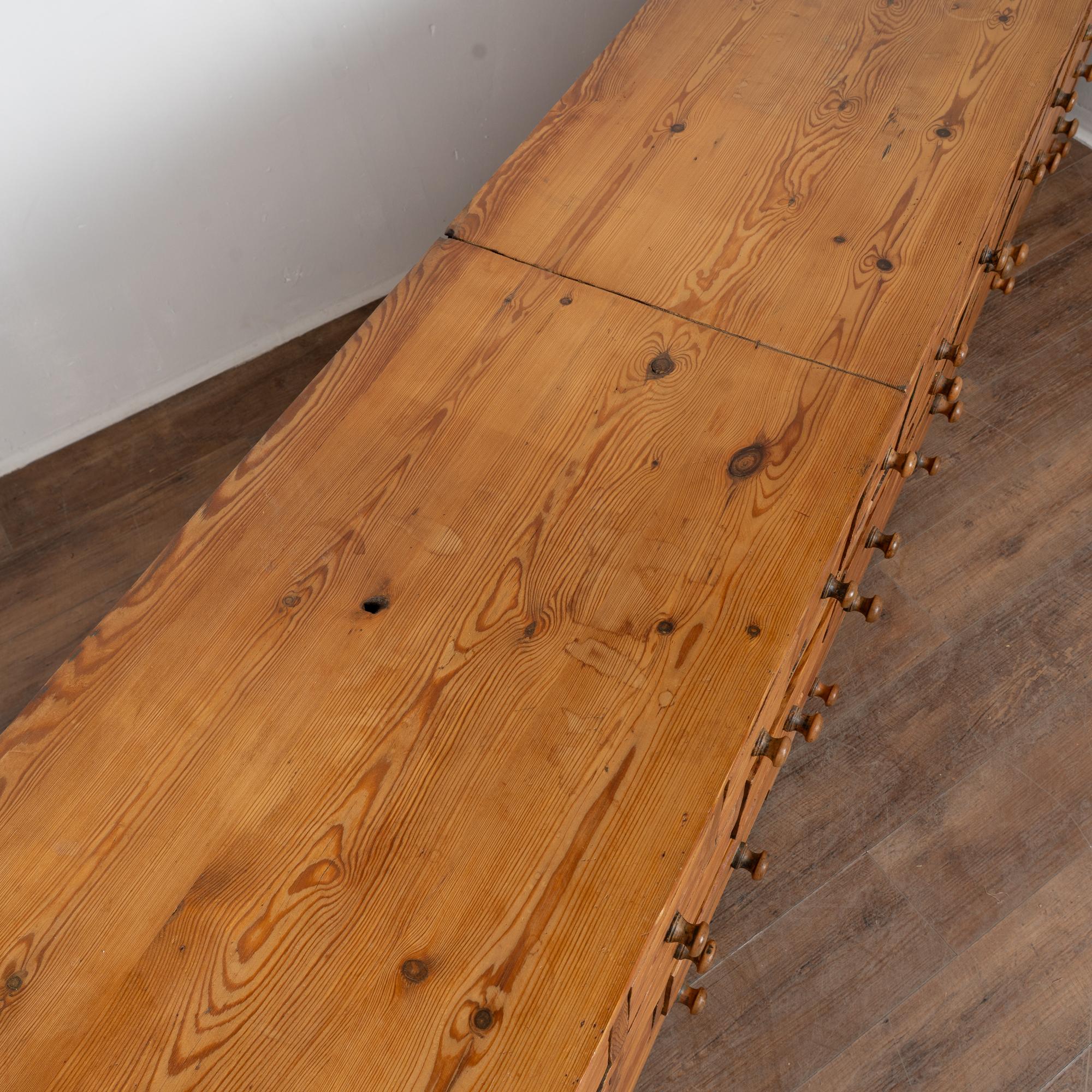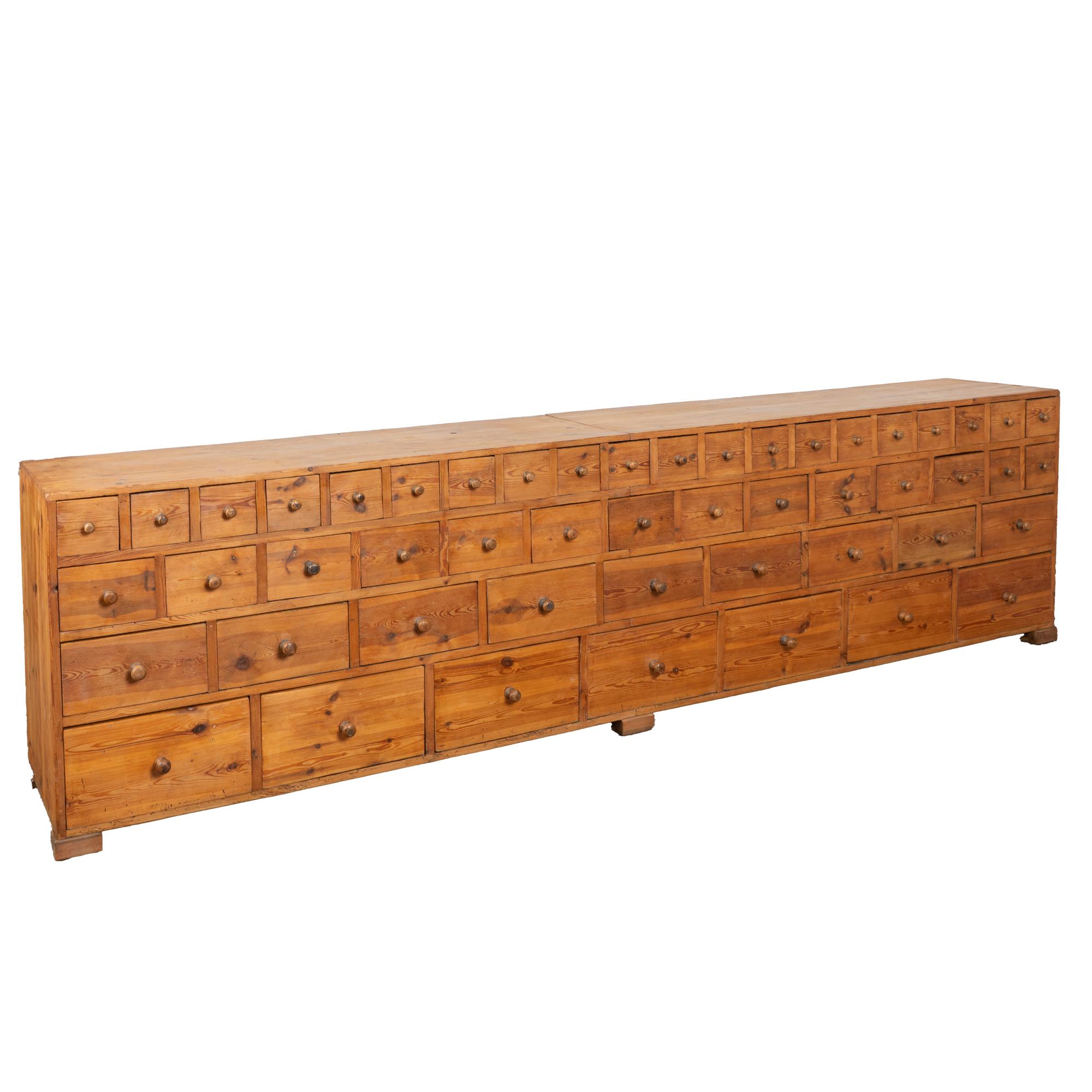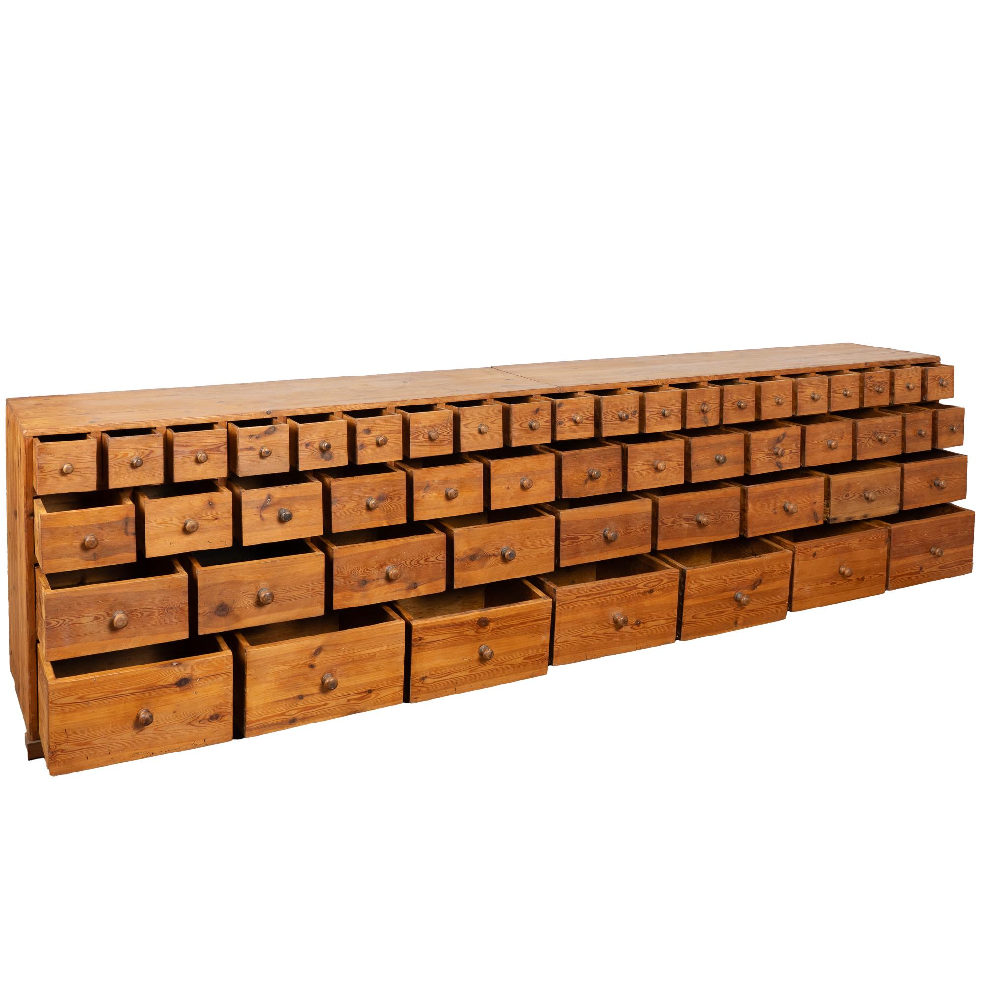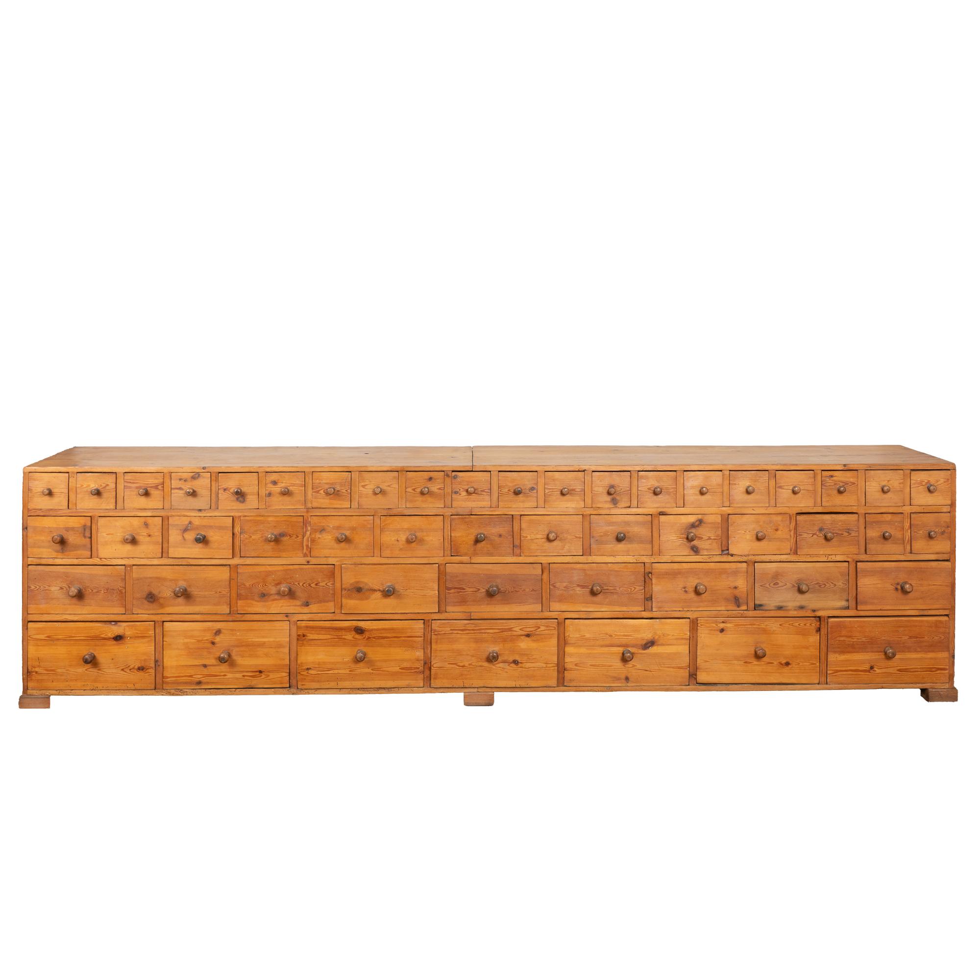 19th-century Swedish pine apothecary counter of impressive scale, featuring fifty-one drawers in varying sizes. Constructed with traditional dovetail joinery throughout, this substantial counter measures over ten feet in length, making it an unusually large and rare example. The pine top is built in two sections and shows stains, gouges, scratches, and evidence of old dried wormhole activity, all contributing to the warm, deeply aged patina. Some old knots in the wood have fallen out, creating small holes consistent with age and use. All drawers function smoothly. Restored strong, stable, and ready for use. Old repairs seen along back.