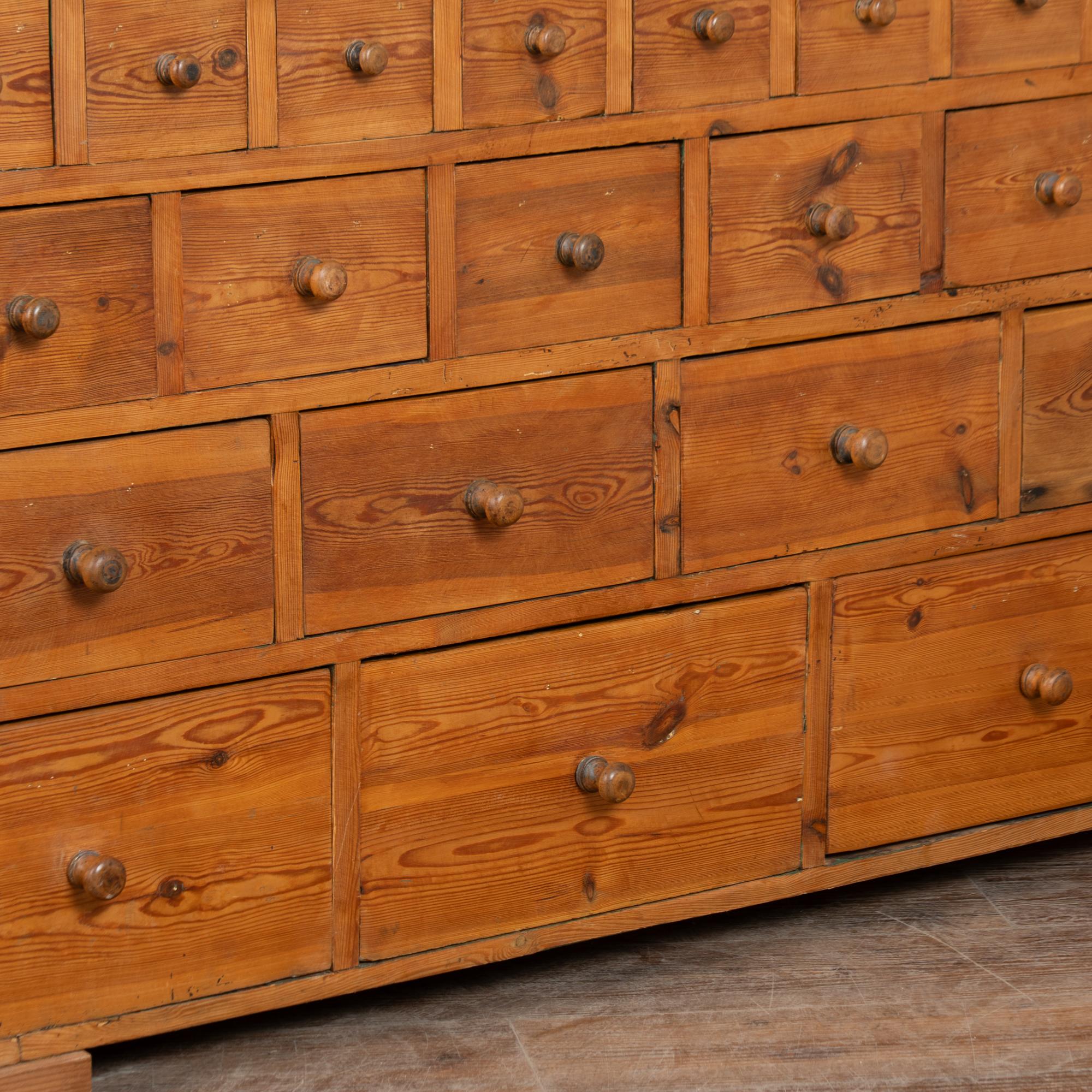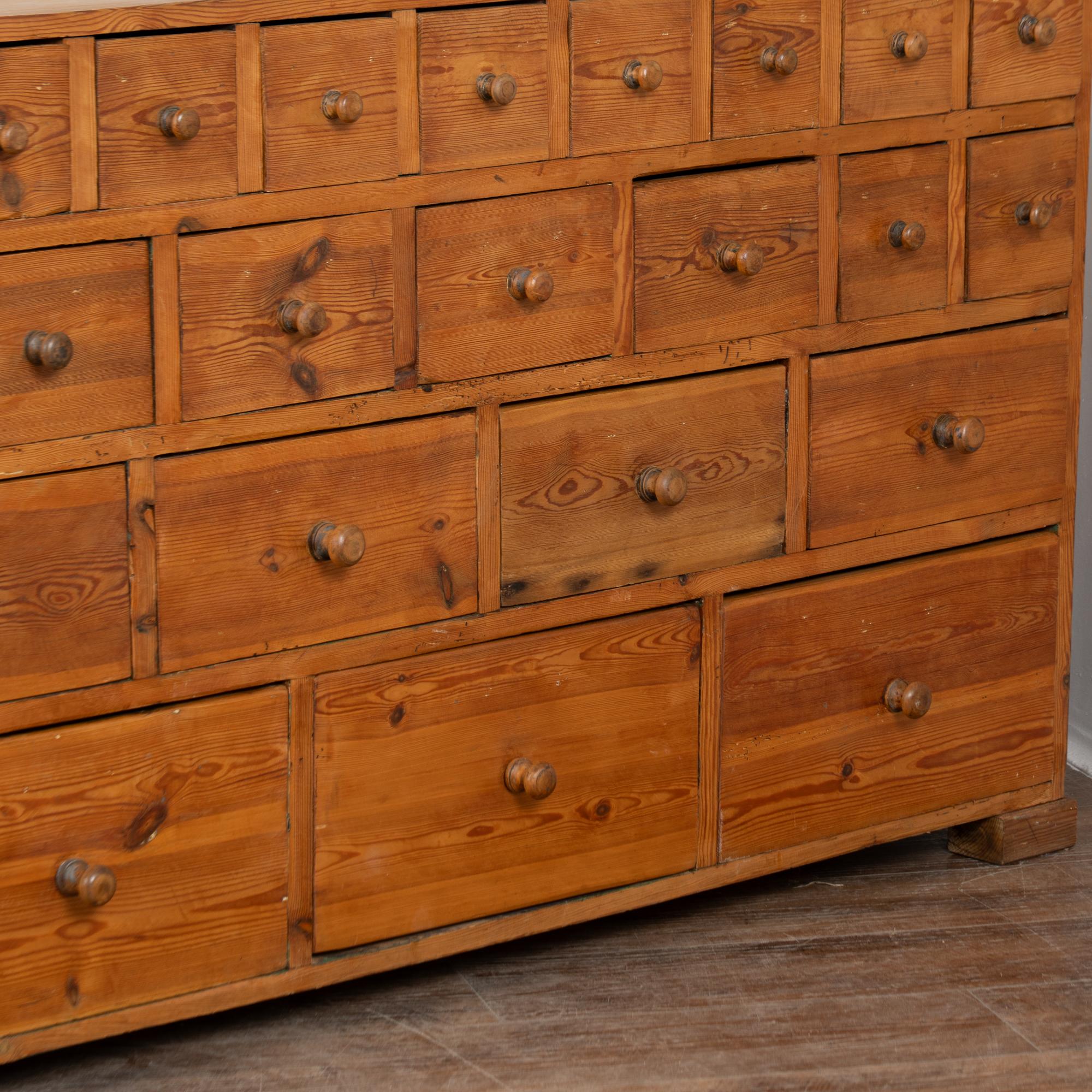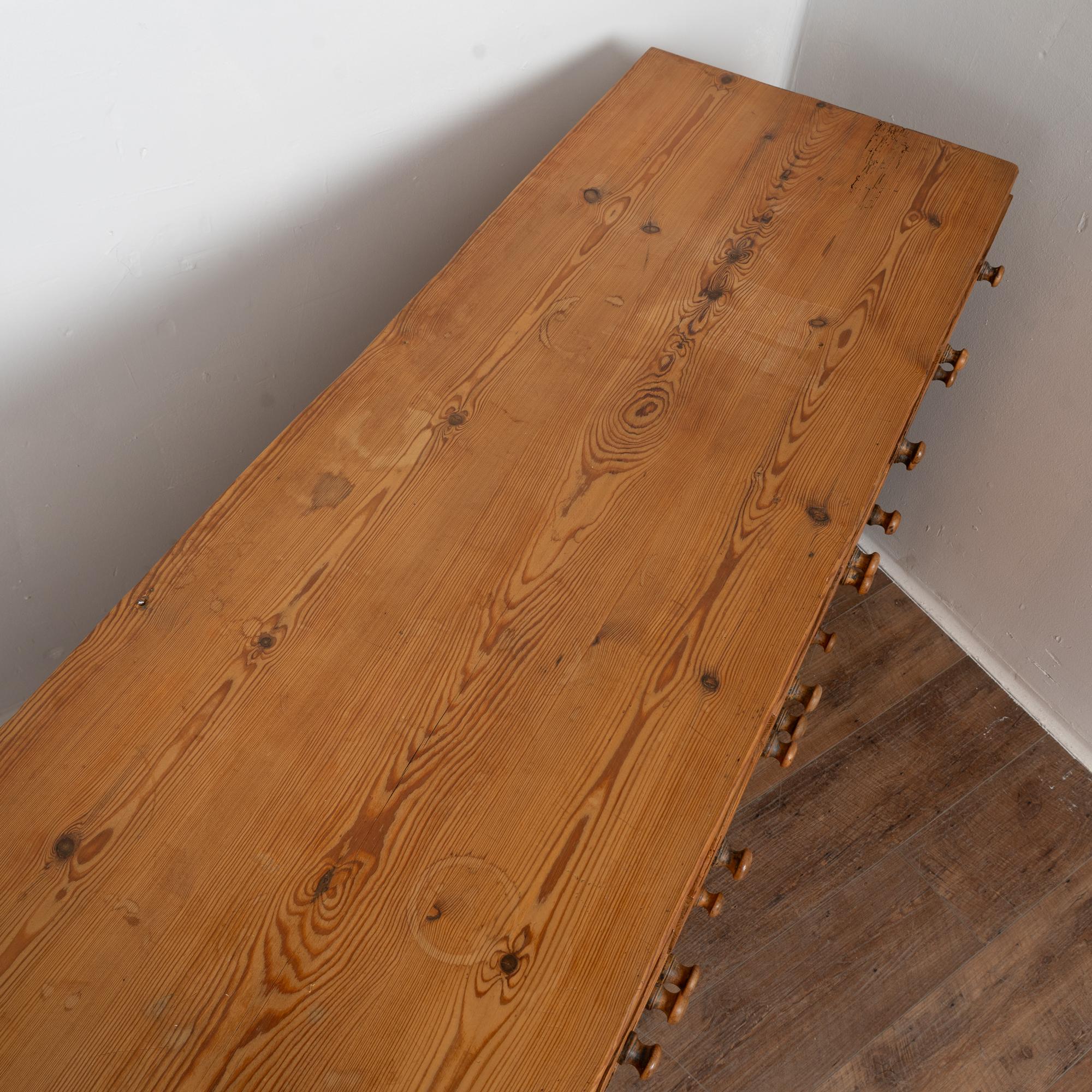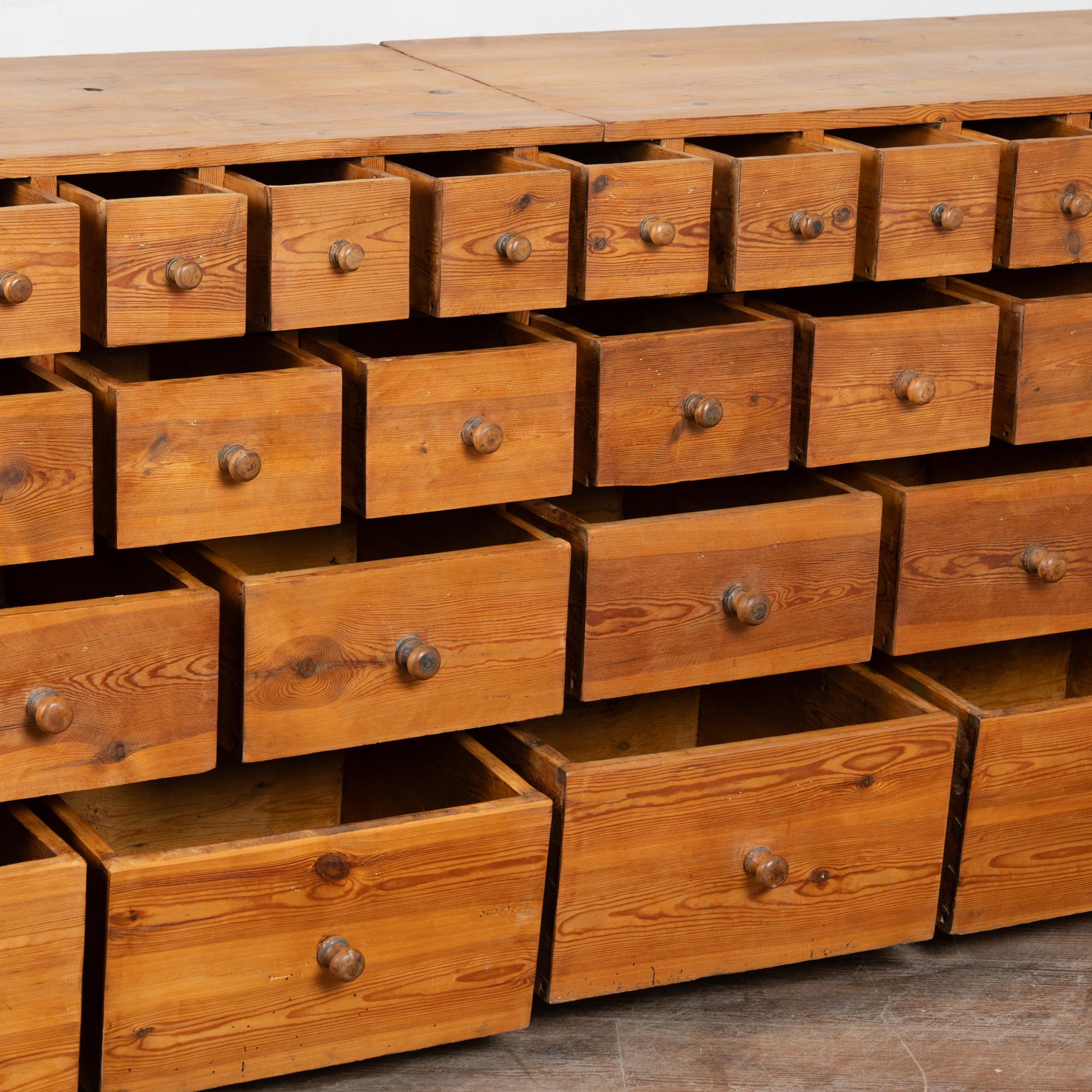 19th-century Swedish pine apothecary counter of impressive scale, featuring fifty-one drawers in varying sizes. Constructed with traditional dovetail joinery throughout, this substantial counter measures over ten feet in length, making it an unusually large and rare example. The pine top is built in two sections and shows stains, gouges, scratches, and evidence of old dried wormhole activity, all contributing to the warm, deeply aged patina. Some old knots in the wood have fallen out, creating small holes consistent with age and use. All drawers function smoothly. Restored strong, stable, and ready for use. Old repairs seen along back.