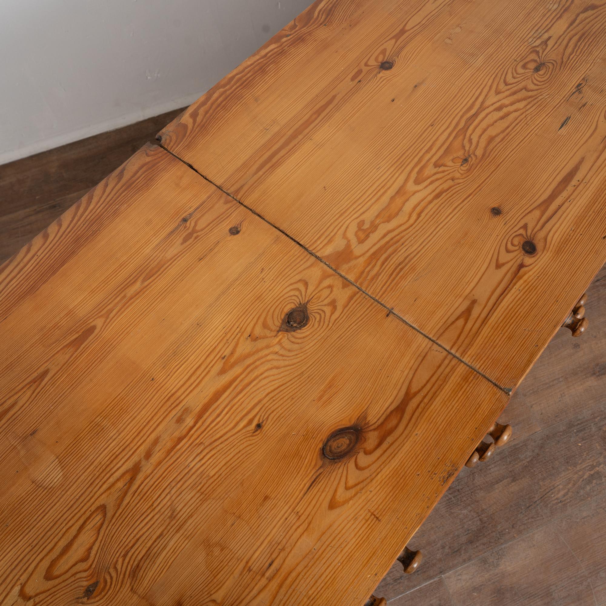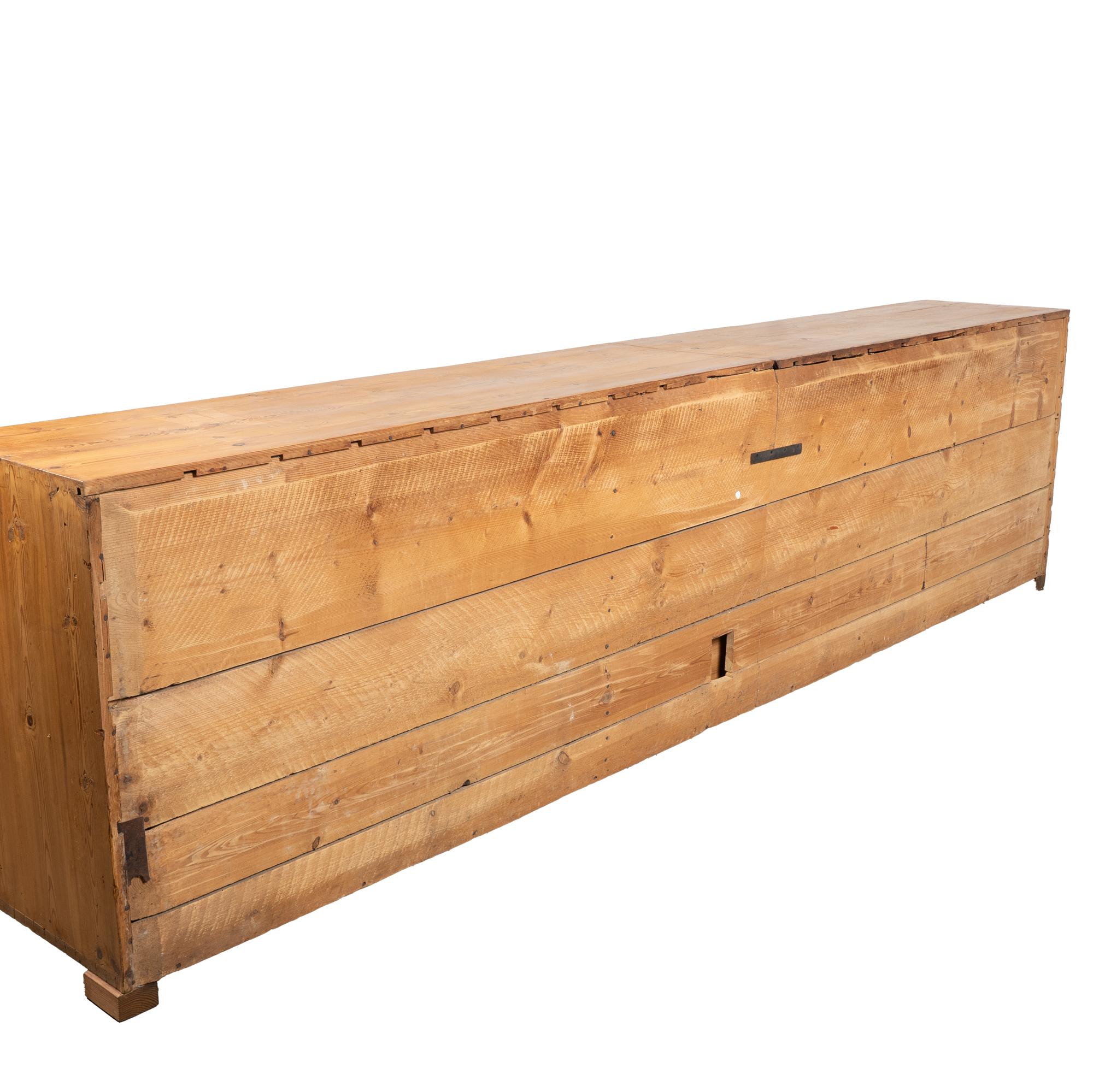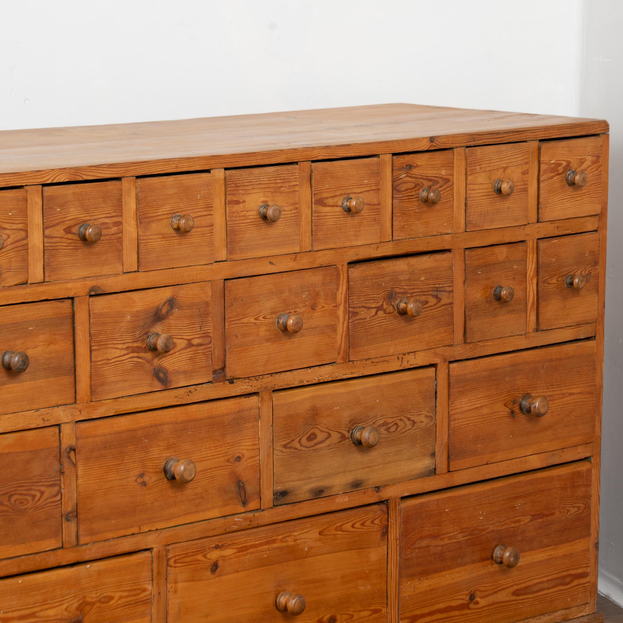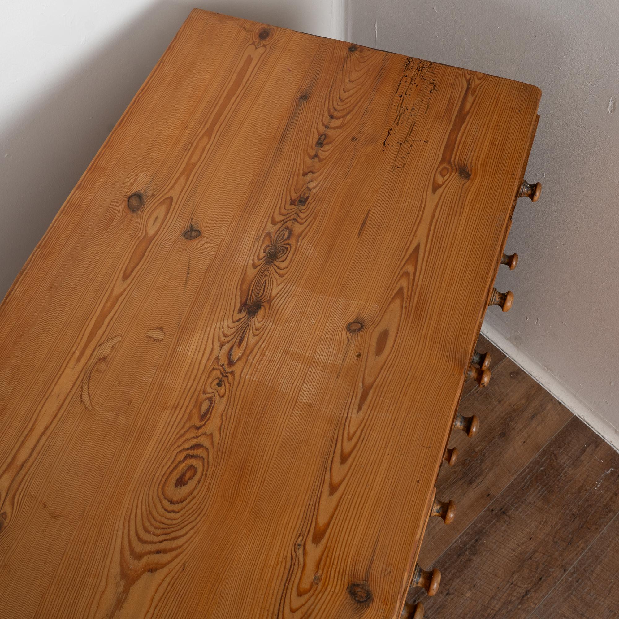 19th-century Swedish pine apothecary counter of impressive scale, featuring fifty-one drawers in varying sizes. Constructed with traditional dovetail joinery throughout, this substantial counter measures over ten feet in length, making it an unusually large and rare example. The pine top is built in two sections and shows stains, gouges, scratches, and evidence of old dried wormhole activity, all contributing to the warm, deeply aged patina. Some old knots in the wood have fallen out, creating small holes consistent with age and use. All drawers function smoothly. Restored strong, stable, and ready for use. Old repairs seen along back.