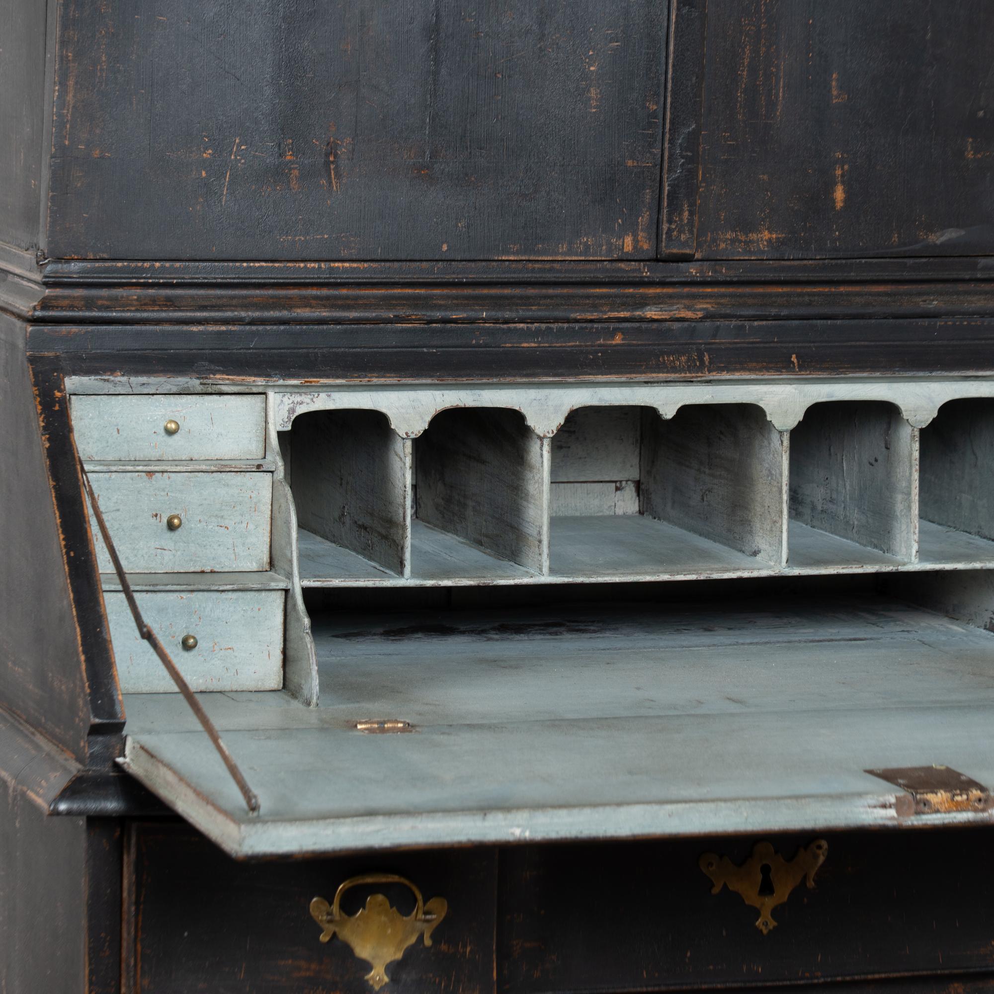 Late 18th-century Danish oak bureau or secretary featuring a newer professionally applied black layered painted finish, lightly distressed to reveal natural oak beneath and suit the age of the piece. The interior is painted a contrasting pale blue with gray undertones. The desktop opens on long hinges to reveal petite drawers and cubbies for storage and organization.