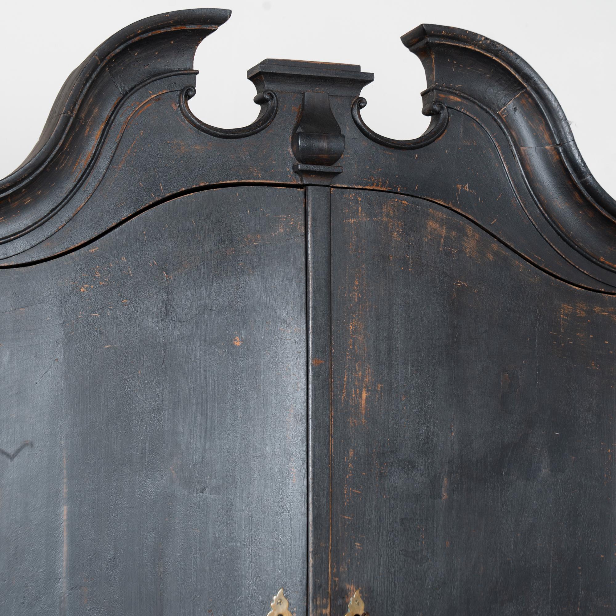 The lower section features three large Rococo-style curved drawers, each fitted with two attractive brass pulls. The secretary rests on feet with a scalloped skirt. Typical age-related cracks, nicks, and minor separation are present throughout from generations of use. There is no key for the interior desk. The upper cabinet door retains a key, though the lock functions very stiffly and is best used as a pull only. Restored strong, stable, and ready for use.
