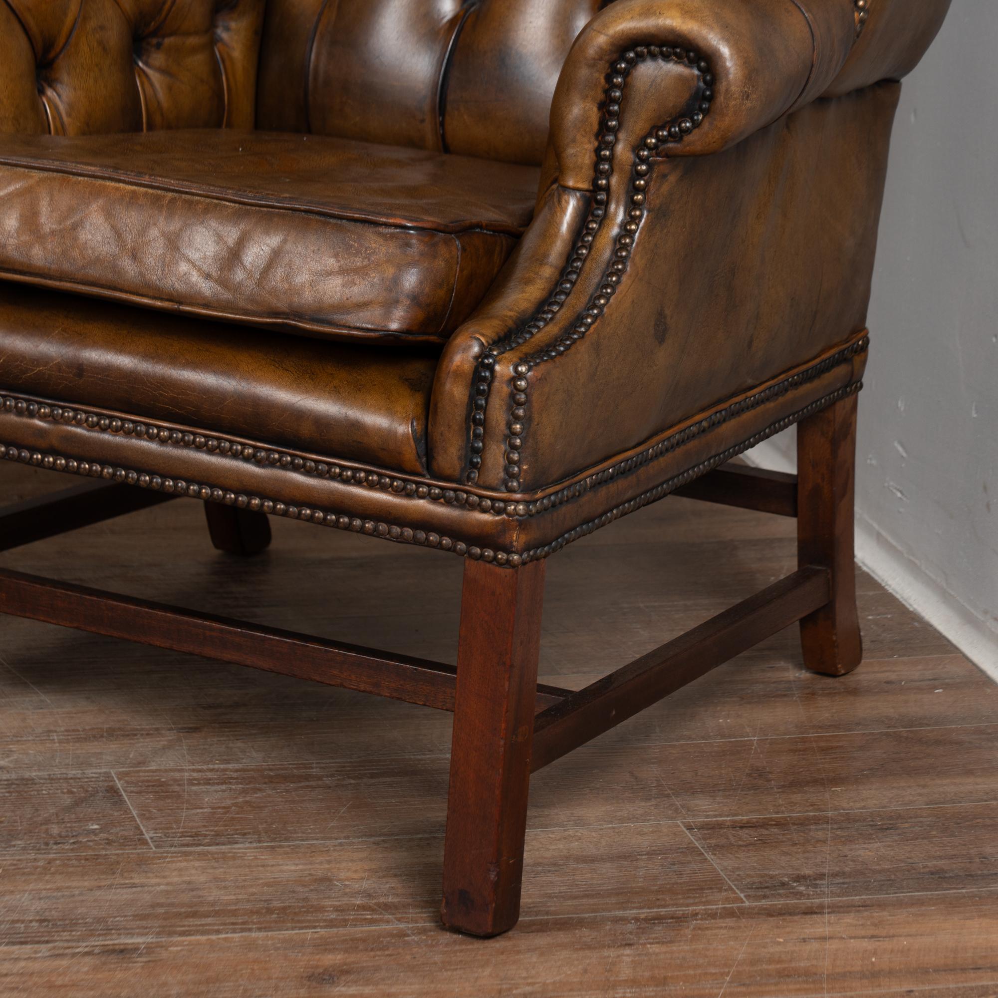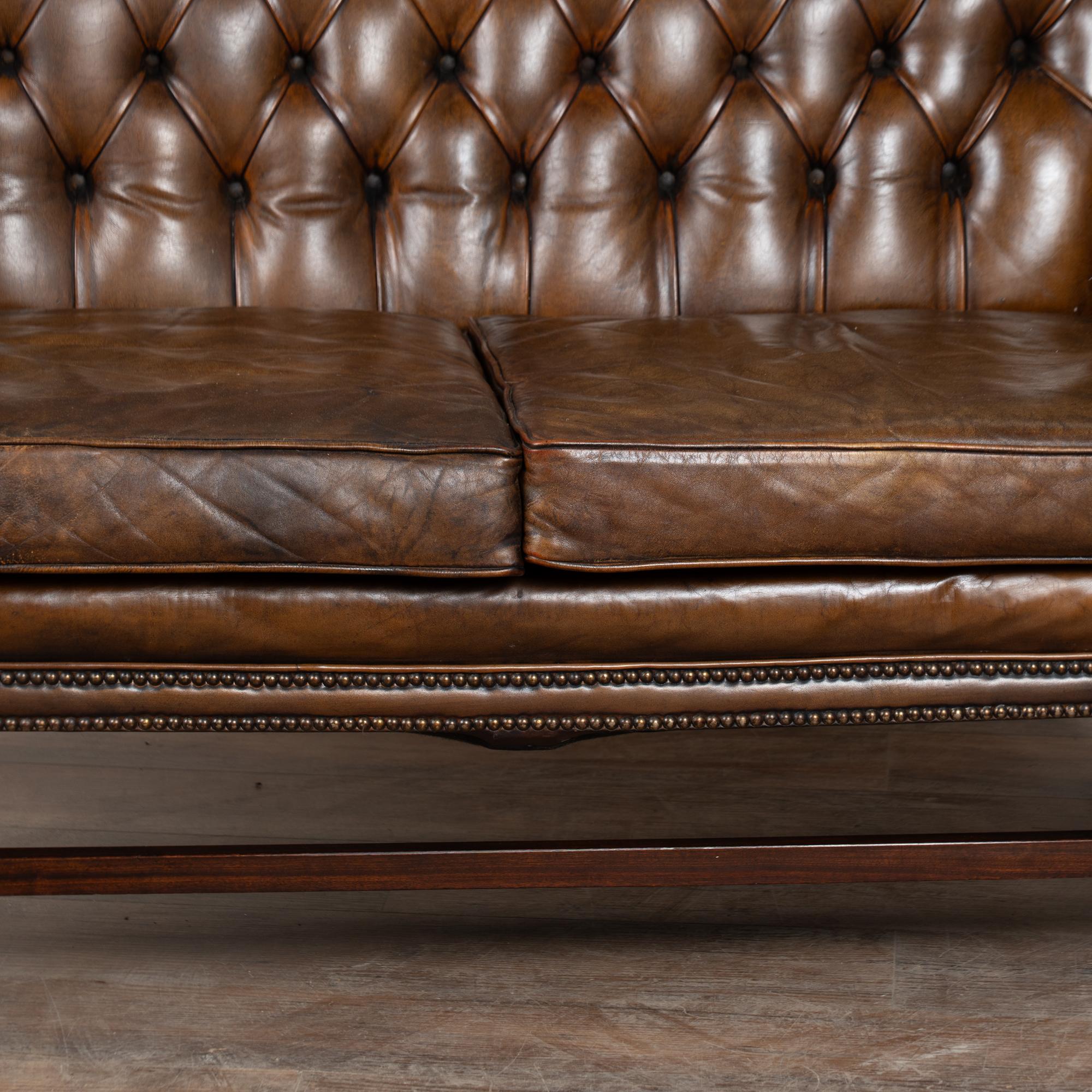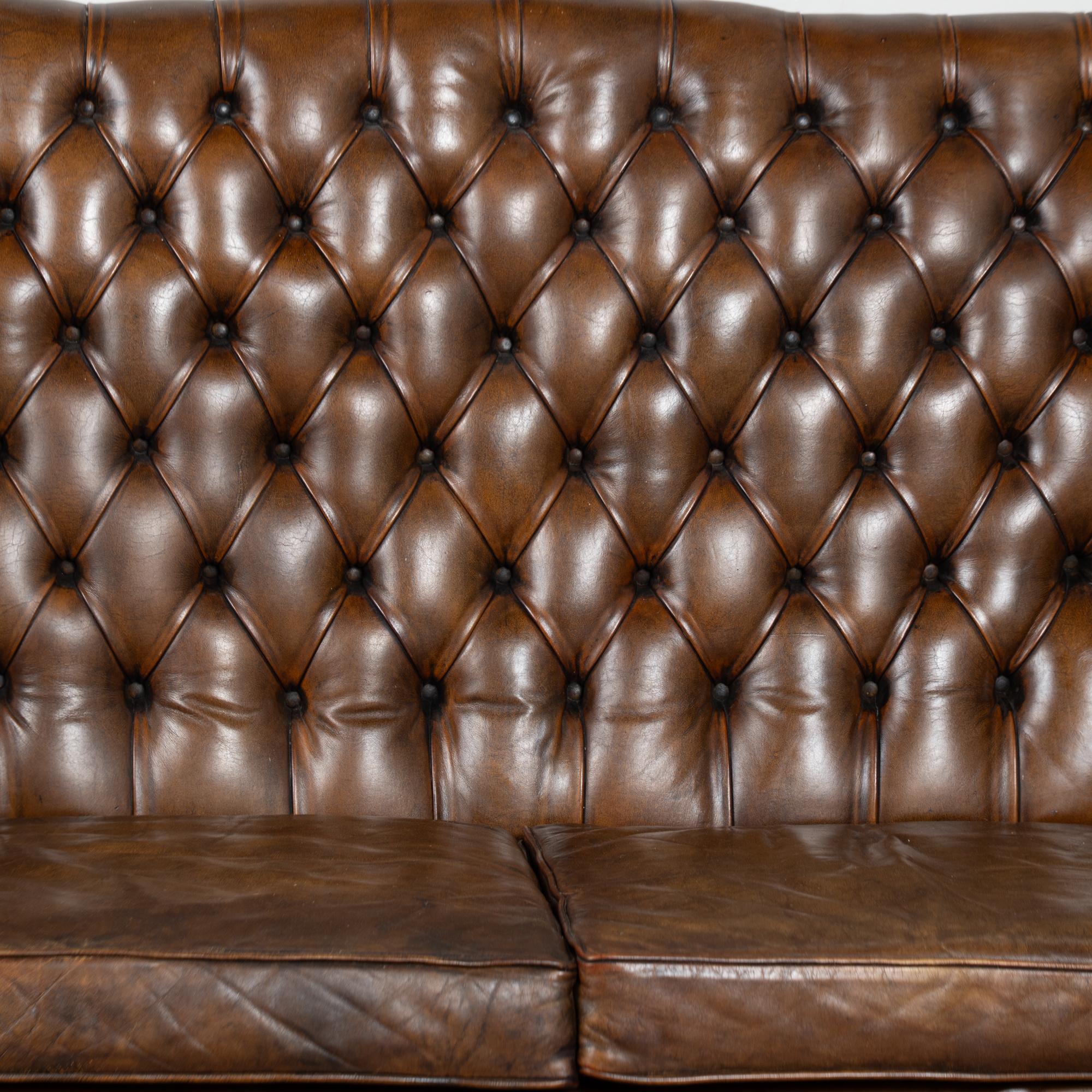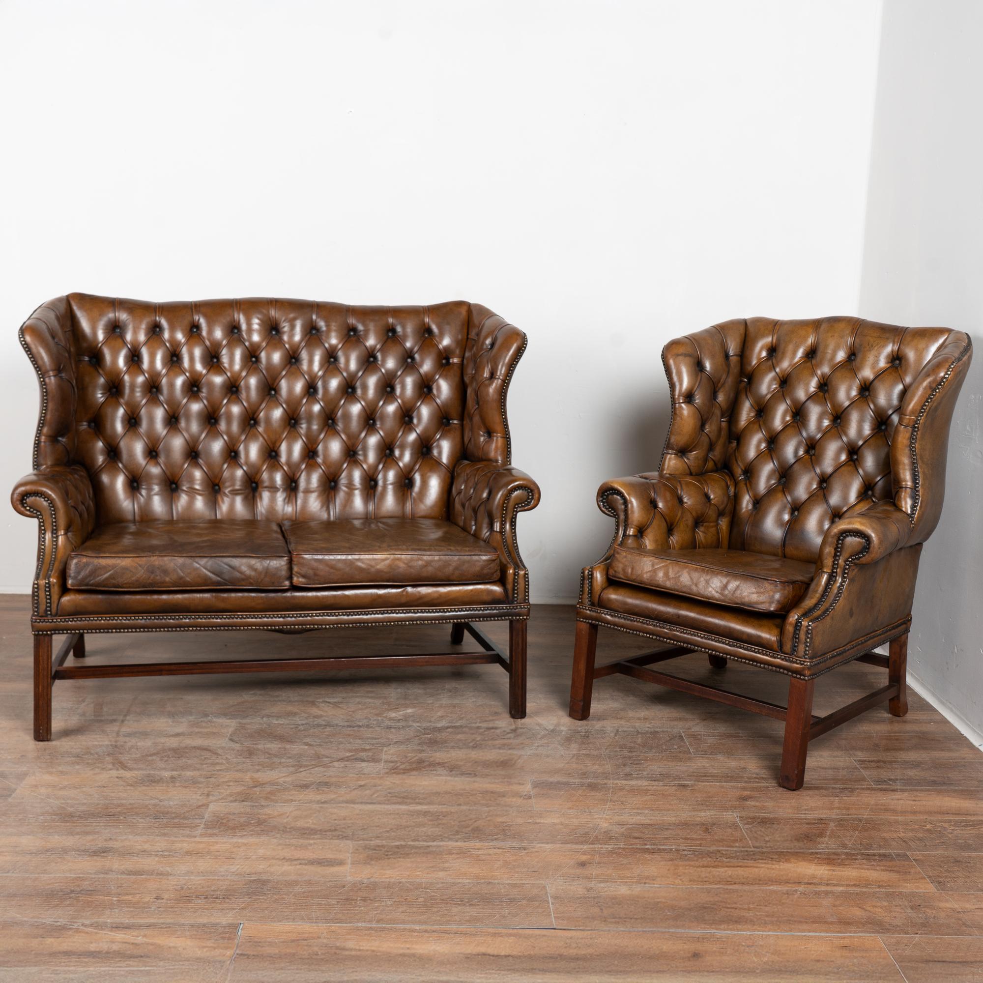 Vintage Chesterfield loveseat and matching club chair upholstered in rich brown leather with tufted button backs, wingback style, and rolled arms. Both pieces feature nail head trim throughout, enhancing their classic Chesterfield styling. The brown leather displays a warm, varied patina that shifts in tone depending on lighting, reflecting age and use. Visible wear includes creasing, staining, scratches, and scuffs, with an old repair noted on the right cushion of the loveseat.