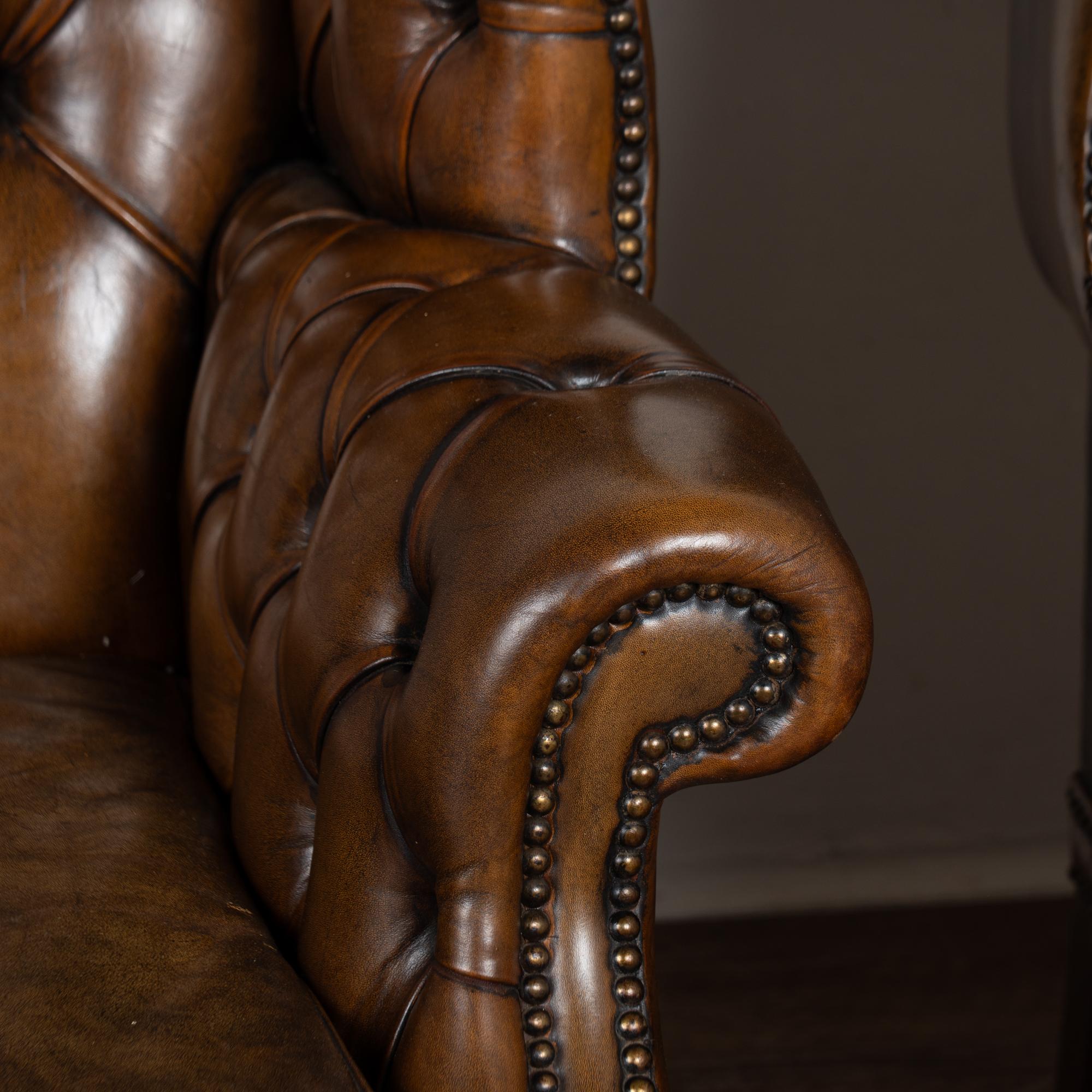 Hardwood frames show minor nicks and surface distress consistent with age but remain solid, stable, and ready for use. Sold together in attractive vintage condition, this set offers classic form and the depth of character only aged leather can provide.