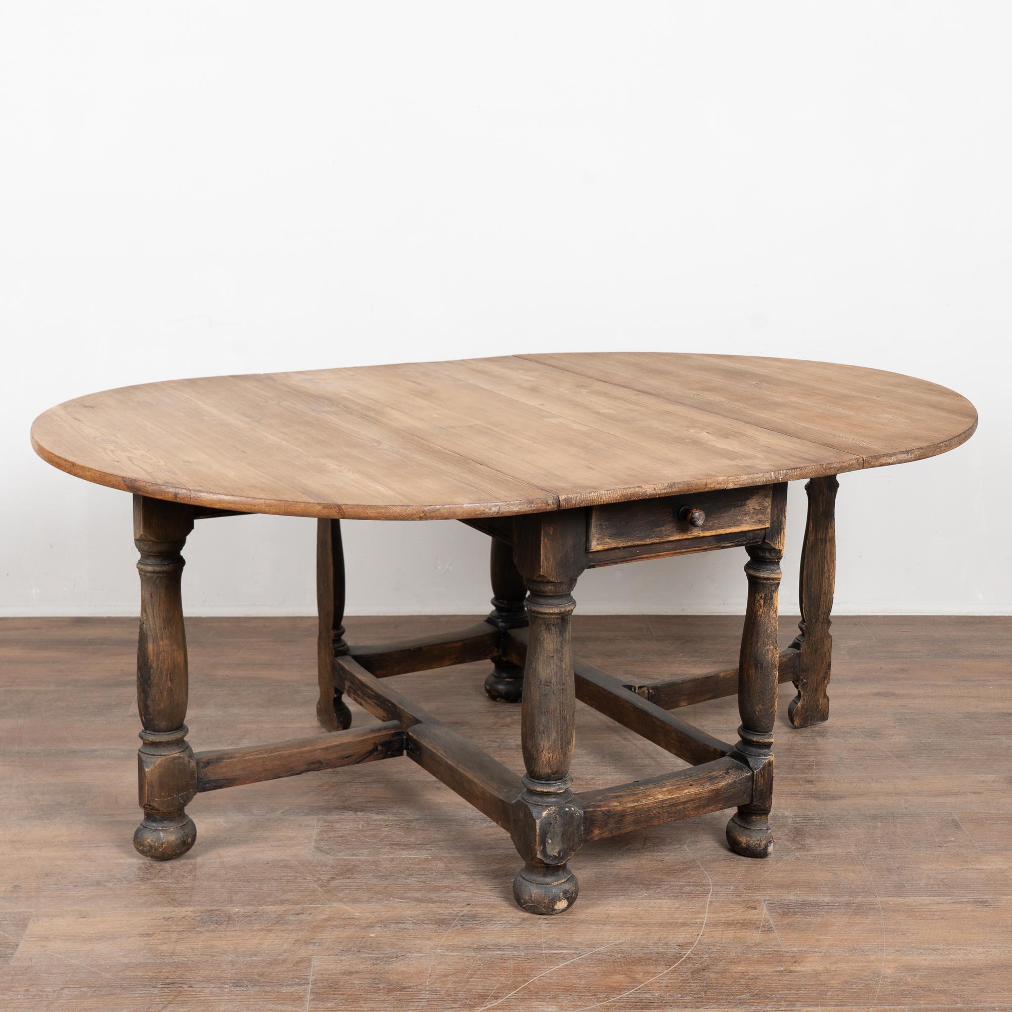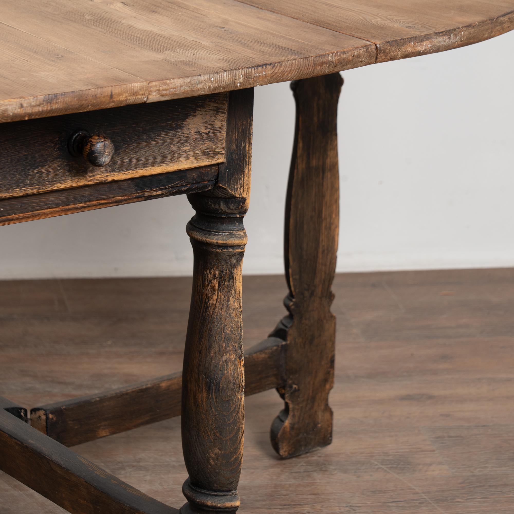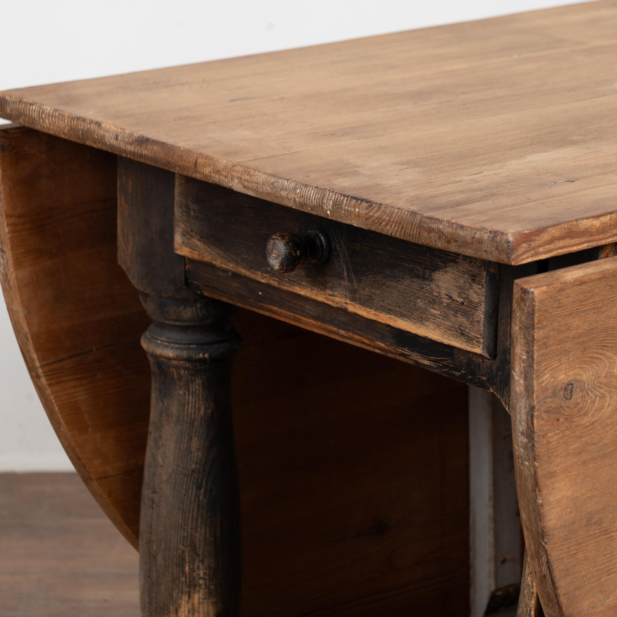 19th-century Swedish pine drop-leaf gate leg table with a versatile, functional design. The gate leg base allows the legs to adjust as the leaves are raised or lowered. A single drawer is present on each end. The pine top shows a rich aged patina with visible cracks, stains, nicks, and old repairs. The base was painted black at some point in time and now shows significant wear and fading, contributing to the table’s character. With both leaves down, the table serves well as a 25.5" deep console ; fully opened, it functions comfortably as a kitchen or dining table just under 6' long. Restored strong, stable, and ready to use.