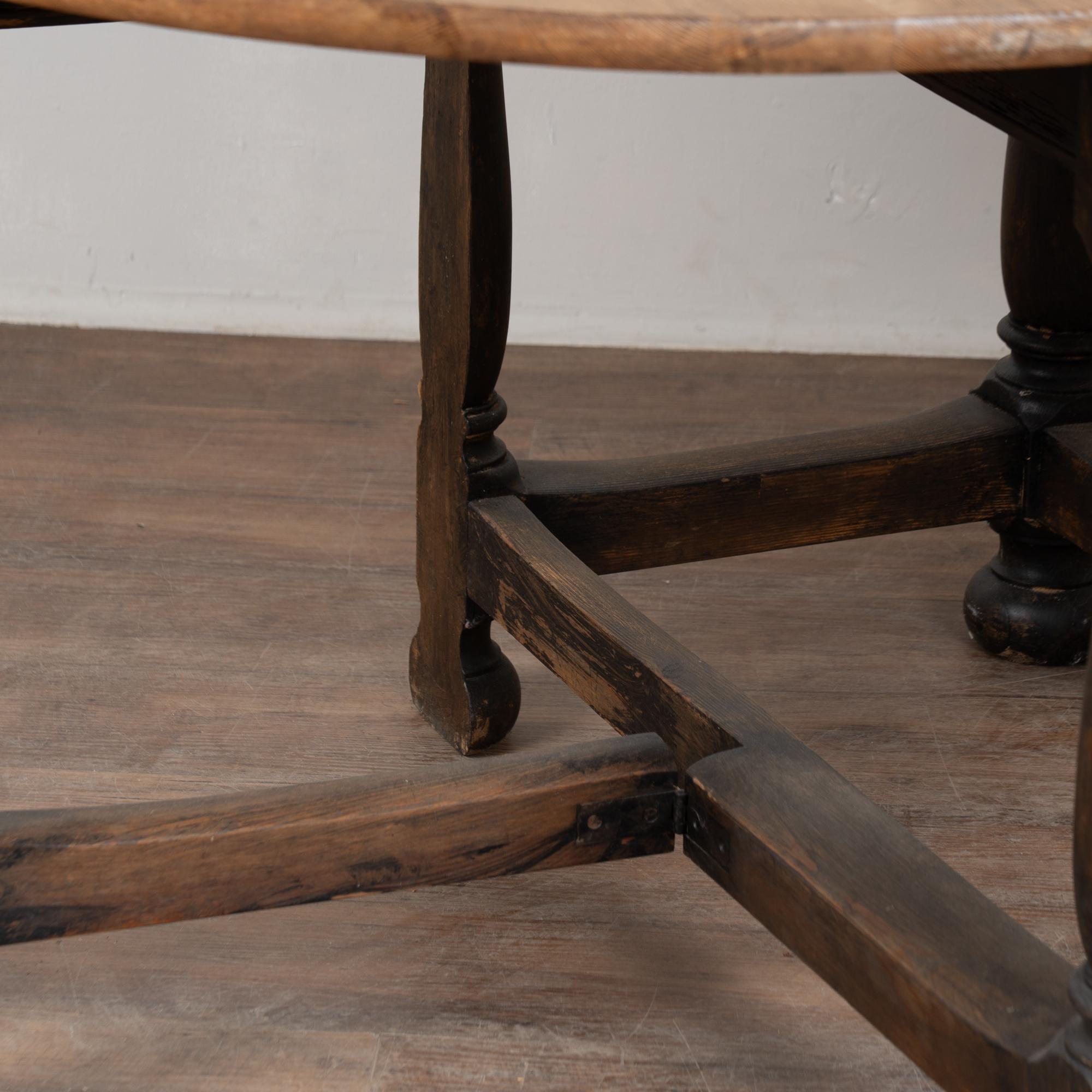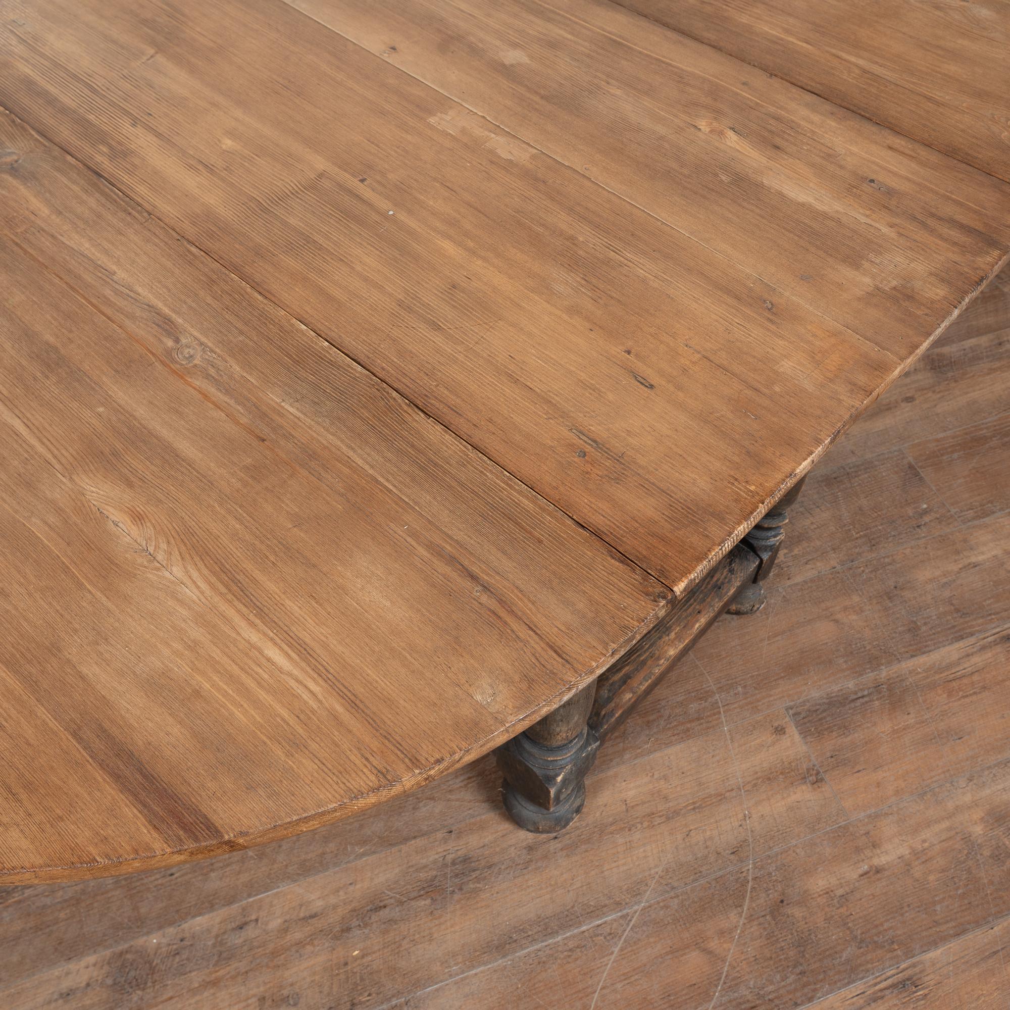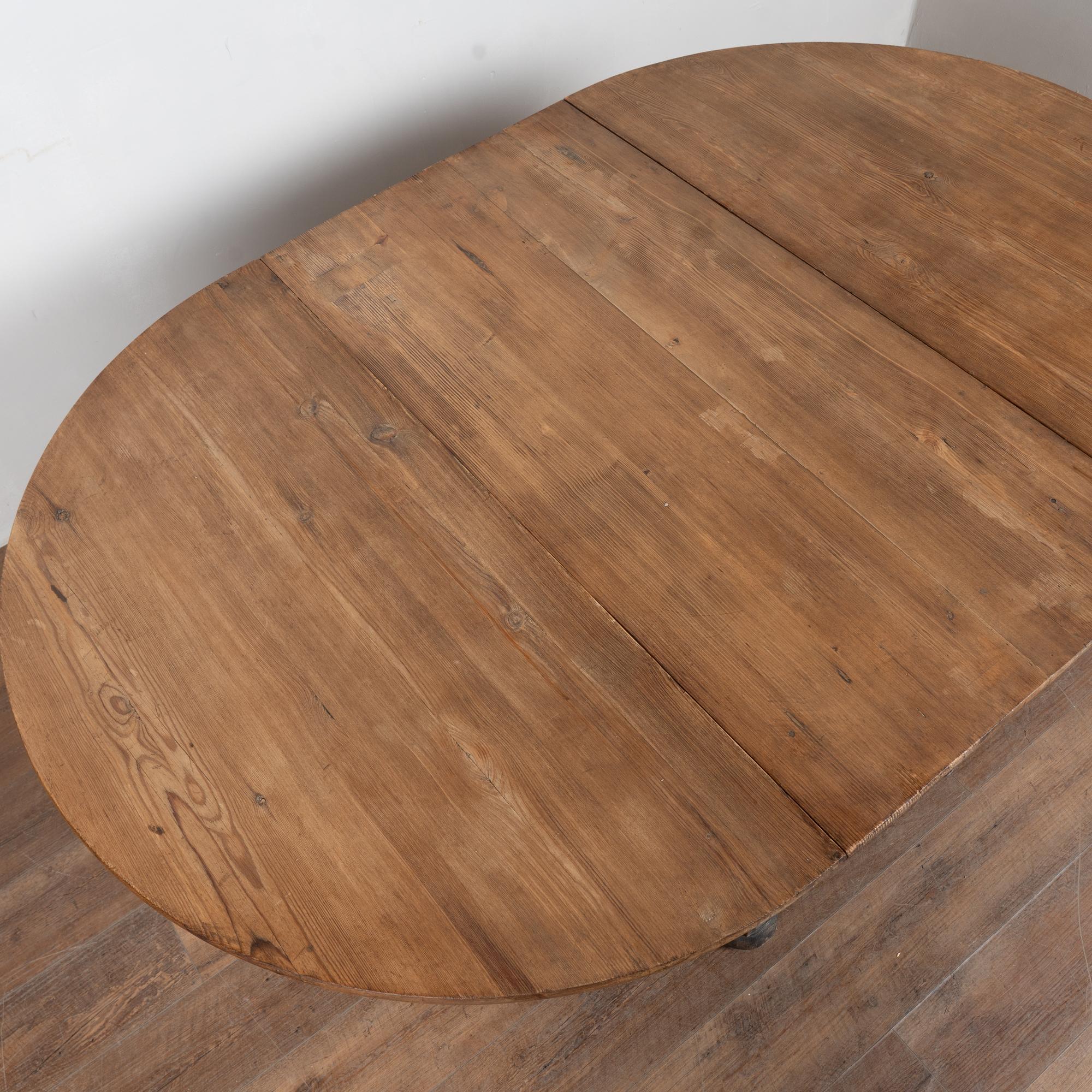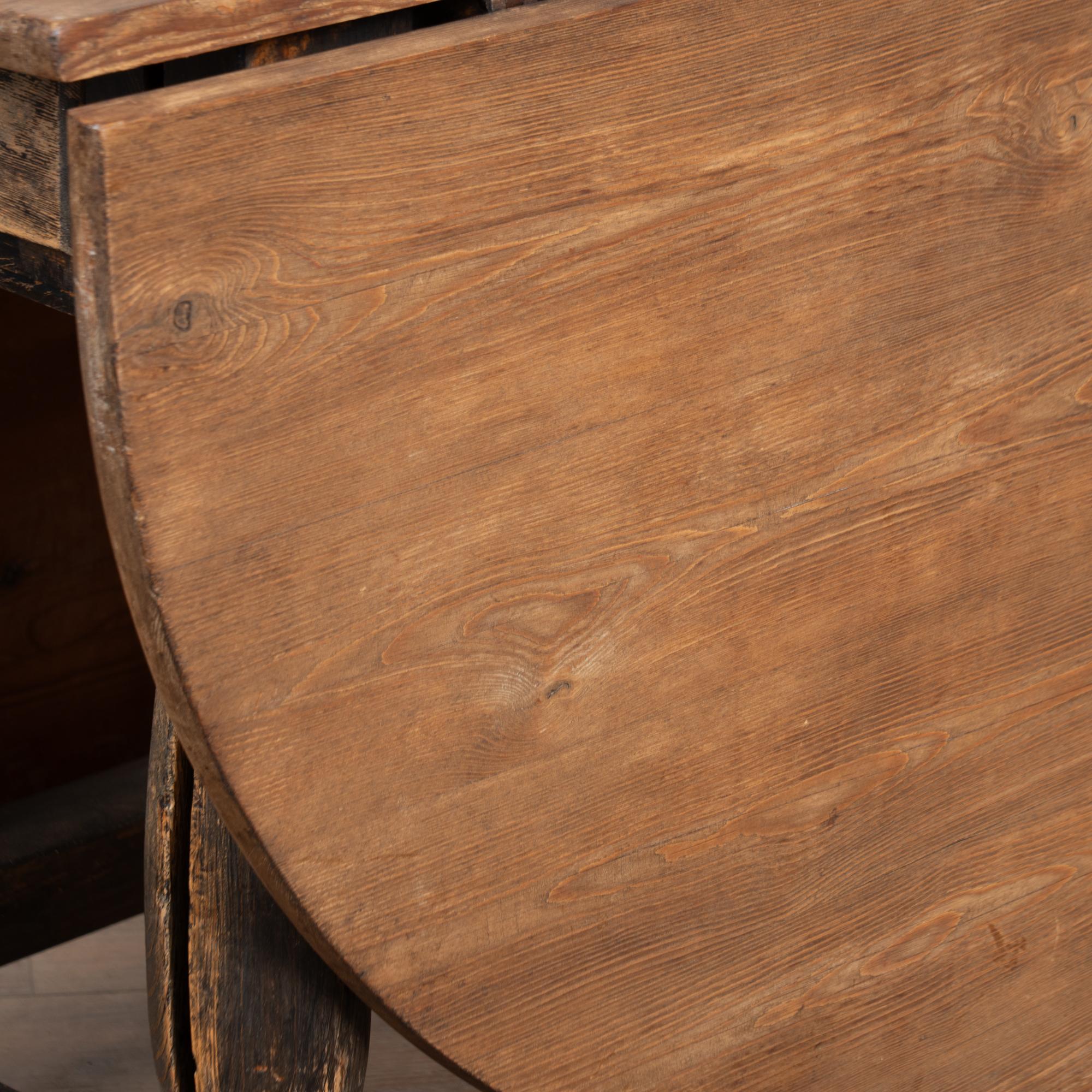 19th-century Swedish pine drop-leaf gate leg table with a versatile, functional design. The gate leg base allows the legs to adjust as the leaves are raised or lowered. A single drawer is present on each end. The pine top shows a rich aged patina with visible cracks, stains, nicks, and old repairs. The base was painted black at some point in time and now shows significant wear and fading, contributing to the table’s character. With both leaves down, the table serves well as a 25.5" deep console ; fully opened, it functions comfortably as a kitchen or dining table just under 6' long. Restored strong, stable, and ready to use.