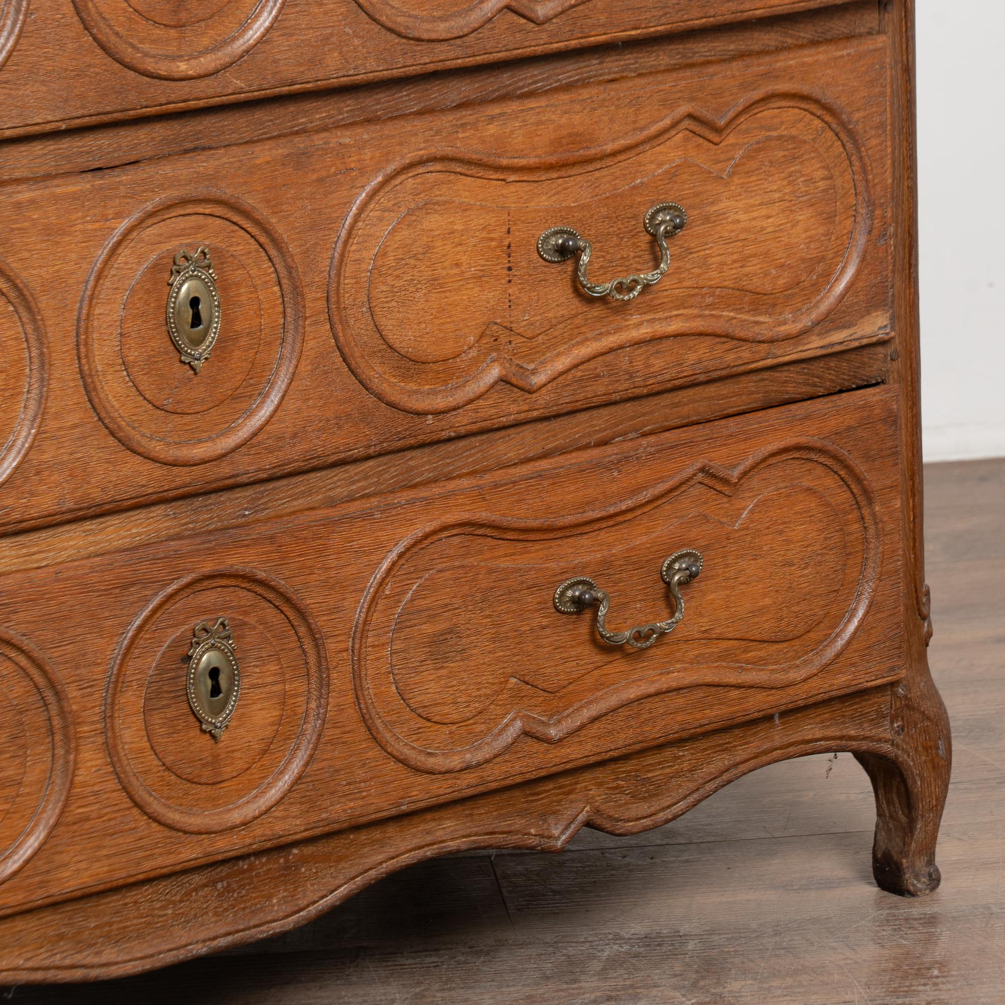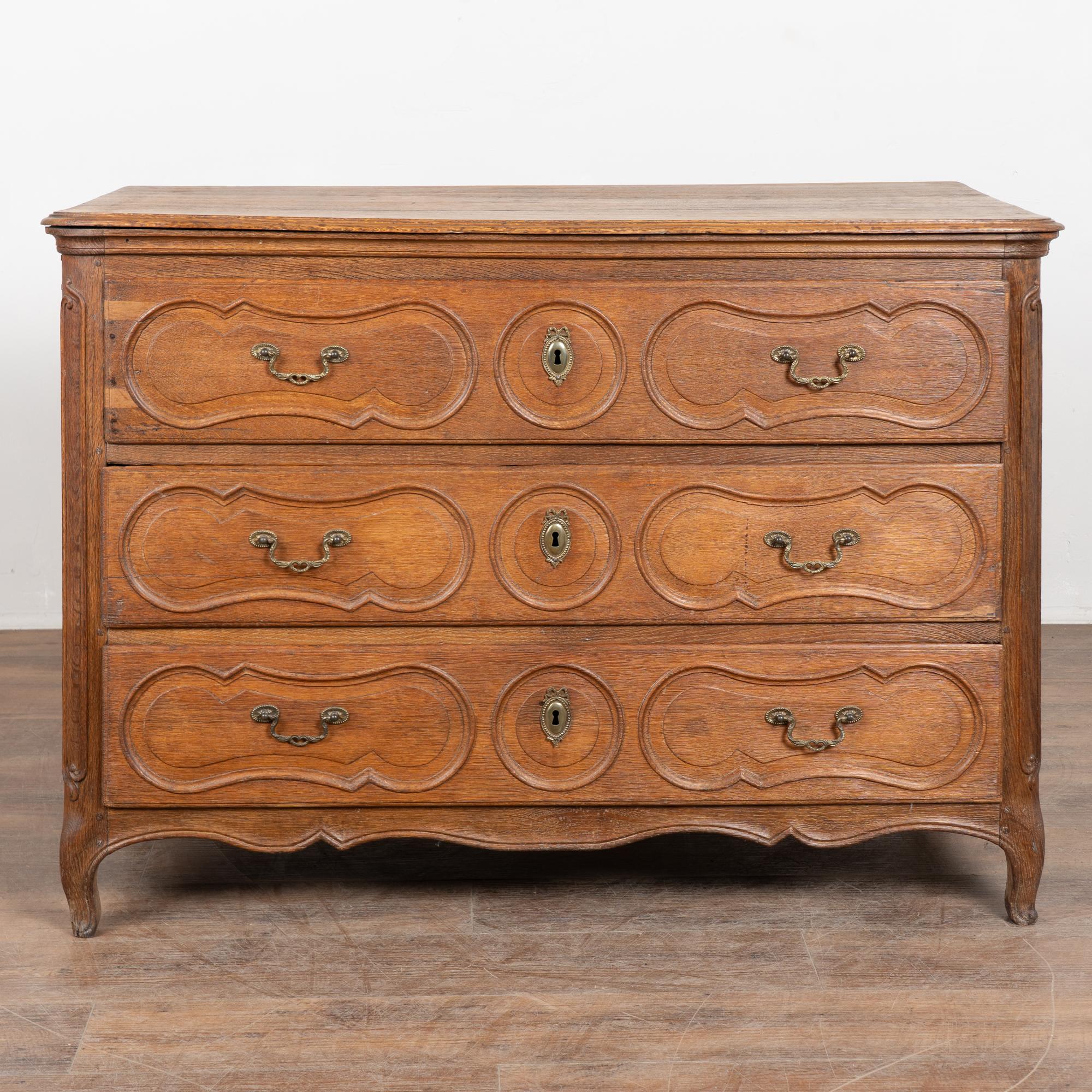 Late 18th-century French oak chest of three drawers featuring decorative paneled drawer fronts and curved canted sides with subtle detailing. The chest rests on cabriole feet that show visible wear from centuries of use. The oak top displays old repaired cracks, scratches, stains, and nicks, while the sides and back show typical age-related cracking and separation common to oak furniture of this period. Interior drawer bottoms also show age-related separation and cracks. The carved panels lend a romantic French character to the piece. Restored strong and stable, this chest is ready for use and enjoyment.