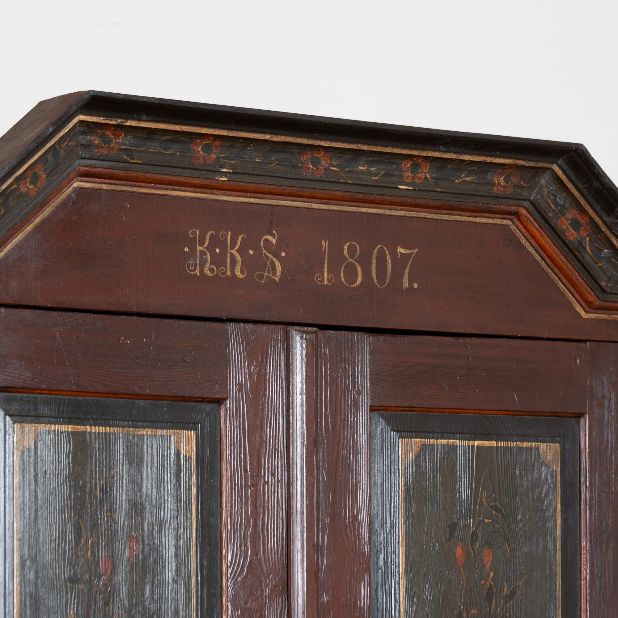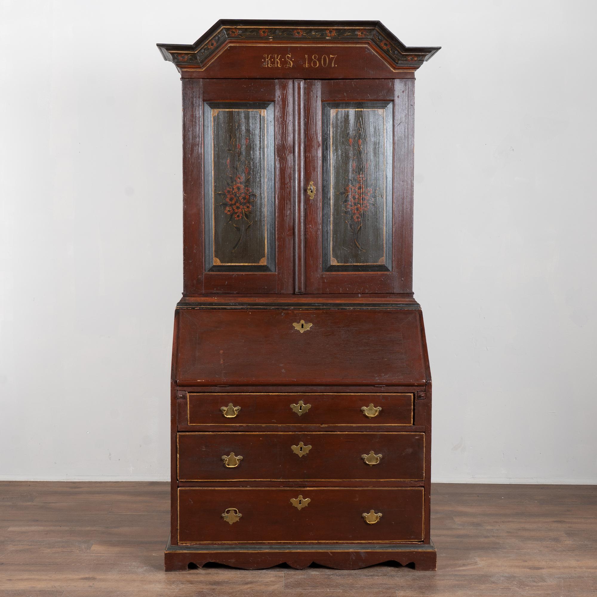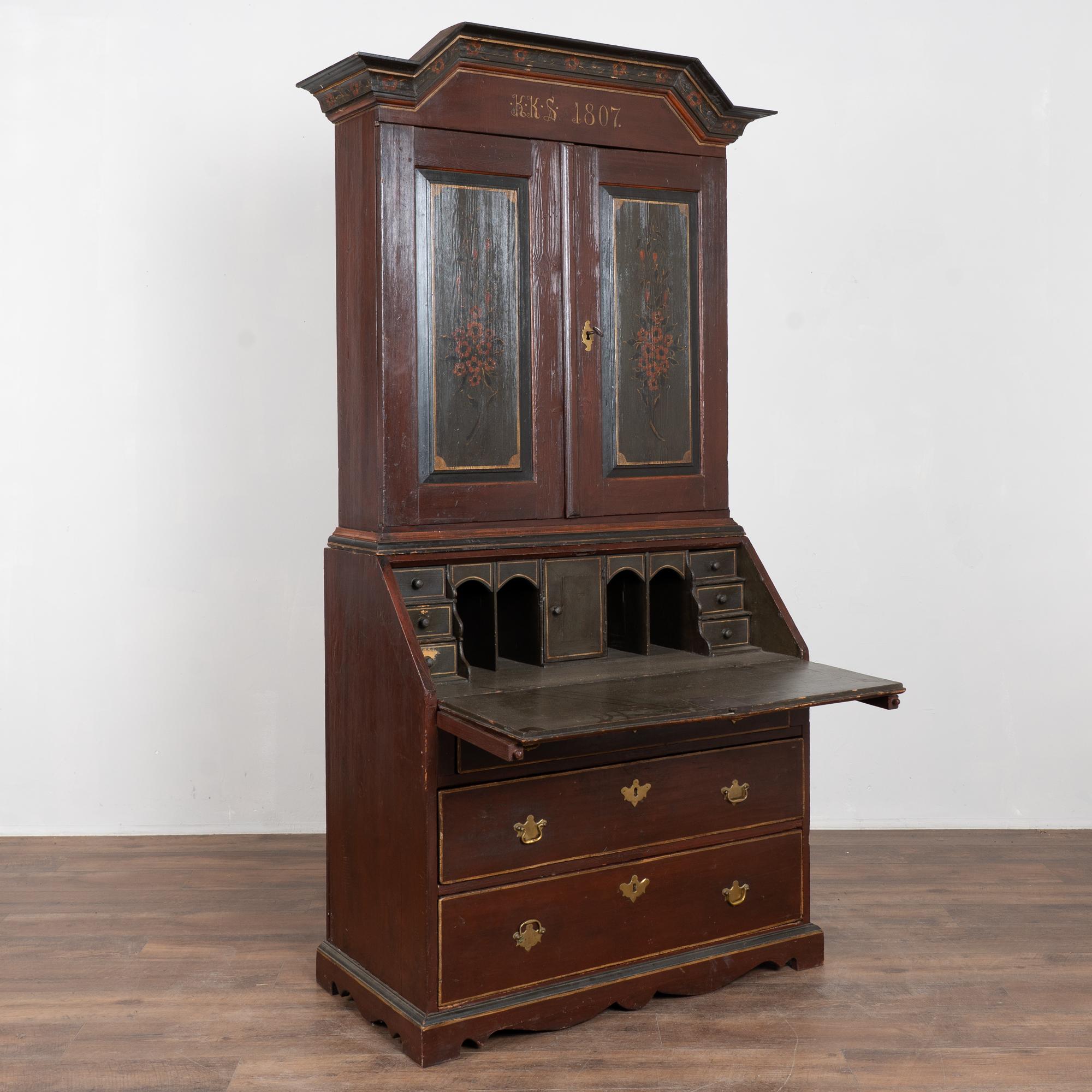 19th century original painted Swedish secretary dated 1807, crafted in pine and retaining its original painted surface. The exterior features a dark reddish-brown background with deep forest green panels, red floral motifs, and painted borders. A monogram and the date “1807” appear in golden yellow paint, adding historical significance and decorative appeal. The painted surface shows honest wear consistent with age, contributing to the character of this early Swedish piece.