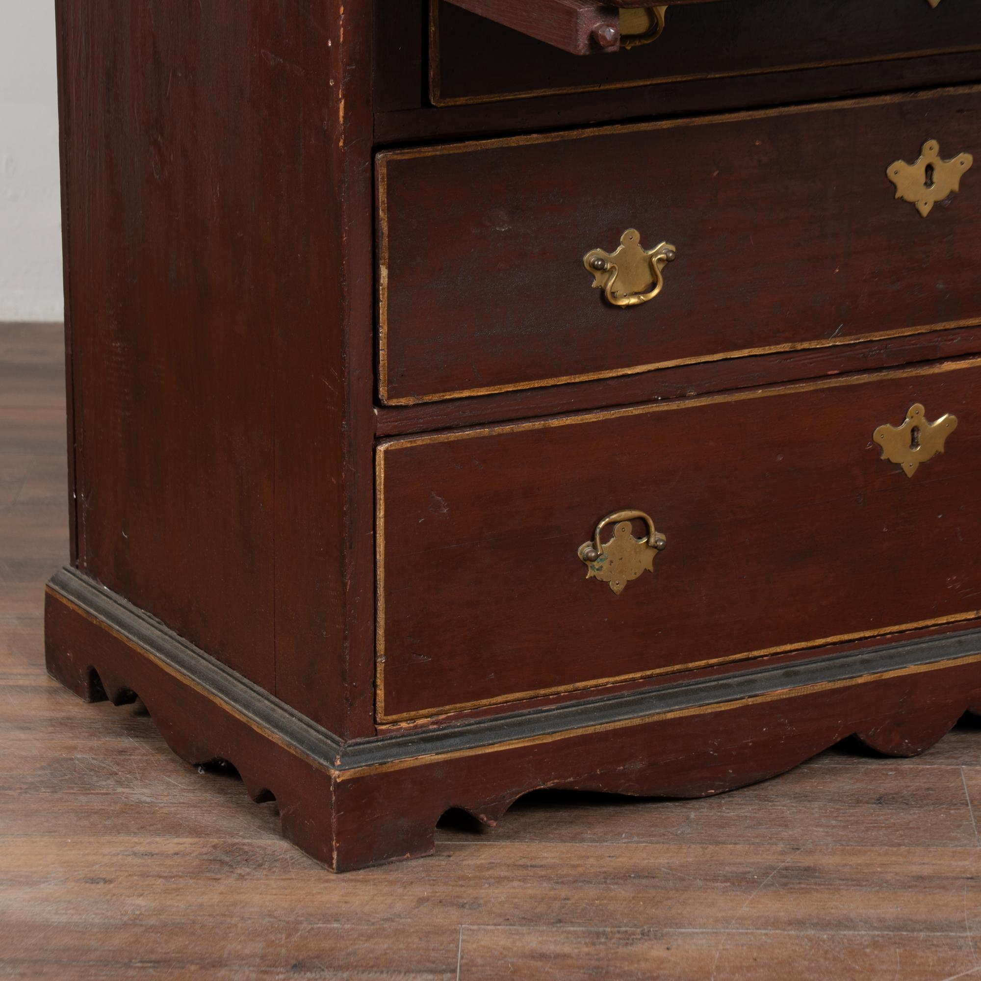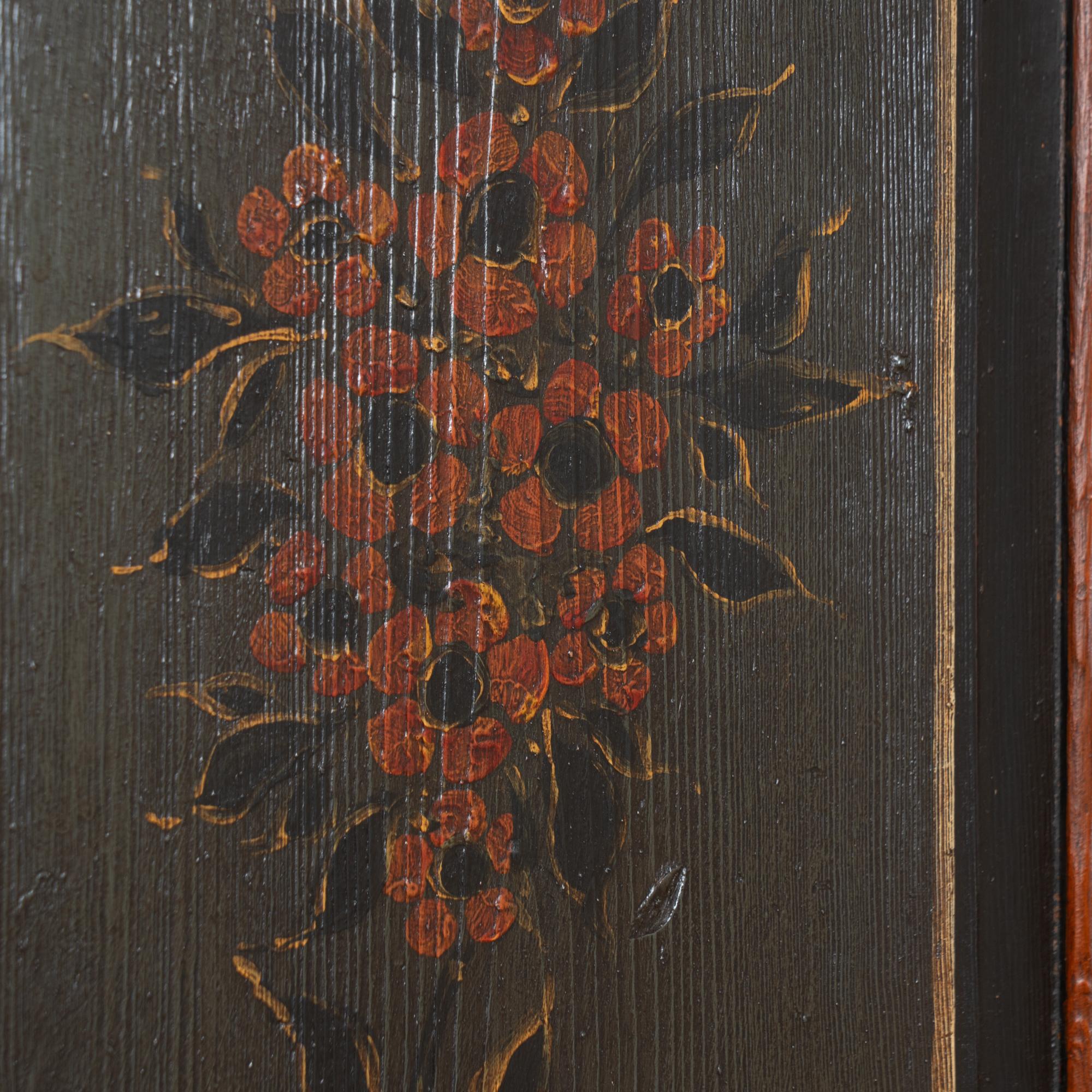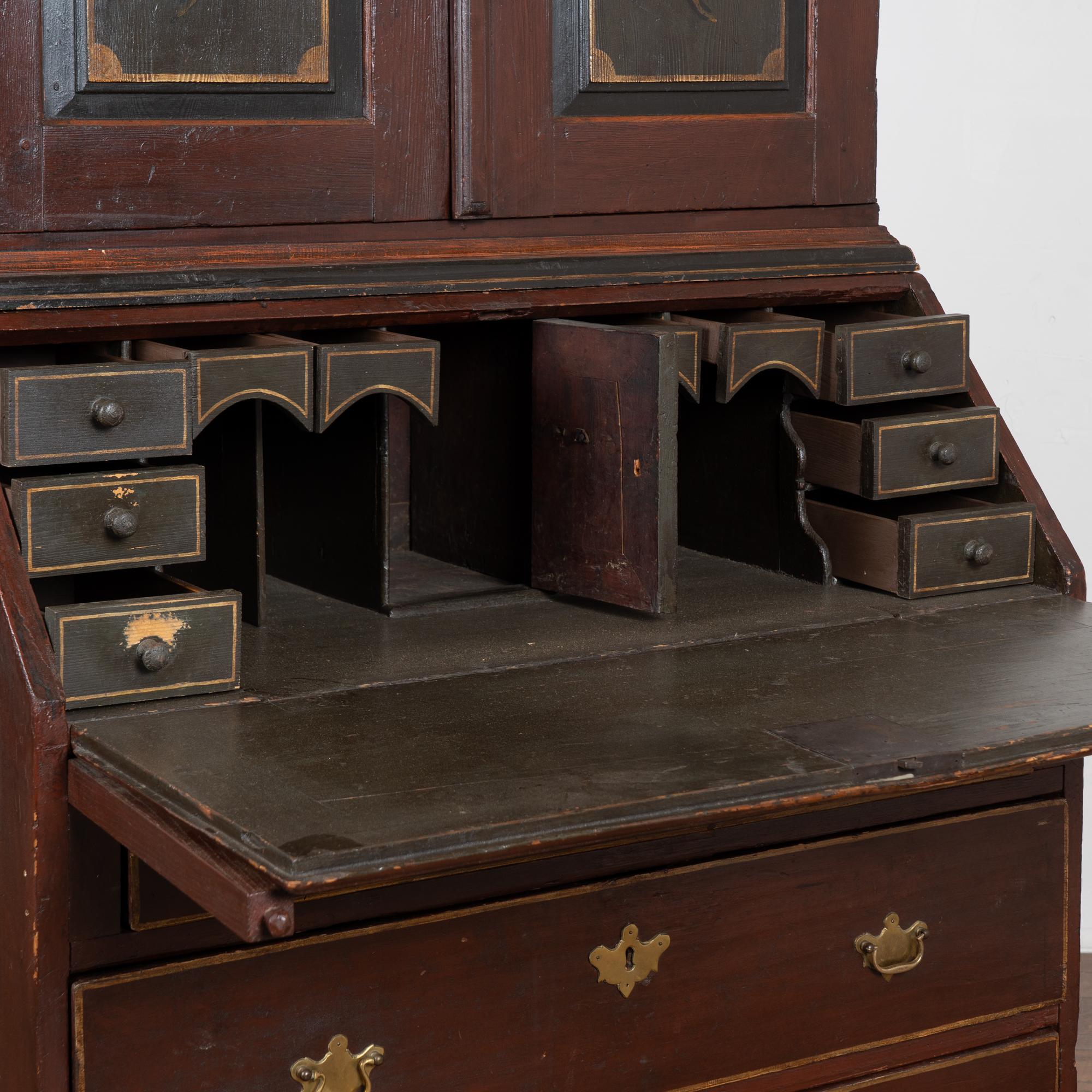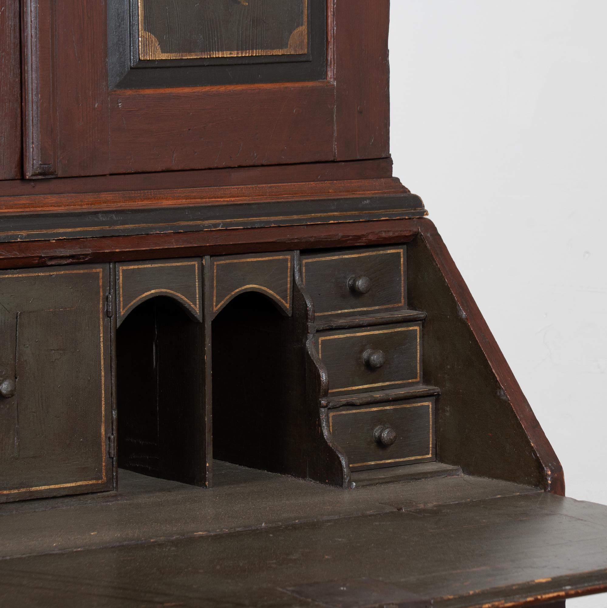 19th century original painted Swedish secretary dated 1807, crafted in pine and retaining its original painted surface. The exterior features a dark reddish-brown background with deep forest green panels, red floral motifs, and painted borders. A monogram and the date “1807” appear in golden yellow paint, adding historical significance and decorative appeal. The painted surface shows honest wear consistent with age, contributing to the character of this early Swedish piece.