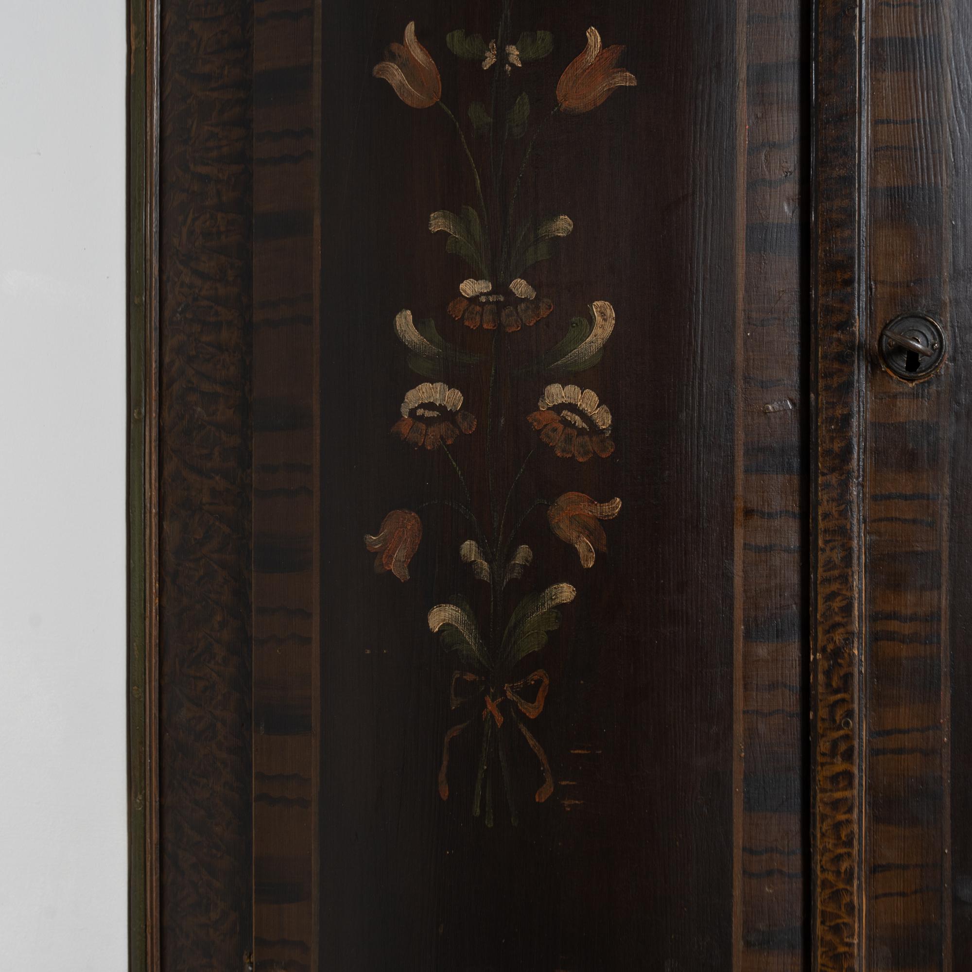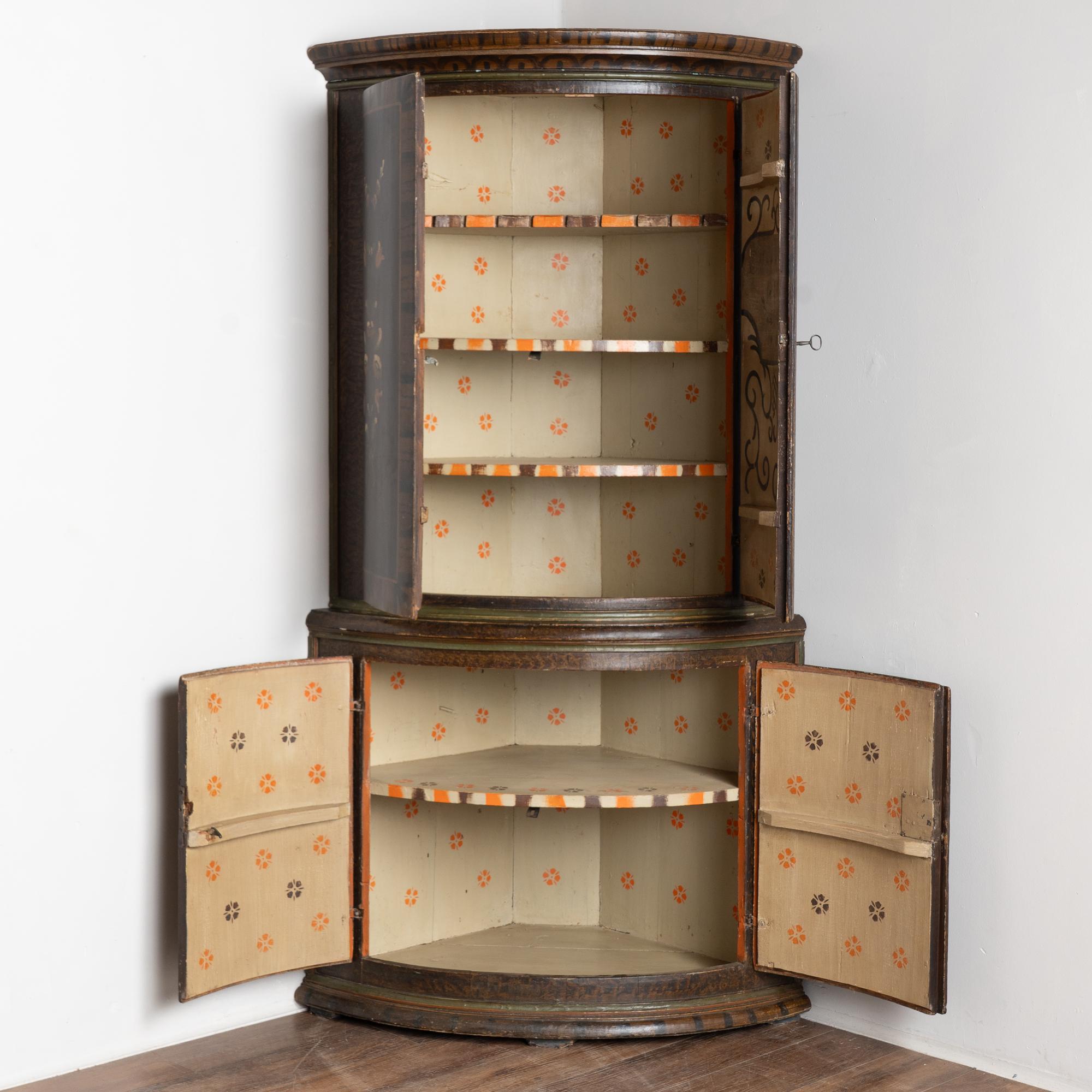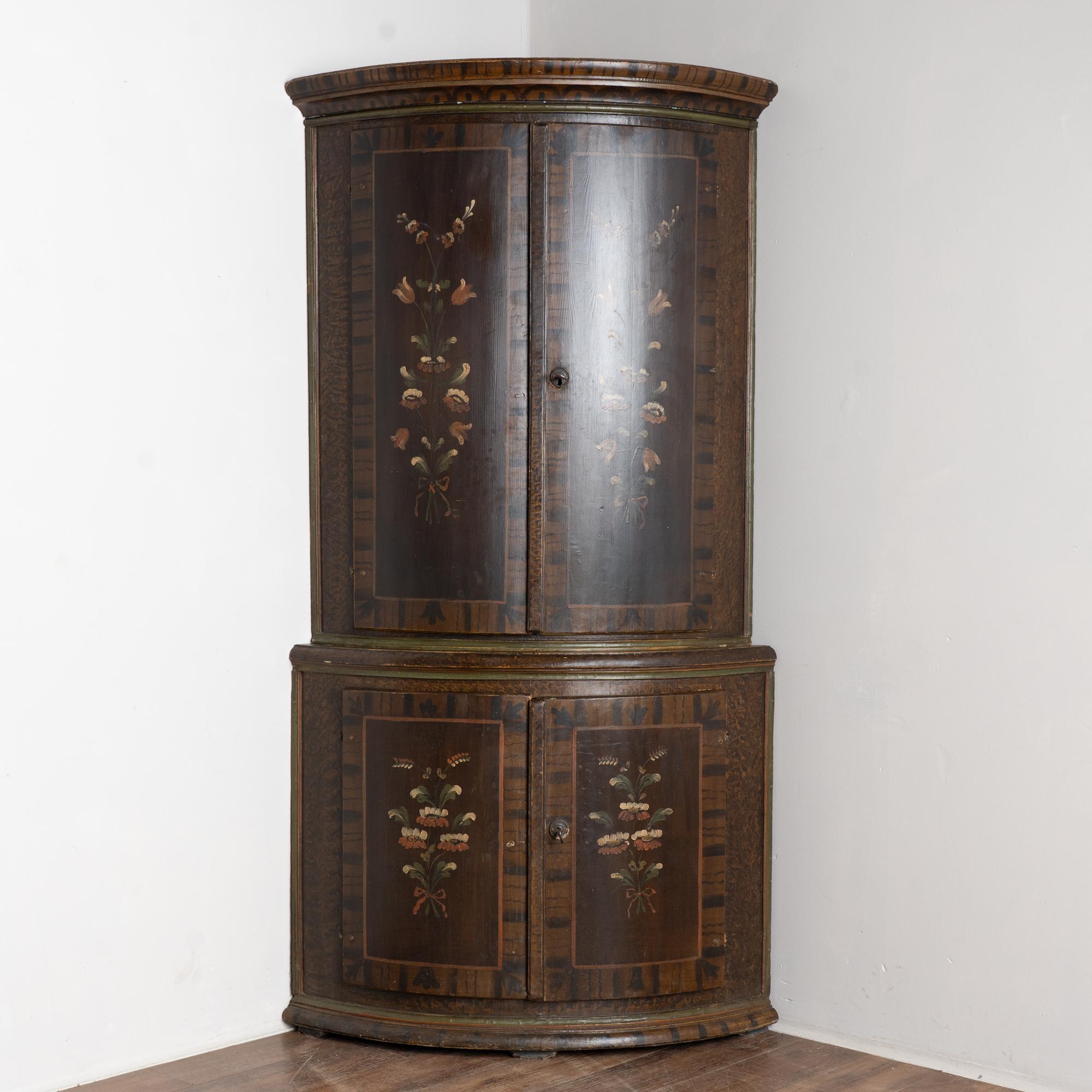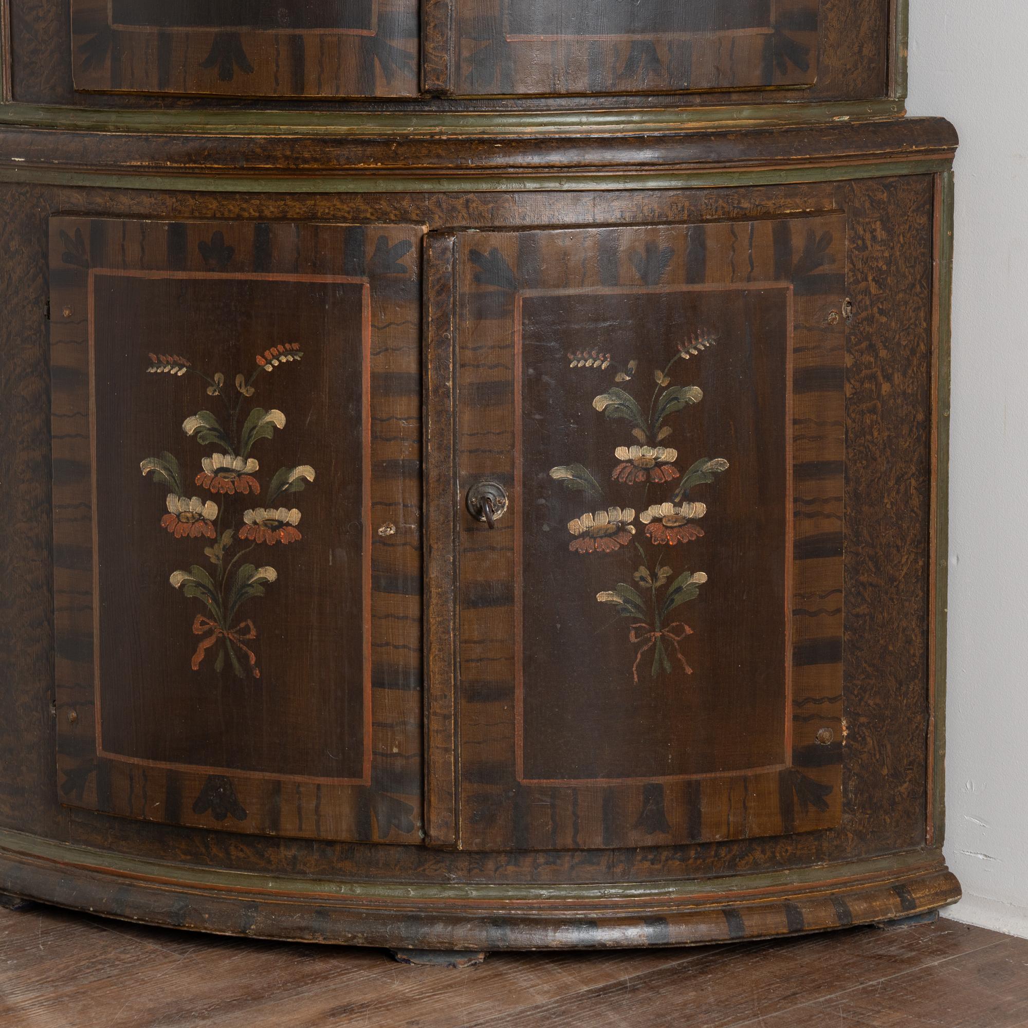 Original 19th-century Swedish pine corner cabinet dated 1846, featuring its original hand-painted folk art finish. The exterior displays a traditional faux wood brown painted background typical of the era, with bowfront cabinet doors and painted floral bouquets centered within each of the four front panels. The upper right interior door retains painted monograms and the date of 1846, adding historical significance.