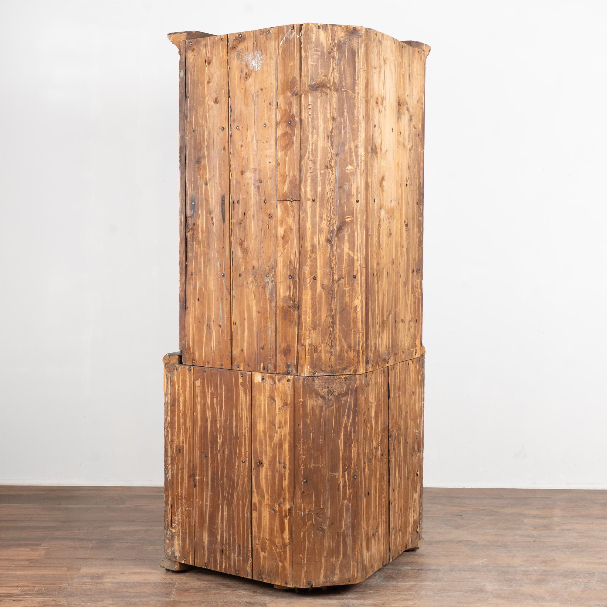 Typical age-related wear is present throughout, including cracks, scratches, gouges, and age-related separation along the back, all consistent with a cabinet of this age. The piece has been restored for structural integrity and remains strong, stable, and ready for use. A genuine example of Swedish country craftsmanship, this corner cabinet offers both decorative folk art appeal and practical storage.
