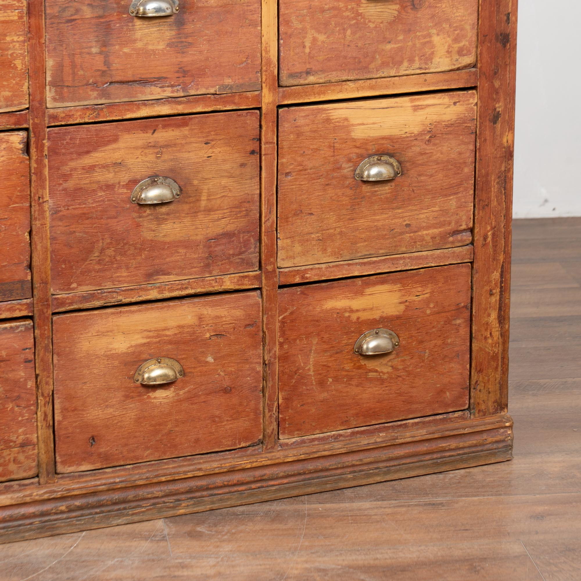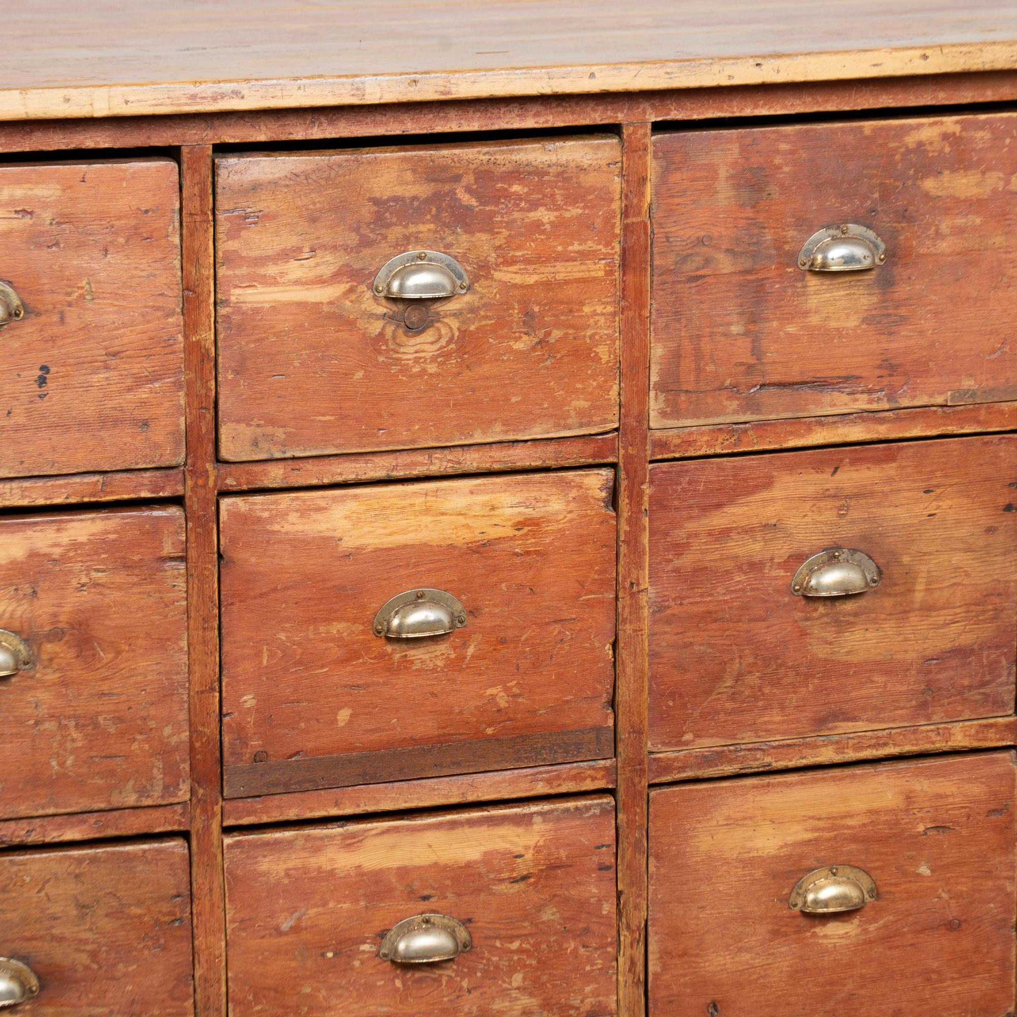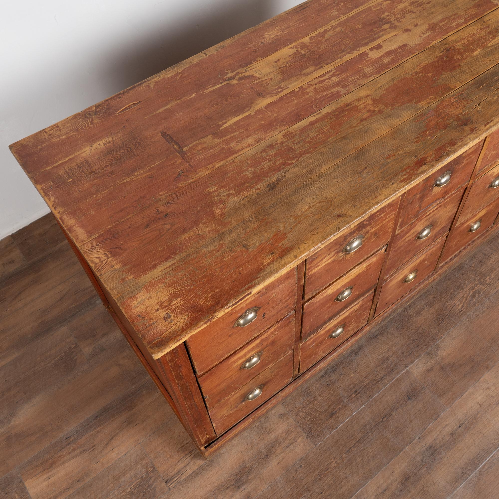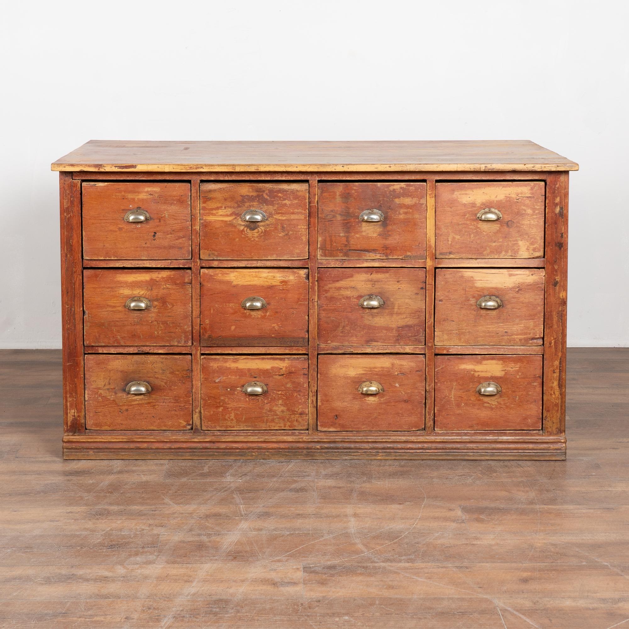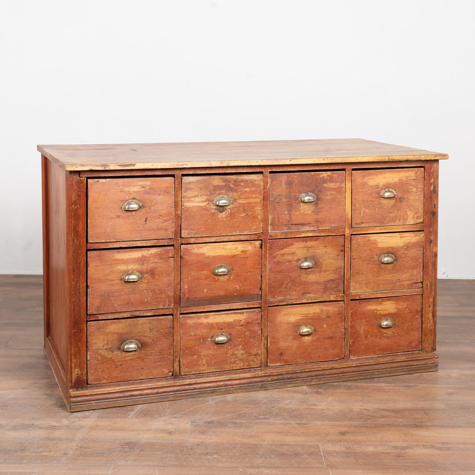 19th century Danish pine apothecary sideboard with twelve drawers. Constructed of pine with its original painted finish, now highly distressed, revealing the pine beneath. To the naked eye, the surface reads as brown with subtle reddish undertones. Designed as a freestanding counter, the form allows for versatile placement and could function well as a kitchen island. The top two center drawers feature divided interiors. The top shows evidence of extensive use, including gouges, scratches, cracks, and heavy surface wear, with similar distress visible across the drawer fronts. Age-related plank separation is present along the sides. The back reveals old repairs and signs of historic wormhole activity. The piece has been restored, is structurally strong, stable, and ready for use.